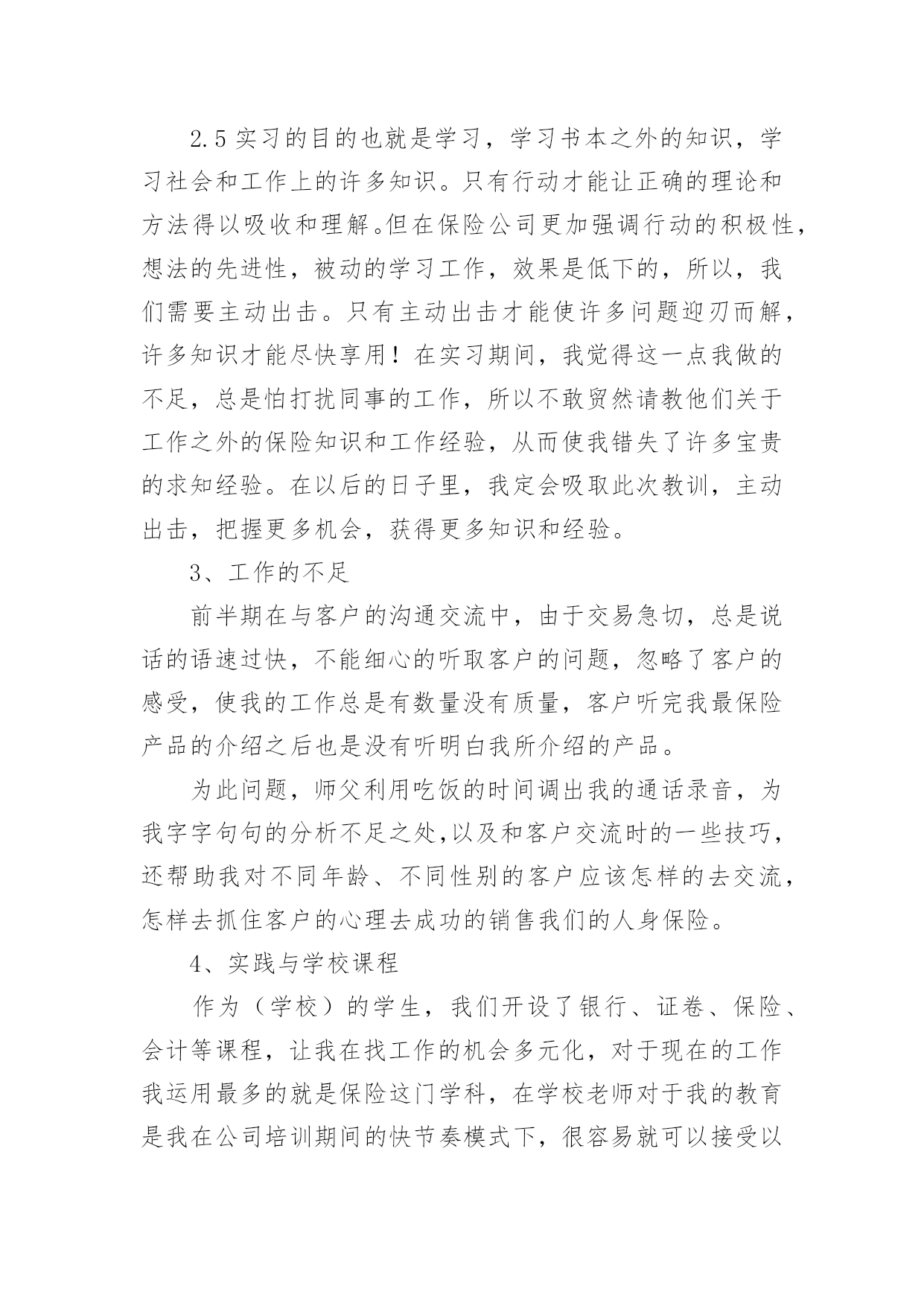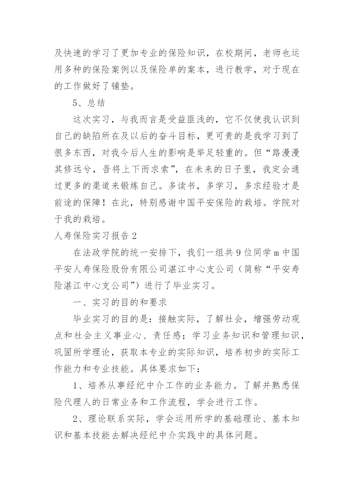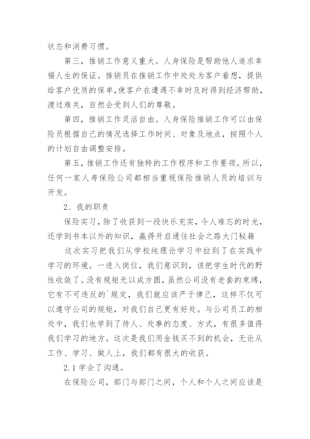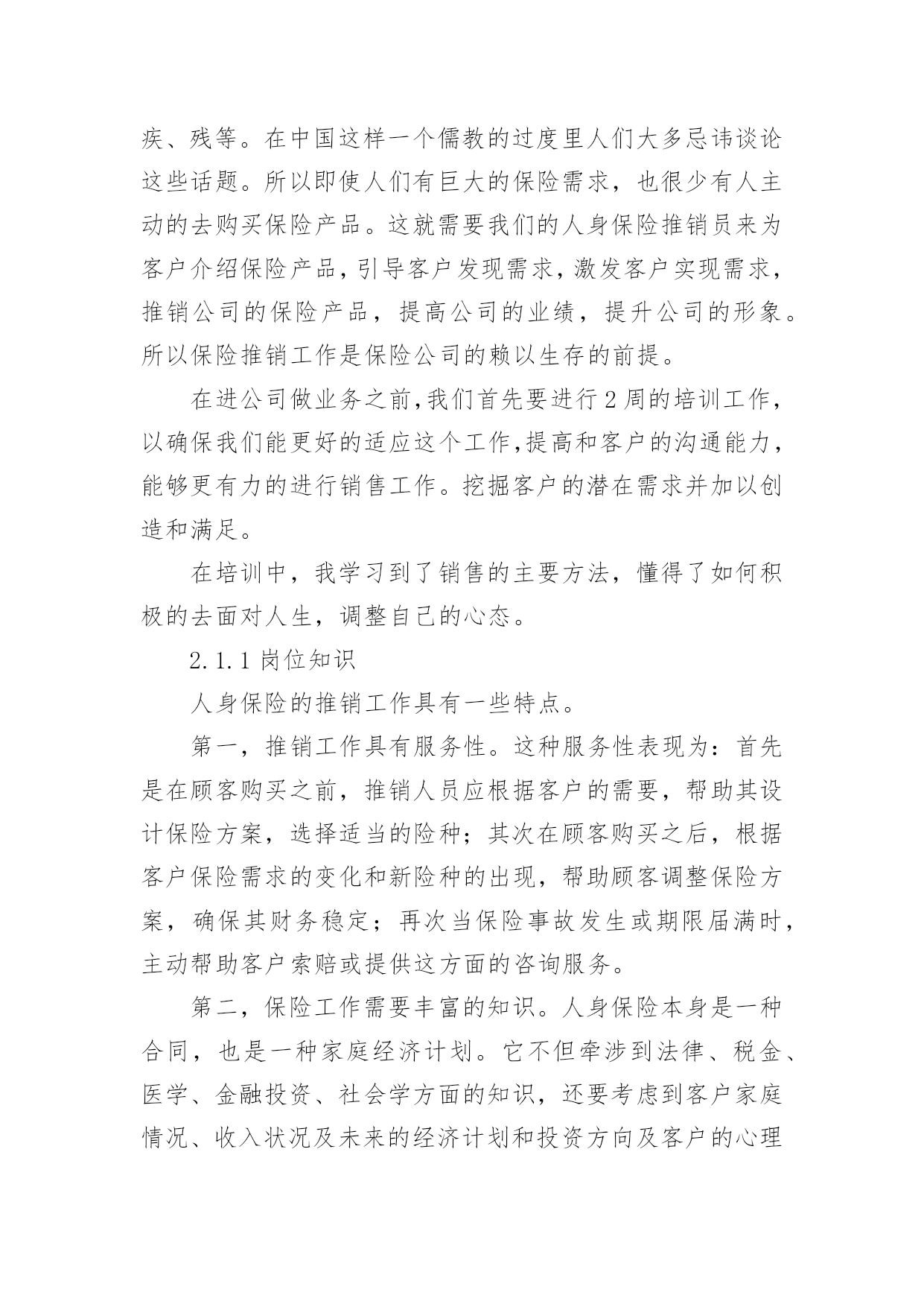 人寿保险实习报告人寿保险实习报告在经济飞速发展的今天,接触并使用报告的人越来越多,我们在写报告的时候要注意语言要准确、简洁。我敢肯定,大部分人都对写报告很是头疼的,下面是小编为大家收集的人寿保险实习报告,欢迎阅读,希望大家能够喜欢。人寿保险实习报告11、岗位描述我在中国平安陕西电销中心的岗位是保险电话销售员,进行人身保险的推销工作。学习公司的企业文化、销售技巧、团队协作精神、礼仪等各方面的知识。凭着对本公司产品的了解和与其它公司产品的对比,突出本公司产品的优点和公司的良好信誉,积极开拓客户源,向顾客推销产品,并尽量推销系列产品,完成公司分配的任务。1.1.1岗位职责人身保险是以人的生命或身体为保险对象的,保险人对被保险人的生命或身体因遭受事故、意外伤害、疾病、衰老等原因导致的死亡、残疾、丧失工作能力或者年老退休责任给付保险金的一种保险方式。因此,以经营人身保险为主的保险公司所提供的产品就具有无形性、同质性、广泛多样性和分散性等特性。而且人身保险所涉及的往往是人的老、死、疾、残等。在中国这样一个儒教的过度里人们大多忌讳谈论这些话题。所以即使人们有巨大的保险需求,也很少有人主动的去购买保险产品。这就需要我们的人身保险推销员来为客户介绍保险产品,引导客户发现需求,激发客户实现需求,推销公司的保险产品,提高公司的业绩,提升公司的形象。所以保险推销工作是保险公司的赖以生存的前提。在进公司做业务之前,我们首先要进行2周的培训工作,以确保我们能更好的适应这个工作,提高和客户的沟通能力,能够更有力的进行销售工作。挖掘客户的潜在需求并加以创造和满足。在培训中,我学习到了销售的主要方法,懂得了如何积极的去面对人生,调整自己的心态。2.1.1岗位知识人身保险的推销工作具有一些特点。第一,推销工作具有服务性。这种服务性表现为:首先是在顾客购买之前,推销人员应根据客户的需要,帮助其设计保险方案,选择适当的险种;其次在顾客购买之后,根据客户保险需求的变化和新险种的出现,帮助顾客调整保险方案,确保其财务稳定;再次当保险事故发生或期限届满时,主动帮助客户索赔或提供这方面的咨询服务。第二,保险工作需要丰富的知识。人身保险本身是一种合同,也是一种家庭经济计划。它不但牵涉到法律、税金、医学、金融投资、社会学方面的知识,还要考虑到客户家庭情况、收入状况及未来的经济计划和投资方向及客户的心理状态和消费习惯。第三,推销工作意义重大。人身保险是帮助他人追求幸福人生的保证。推销员在推销工作中处处为客户着想,提供给客户优质的保单,使客户在遭遇不幸时及时得到经济帮助,渡过难关,自然会受到人们的尊敬。第四,推销工作灵活自由。人身保险推销工作可以由保险员根据自己的情况选择工作时间、对象及地点,按照个人的计划自由调整安排。第五,推销工作还有独特的工作程序和工作要领。所以,任何一家人寿保险公司都相当重视保险推销人员的培训与开发。2、我的职责保险实习,除了收获到一段快乐充实,令人难忘的时光,还学到书本以外的知识,赢得开启通往社会之路大门秘籍这次实习把我们从学校纯理论学习中拉到了在实践中学习的环境。一进入岗位,我们意识到,该把学生时代的野性收敛了。没有规矩无以成方圆,虽然公司没有老套的束缚,它有不可违反的`规定,我们就应该严于律己,这样不仅可以遵守公司的规矩,对我们自己更有好处。与公司员工的相处中,我们也学到了待人、处事的态度、方式,有很多值得我们学习的地方。这次是我们用金钱买不到的机会,无论从工作、学习、做人上,我们都有很大的收获。2.1学会了沟通。在保险公司,部门与部门之间,个人和个人之间应该是分工合作关系,在我的实习部门,我觉得每个成员的独立工作能力很强,但合作精神却处处体现。分工的同时需要沟通,否则就无法实现既定目标,无法让工作完成得更出色。新人上道,自然容易多犯错。我认真做好每件事尽管还是会出小差错,还是会心慌,但我会及时与部门里的同事沟通,及时获得他们的帮助!2.2耐心、细心、认真对销售人员尤其重要。对于其他人也是如此,人身保险项目多情况复杂,面对客户要耐心讲解给他们听,还要站在客户的角度给予客户意见,遇见不明情况暴躁易怒的客户要不急不恼,给他们慢慢说明,争取到客户的信任。2.3“纸上得来终觉浅,绝知此事要躬行”。短暂而充实的实习时间给我提供了一次检验自己所学知识的绝好机会,人身保险不再是一个模糊的概念,而是一笔笔业务一项项政策措施一套套制度体系构建起来的实体。真正动手时才发现知识掌握地不扎实,许多与保险联系密切的知识欠缺,导致融会贯通的能力极差,计算机操作也不够熟练。漏洞一点点现身,适时地帮助了我查漏补缺。2.4对于团队合作的认识加深,增强了人际交往能力。实习起到桥梁过渡作用,是我们走上工作岗位的前奏。工作中团队合作不仅可以提高工作效率,还可以节约大量时间,并且能从同事身