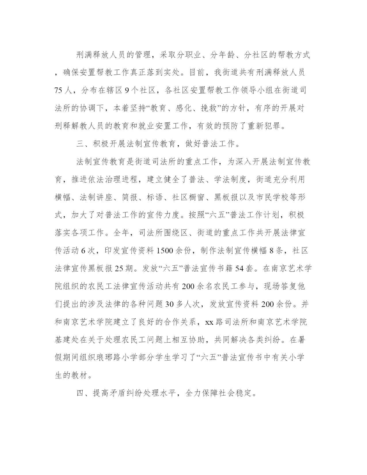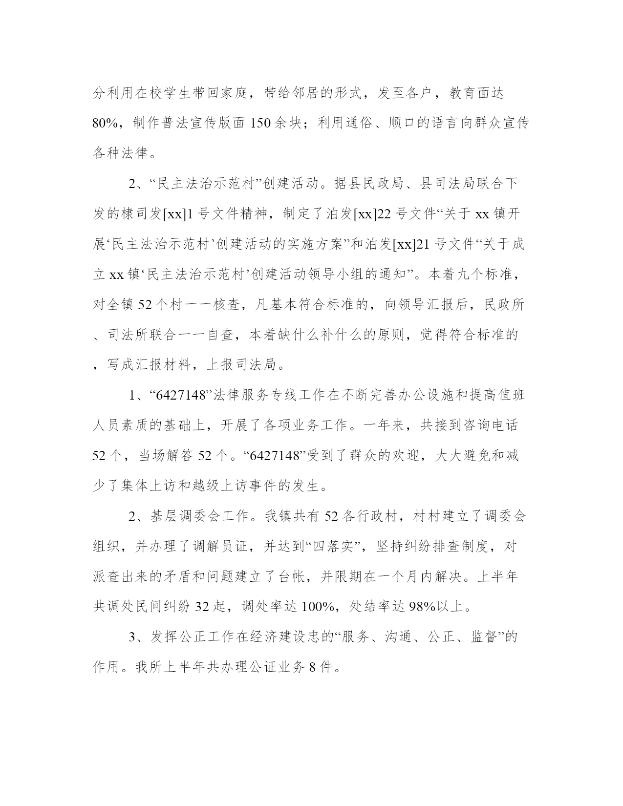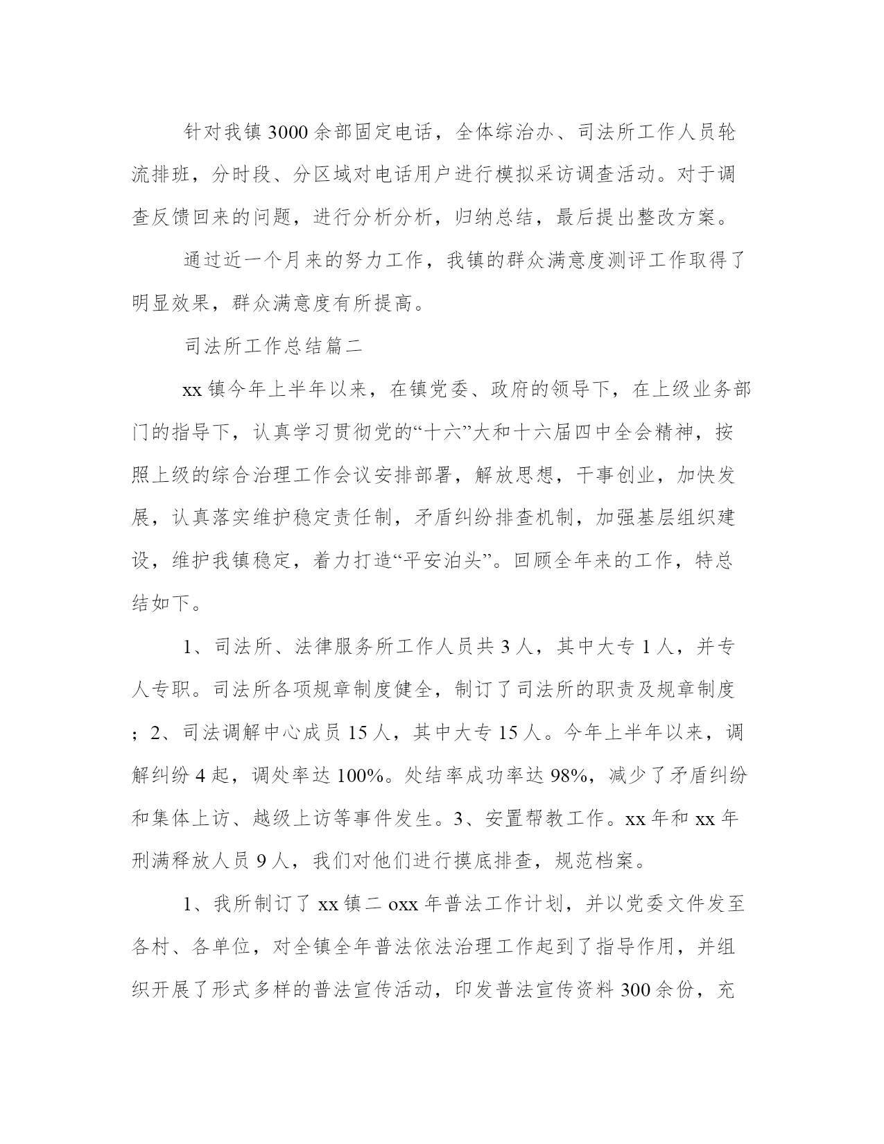 2023年司法所工作总结(优质12篇)总结是对过去一定时期的工作、学习或思想情况进行回顾、分析,并做出客观评价的书面材料,它有助于我们寻找工作和事物发展的规律,从而掌握并运用这些规律,是时候写一份总结了。怎样写总结才更能起到其作用呢?总结应该怎么写呢?下面是小编带来的优秀总结范文,希望大家能够喜欢!司法所工作总结篇一3月7日市司法局召开全市司法行政工作暨提高群众满意度动员大会后,我镇高度重视,按照上级有关精神,分工负责,合理部署,精心组织人员尽全力开展进村入户走访和电话模拟调查活动,切实做好我镇第一季度测评工作。成立了由分管领导为组长,全体综治办、司法所工作人员为成员的领导小组,召开了全镇22个村(居)委会的书记主任会议,全面铺开进村入户走访活动。联合法庭、派出所在开展了一次法制宣传活动,并要求各村委会张贴一条宣传标语,提高全镇知晓率,提高工作透明度。由各农村工作片片长带队分五个工作组,综治办、司法所、派出所、法庭工作人员为指导员,下派到村组进行进村入户走访,发放宣传单、宣传袋、联系卡、问卷调查表等5000余份。针对我镇3000余部固定电话,全体综治办、司法所工作人员轮流排班,分时段、分区域对电话用户进行模拟采访调查活动。对于调查反馈回来的问题,进行分析分析,归纳总结,最后提出整改方案。通过近一个月来的努力工作,我镇的群众满意度测评工作取得了明显效果,群众满意度有所提高。司法所工作总结篇二xx镇今年上半年以来,在镇党委、政府的领导下,在上级业务部门的指导下,认真学习贯彻党的“十六”大和十六届四中全会精神,按照上级的综合治理工作会议安排部署,解放思想,干事创业,加快发展,认真落实维护稳定责任制,矛盾纠纷排查机制,加强基层组织建设,维护我镇稳定,着力打造“平安泊头”。回顾全年来的工作,特总结如下。1、司法所、法律服务所工作人员共3人,其中大专1人,并专人专职。司法所各项规章制度健全,制订了司法所的职责及规章制度;2、司法调解中心成员15人,其中大专15人。今年上半年以来,调解纠纷4起,调处率达100%。处结率成功率达98%,减少了矛盾纠纷和集体上访、越级上访等事件发生。3、安置帮教工作。xx年和xx年刑满释放人员9人,我们对他们进行摸底排查,规范档案。1、我所制订了xx镇二oxx年普法工作计划,并以党委文件发至各村、各单位,对全镇全年普法依法治理工作起到了指导作用,并组织开展了形式多样的普法宣传活动,印发普法宣传资料300余份,充分利用在校学生带回家庭,带给邻居的形式,发至各户,教育面达80%,制作普法宣传版面150余块;利用通俗、顺口的语言向群众宣传各种法律。2、“民主法治示范村”创建活动。据县民政局、县司法局联合下发的棣司发[xx]1号文件精神,制定了泊发[xx]22号文件“关于xx镇开展‘民主法治示范村’创建活动的实施方案”和泊发[xx]21号文件“关于成立xx镇‘民主法治示范村’创建活动领导小组的通知”。本着九个标准,对全镇52个村一一核查,凡基本符合标准的,向领导汇报后,民政所、司法所联合一一自查,本着缺什么补什么的原则,觉得符合标准的,写成汇报材料,上报司法局。1、“6427148”法律服务专线工作在不断完善办公设施和提高值班人员素质的基础上,开展了各项业务工作。一年来,共接到咨询电话52个,当场解答52个。“6427148”受到了群众的欢迎,大大避免和减少了集体上访和越级上访事件的发生。2、基层调委会工作。我镇共有52各行政村,村村建立了调委会组织,并办理了调解员证,并达到“四落实”,坚持纠纷排查制度,对派查出来的矛盾和问题建立了台帐,并限期在一个月内解决。上半年共调处民间纠纷32起,调处率达100%,处结率达98%以上。3、发挥公正工作在经济建设忠的“服务、沟通、公正、监督”的作用。我所上半年共办理公证业务8件。在上半年的工作中,还存在着许多的不足,我们将严格按上级要求干好一切工作,不断树立好自己的形象。司法所工作总结篇三2015年,xx路司法所在区司法局、及街道党工委、办事处的正确领导下,在科学发展观的指引下,坚持以人为本,认真实践依法治国的方略,开展人民调解、法律宣传、社区矫正、安置帮教工作,各项工作稳步推进。具体如下:一、加强人员管理进行合理分工。由于工作人员的调整xx路司法所对司法所工作人员进行了重新分工,责任落实到人,重新组建了xx路街道人民调解委员会。并对9个社区调解委员会调解人员重新确定,在辖区内7家企事业单位成立了人民矛盾处理调解中心,完成了全年的目标任务。分别成立了矫正帮教、法律宣传、法治街道工作领导小组。在街道形成了上下联动、点面结合的司法体制。二、加强社区矫正、帮教工作减少重新犯罪。按照相关的法律和规章制度,司法所加强了对矫正对象的管理,对每个矫