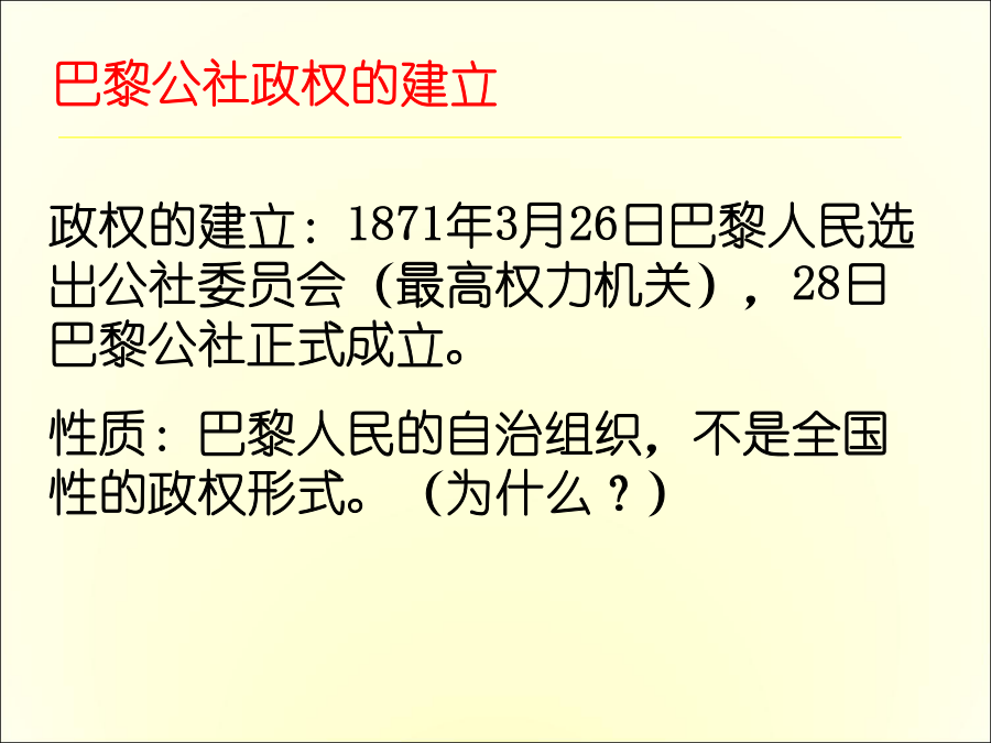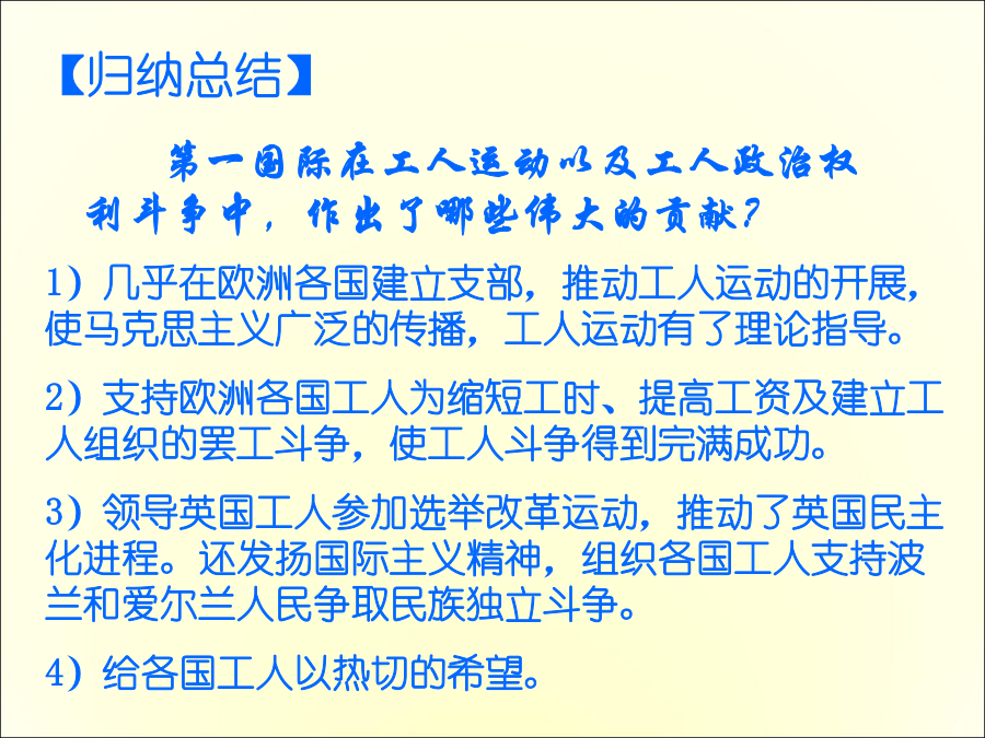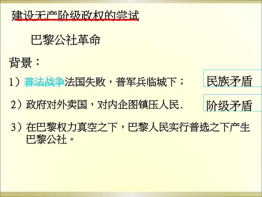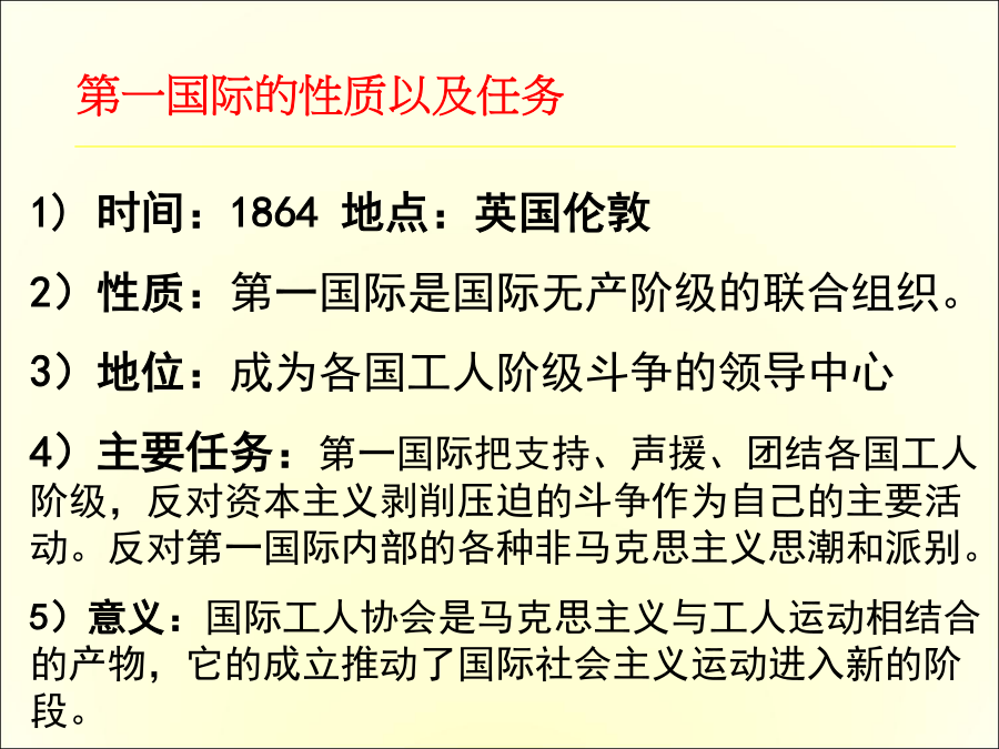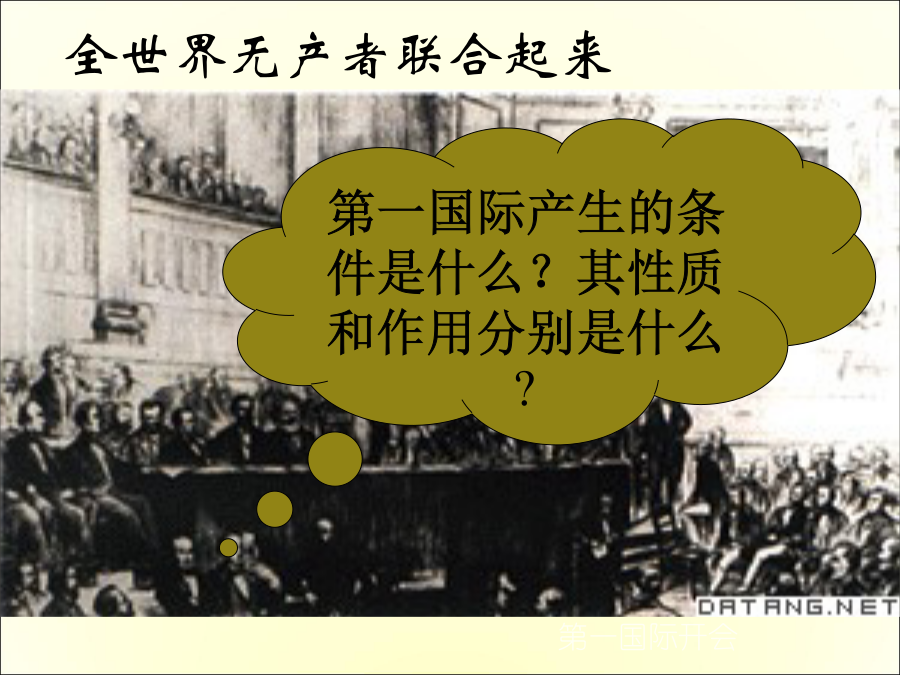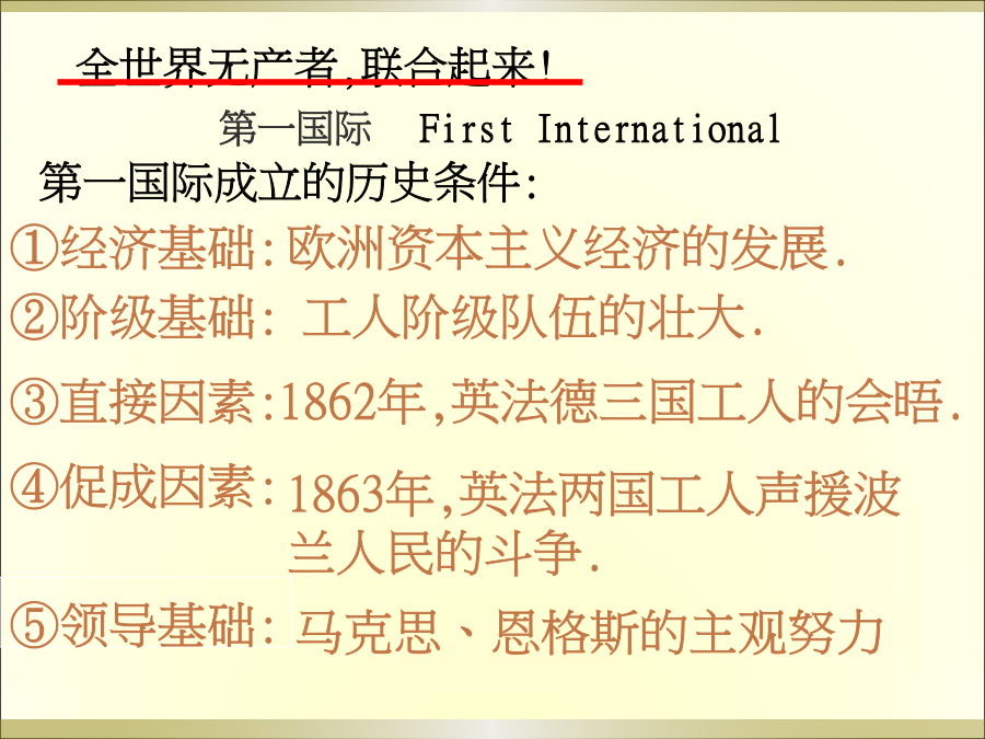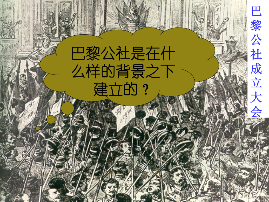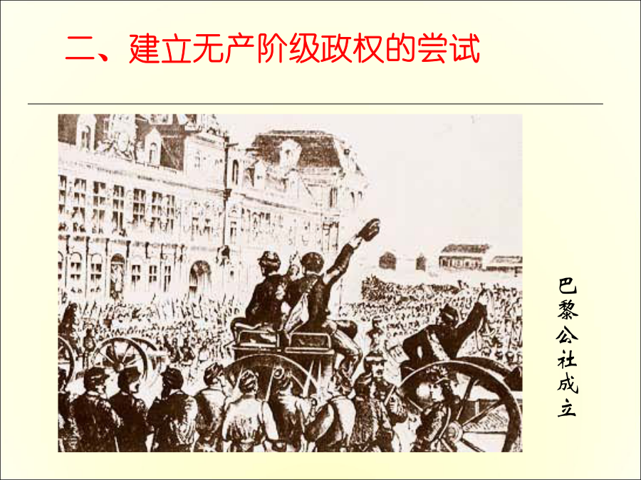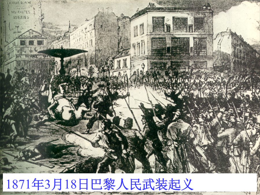 国际工人运动的艰辛历程第一国际产生的条件是什么?其性质和作用分别是什么?全世界无产者,联合起来!第一国际的性质以及任务【归纳总结】巴黎公社成立大会建设无产阶级政权的尝试1871年3月18日巴黎人民武装起义巴黎公社政权的建立政权建设:废除旧军队、警察……代之以新的国民自卫军……规定公社委员和工作人员由民主选举产生,人民有权监督和罢免……经济措施:没收逃亡资本家的工厂,交给工人合作社管理;监督铁路运输和军需生产……公社职员的薪金最高不得超过工人的最高工资即年薪6000法郎……如何体现巴黎公社实行无产阶级的民主与专政?材料一马克思在1870年9月公开说:“由此可见,法国工人阶级正处于极困难的境地。在目前的危机中,当敌人几乎已经在敲巴黎城门的时候,一切推翻新政府的企图都将是绝望的蠢举。法国工人应该执行自己的公民职责,但同时他们不应当为1792年的民族回忆所迷惑,就像法国农民曾经为第一帝国的民族回忆所欺骗那样。他们不应该重复过去,而是应该建设将来。惟愿他们镇静而且坚决地利用共和国的自由所提供的机会,去加强他们自己阶级的组织。”回答:①材料一马克思的基本态度是什么?材料二马克思在1871年4月12日称赞巴黎工人说:“这些巴黎人,具有何等的灵活性,何等的自我牺牲精神!在忍受了六月与其说是外部敌人不如说是内部叛变所造成的饥饿和破坏之后,他们在普军的刺刀下起义了,好像法国和德国之间不曾发生战争似的,好像敌人并没有站在巴黎的大门前似的!历史上还没有过这种英勇奋斗的范例!”材料三马克思还说:巴黎公社“不过是在特殊条件下的一个城市的起义,而且公社中的大多数人根本不是社会主义者,也不可能是社会主义者。”以上均引自《马恩列斯论巴黎公社》②材料二对巴黎工人的评价与材料一是否矛盾?说明你的观点。③材料三与材料二是否矛盾?说明你的观点。②不矛盾。因为当时的历史条件还不足以进行无产阶级革命,但是,当巴黎工人迫于形势,自发地发动起义建立巴黎公社,进行无产阶级专政的尝试时,马克思肯定了巴黎工人阶级的首创精神。③不矛盾。巴黎公社的领导人大多数是蒲鲁东主义者和布朗基主义者,他们还不懂得什么是社会主义。公社领导人只是出于尝试精神与客观地指出公社产生的条件不足及其缺陷并不矛盾。巴黎公社的失败及其原因“纪念1871年5月21日—28日公社的牺牲者”材料二:“当凡尔赛在磨刀霍霍时,巴黎却沉浸在起义胜利的欢乐中,他们认为继续向凡尔赛进军是在挑起内战。”巴黎公社失败的原因欧仁·鲍狄埃在公社失败的悲痛日子里,以满腔热诚写下了惊心动魄的诗篇《国际歌》。1888年,狄盖特为《国际歌》谱曲。这首气壮山河的《国际歌》是一座以巴黎无产阶级鲜血谱写成的纪念碑。一个世纪以来,它以气势磅礴、雄伟庄严的旋律,把无产阶级革命真理传遍全球,成了全世界无产阶级的战歌。从来就没有什么救世主也不靠神仙皇帝要创造人类的幸福全靠我们自己我们要夺回劳动果实让思想冲破牢笼快把那炉火烧的通红趁热打铁才能成功!这是最后的斗争团结起来,到明天英特那雄纳尔就一定要实现这是最后的斗争团结起来,到明天英特那雄纳尔就一定要实现巴黎公社有何重大的历史意义?三、第二国际的建立第一国际和第二国际的比较不同点原因:(1)不同的历史条件和革命任务所决定.(2)第二国际建立前后,由于欧美工人运动兴起,各国社会民主党普遍建立,各国的国情和面临的革命任务有相当大的差别,造成了统一领导的难以实现.1、世界历史上第一个无产阶级政权是A.苏维埃俄国B.苏联C.中国D.巴黎公社2.根据107页“文献资料”——“让统治阶级在共产主义革命面前发抖吧。无产阶级在这个革命中失去的只是锁链。他们获得的将是整个世界。”回答:A.这段话出自什么文件?B.它是哪个组织的纲领?C.作者是谁?D.它的发表有什么意义?1870年7月19日,普法战争爆发俾斯麦“我亲爱的兄弟,由于我不能和自己的军队一道去死,我只能把自己的佩剑献给陛下,我仍然是陛下的好兄弟。”——路易·波拿巴市政厅