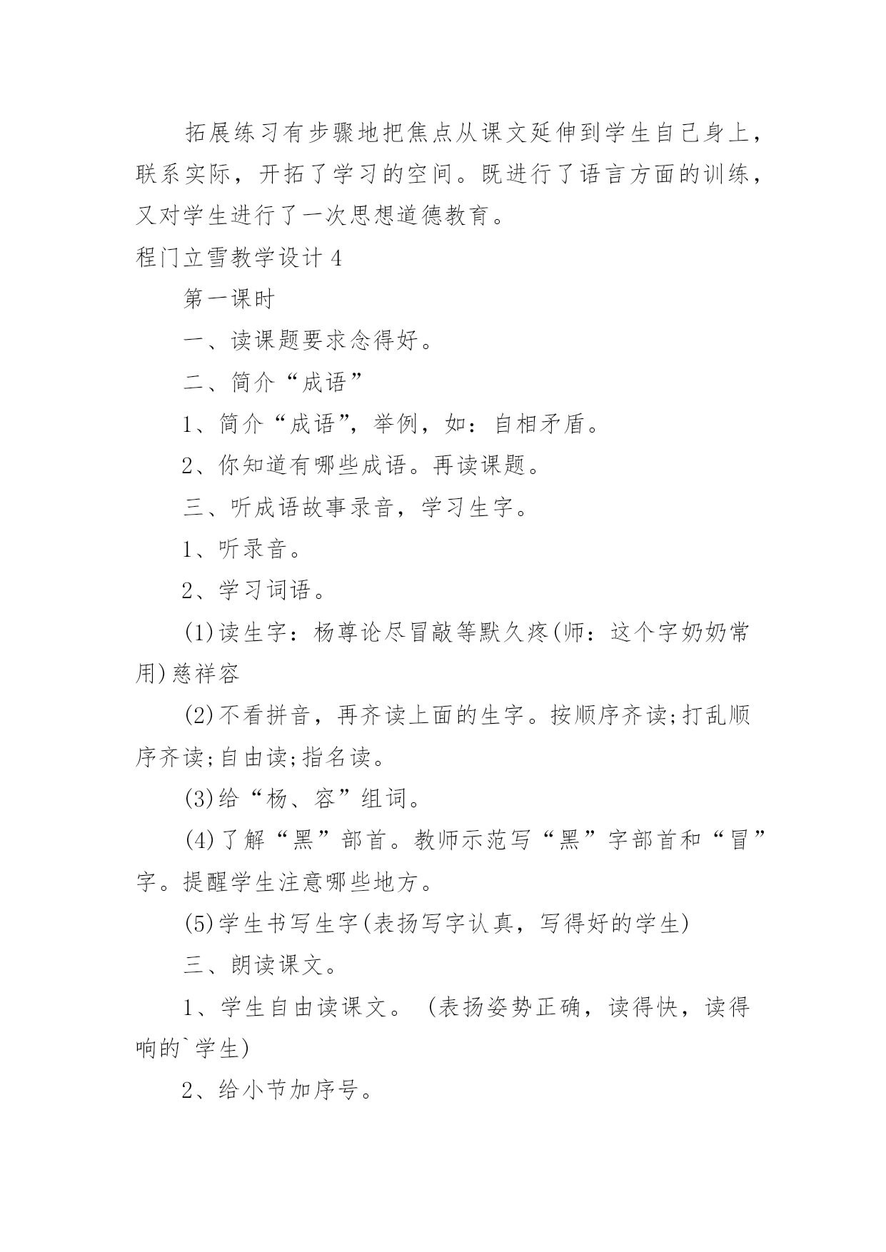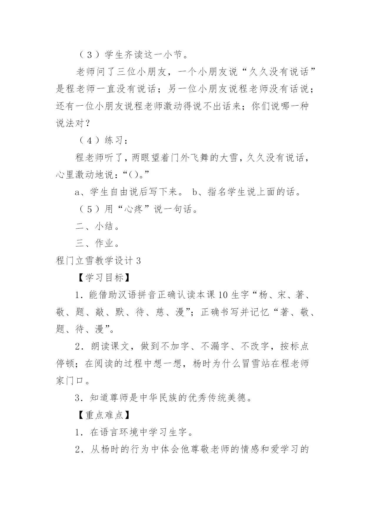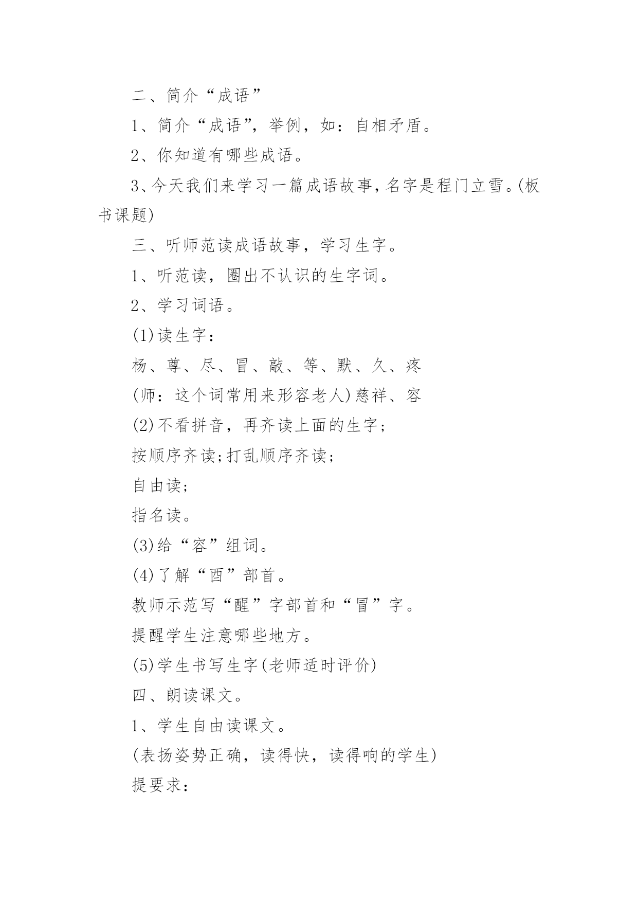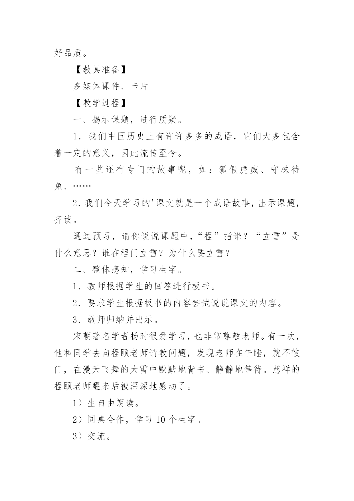 程门立雪教学设计程门立雪教学设计在教学工作者开展教学活动前,时常需要编写教学设计,教学设计是把教学原理转化为教学材料和教学活动的计划。那么什么样的教学设计才是好的呢?以下是小编为大家整理的程门立雪教学设计,欢迎阅读,希望大家能够喜欢。程门立雪教学设计1教学要求:1、认读本课生字,会写本课生字。2、了解课文讲了一个什么样的成语故事。3、正确、流利、有感情地朗读课文。教学重难点:认读本课生字,会写本课生字。教学准备:生字卡片教学方法:指导法、归类法教学过程:一、列举孩子们耳熟能详的成语故事。师:孩子们听说过这些故事吧,这些故事还有个共同的.名字叫成语故事。二、简介“成语”1、简介“成语”,举例,如:自相矛盾。2、你知道有哪些成语。3、今天我们来学习一篇成语故事,名字是程门立雪。(板书课题)三、听师范读成语故事,学习生字。1、听范读,圈出不认识的生字词。2、学习词语。(1)读生字:杨、尊、尽、冒、敲、等、默、久、疼(师:这个词常用来形容老人)慈祥、容(2)不看拼音,再齐读上面的生字;按顺序齐读;打乱顺序齐读;自由读;指名读。(3)给“容”组词。(4)了解“酉”部首。教师示范写“醒”字部首和“冒”字。提醒学生注意哪些地方。(5)学生书写生字(老师适时评价)四、朗读课文。1、学生自由读课文。(表扬姿势正确,读得快,读得响的学生)提要求:(1)标自然段。(2)课文讲了一个什么故事。(3)文中出现了几个人物,分别是谁?2、小组交流自学结果,并纠错。3、小组反馈交流结果。4、师适时评价。5、抽学生分自然段读、师适时指导、纠错读音。6、评价。五、作业布置1、讲田字格中的字组一个词语。2、找一找你还读过哪学成语故事。板书设计:程门立雪醒容急程门立雪教学设计2第一课时一、读课题要求念得好。二、简介“成语”1、简介“成语”,举例,如:自相矛盾。2、你知道有哪些成语。再读课题。三、听成语故事录音,学习生字。1、听录音。2、学习词语。(1)读生字:杨尊论尽冒敲等默久疼(师:这个字奶奶常用)慈祥容(2)不看拼音,再齐读上面的生字。按顺序齐读;打乱顺序齐读;自由读;指名读。(3)给“杨、容”组词。(4)了解“黑”部首。教师示范写“黑”字部首和“冒”字。提醒学生注意哪些地方。(5)学生书写生字(表扬写字认真,写得好的学生)三、朗读课文。1、学生自由读课文。(表扬姿势正确,读得快,读得响的学生)2、给小节加序号。3、指名学生自由选读课文某一小节,教师给评点指导。4、教师示范读第三自然段。(要求学生学着读)5、指名读课文某一小节。第二课时一、学习课文。1、齐读第一自然段。教师评点,要求学生读得好。指名学生背诵。2、练习(1)杨时()要求学生说一句话。(2)杨时是宋朝()大学问家。要求用上既……又……3、齐读第二至五小节。4、指名学生分别读2-5小节。5、理解“程门立雪”的意思。(1)“程”是什么意思?(师简介“程颐”)(2)“门”是什么意思?“立”是什么意思?(3)成语中还缺什么?(谁和谁)6、说话练习。(1)程门(谁)和(谁)立雪。(2)要求把“程门立雪”的意思说具体。程门(谁)和(谁)立雪(),(),()。(3)学生自由说。“程门立雪”指的'是()。(4)指名说“程门立雪”指的是什么?(5)把“准备请教”、“谁和谁”、“站在”部分放在前面怎么说?在这句话前用上“为了……”该怎么说?(6)在上面的话后加上“说明杨时是()的大学问家”怎么说?7、读、背末一小节,完成练习。(1)指名读最后一小节。(教师评议)(2)教师示范读最后一小节。(3)学生齐读这一小节。老师问了三位小朋友,一个小朋友说“久久没有说话”是程老师一直没有说话;另一位小朋友说程老师没有话说;还有一位小朋友说程老师激动得说不出话来;你们说哪一种说法对?(4)练习:程老师听了,两眼望着门外飞舞的大雪,久久没有说话,心里激动地说:“()。”a、学生自由说后写下来。b、指名学生说上面的话。(5)用“心疼”说一句话。二、小结。三、作业。程门立雪教学设计3【学习目标】1.能借助汉语拼音正确认读本课10生字“杨、宋、著、敬、题、敲、默、待、慈、漫”;正确书写并记忆“著、敬、题、待、漫”。2.朗读课文,做到不加字、不漏字、不改字,按标点停顿;在阅读的过程中想一想,杨时为什么冒雪站在程老师家门口。3.知道尊师是中华民族的优秀传统美德。【重点难点】1.在语言环境中学习生字。2.从杨时的行为中体会他尊敬老师的情感和爱学习的好品质。【教具准备】多媒体课件、卡片【教学过程】一、揭示课题,进行质疑。1.我们中国历史上有许许多多的成语,它们大多包含着一定的意义,因此流传至今。有一些还有专门的故事呢,如:狐假虎威、守株待兔、……2.我们今天学习的'课文就是一个成语故事,出示课题,齐读。通过预习,请你说说课题中,“程”指谁?“立