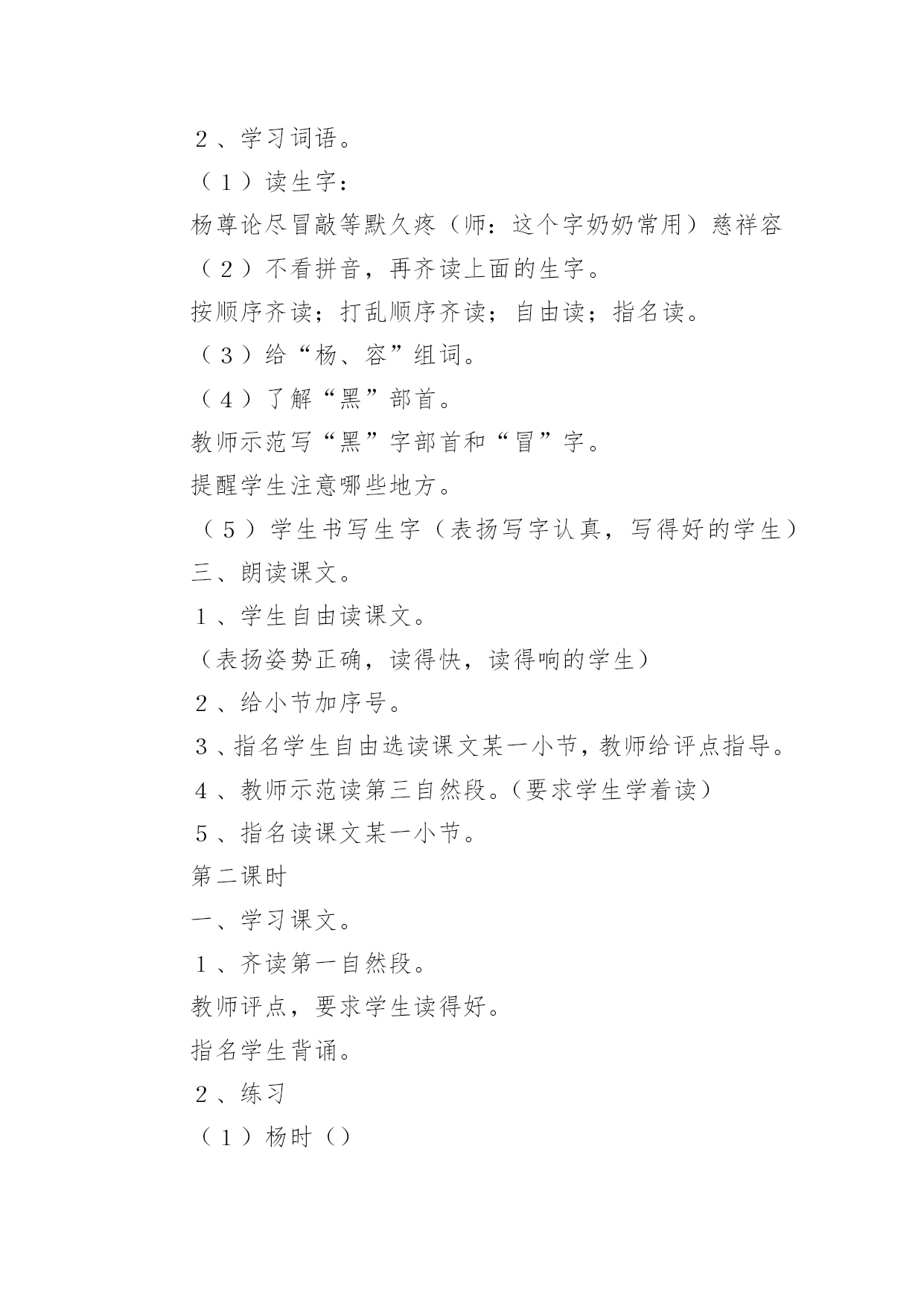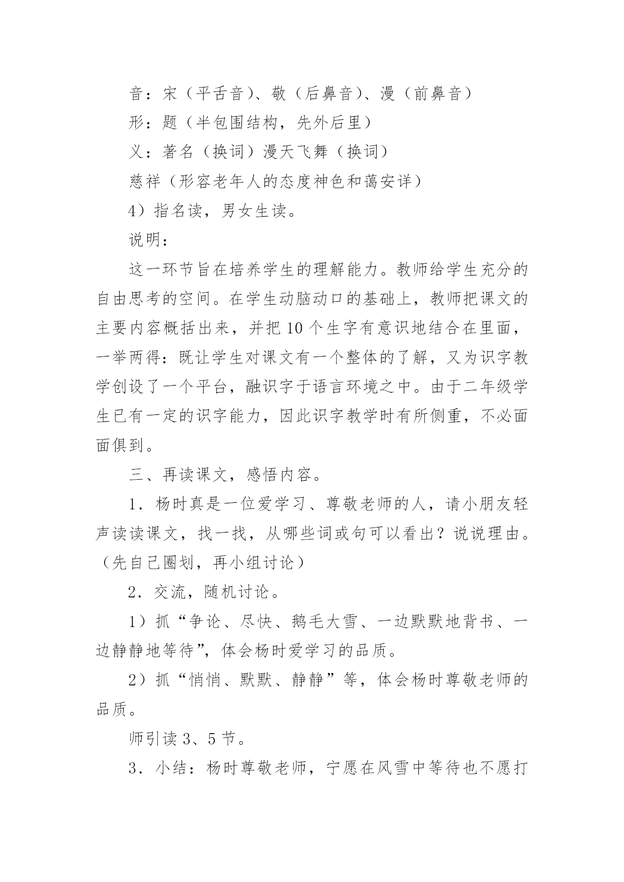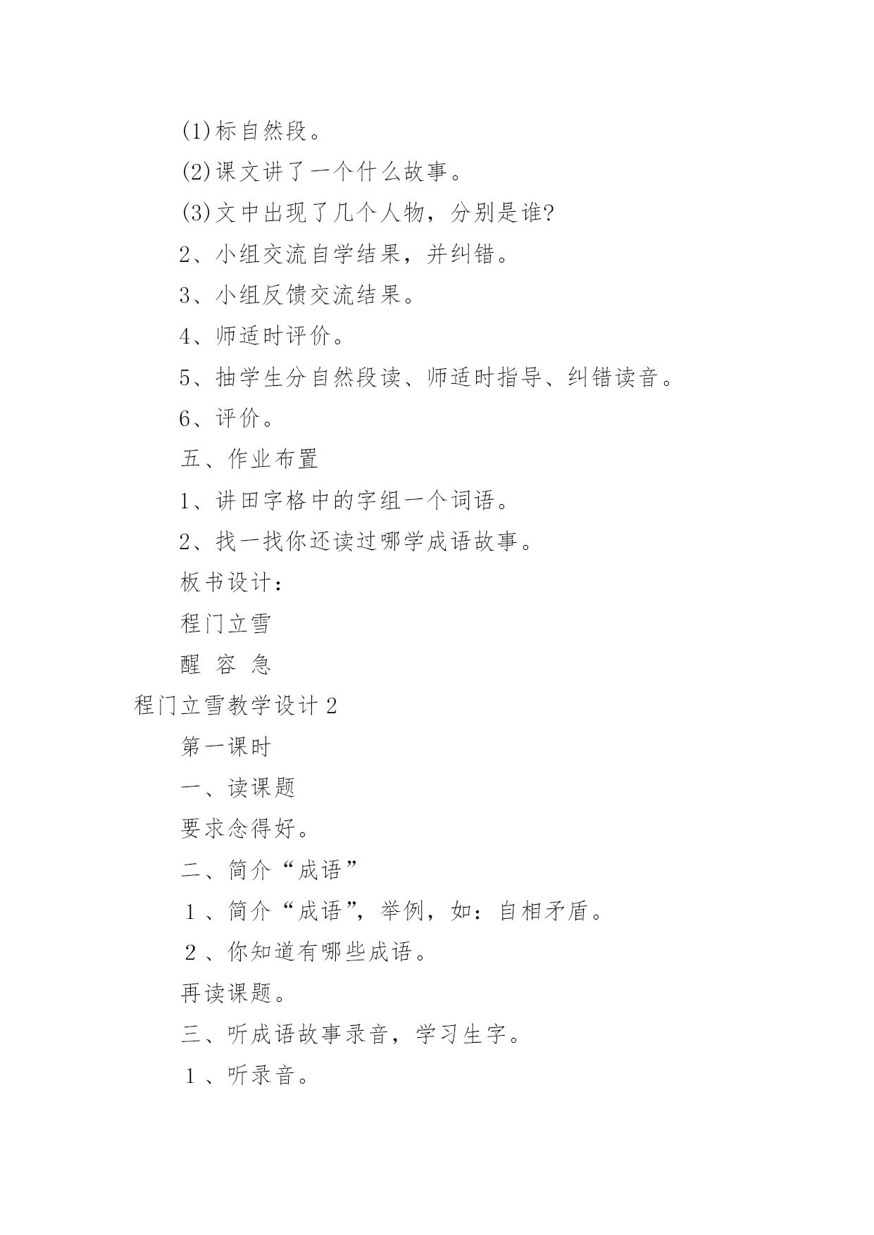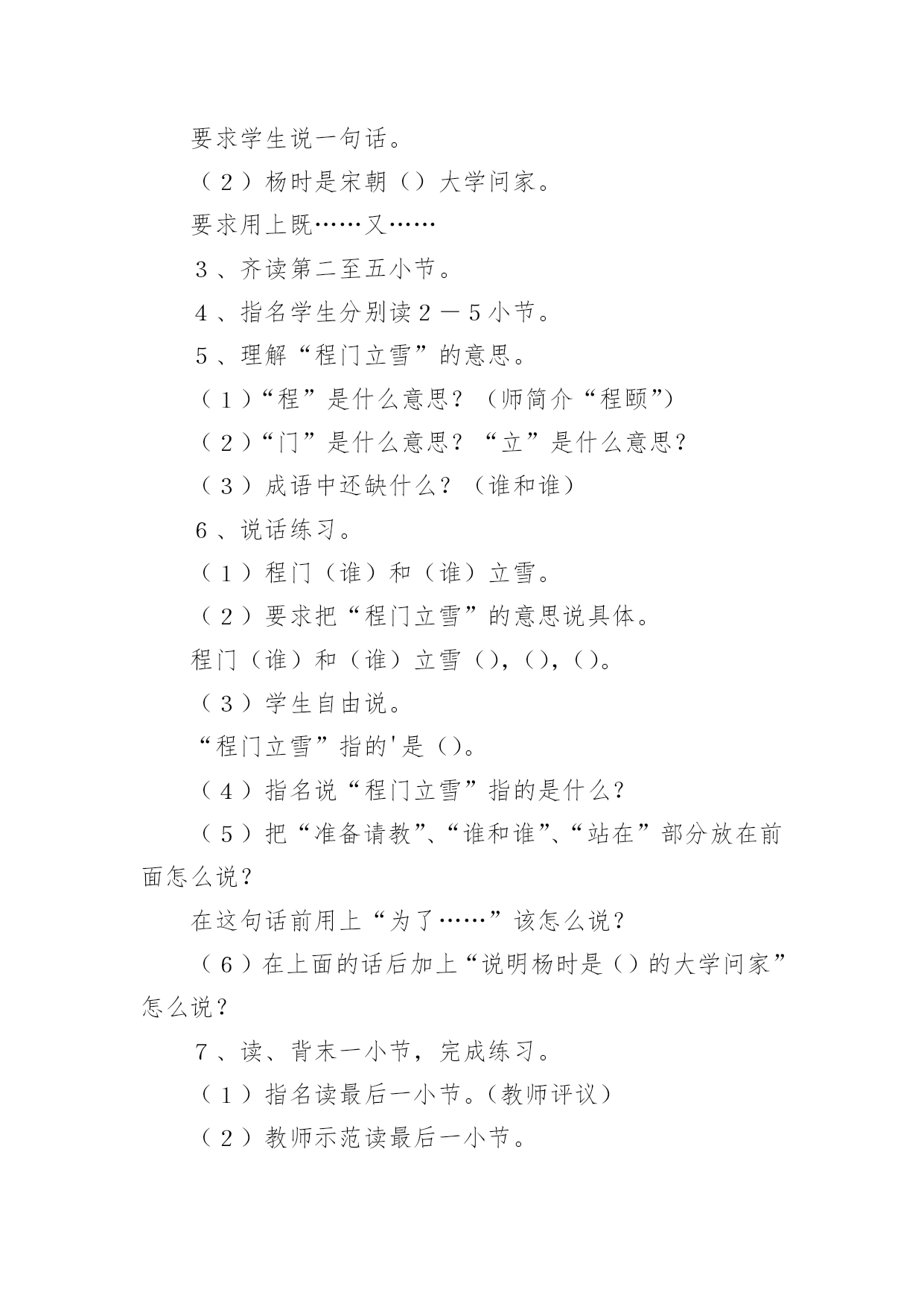 程门立雪教学设计程门立雪教学设计在教学工作者开展教学活动前,时常需要编写教学设计,教学设计是把教学原理转化为教学材料和教学活动的计划。那么什么样的教学设计才是好的呢?以下是小编为大家整理的程门立雪教学设计,欢迎阅读,希望大家能够喜欢。程门立雪教学设计1教学要求:1、认读本课生字,会写本课生字。2、了解课文讲了一个什么样的成语故事。3、正确、流利、有感情地朗读课文。教学重难点:认读本课生字,会写本课生字。教学准备:生字卡片教学方法:指导法、归类法教学过程:一、列举孩子们耳熟能详的成语故事。师:孩子们听说过这些故事吧,这些故事还有个共同的.名字叫成语故事。二、简介“成语”1、简介“成语”,举例,如:自相矛盾。2、你知道有哪些成语。3、今天我们来学习一篇成语故事,名字是程门立雪。(板书课题)三、听师范读成语故事,学习生字。1、听范读,圈出不认识的生字词。2、学习词语。(1)读生字:杨、尊、尽、冒、敲、等、默、久、疼(师:这个词常用来形容老人)慈祥、容(2)不看拼音,再齐读上面的生字;按顺序齐读;打乱顺序齐读;自由读;指名读。(3)给“容”组词。(4)了解“酉”部首。教师示范写“醒”字部首和“冒”字。提醒学生注意哪些地方。(5)学生书写生字(老师适时评价)四、朗读课文。1、学生自由读课文。(表扬姿势正确,读得快,读得响的学生)提要求:(1)标自然段。(2)课文讲了一个什么故事。(3)文中出现了几个人物,分别是谁?2、小组交流自学结果,并纠错。3、小组反馈交流结果。4、师适时评价。5、抽学生分自然段读、师适时指导、纠错读音。6、评价。五、作业布置1、讲田字格中的字组一个词语。2、找一找你还读过哪学成语故事。板书设计:程门立雪醒容急程门立雪教学设计2第一课时一、读课题要求念得好。二、简介“成语”1、简介“成语”,举例,如:自相矛盾。2、你知道有哪些成语。再读课题。三、听成语故事录音,学习生字。1、听录音。2、学习词语。(1)读生字:杨尊论尽冒敲等默久疼(师:这个字奶奶常用)慈祥容(2)不看拼音,再齐读上面的生字。按顺序齐读;打乱顺序齐读;自由读;指名读。(3)给“杨、容”组词。(4)了解“黑”部首。教师示范写“黑”字部首和“冒”字。提醒学生注意哪些地方。(5)学生书写生字(表扬写字认真,写得好的学生)三、朗读课文。1、学生自由读课文。(表扬姿势正确,读得快,读得响的学生)2、给小节加序号。3、指名学生自由选读课文某一小节,教师给评点指导。4、教师示范读第三自然段。(要求学生学着读)5、指名读课文某一小节。第二课时一、学习课文。1、齐读第一自然段。教师评点,要求学生读得好。指名学生背诵。2、练习(1)杨时()要求学生说一句话。(2)杨时是宋朝()大学问家。要求用上既……又……3、齐读第二至五小节。4、指名学生分别读2-5小节。5、理解“程门立雪”的意思。(1)“程”是什么意思?(师简介“程颐”)(2)“门”是什么意思?“立”是什么意思?(3)成语中还缺什么?(谁和谁)6、说话练习。(1)程门(谁)和(谁)立雪。(2)要求把“程门立雪”的意思说具体。程门(谁)和(谁)立雪(),(),()。(3)学生自由说。“程门立雪”指的'是()。(4)指名说“程门立雪”指的是什么?(5)把“准备请教”、“谁和谁”、“站在”部分放在前面怎么说?在这句话前用上“为了……”该怎么说?(6)在上面的话后加上“说明杨时是()的大学问家”怎么说?7、读、背末一小节,完成练习。(1)指名读最后一小节。(教师评议)(2)教师示范读最后一小节。(3)学生齐读这一小节。老师问了三位小朋友,一个小朋友说“久久没有说话”是程老师一直没有说话;另一位小朋友说程老师没有话说;还有一位小朋友说程老师激动得说不出话来;你们说哪一种说法对?(4)练习:程老师听了,两眼望着门外飞舞的大雪,久久没有说话,心里激动地说:“()。”a、学生自由说后写下来。b、指名学生说上面的话。(5)用“心疼”说一句话。二、小结。三、作业。程门立雪教学设计3【学习目标】1.能借助汉语拼音正确认读本课10生字“杨、宋、著、敬、题、敲、默、待、慈、漫”;正确书写并记忆“著、敬、题、待、漫”。2.朗读课文,做到不加字、不漏字、不改字,按标点停顿;在阅读的过程中想一想,杨时为什么冒雪站在程老师家门口。3.知道尊师是中华民族的优秀传统美德。【重点难点】1.在语言环境中学习生字。2.从杨时的行为中体会他尊敬老师的情感和爱学习的好品质。【教具准备】多媒体课件、卡片【教学过程】一、揭示课题,进行质疑。1.我们中国历史上有许许多多的成语,它们大多包含着一定的意义,因此流传至今。有一些还有专门的故事呢,如:狐假虎威、守株待兔、……2.我们今天学习的'课文就是一个成语故事,出示课题,齐读。通过预习,请你说说课题中,“程”指谁?“立