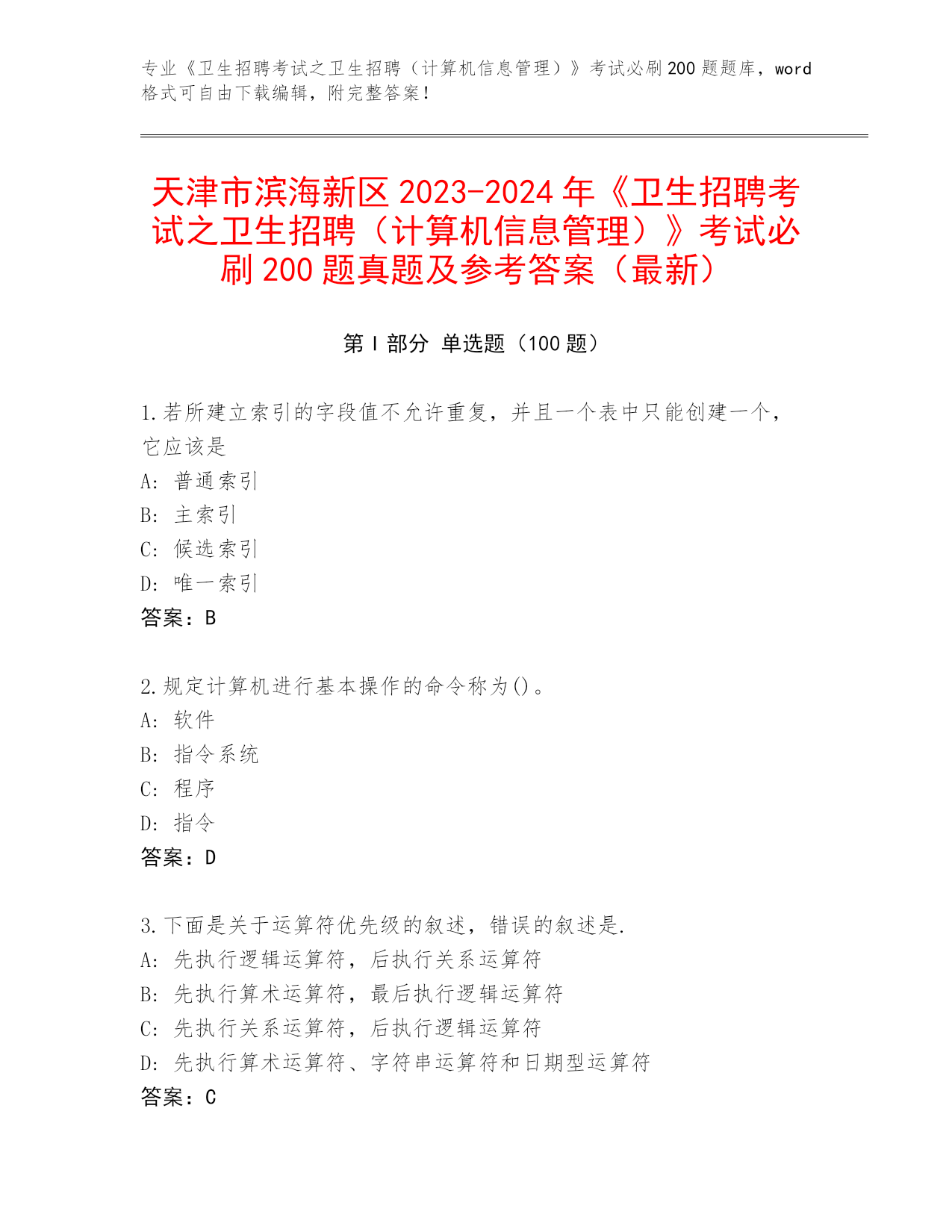 天津市滨海新区2023-2024年《卫生招聘考试之卫生招聘(计算机信息管理)》考试必刷200题真题及参考答案(最新)