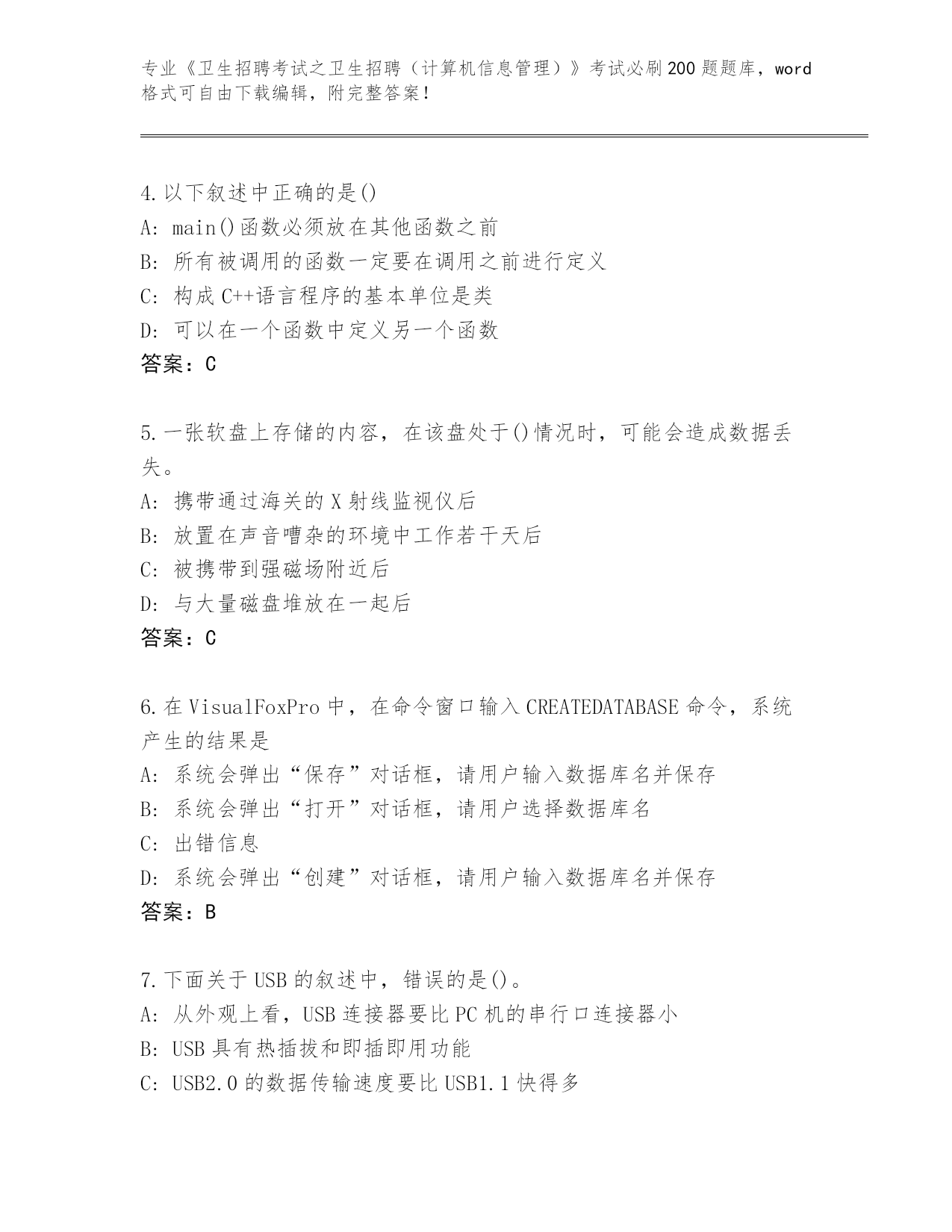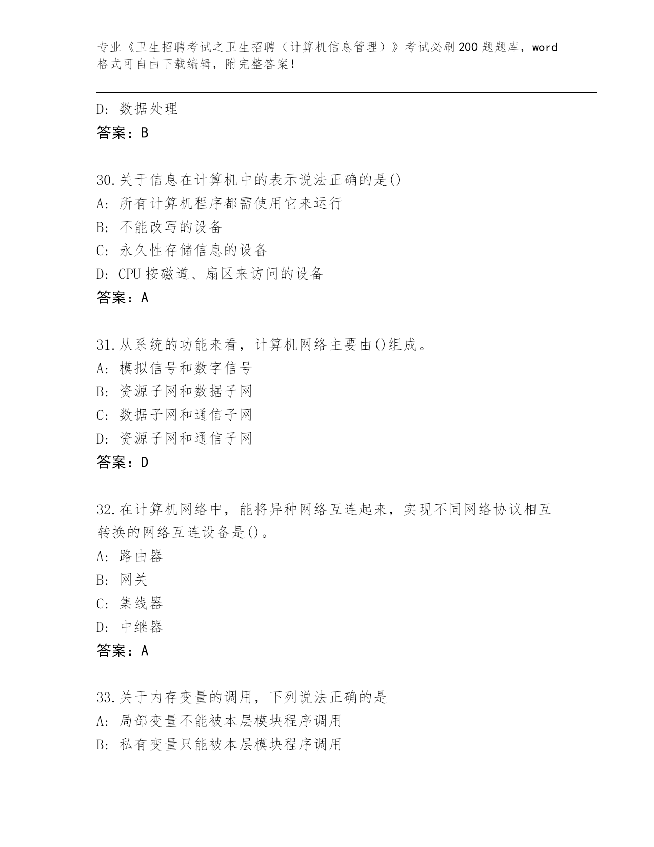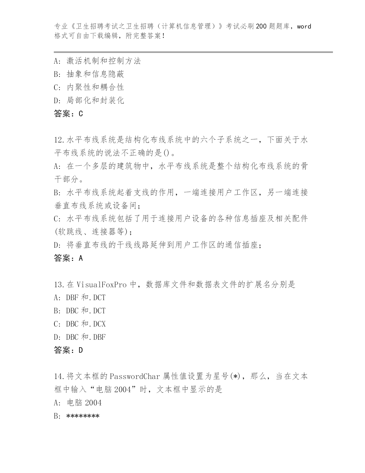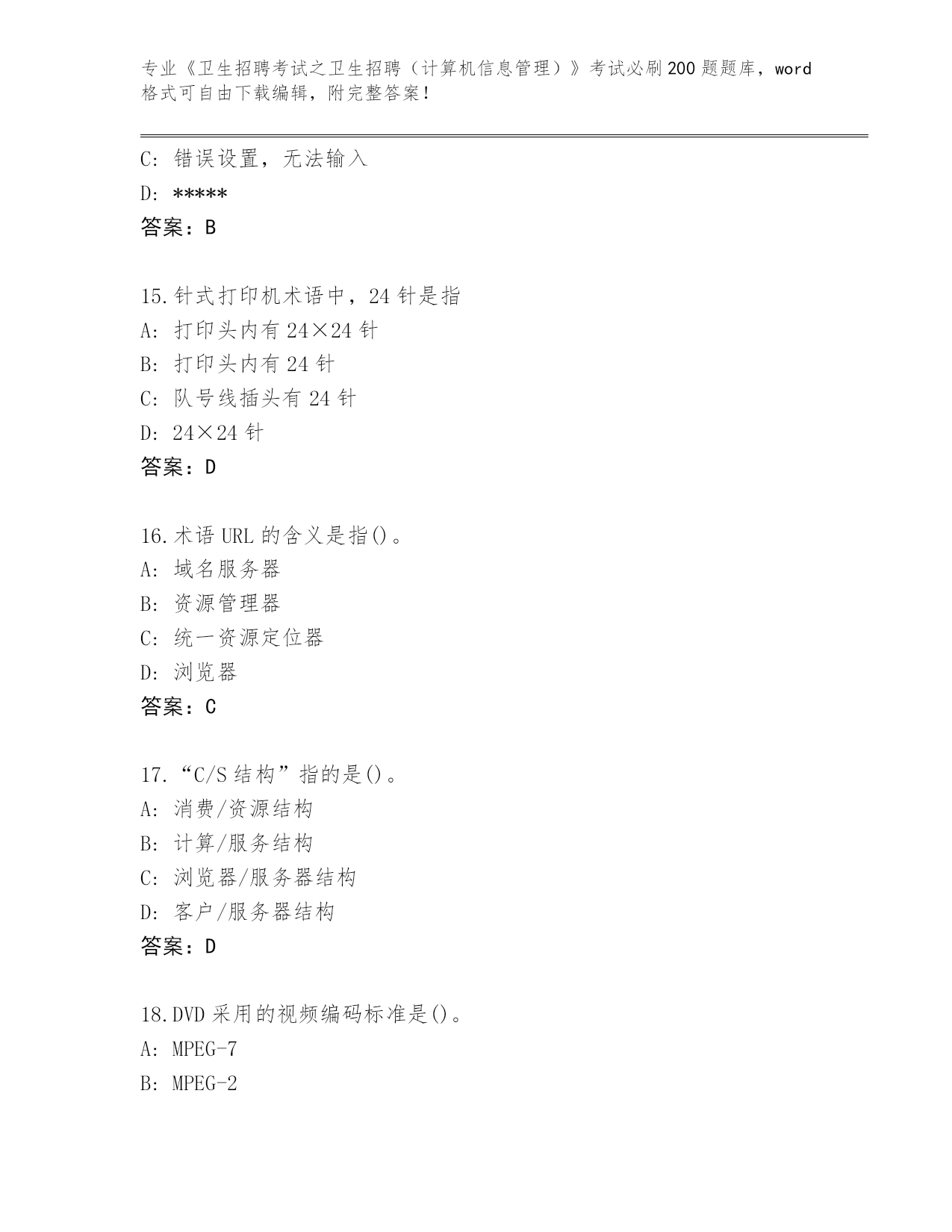 山东省2024《卫生招聘考试之卫生招聘(计算机信息管理)》考试必刷200题真题及答案(最新)