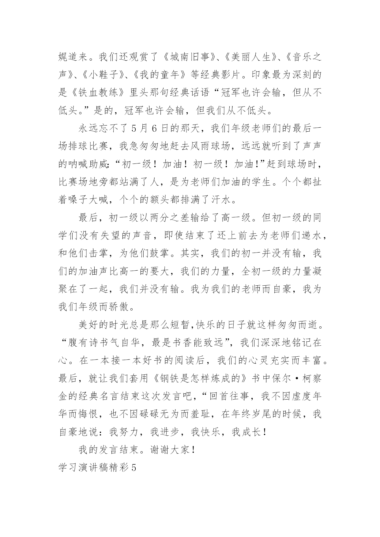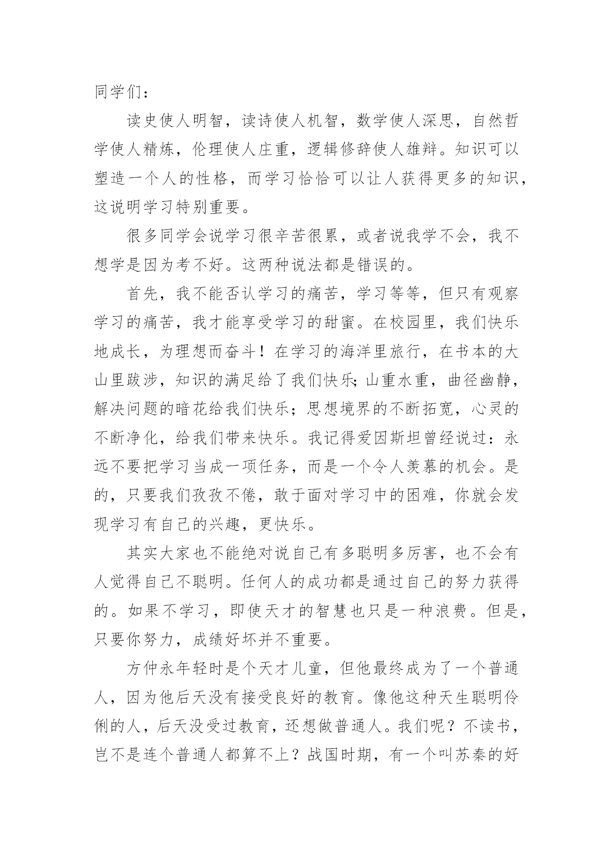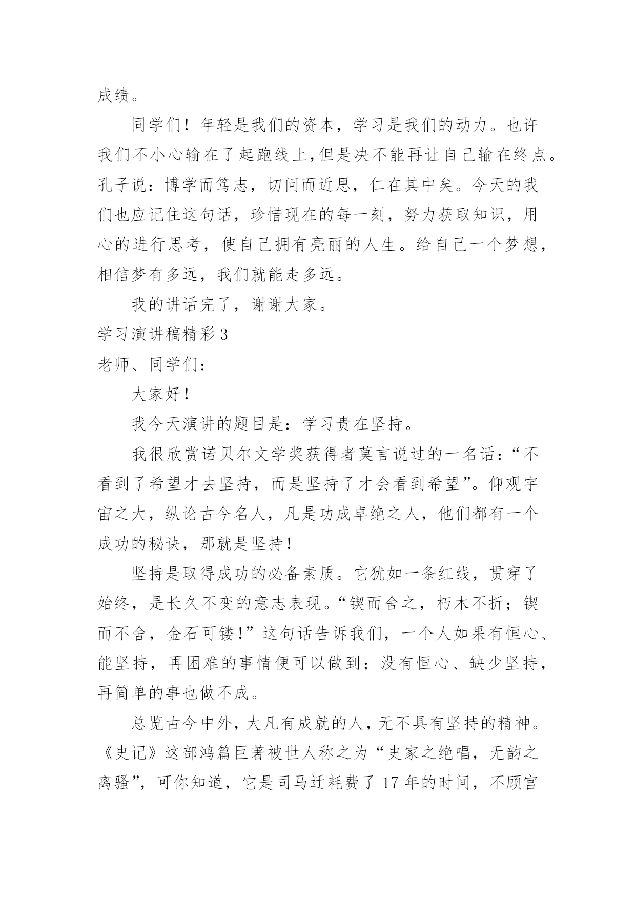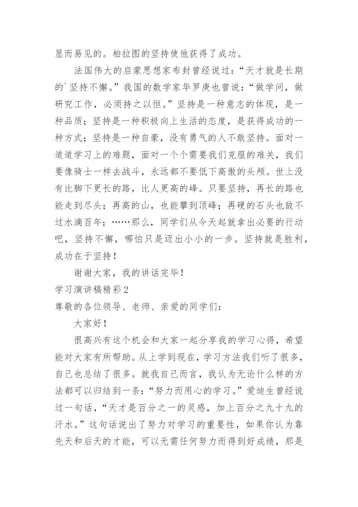 学习演讲稿精彩学习演讲稿精彩演讲稿具有观点鲜明,内容具有鼓动性的特点。在社会发展不断提速的今天,用到演讲稿的地方越来越多,那要怎么写好演讲稿呢?下面是小编整理的学习演讲稿精彩,希望对大家有所帮助。学习演讲稿精彩1老师们,同学们:早上好!今天,我国旗下讲话的题目是:《人生之路贵在坚持》。首先我想与大家分享一个有趣的故事:这个故事发生在古希腊。开学第一天,大哲学家苏格拉底对学生说:“今天咱们只学一件最简单也是最容易做的事。每人把胳膊尽量往前甩。”说着,苏格拉底示范了一遍,“从今天开始,每天做300下,大家能做到吗?”学生们都笑了,这么简单的事,有什么做不到的!过了一个月,苏格拉底问学生们:“每天甩300下,哪些同学坚持了?”有90%的同学骄傲地举起了手。又过了一个月,苏格拉底又问,这回,坚持下来的学生只剩下八成。一年后,苏格拉底再一次问大家:“请告诉我,最简单的甩手运动,还有哪几位同学坚持了?”这时,整个教室里,只有一人举起了手。这个学生就是后来成为古希腊另一位大哲学家的柏拉图。这个小故事所蕴含的深刻含意是显而易见的。柏拉图的坚持使他获得了成功。法国伟大的启蒙思想家布封曾经说过:“天才就是长期的`坚持不懈。”我国的数学家华罗庚也曾说:“做学问,做研究工作,必须持之以恒。”坚持是一种意志的体现,是一种品质;坚持是一种积极向上生活的态度,是获得成功的一种方式;坚持是一种自豪,没有勇气的人不敢坚持。面对一道道学习上的难题,面对一个个需要我们克服的难关,我们要像骑士一样去战斗,永远都不要低下高傲的头颅。世上没有比脚下更长的路,比人更高的峰。只要坚持,再长的路也能走到尽头;再高的山,也能攀到顶峰;再硬的石头也敌不过水滴百年;……那么,同学们从今天起就拿出必要的行动吧,坚持不懈,哪怕只是迈出小小的一步。坚持就是胜利,成功在于坚持!谢谢大家,我的讲话完毕!学习演讲稿精彩2尊敬的各位领导、老师、亲爱的同学们:大家好!很高兴有这个机会和大家一起分享我的学习心得,希望能对大家有所帮助。从上学到现在,学习方法我们听了很多,自己也总结了很多。就我自己而言,我认为无论什么样的方法都可以归结到一条:“努力而用心的学习。”爱迪生曾经说过一句话,“天才是百分之一的灵感,加上百分之九十九的汗水。”这句话说出了努力对学习的重要性,如果你认为靠先天和后天的才能,可以无需任何努力而得到好成绩,那是不可能的。因为学习永远是一架保持平衡的天平,一边是付出一边是收获。不劳必定无获!而用心则是努力的翅膀,如果我们只是一味的低头赶路,却不去思考前进的方向,那我们可能会无法找到出路。掌握基本知识需要我们努力,将知识融会贯通则需要我们用心。而一旦我们将基础知识融会贯通起来,那我们的学习就会事半功倍。如果说天才出于勤奋那么勤奋就出于惜时,还有十几天,高三的同学就要走进高考的考场了,一年之后就是我们,一年的时间可以很短,也可以很长,关键看我们如何利用。实现高考目标,最重要的资源莫过于时间。但惜时绝不是无限度的开夜车、加班加点。真正的“惜时”是有效率地完成每一件事,真正的“惜时”是节约时间而不是延长时间。高考复习就像长跑一样是有氧运动,因此,我们不能采取短跑的冲刺战略。复习时间安排应该遵循“持久和高效学习”的原则。也就是说在时间安排方面要立足长远,保证高考复习过程中大脑机能和身体活动能力处于良好水平,至少不能有明显下降。在此基础上,再来考虑提高效率,做到高效率的学习和生活。要保证自己的学习生活高效,可以遵循着两条基本原则:第一、劳逸结合,科学用脑它要求我们一张一驰地安排生活,换言之,我们要把学习活动和其他活动有机地结合起来安排。这样既保证了各项活动的顺利完成,也保证了大脑得到休息和身体机能得到较好的维持。第二、交叉安排,高效学习不要长时间复习同一门课程,也不要长时间采取同一种学习活动方式。具体说,交叉安排表现在:a、不同学科复习时间的交叉安排,比如语文、数学、外语、生物、物理、化学等课程按照文理交叉的形式安排,不要长时间进行一门课程的复习;b、不同学习形式之间交叉安排,比如记忆、解题、阅读和知识整理等活动交替安排,不要长时间采取同一种学习形式。这样既使大脑得到放松,又提高了学习效率。如果说努力是学习的基础,惜时是学习的保障,那更为重要的`就是学习的结果,它是由考试反映出来的,有许多同学在平时学习非常努力,却总是无法在考试中发挥出最佳水平,这就不能不考虑到考前状态的调整,考前是最为关键的时刻,这时不要因为学习任务繁多,就阵脚大乱,有这样一道智力竞赛题,如果法国最大的博物馆卢浮宫失火了,情况只允许抢救出一幅画,你会抢哪一幅?最佳答案相信大家都知道“离出口最近的那幅画。”我们学习时也一样,如果在自习课前不知该从何人手,不要烦躁,把所有的事情都列出来,找出最迫切需要解决的,一件一件的来,你会发