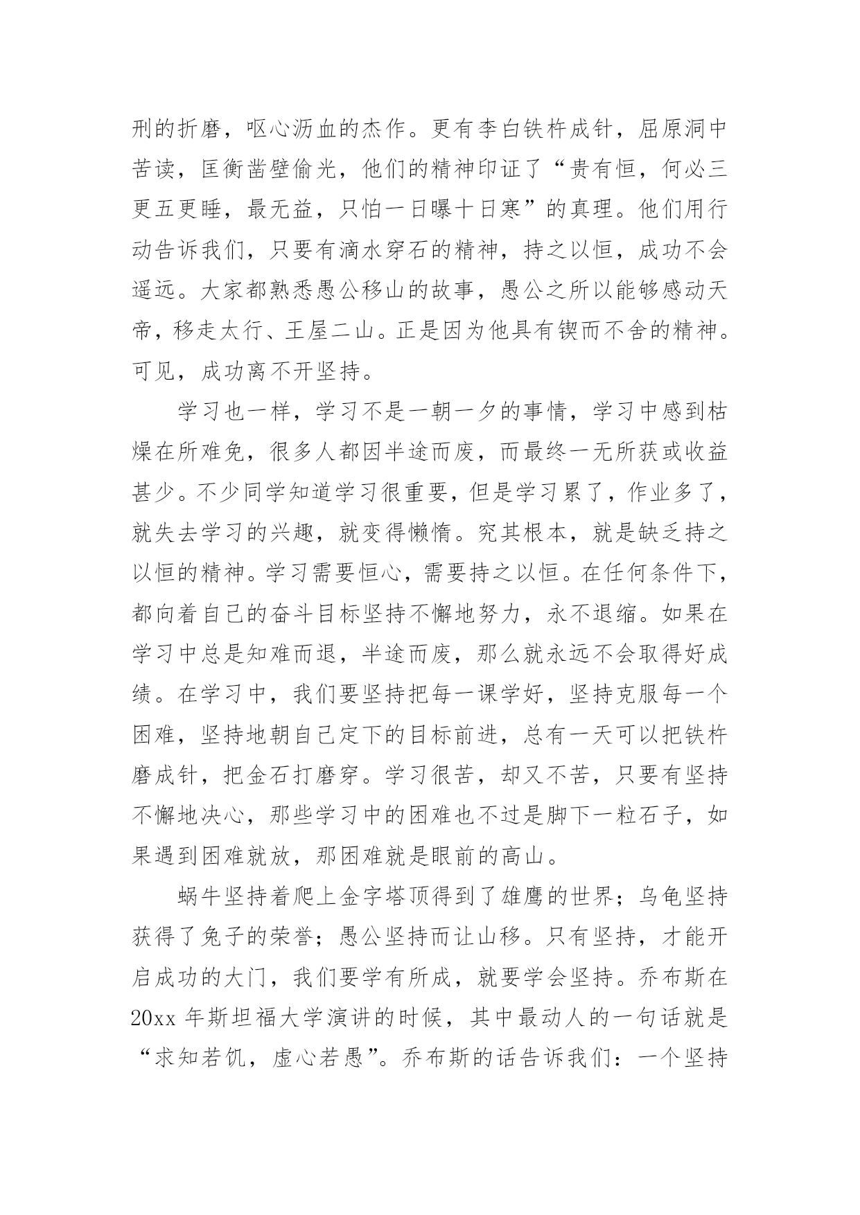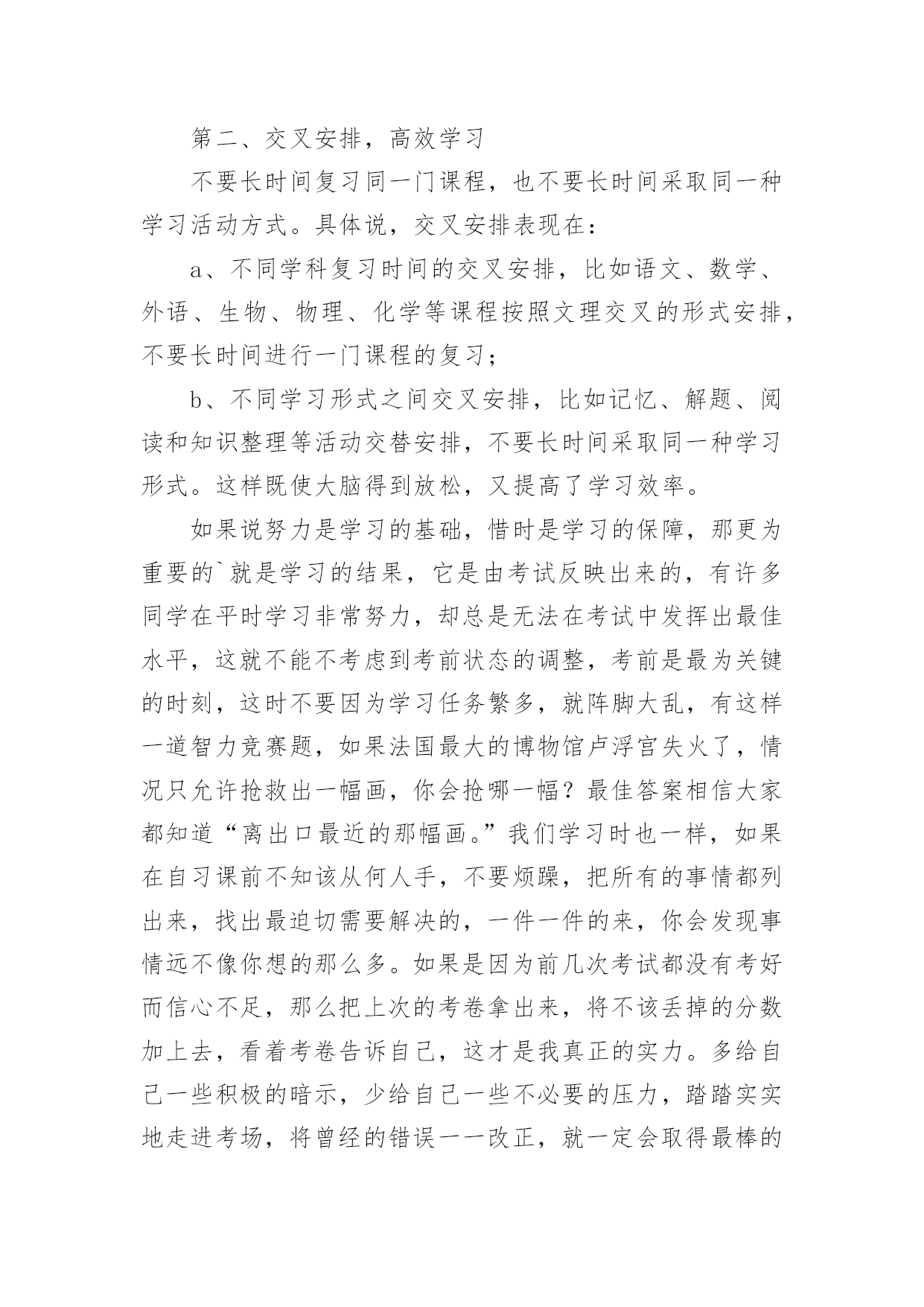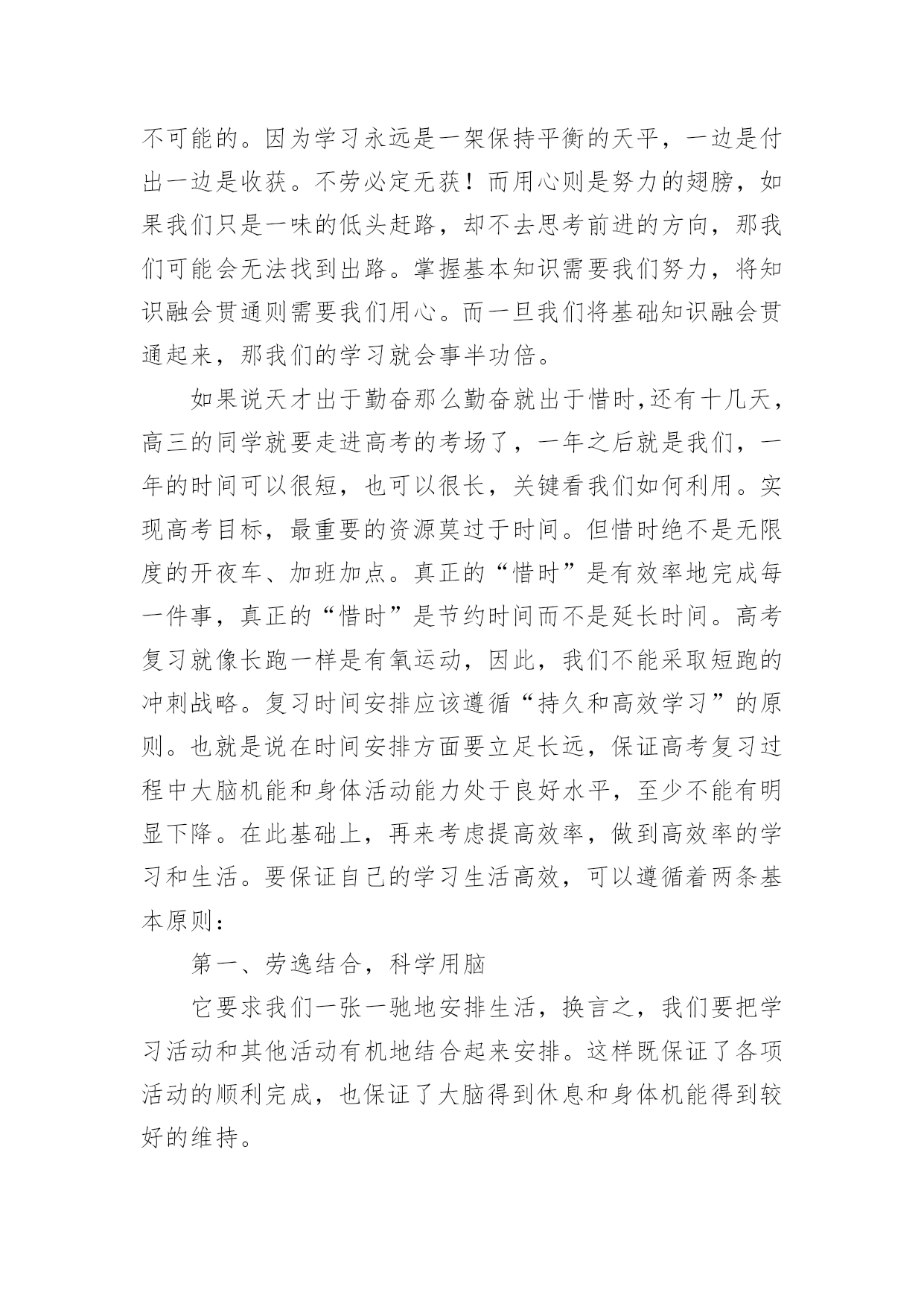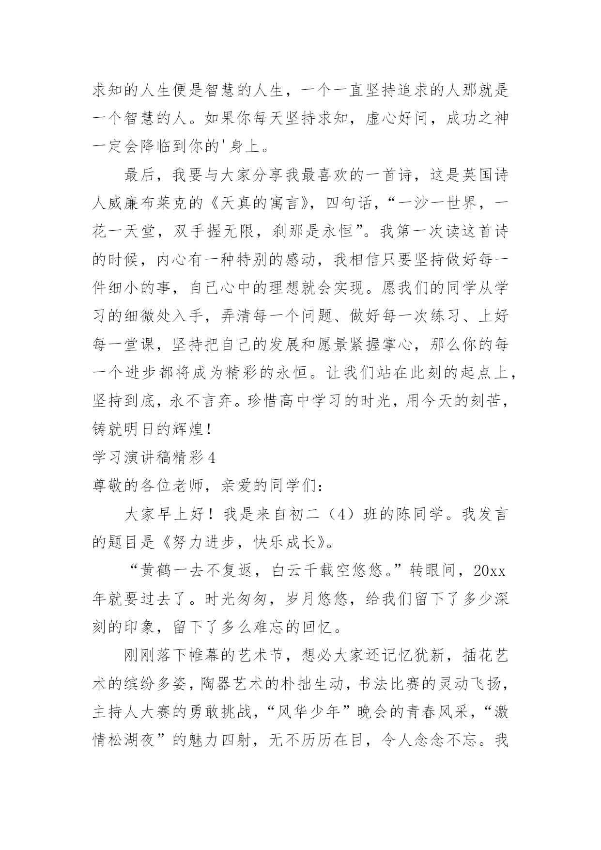 学习演讲稿精彩学习演讲稿精彩演讲稿具有观点鲜明,内容具有鼓动性的特点。在社会发展不断提速的今天,用到演讲稿的地方越来越多,那要怎么写好演讲稿呢?下面是小编整理的学习演讲稿精彩,希望对大家有所帮助。学习演讲稿精彩1老师们,同学们:早上好!今天,我国旗下讲话的题目是:《人生之路贵在坚持》。首先我想与大家分享一个有趣的故事:这个故事发生在古希腊。开学第一天,大哲学家苏格拉底对学生说:“今天咱们只学一件最简单也是最容易做的事。每人把胳膊尽量往前甩。”说着,苏格拉底示范了一遍,“从今天开始,每天做300下,大家能做到吗?”学生们都笑了,这么简单的事,有什么做不到的!过了一个月,苏格拉底问学生们:“每天甩300下,哪些同学坚持了?”有90%的同学骄傲地举起了手。又过了一个月,苏格拉底又问,这回,坚持下来的学生只剩下八成。一年后,苏格拉底再一次问大家:“请告诉我,最简单的甩手运动,还有哪几位同学坚持了?”这时,整个教室里,只有一人举起了手。这个学生就是后来成为古希腊另一位大哲学家的柏拉图。这个小故事所蕴含的深刻含意是显而易见的。柏拉图的坚持使他获得了成功。法国伟大的启蒙思想家布封曾经说过:“天才就是长期的`坚持不懈。”我国的数学家华罗庚也曾说:“做学问,做研究工作,必须持之以恒。”坚持是一种意志的体现,是一种品质;坚持是一种积极向上生活的态度,是获得成功的一种方式;坚持是一种自豪,没有勇气的人不敢坚持。面对一道道学习上的难题,面对一个个需要我们克服的难关,我们要像骑士一样去战斗,永远都不要低下高傲的头颅。世上没有比脚下更长的路,比人更高的峰。只要坚持,再长的路也能走到尽头;再高的山,也能攀到顶峰;再硬的石头也敌不过水滴百年;……那么,同学们从今天起就拿出必要的行动吧,坚持不懈,哪怕只是迈出小小的一步。坚持就是胜利,成功在于坚持!谢谢大家,我的讲话完毕!学习演讲稿精彩2尊敬的各位领导、老师、亲爱的同学们:大家好!很高兴有这个机会和大家一起分享我的学习心得,希望能对大家有所帮助。从上学到现在,学习方法我们听了很多,自己也总结了很多。就我自己而言,我认为无论什么样的方法都可以归结到一条:“努力而用心的学习。”爱迪生曾经说过一句话,“天才是百分之一的灵感,加上百分之九十九的汗水。”这句话说出了努力对学习的重要性,如果你认为靠先天和后天的才能,可以无需任何努力而得到好成绩,那是不可能的。因为学习永远是一架保持平衡的天平,一边是付出一边是收获。不劳必定无获!而用心则是努力的翅膀,如果我们只是一味的低头赶路,却不去思考前进的方向,那我们可能会无法找到出路。掌握基本知识需要我们努力,将知识融会贯通则需要我们用心。而一旦我们将基础知识融会贯通起来,那我们的学习就会事半功倍。如果说天才出于勤奋那么勤奋就出于惜时,还有十几天,高三的同学就要走进高考的考场了,一年之后就是我们,一年的时间可以很短,也可以很长,关键看我们如何利用。实现高考目标,最重要的资源莫过于时间。但惜时绝不是无限度的开夜车、加班加点。真正的“惜时”是有效率地完成每一件事,真正的“惜时”是节约时间而不是延长时间。高考复习就像长跑一样是有氧运动,因此,我们不能采取短跑的冲刺战略。复习时间安排应该遵循“持久和高效学习”的原则。也就是说在时间安排方面要立足长远,保证高考复习过程中大脑机能和身体活动能力处于良好水平,至少不能有明显下降。在此基础上,再来考虑提高效率,做到高效率的学习和生活。要保证自己的学习生活高效,可以遵循着两条基本原则:第一、劳逸结合,科学用脑它要求我们一张一驰地安排生活,换言之,我们要把学习活动和其他活动有机地结合起来安排。这样既保证了各项活动的顺利完成,也保证了大脑得到休息和身体机能得到较好的维持。第二、交叉安排,高效学习不要长时间复习同一门课程,也不要长时间采取同一种学习活动方式。具体说,交叉安排表现在:a、不同学科复习时间的交叉安排,比如语文、数学、外语、生物、物理、化学等课程按照文理交叉的形式安排,不要长时间进行一门课程的复习;b、不同学习形式之间交叉安排,比如记忆、解题、阅读和知识整理等活动交替安排,不要长时间采取同一种学习形式。这样既使大脑得到放松,又提高了学习效率。如果说努力是学习的基础,惜时是学习的保障,那更为重要的`就是学习的结果,它是由考试反映出来的,有许多同学在平时学习非常努力,却总是无法在考试中发挥出最佳水平,这就不能不考虑到考前状态的调整,考前是最为关键的时刻,这时不要因为学习任务繁多,就阵脚大乱,有这样一道智力竞赛题,如果法国最大的博物馆卢浮宫失火了,情况只允许抢救出一幅画,你会抢哪一幅?最佳答案相信大家都知道“离出口最近的那幅画。”我们学习时也一样,如果在自习课前不知该从何人手,不要烦躁,把所有的事情都列出来,找出最迫切需要解决的,一件一件的来,你会发