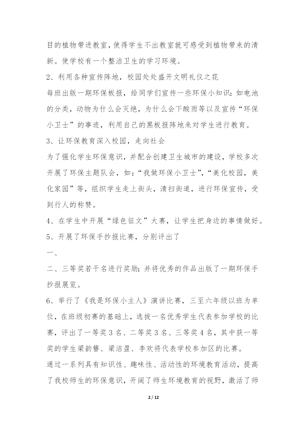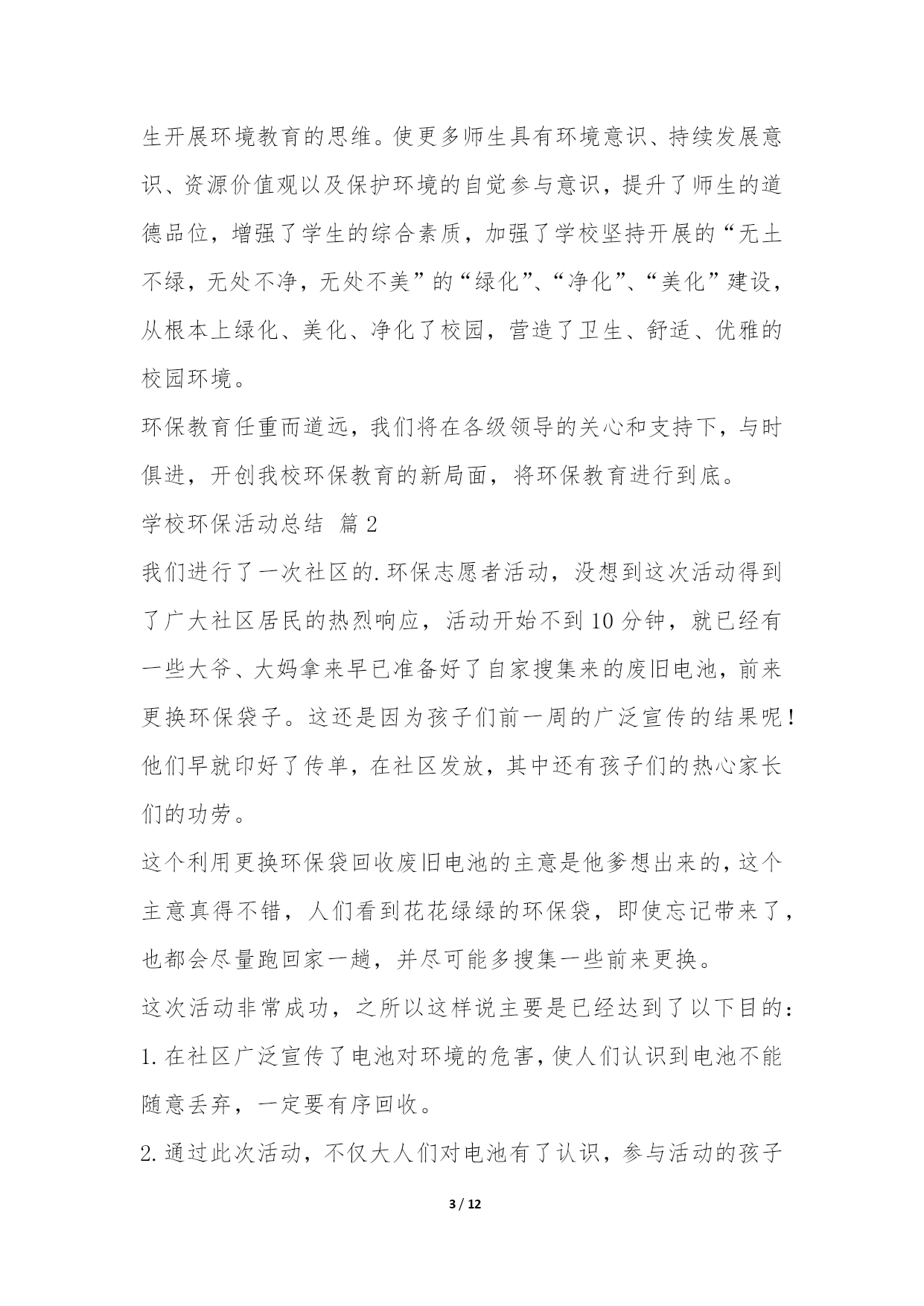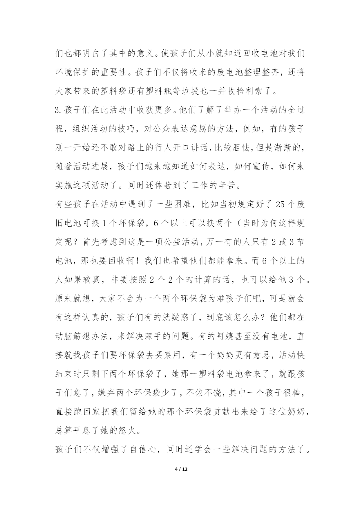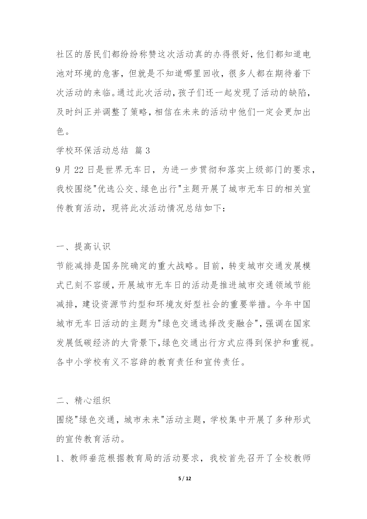 PAGE12/NUMPAGES12学校环保活动总结5篇学校环保活动总结5篇总结是事后对某一时期、某一项目或某些工作进行回顾和分析,从而做出带有规律性的结论,通过它可以正确认识以往学习和工作中的优缺点,不妨让我们认真地完成总结吧。我们该怎么写总结呢?以下是我为大家编写的学校环保活动总结8篇,供大家参考借鉴,希望可以帮助到有需要的朋友。学校环保活动总结篇1为了进一步提高我校学生的环境保护意识,使他们从少养成爱环保、讲环保的思想道德品质,丰富校园德育内容,争创市的绿色学校。在南区环保所和教科文卫办的工作指引下,我校开展了环保系列活动,目的是让同学们了解更多的环保知识,抒发对自然的崇敬,对美丽家乡的热爱,以及对环境现状的忧虑和保护环境、改善环境的急切心情。提高同学们的环保意识,培养他们的环保道德,让他们能自觉维护校园及赖以生存的大自然,用心积极营造保护环境从我做起、从现在做起、从身边小事做起的生活氛围和学习氛围。主要开展了以下活动:1、重视校园环境卫生,绿化、美化、净化一起抓师生坚持每天三清扫,人人都有自己的劳动小岗位,各位卫生区都有自己的保洁员,做到了责任划分明确、制度严格,有检查、有评比、有总结、有表扬。教室内设有植物、生物角,把芬芳赏目的植物带进教室,使得学生不出教室就可感受到植物带来的清新。使学校有一个整洁卫生的学习环境。2、利用各种宣传阵地,校园处处盛开文明礼仪之花每班出版一期环保板报,给同学们宣传一些环保小知识:如电池的分类,动物为什么会灭绝,为什么会下酸雨等以及宣传“环保小卫士”的事迹,利用自己的黑板报阵地来对学生进行教育。3、让环保教育深入校园,走向社会为了强化学生环保意识,并配合创建卫生城市的建设,学校多次开展了环保主题队会,如:“我做环保小卫士”,“美化校园,美化家园”等,组织学生走上街头,清扫街道,进行环保宣传,受到行人的称赞。4、在学生中开展“绿色征文”大赛,让学生把身边的事情做好。5、开展了环保手抄报比赛,分别评出了一、二、三等奖若干名进行奖励;并将优秀的作品出版了一期环保手抄报展览。6、举行了《我是环保小主人》演讲比赛,三至六年级以班为单位,在班级初赛的基础上,选拔一名优秀学生代表参加学校的比赛,评出了一等奖3名、二等奖3名、三等奖4名,其中获一等奖的学生梁韵簪、梁洁盈、李欢将代表学校参加区的比赛。通过一系列具有知识性、趣味性、活动性的环境教育活动,提高了我校师生的环保意识,开阔了师生环境教育的视野,激活了师生开展环境教育的思维。使更多师生具有环境意识、持续发展意识、资源价值观以及保护环境的自觉参与意识,提升了师生的道德品位,增强了学生的综合素质,加强了学校坚持开展的“无土不绿,无处不净,无处不美”的“绿化”、“净化”、“美化”建设,从根本上绿化、美化、净化了校园,营造了卫生、舒适、优雅的校园环境。环保教育任重而道远,我们将在各级领导的关心和支持下,与时俱进,开创我校环保教育的新局面,将环保教育进行到底。学校环保活动总结篇2我们进行了一次社区的.环保志愿者活动,没想到这次活动得到了广大社区居民的热烈响应,活动开始不到10分钟,就已经有一些大爷、大妈拿来早已准备好了自家搜集来的废旧电池,前来更换环保袋子。这还是因为孩子们前一周的广泛宣传的结果呢!他们早就印好了传单,在社区发放,其中还有孩子们的热心家长们的功劳。这个利用更换环保袋回收废旧电池的主意是他爹想出来的,这个主意真得不错,人们看到花花绿绿的环保袋,即使忘记带来了,也都会尽量跑回家一趟,并尽可能多搜集一些前来更换。这次活动非常成功,之所以这样说主要是已经达到了以下目的:1.在社区广泛宣传了电池对环境的危害,使人们认识到电池不能随意丢弃,一定要有序回收。2.通过此次活动,不仅大人们对电池有了认识,参与活动的孩子们也都明白了其中的意义。使孩子们从小就知道回收电池对我们环境保护的重要性。孩子们不仅将收来的废电池整理整齐,还将大家带来的塑料袋还有塑料瓶等垃圾也一并收拾利索了。3.孩子们在此活动中收获更多。他们了解了举办一个活动的全过程,组织活动的技巧,对公众表达意愿的方法,例如,有的孩子刚一开始还不敢对路上的行人开口讲话,比较胆怯,但是渐渐的,随着活动进展,孩子们越来越知道如何表达,如何宣传,如何来实施这项活动了。同时还体验到了工作的辛苦。有些孩子在活动中遇到了一些困难,比如当初规定好了25个废旧电池可换1个环保袋,6个以上可以换两个(当时为何这样规定呢?首先考虑到这是一项公益活动,万一有的人只有2或3节电池,那也要回收啊!我们也希望他们都能拿来。而6个以上的人如果较真,非要按照2个2个的计算的话,也可以给他3个。原来就想,大家不会为一个两个环保袋为难孩子们吧,可是就会有这样认真的,孩子们有的就疑惑了,到底该怎么办?他们都在动脑筋想办法,来解