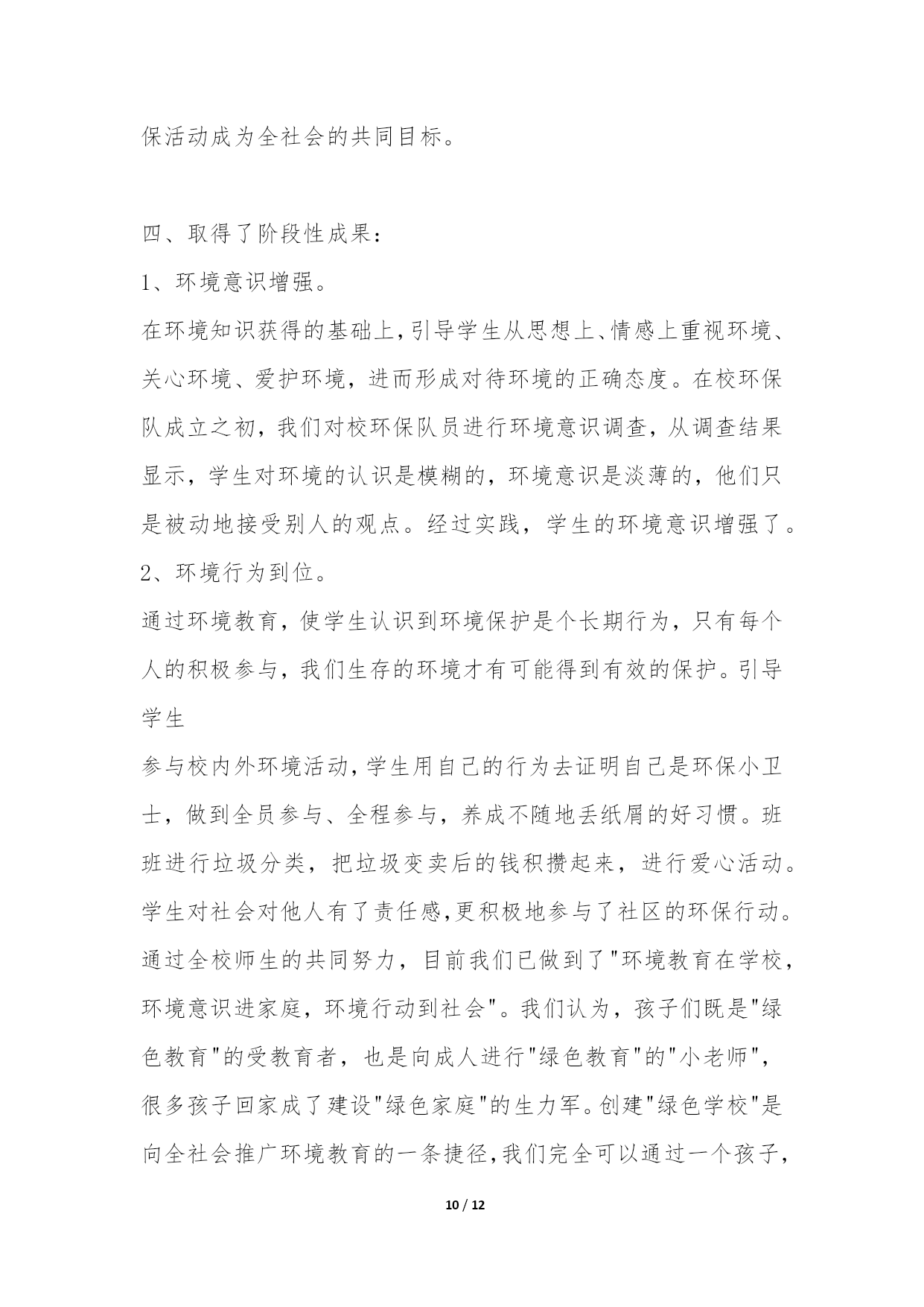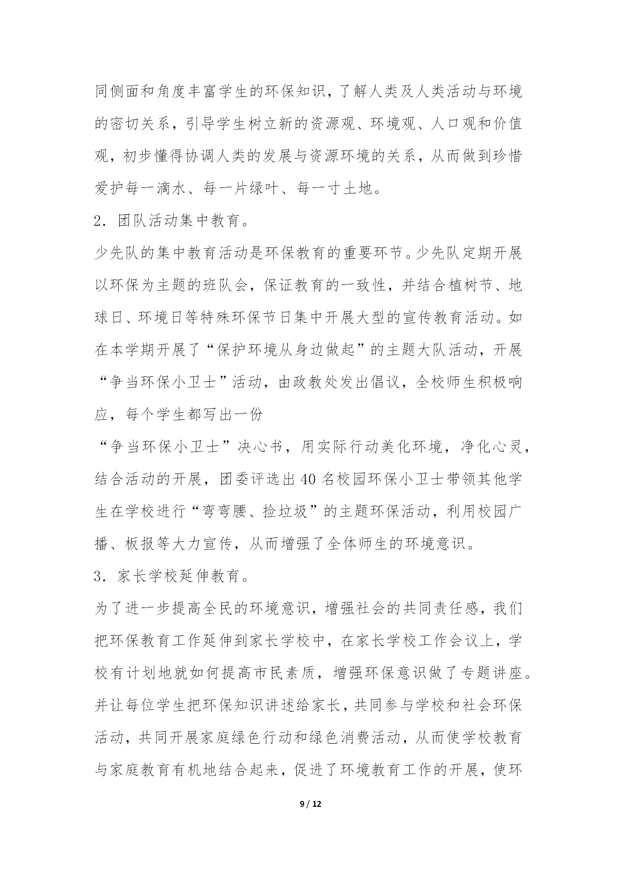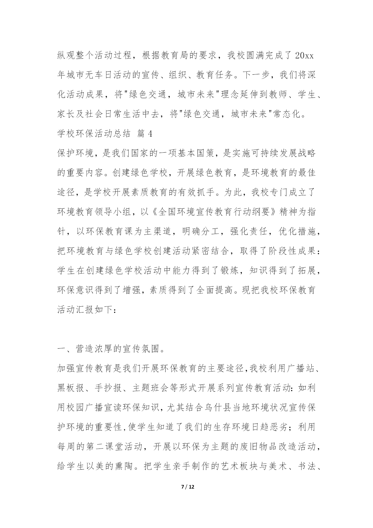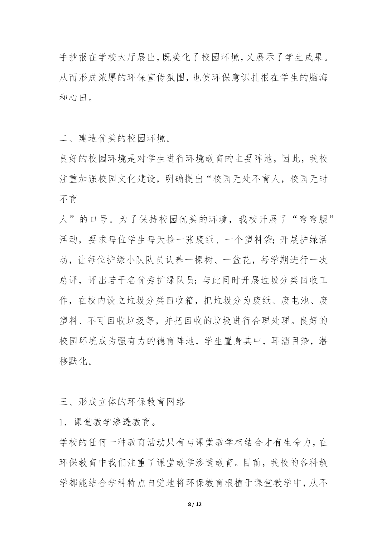 PAGE12/NUMPAGES12学校环保活动总结5篇学校环保活动总结5篇总结是事后对某一时期、某一项目或某些工作进行回顾和分析,从而做出带有规律性的结论,通过它可以正确认识以往学习和工作中的优缺点,不妨让我们认真地完成总结吧。我们该怎么写总结呢?以下是我为大家编写的学校环保活动总结8篇,供大家参考借鉴,希望可以帮助到有需要的朋友。学校环保活动总结篇1为了进一步提高我校学生的环境保护意识,使他们从少养成爱环保、讲环保的思想道德品质,丰富校园德育内容,争创市的绿色学校。在南区环保所和教科文卫办的工作指引下,我校开展了环保系列活动,目的是让同学们了解更多的环保知识,抒发对自然的崇敬,对美丽家乡的热爱,以及对环境现状的忧虑和保护环境、改善环境的急切心情。提高同学们的环保意识,培养他们的环保道德,让他们能自觉维护校园及赖以生存的大自然,用心积极营造保护环境从我做起、从现在做起、从身边小事做起的生活氛围和学习氛围。主要开展了以下活动:1、重视校园环境卫生,绿化、美化、净化一起抓师生坚持每天三清扫,人人都有自己的劳动小岗位,各位卫生区都有自己的保洁员,做到了责任划分明确、制度严格,有检查、有评比、有总结、有表扬。教室内设有植物、生物角,把芬芳赏目的植物带进教室,使得学生不出教室就可感受到植物带来的清新。使学校有一个整洁卫生的学习环境。2、利用各种宣传阵地,校园处处盛开文明礼仪之花每班出版一期环保板报,给同学们宣传一些环保小知识:如电池的分类,动物为什么会灭绝,为什么会下酸雨等以及宣传“环保小卫士”的事迹,利用自己的黑板报阵地来对学生进行教育。3、让环保教育深入校园,走向社会为了强化学生环保意识,并配合创建卫生城市的建设,学校多次开展了环保主题队会,如:“我做环保小卫士”,“美化校园,美化家园”等,组织学生走上街头,清扫街道,进行环保宣传,受到行人的称赞。4、在学生中开展“绿色征文”大赛,让学生把身边的事情做好。5、开展了环保手抄报比赛,分别评出了一、二、三等奖若干名进行奖励;并将优秀的作品出版了一期环保手抄报展览。6、举行了《我是环保小主人》演讲比赛,三至六年级以班为单位,在班级初赛的基础上,选拔一名优秀学生代表参加学校的比赛,评出了一等奖3名、二等奖3名、三等奖4名,其中获一等奖的学生梁韵簪、梁洁盈、李欢将代表学校参加区的比赛。通过一系列具有知识性、趣味性、活动性的环境教育活动,提高了我校师生的环保意识,开阔了师生环境教育的视野,激活了师生开展环境教育的思维。使更多师生具有环境意识、持续发展意识、资源价值观以及保护环境的自觉参与意识,提升了师生的道德品位,增强了学生的综合素质,加强了学校坚持开展的“无土不绿,无处不净,无处不美”的“绿化”、“净化”、“美化”建设,从根本上绿化、美化、净化了校园,营造了卫生、舒适、优雅的校园环境。环保教育任重而道远,我们将在各级领导的关心和支持下,与时俱进,开创我校环保教育的新局面,将环保教育进行到底。学校环保活动总结篇2我们进行了一次社区的.环保志愿者活动,没想到这次活动得到了广大社区居民的热烈响应,活动开始不到10分钟,就已经有一些大爷、大妈拿来早已准备好了自家搜集来的废旧电池,前来更换环保袋子。这还是因为孩子们前一周的广泛宣传的结果呢!他们早就印好了传单,在社区发放,其中还有孩子们的热心家长们的功劳。这个利用更换环保袋回收废旧电池的主意是他爹想出来的,这个主意真得不错,人们看到花花绿绿的环保袋,即使忘记带来了,也都会尽量跑回家一趟,并尽可能多搜集一些前来更换。这次活动非常成功,之所以这样说主要是已经达到了以下目的:1.在社区广泛宣传了电池对环境的危害,使人们认识到电池不能随意丢弃,一定要有序回收。2.通过此次活动,不仅大人们对电池有了认识,参与活动的孩子们也都明白了其中的意义。使孩子们从小就知道回收电池对我们环境保护的重要性。孩子们不仅将收来的废电池整理整齐,还将大家带来的塑料袋还有塑料瓶等垃圾也一并收拾利索了。3.孩子们在此活动中收获更多。他们了解了举办一个活动的全过程,组织活动的技巧,对公众表达意愿的方法,例如,有的孩子刚一开始还不敢对路上的行人开口讲话,比较胆怯,但是渐渐的,随着活动进展,孩子们越来越知道如何表达,如何宣传,如何来实施这项活动了。同时还体验到了工作的辛苦。有些孩子在活动中遇到了一些困难,比如当初规定好了25个废旧电池可换1个环保袋,6个以上可以换两个(当时为何这样规定呢?首先考虑到这是一项公益活动,万一有的人只有2或3节电池,那也要回收啊!我们也希望他们都能拿来。而6个以上的人如果较真,非要按照2个2个的计算的话,也可以给他3个。原来就想,大家不会为一个两个环保袋为难孩子们吧,可是就会有这样认真的,孩子们有的就疑惑了,到底该怎么办?他们都在动脑筋想办法,来解