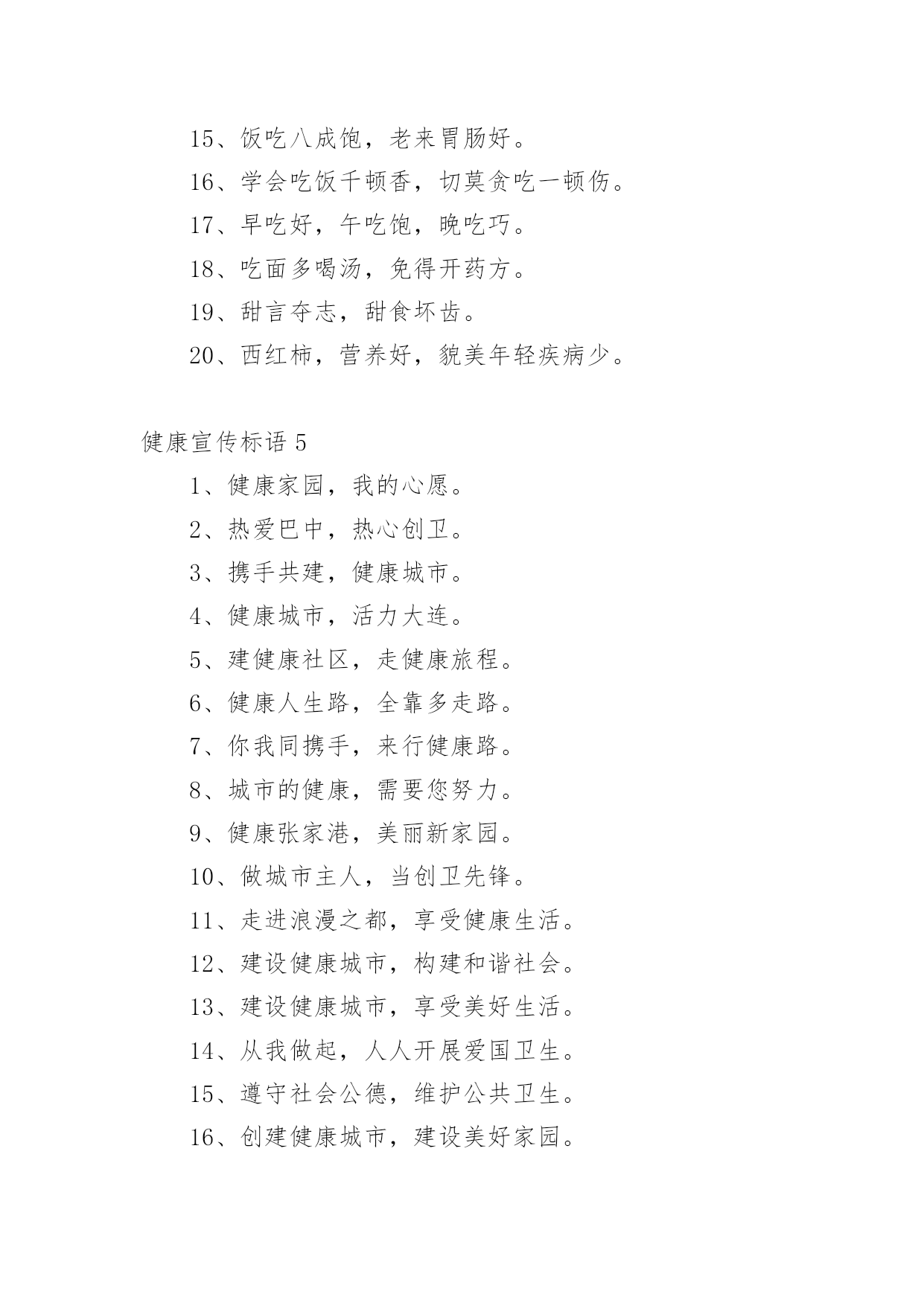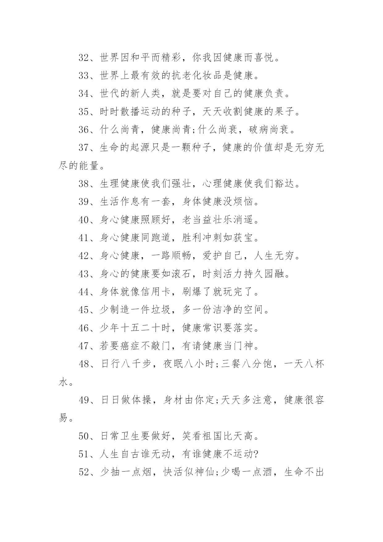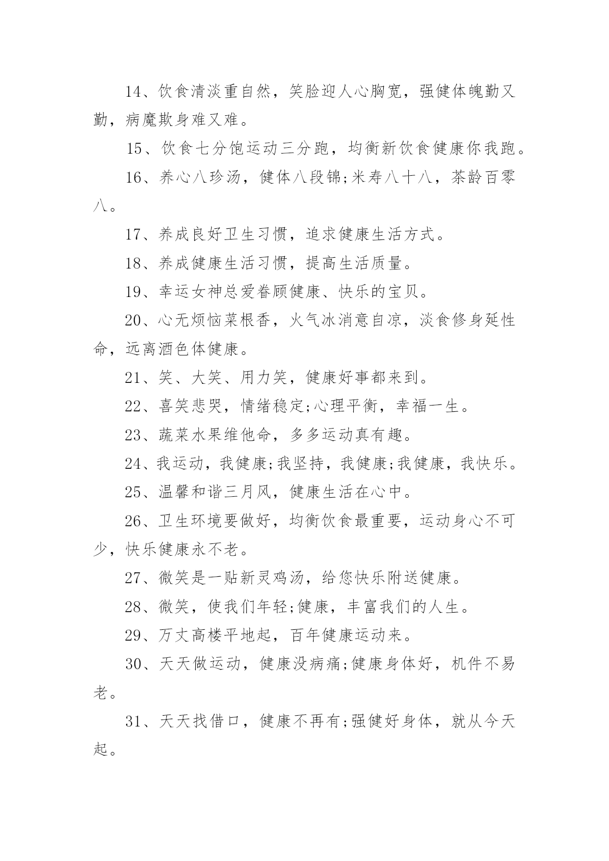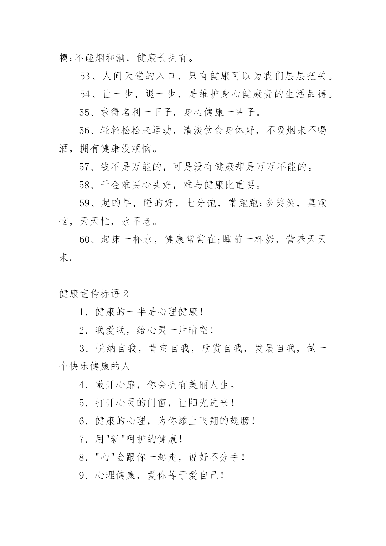 健康宣传标语在平凡的学习、工作、生活中,大家都听说过或者使用过一些比较经典的标语吧,标语具有文字简练、意义鲜明的特点。还苦于找不到好的标语?以下是小编为大家整理的健康宣传标语,仅供参考,大家一起来看看吧。健康宣传标语11、注意你的健康,就像专注你的股票一样。2、只有健康,生活才有质量;只有健康,生命才有意义。3、扎实开展健康创建活动,努力建设高水平小康社会。4、怎样对待你身体,它就怎样回答你。5、早睡早起身体好,补充营养不可少;常常运动最重要,健健康康活到老。6、早起动一动,三餐多蔬果;常保欢喜心,快乐活到老。7、再多的理想支票,都要健康作背书。8、运动是身心的知己,营养是生命的知音。9、远离二手烟,开心每一天。吃饭少一点,健康每一年。10、预防保健生活化,享受健康一路发。11、愉快心情常环绕,健康身心跑不掉。12、用心过生活,欢乐不折价,用新迎清净,健康有保障。13、要素食不要快餐,要健康不要贱康。14、饮食清淡重自然,笑脸迎人心胸宽,强健体魄勤又勤,病魔欺身难又难。15、饮食七分饱运动三分跑,均衡新饮食健康你我跑。16、养心八珍汤,健体八段锦;米寿八十八,茶龄百零八。17、养成良好卫生习惯,追求健康生活方式。18、养成健康生活习惯,提高生活质量。19、幸运女神总爱眷顾健康、快乐的宝贝。20、心无烦恼菜根香,火气冰消意自凉,淡食修身延性命,远离酒色体健康。21、笑、大笑、用力笑,健康好事都来到。22、喜笑悲哭,情绪稳定;心理平衡,幸福一生。23、蔬菜水果维他命,多多运动真有趣。24、我运动,我健康;我坚持,我健康;我健康,我快乐。25、温馨和谐三月风,健康生活在心中。26、卫生环境要做好,均衡饮食最重要,运动身心不可少,快乐健康永不老。27、微笑是一贴新灵鸡汤,给您快乐附送健康。28、微笑,使我们年轻;健康,丰富我们的人生。29、万丈高楼平地起,百年健康运动来。30、天天做运动,健康没病痛;健康身体好,机件不易老。31、天天找借口,健康不再有;强健好身体,就从今天起。32、世界因和平而精彩,你我因健康而喜悦。33、世界上最有效的抗老化妆品是健康。34、世代的新人类,就是要对自己的健康负责。35、时时散播运动的种子,天天收割健康的果子。36、什么尚青,健康尚青;什么尚衰,破病尚衰。37、生命的起源只是一颗种子,健康的价值却是无穷无尽的能量。38、生理健康使我们强壮,心理健康使我们豁达。39、生活作息有一套,身体健康没烦恼。40、身心健康照顾好,老当益壮乐消遥。41、身心健康同跑道,胜利冲刺如获宝。42、身心健康,一路顺畅,爱护自己,人生无穷。43、身心的健康要如滚石,时刻活力持久园融。44、身体就像信用卡,刷爆了就玩完了。45、少制造一件垃圾,多一份洁净的空间。46、少年十五二十时,健康常识要落实。47、若要癌症不敲门,有请健康当门神。48、日行八千步,夜眠八小时;三餐八分饱,一天八杯水。49、日日做体操,身材由你定;天天多注意,健康很容易。50、日常卫生要做好,笑看祖国比天高。51、人生自古谁无动,有谁健康不运动?52、少抽一点烟,快活似神仙;少喝一点酒,生命不出糗;不碰烟和酒,健康长拥有。53、人间天堂的入口,只有健康可以为我们层层把关。54、让一步,退一步,是维护身心健康贵的生活品德。55、求得名利一下子,身心健康一辈子。56、轻轻松松来运动,清淡饮食身体好,不吸烟来不喝酒,拥有健康没烦恼。57、钱不是万能的,可是没有健康却是万万不能的。58、千金难买心头好,难与健康比重要。59、起的早,睡的好,七分饱,常跑跑;多笑笑,莫烦恼,天天忙,永不老。60、起床一杯水,健康常常在;睡前一杯奶,营养天天来。健康宣传标语21.健康的一半是心理健康!2.我爱我,给心灵一片晴空!3.悦纳自我,肯定自我,欣赏自我,发展自我,做一个快乐健康的人4.敞开心扉,你会拥有美丽人生。5.打开心灵的门窗,让阳光进来!6.健康的心理,为你添上飞翔的翅膀!7.用"新"呵护的健康!8."心"会跟你一起走,说好不分手!9.心理健康,爱你等于爱自己!10.关注自我,让我们从"心"做起!11.心理健康关注你我他!12.架起心桥,共赴成功!13.健康的人需要健康的心!14.心心相融,欣欣向荣!15.我接纳自己包括优点、缺点、梦想、秘密与过去。16.超越平凡,欣喜生活!17.困忧之源,不在问题的本质,而在面对问题的态度!18.悦纳自我,肯定自我,欣赏自我,发展自我,做一快乐健康的人!19.完善自我,提高心理健康水平;服务他人,普及心理健康知识20、透视心灵,关注成长,触抚生命,助人自助,挖掘潜能,完善自我。21.走出心灵的孤岛,打开心灵的窗口。22.与心灵相约与健康同行。23.心灵健康伴我行,花开香溢满校园。24.关注自我,让我们从“心”开始。25.为心理打扮,