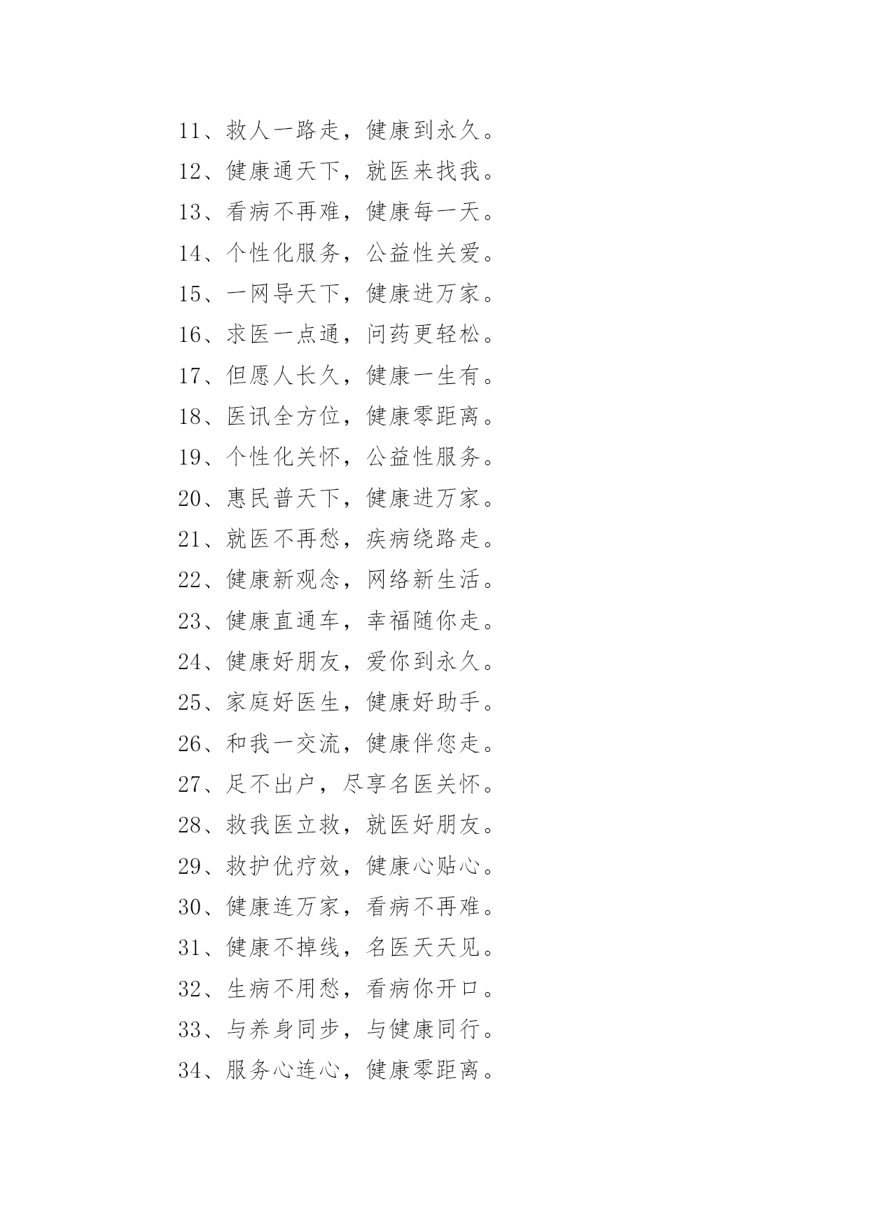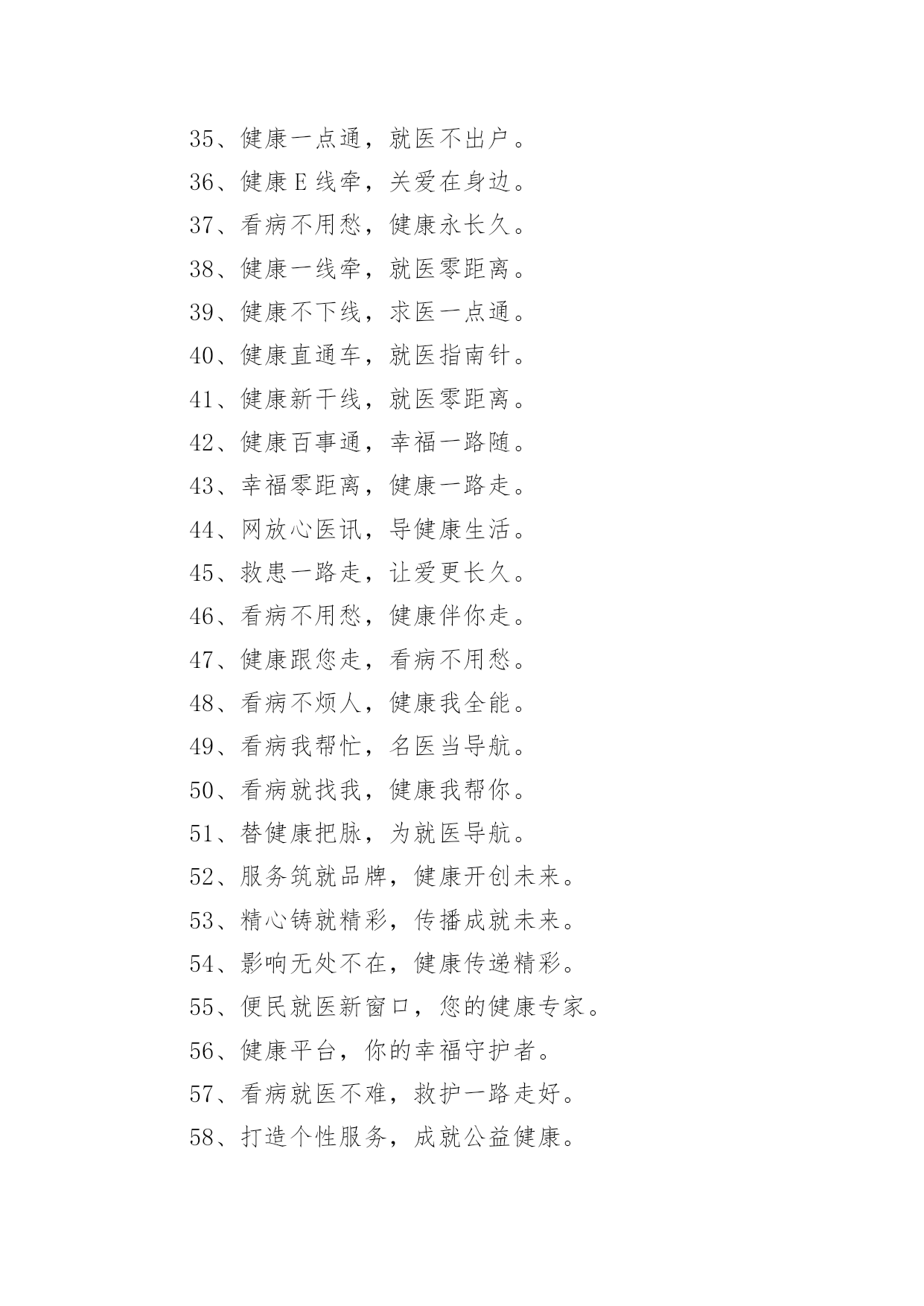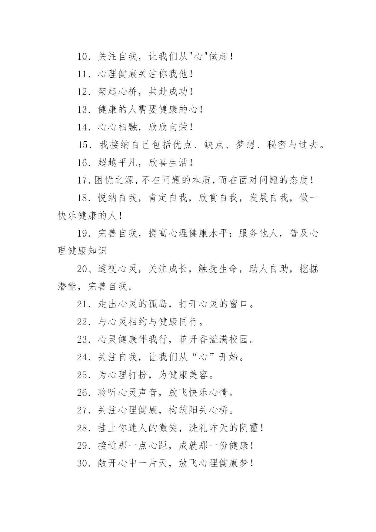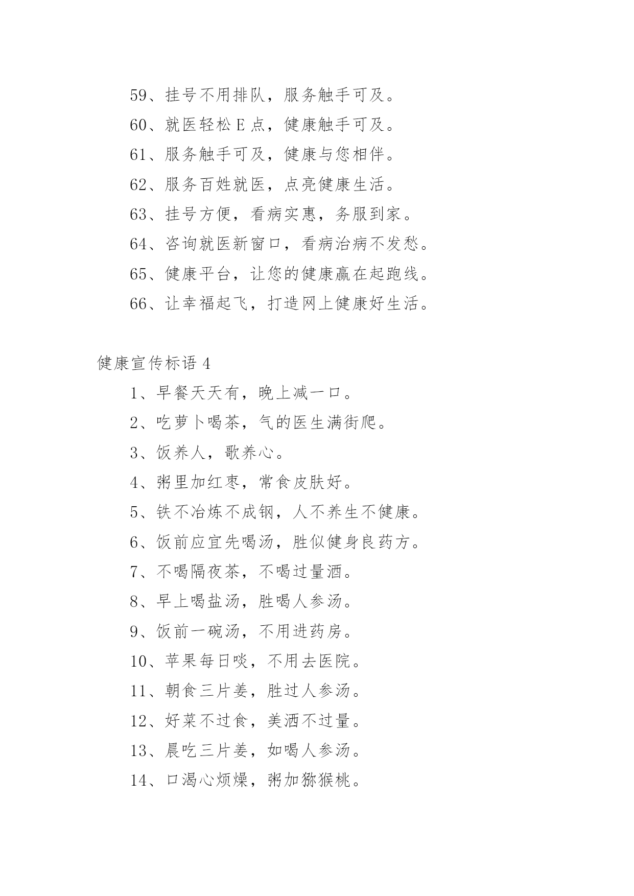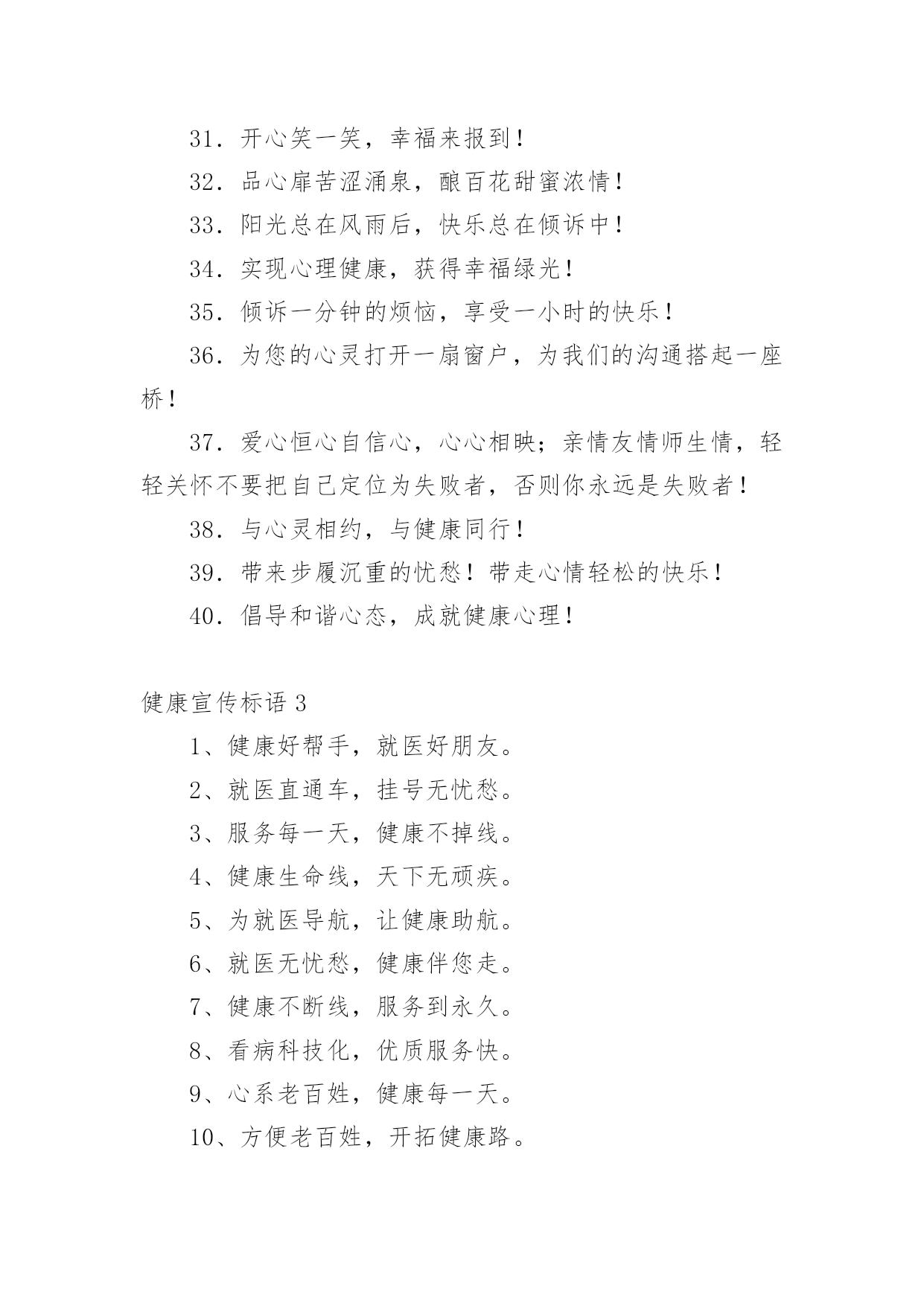 健康宣传标语在平凡的学习、工作、生活中,大家都听说过或者使用过一些比较经典的标语吧,标语具有文字简练、意义鲜明的特点。还苦于找不到好的标语?以下是小编为大家整理的健康宣传标语,仅供参考,大家一起来看看吧。健康宣传标语11、注意你的健康,就像专注你的股票一样。2、只有健康,生活才有质量;只有健康,生命才有意义。3、扎实开展健康创建活动,努力建设高水平小康社会。4、怎样对待你身体,它就怎样回答你。5、早睡早起身体好,补充营养不可少;常常运动最重要,健健康康活到老。6、早起动一动,三餐多蔬果;常保欢喜心,快乐活到老。7、再多的理想支票,都要健康作背书。8、运动是身心的知己,营养是生命的知音。9、远离二手烟,开心每一天。吃饭少一点,健康每一年。10、预防保健生活化,享受健康一路发。11、愉快心情常环绕,健康身心跑不掉。12、用心过生活,欢乐不折价,用新迎清净,健康有保障。13、要素食不要快餐,要健康不要贱康。14、饮食清淡重自然,笑脸迎人心胸宽,强健体魄勤又勤,病魔欺身难又难。15、饮食七分饱运动三分跑,均衡新饮食健康你我跑。16、养心八珍汤,健体八段锦;米寿八十八,茶龄百零八。17、养成良好卫生习惯,追求健康生活方式。18、养成健康生活习惯,提高生活质量。19、幸运女神总爱眷顾健康、快乐的宝贝。20、心无烦恼菜根香,火气冰消意自凉,淡食修身延性命,远离酒色体健康。21、笑、大笑、用力笑,健康好事都来到。22、喜笑悲哭,情绪稳定;心理平衡,幸福一生。23、蔬菜水果维他命,多多运动真有趣。24、我运动,我健康;我坚持,我健康;我健康,我快乐。25、温馨和谐三月风,健康生活在心中。26、卫生环境要做好,均衡饮食最重要,运动身心不可少,快乐健康永不老。27、微笑是一贴新灵鸡汤,给您快乐附送健康。28、微笑,使我们年轻;健康,丰富我们的人生。29、万丈高楼平地起,百年健康运动来。30、天天做运动,健康没病痛;健康身体好,机件不易老。31、天天找借口,健康不再有;强健好身体,就从今天起。32、世界因和平而精彩,你我因健康而喜悦。33、世界上最有效的抗老化妆品是健康。34、世代的新人类,就是要对自己的健康负责。35、时时散播运动的种子,天天收割健康的果子。36、什么尚青,健康尚青;什么尚衰,破病尚衰。37、生命的起源只是一颗种子,健康的价值却是无穷无尽的能量。38、生理健康使我们强壮,心理健康使我们豁达。39、生活作息有一套,身体健康没烦恼。40、身心健康照顾好,老当益壮乐消遥。41、身心健康同跑道,胜利冲刺如获宝。42、身心健康,一路顺畅,爱护自己,人生无穷。43、身心的健康要如滚石,时刻活力持久园融。44、身体就像信用卡,刷爆了就玩完了。45、少制造一件垃圾,多一份洁净的空间。46、少年十五二十时,健康常识要落实。47、若要癌症不敲门,有请健康当门神。48、日行八千步,夜眠八小时;三餐八分饱,一天八杯水。49、日日做体操,身材由你定;天天多注意,健康很容易。50、日常卫生要做好,笑看祖国比天高。51、人生自古谁无动,有谁健康不运动?52、少抽一点烟,快活似神仙;少喝一点酒,生命不出糗;不碰烟和酒,健康长拥有。53、人间天堂的入口,只有健康可以为我们层层把关。54、让一步,退一步,是维护身心健康贵的生活品德。55、求得名利一下子,身心健康一辈子。56、轻轻松松来运动,清淡饮食身体好,不吸烟来不喝酒,拥有健康没烦恼。57、钱不是万能的,可是没有健康却是万万不能的。58、千金难买心头好,难与健康比重要。59、起的早,睡的好,七分饱,常跑跑;多笑笑,莫烦恼,天天忙,永不老。60、起床一杯水,健康常常在;睡前一杯奶,营养天天来。健康宣传标语21.健康的一半是心理健康!2.我爱我,给心灵一片晴空!3.悦纳自我,肯定自我,欣赏自我,发展自我,做一个快乐健康的人4.敞开心扉,你会拥有美丽人生。5.打开心灵的门窗,让阳光进来!6.健康的心理,为你添上飞翔的翅膀!7.用"新"呵护的健康!8."心"会跟你一起走,说好不分手!9.心理健康,爱你等于爱自己!10.关注自我,让我们从"心"做起!11.心理健康关注你我他!12.架起心桥,共赴成功!13.健康的人需要健康的心!14.心心相融,欣欣向荣!15.我接纳自己包括优点、缺点、梦想、秘密与过去。16.超越平凡,欣喜生活!17.困忧之源,不在问题的本质,而在面对问题的态度!18.悦纳自我,肯定自我,欣赏自我,发展自我,做一快乐健康的人!19.完善自我,提高心理健康水平;服务他人,普及心理健康知识20、透视心灵,关注成长,触抚生命,助人自助,挖掘潜能,完善自我。21.走出心灵的孤岛,打开心灵的窗口。22.与心灵相约与健康同行。23.心灵健康伴我行,花开香溢满校园。24.关注自我,让我们从“心”开始。25.为心理打扮,