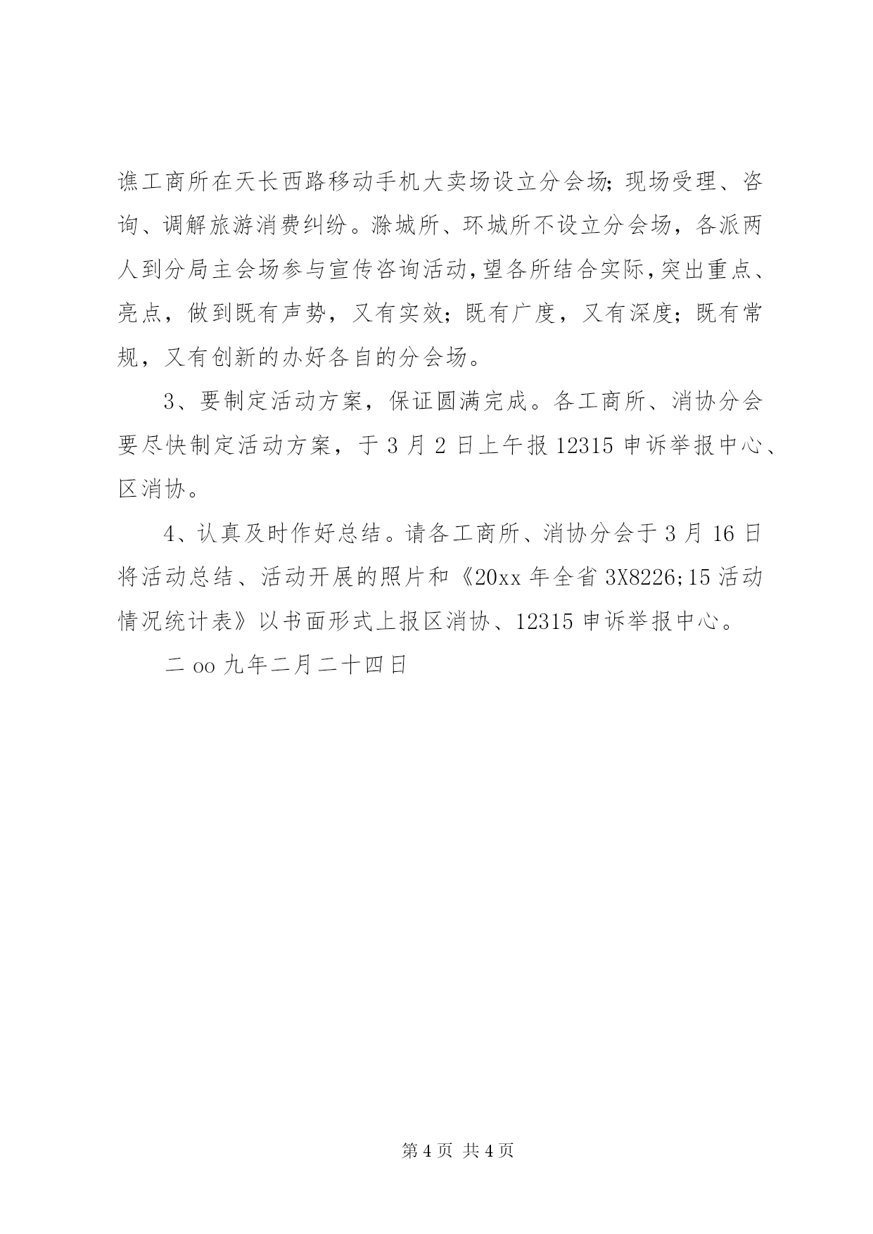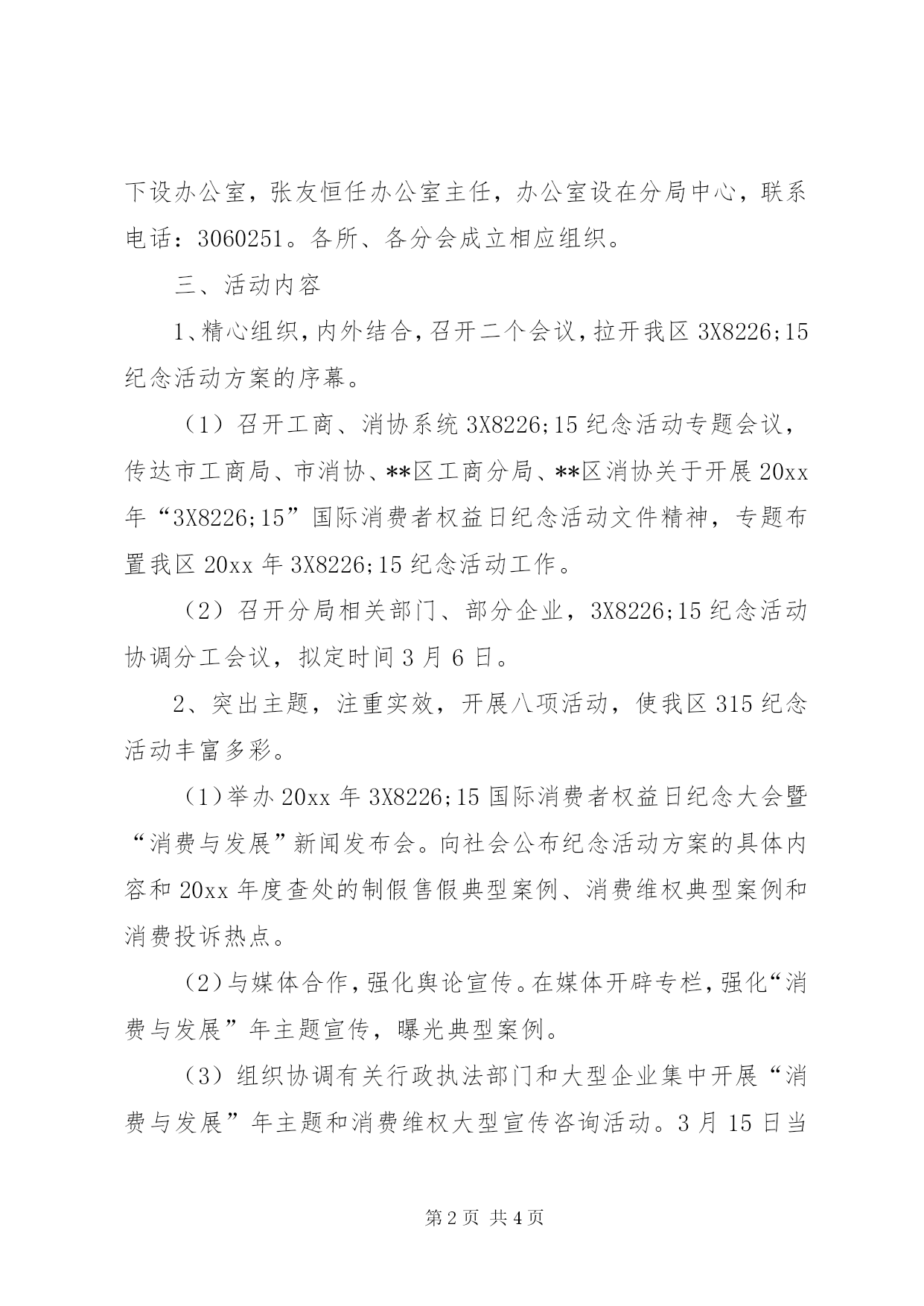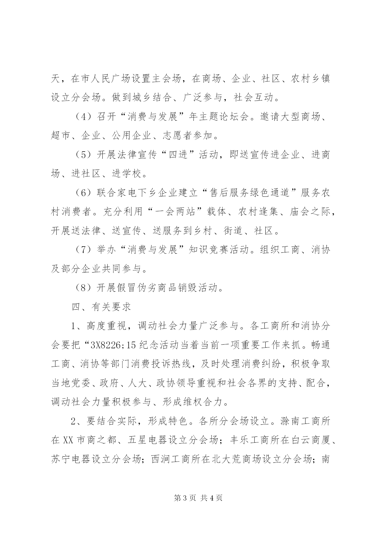 第PAGE\*Arabic\*MERGEFORMAT4页共NUMPAGES\*MERGEFORMAT4页工商局315活动方案20xx年“3X8226;15”国际消费者权益日纪念活动实施方案20xx年“3X8226;15”国际消费者权益日即将来临,为把今年的3X8226;15纪念活动组织好,落实好,使纪念活动有实效、有深度、有突破、有创新,突出“消费与发展”年主题的宣传,努力营造良好的消费环境,根据市工商局、市消协的统一部署,经**区政府、**区工商分局、区消协研究,特制定活动方案如下:一、指导思想以党的十七届三中全会和中央经济工作会议精神为指导,以全面贯彻和落实科学发展观、构建社会主义和谐社会为核心,以“消费与发展”年主题为主线,以改善环境促进消费为主题,以宣传政策、提高消费信心、提供消费咨询、拉动消费需求、推进消费维权、引导科学消费为重点,动员消费者、经营者、社会各界广泛参与,创造性地开展一系列活动,为促进经济社会平稳较快发展服务。二、组织领导为加强对3X8226;15纪念活动的领导,便于各部门工作联系,成立**区20xx年3X8226;15国际消费者权益日纪念活动领导小组。**区政府汤曾满副区长为组长,**区工商分局副局长杨光为副组长,分局分管公平交易的程先明、3.15中心张友恒、区消协朱正和、各工商所所长、各消协分会秘书长为成员,领导小组下设办公室,张友恒任办公室主任,办公室设在分局中心,联系电话:3060251。各所、各分会成立相应组织。三、活动内容1、精心组织,内外结合,召开二个会议,拉开我区3X8226;15纪念活动方案的序幕。(1)召开工商、消协系统3X8226;15纪念活动专题会议,传达市工商局、市消协、**区工商分局、**区消协关于开展20xx年“3X8226;15”国际消费者权益日纪念活动文件精神,专题布置我区20xx年3X8226;15纪念活动工作。(2)召开分局相关部门、部分企业,3X8226;15纪念活动协调分工会议,拟定时间3月6日。2、突出主题,注重实效,开展八项活动,使我区315纪念活动丰富多彩。(1)举办20xx年3X8226;15国际消费者权益日纪念大会暨“消费与发展”新闻发布会。向社会公布纪念活动方案的具体内容和20xx年度查处的制假售假典型案例、消费维权典型案例和消费投诉热点。(2)与媒体合作,强化舆论宣传。在媒体开辟专栏,强化“消费与发展”年主题宣传,曝光典型案例。(3)组织协调有关行政执法部门和大型企业集中开展“消费与发展”年主题和消费维权大型宣传咨询活动。3月15日当天,在市人民广场设置主会场,在商场、企业、社区、农村乡镇设立分会场。做到城乡结合、广泛参与,社会互动。(4)召开“消费与发展”年主题论坛会。邀请大型商场、超市、企业、公用企业、志愿者参加。(5)开展法律宣传“四进”活动,即送宣传进企业、进商场、进社区、进学校。(6)联合家电下乡企业建立“售后服务绿色通道”服务农村消费者。充分利用“一会两站”载体、农村逢集、庙会之际,开展送法律、送宣传、送服务到乡村、街道、社区。(7)举办“消费与发展”知识竞赛活动。组织工商、消协及部分企业共同参与。(8)开展假冒伪劣商品销毁活动。四、有关要求1、高度重视,调动社会力量广泛参与。各工商所和消协分会要把“3X8226;15纪念活动当着当前一项重要工作来抓。畅通工商、消协等部门消费投诉热线,及时处理消费纠纷,积极争取当地党委、政府、人大、政协领导重视和社会各界的支持、配合,调动社会力量积极参与、形成维权合力。2、要结合实际,形成特色。各所分会场设立。滁南工商所在XX市商之都、五星电器设立分会场;丰乐工商所在白云商厦、苏宁电器设立分会场;西涧工商所在北大荒商场设立分会场;南谯工商所在天长西路移动手机大卖场设立分会场;现场受理、咨询、调解旅游消费纠纷。滁城所、环城所不设立分会场,各派两人到分局主会场参与宣传咨询活动,望各所结合实际,突出重点、亮点,做到既有声势,又有实效;既有广度,又有深度;既有常规,又有创新的办好各自的分会场。3、要制定活动方案,保证圆满完成。各工商所、消协分会要尽快制定活动方案,于3月2日上午报12315申诉举报中心、区消协。4、认真及时作好总结。请各工商所、消协分会于3月16日将活动总结、活动开展的照片和《20xx年全省3X8226;15活动情况统计表》以书面形式上报区消协、12315申诉举报中心。二oo九年二月二十四日