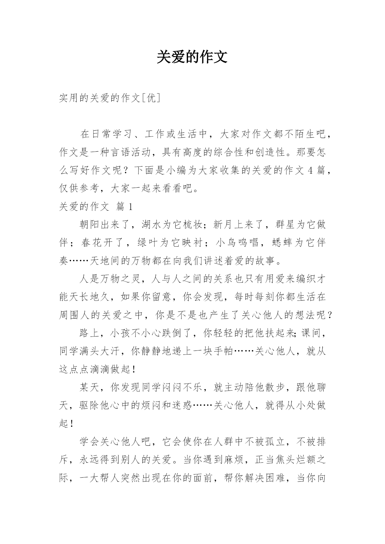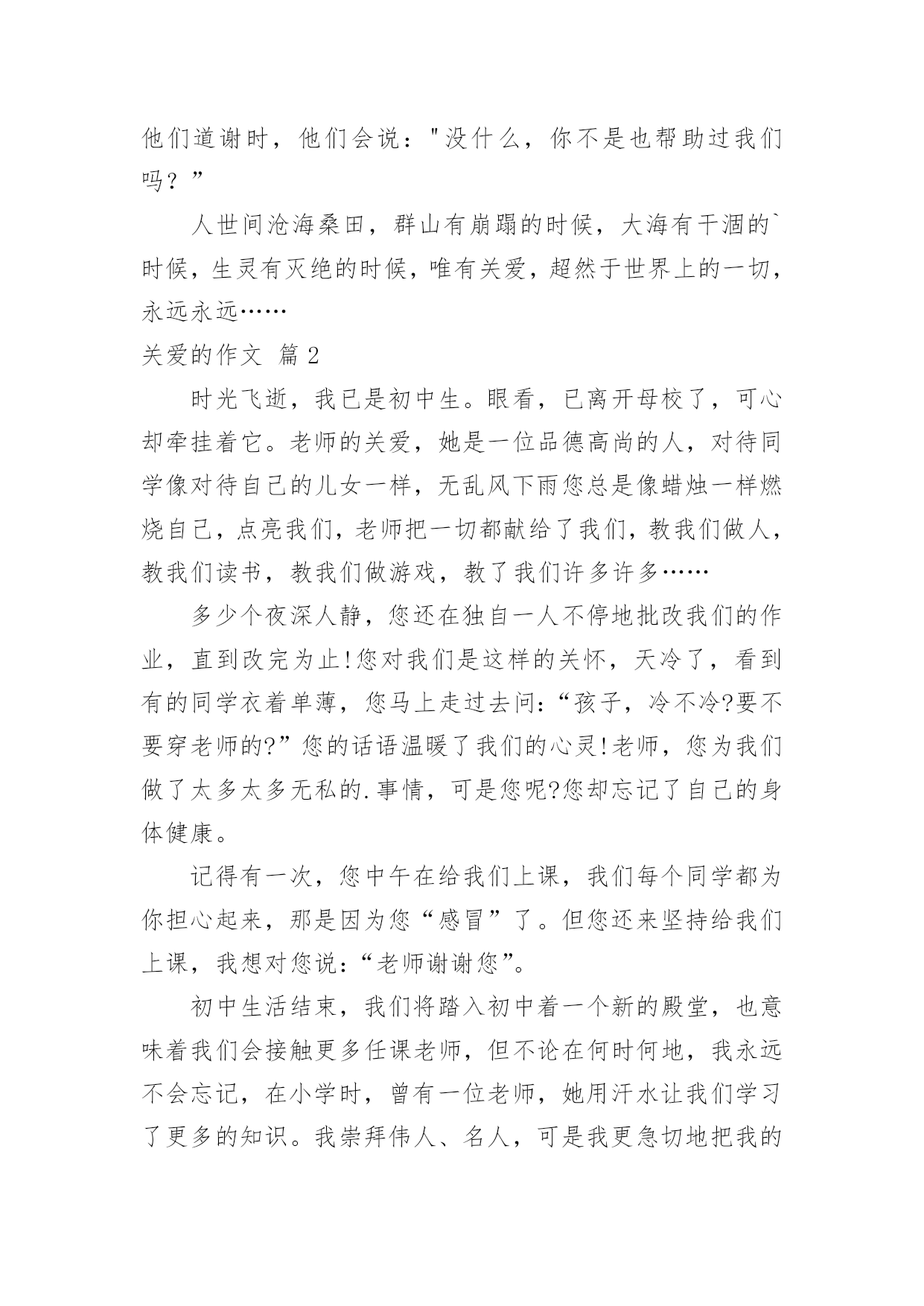 关爱的作文实用的关爱的作文[优]在日常学习、工作或生活中,大家对作文都不陌生吧,作文是一种言语活动,具有高度的综合性和创造性。那要怎么写好作文呢?下面是小编为大家收集的关爱的作文4篇,仅供参考,大家一起来看看吧。关爱的作文篇1朝阳出来了,湖水为它梳妆;新月上来了,群星为它做伴;春花开了,绿叶为它映衬;小鸟鸣唱,蟋蟀为它伴奏……天地间的万物都在向我们讲述着爱的故事。人是万物之灵,人与人之间的关系也只有用爱来编织才能天长地久,如果你留意,你会发现,每时每刻你都生活在周围人的关爱之中,你是不是也产生了关心他人的想法呢?路上,小孩不小心跌倒了,你轻轻的把他扶起来;课间,同学满头大汗,你静静地递上一块手帕……关心他人,就从这点点滴滴做起!某天,你发现同学闷闷不乐,就主动陪他散步,跟他聊天,驱除他心中的烦闷和迷惑……关心他人,就得从小处做起!学会关心他人吧,它会使你在人群中不被孤立,不被排斥,永远得到别人的关爱。当你遇到麻烦,正当焦头烂额之际,一大帮人突然出现在你的面前,帮你解决困难,当你向他们道谢时,他们会说:"没什么,你不是也帮助过我们吗?”人世间沧海桑田,群山有崩蹋的时候,大海有干涸的`时候,生灵有灭绝的时候,唯有关爱,超然于世界上的一切,永远永远……关爱的作文篇2时光飞逝,我已是初中生。眼看,已离开母校了,可心却牵挂着它。老师的关爱,她是一位品德高尚的人,对待同学像对待自己的儿女一样,无乱风下雨您总是像蜡烛一样燃烧自己,点亮我们,老师把一切都献给了我们,教我们做人,教我们读书,教我们做游戏,教了我们许多许多……多少个夜深人静,您还在独自一人不停地批改我们的作业,直到改完为止!您对我们是这样的关怀,天冷了,看到有的同学衣着单薄,您马上走过去问:“孩子,冷不冷?要不要穿老师的?”您的话语温暖了我们的心灵!老师,您为我们做了太多太多无私的.事情,可是您呢?您却忘记了自己的身体健康。记得有一次,您中午在给我们上课,我们每个同学都为你担心起来,那是因为您“感冒”了。但您还来坚持给我们上课,我想对您说:“老师谢谢您”。初中生活结束,我们将踏入初中着一个新的殿堂,也意味着我们会接触更多任课老师,但不论在何时何地,我永远不会忘记,在小学时,曾有一位老师,她用汗水让我们学习了更多的知识。我崇拜伟人、名人,可是我更急切地把我的敬意和赞美献给一位普通的人——毕老师。关爱的作文篇3她,白净的脸上嵌着一双水灵灵的大眼睛,忽闪忽闪,显得特别有神,只要一笑,嘴边就会露出两个小酒窝。你猜她是谁?她是我那温柔而美丽的丹姐。姐。记得在暑假的一天夜晚,下着蒙蒙小雨,我在小区下面和朋友们一起玩捉人,突然一不小心摔了下去,我不敢看那正出血的膝盖,“糟了,妈妈一定会骂我的,下次就不能出去玩了”我忐忑不安地想。不知不觉,我的眼泪不听话的流了下来,幸好是在下雨,分不清哪是泪,那是雨水,忽然雨停了,背后传出温柔的.声音说道“小敏,没事吧,摔跤了吗?”说着便把我扶起来,我抬头看,才知道原来雨并没有停,而是一把红色的雨伞在我头顶上发出滴滴嗒嗒地作响,而丹姐姐背后却湿了。她扶我走到门口,上楼时,我的膝盖在痛,丹姐姐见我站在那里,就把我抱起来,上完两层楼梯时,丹姐姐的脸已涨得通红。我轻声在她耳边说“谢谢你!”她把我抱到她的房间,转身跑去拿药箱。她把消毒水擦在那流血的膝盖上,虽然很痛,然而这痛并不和普通的痛一样,是甜蜜的,浓浓的,有说不出的味道。爱心如冬日的一片阳光,使饥寒交迫的感受到人间的温暖;把爱心洒在久旱的大地上的一场甘霖。使孤苦无依的人既刻获得心灵的慰藉。关爱的作文篇4接受我的关怀,期待你的笑容,人字的结构就是相互支撑。多给别人一份关爱就是多给自己一份快乐。我上四年级的那年,当上了小队长。当时,正值寒冷的冬天。轮到我们班打扫校园卫生了。早晨,寒风吹来,刺痛了我的脸。它就像一把利剑,割着我的皮肤。同学们都怨声载道。身为小队长的我理所应当地去倒垃圾。快上课了,我不想迟到。,还未回到教科室,上课铃便打响了。我飞奔起来,波及被摇得叮当响,仿佛提醒我:快跑,快跑。上楼梯时,我一不留神就从楼梯上摔了下来,簸箕锋利的一角割破了我的手,冻僵的手顿时鲜血直流。我满身脏兮兮的,坐在楼梯上,狼狈急了!剧痛袭击了我的身体,我很委屈,很想哭。史晓杰从班级出来找我,看见如此狼狈的我,二话没说,轻轻地将我扶起来。她紧紧地握住我的`手,说“不要被凉风吹了。”你在原地等着,说着她就消失在我是视线里。过了一会儿,史晓杰回来了。脸颊被冻得通红的她上气不接下气。“你干嘛去了?休息一下吧!”她说:“不用。”然后带着我径直去了医务室。医生帮我处理伤口的时,我疼得只咧嘴。她一直鼓励道:“忍一下,马上就好了。”大课间到了,我因为手疼的缘故,一个人孤单地坐在台阶上。她过来关心地问我:“到底怎么回事?好些了吗?”“好些了,不过隐