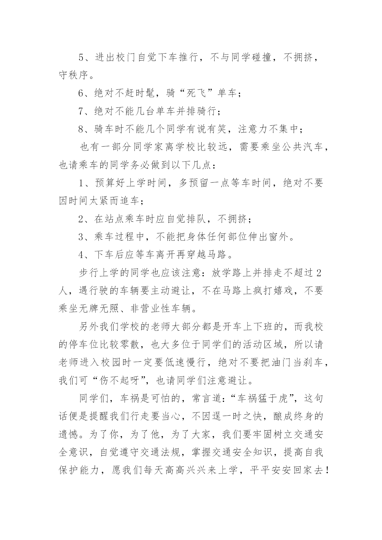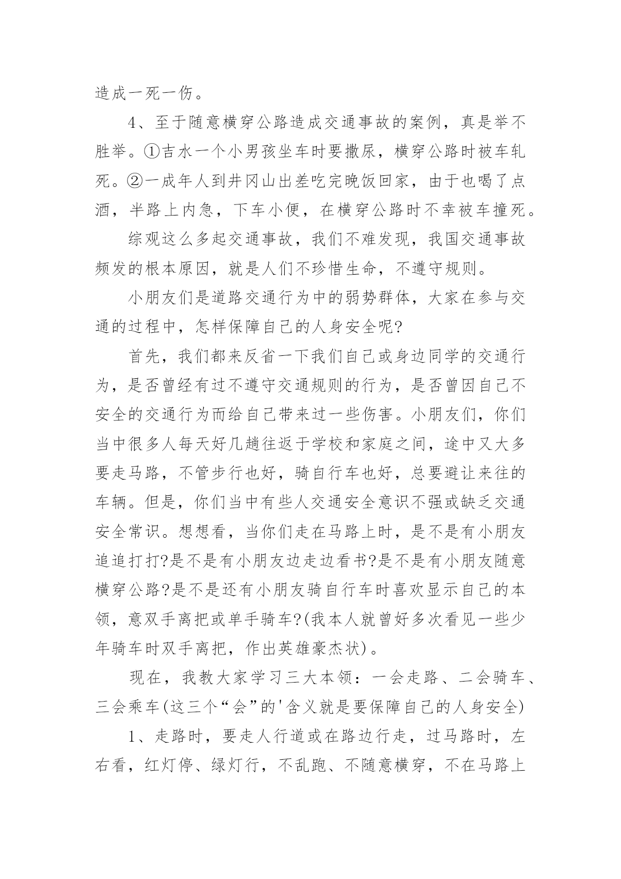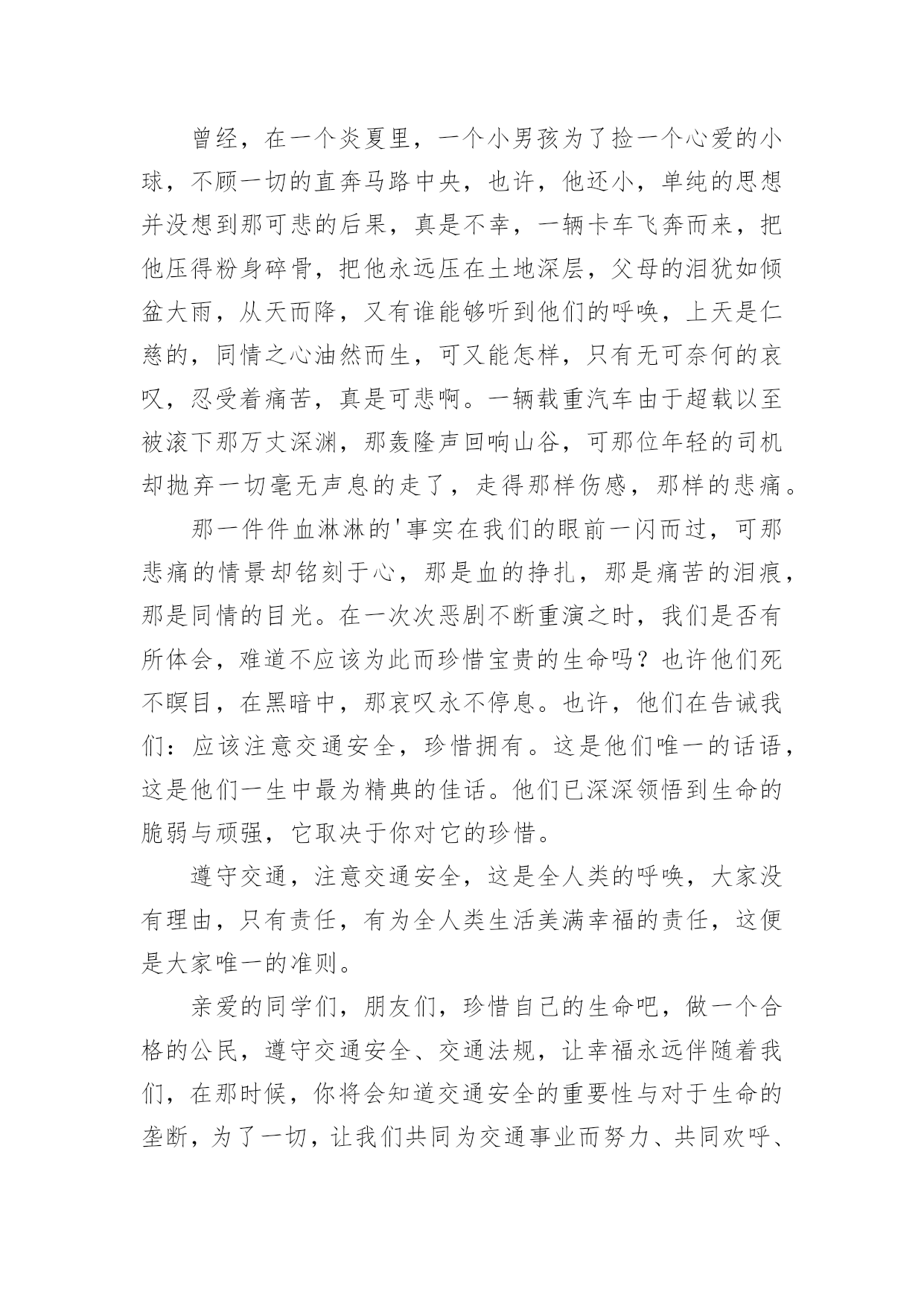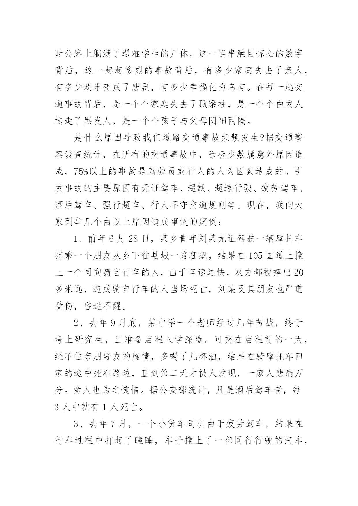 交通安全讲话稿交通安全讲话稿在充满活力,日益开放的今天,接触并使用讲话稿的人越来越多,讲话稿可以帮助发言者更好地表达。相信很多朋友都对写讲话稿感到非常苦恼吧,下面是小编为大家整理的交通安全讲话稿,希望对大家有所帮助。交通安全讲话稿1亲爱的老师、同学们:大家好。人的生活中,处处离不开交通,时时刻刻在交通之间徘徊,也许,一刹那的疏忽,会给你带来终身的遗憾。因此,为了朋友,为了家人,为了自己,我们应该遵守交通,做一个知法、守法的好公民。在日常生活中,许多人不注意交通安全,而鲁莽行事,司机驾驶着汽车一跃而过,在那飞奔的过程中,留下了什么,只留下了飘扬的尘埃吗?你是否看到身后隐藏着莫大的恐惧与伤感;喝醉的司机在“晨曦”的朦胧中颠着,昏昏沉沉中,没有任何思想的你,怎能冒如此险。当我看见“司机一滴酒,亲人一行泪”的标语,我为你们的无知而深感惭愧,难道在你们心中,它就是一张白纸吗?只代表着空虚吗?这使我陷入了沉思。曾经,在一个炎夏里,一个小男孩为了捡一个心爱的小球,不顾一切的直奔马路中央,也许,他还小,单纯的思想并没想到那可悲的后果,真是不幸,一辆卡车飞奔而来,把他压得粉身碎骨,把他永远压在土地深层,父母的泪犹如倾盆大雨,从天而降,又有谁能够听到他们的呼唤,上天是仁慈的,同情之心油然而生,可又能怎样,只有无可奈何的哀叹,忍受着痛苦,真是可悲啊。一辆载重汽车由于超载以至被滚下那万丈深渊,那轰隆声回响山谷,可那位年轻的司机却抛弃一切毫无声息的走了,走得那样伤感,那样的悲痛。那一件件血淋淋的'事实在我们的眼前一闪而过,可那悲痛的情景却铭刻于心,那是血的挣扎,那是痛苦的泪痕,那是同情的目光。在一次次恶剧不断重演之时,我们是否有所体会,难道不应该为此而珍惜宝贵的生命吗?也许他们死不瞑目,在黑暗中,那哀叹永不停息。也许,他们在告诫我们:应该注意交通安全,珍惜拥有。这是他们唯一的话语,这是他们一生中最为精典的佳话。他们已深深领悟到生命的脆弱与顽强,它取决于你对它的珍惜。遵守交通,注意交通安全,这是全人类的呼唤,大家没有理由,只有责任,有为全人类生活美满幸福的责任,这便是大家唯一的准则。亲爱的同学们,朋友们,珍惜自己的生命吧,做一个合格的公民,遵守交通安全、交通法规,让幸福永远伴随着我们,在那时候,你将会知道交通安全的重要性与对于生命的垄断,为了一切,让我们共同为交通事业而努力、共同欢呼、共同为祖国取下最为灿烂的一页,让那交通的泪痕永不渗出,在那张白净的脸上露出幸福的微笑。交通安全讲话稿2尊敬的老师们、亲爱的同学们:上午好!今天我国旗下讲话的主题是《交通安全、人人有责》随着经济的发展,我们周围的车辆越来越多,我们即充分享受着现代交通带来的便利和快捷,同时交通事故已成为当今意外事故的第一大杀手,中国目前每天死于交通事故的人数约在300人左右。我国每年都有数以千计的青少年被无情的'车祸夺去了生命或造成了终生残疾,其中很大一部分原因就是因为我们对道路交通法规知道得太少,自我防范意识较差,缺乏自我保护意识而造成的。同学们,老师们为了你和家人的幸福,避免交通事故的发生,希望大家务必提高交通安全意识,自觉遵守交通法规。针对我们学校的情况我给大家提一些建议:我校是一所走读学校,上学放学骑自行车的人比较多,而且学校附近工厂也不少,我们的放学时间也是工厂的下班时间,所以请骑自行车的同学务必做到以下几点:1、要经常检查刹车;2、在过马路时,要一慢二看,不闯红灯,不随意横过马路;3、靠右走,主动避让机动车辆;4、不骑车带人,不逆向行驶,不超速行驶。5、进出校门自觉下车推行,不与同学碰撞,不拥挤,守秩序。6、绝对不赶时髦,骑“死飞”单车;7、绝对不能几台单车并排骑行;8、骑车时不能几个同学有说有笑,注意力不集中;也有一部分同学家离学校比较远,需要乘坐公共汽车,也请乘车的同学务必做到以下几点:1、预算好上学时间,多预留一点等车时间,绝对不要因时间太紧而追车;2、在站点乘车时应自觉排队,不拥挤;3、乘车过程中,不能把身体任何部位伸出窗外。4、下车后应等车离开再穿越马路。步行上学的同学也应该注意:放学路上并排走不超过2人,遇行驶的车辆要主动避让,不在马路上疯打嬉戏,不要乘坐无牌无照、非营业性车辆。另外我们学校的老师大部分都是开车上下班的,而我校的停车位比较零散,也大多位于同学们的活动区域,所以请老师进入校园时一定要低速慢行,绝对不要把油门当刹车,我们可“伤不起呀”,也请同学们注意避让。同学们,车祸是可怕的,常言道:“车祸猛于虎”,这句话便是提醒我们行走要当心,不因逞一时之快,酿成终身的遗憾。为了你,为了他,为了大家,我们要牢固树立交通安全意识,自觉遵守交通法规,掌握交通安全知识,提高自我保护能力,愿我们每天高高兴兴来上学,平平安安回家去!交通安全讲话稿3尊敬的老师们,亲爱的同学们:大