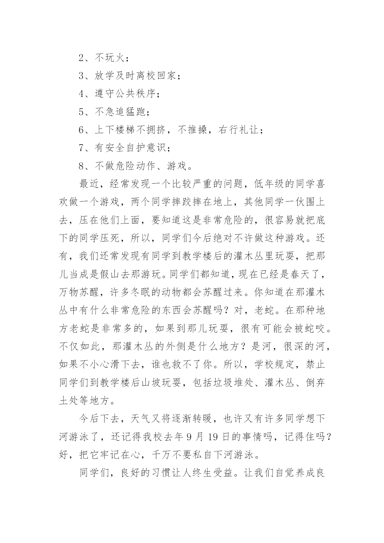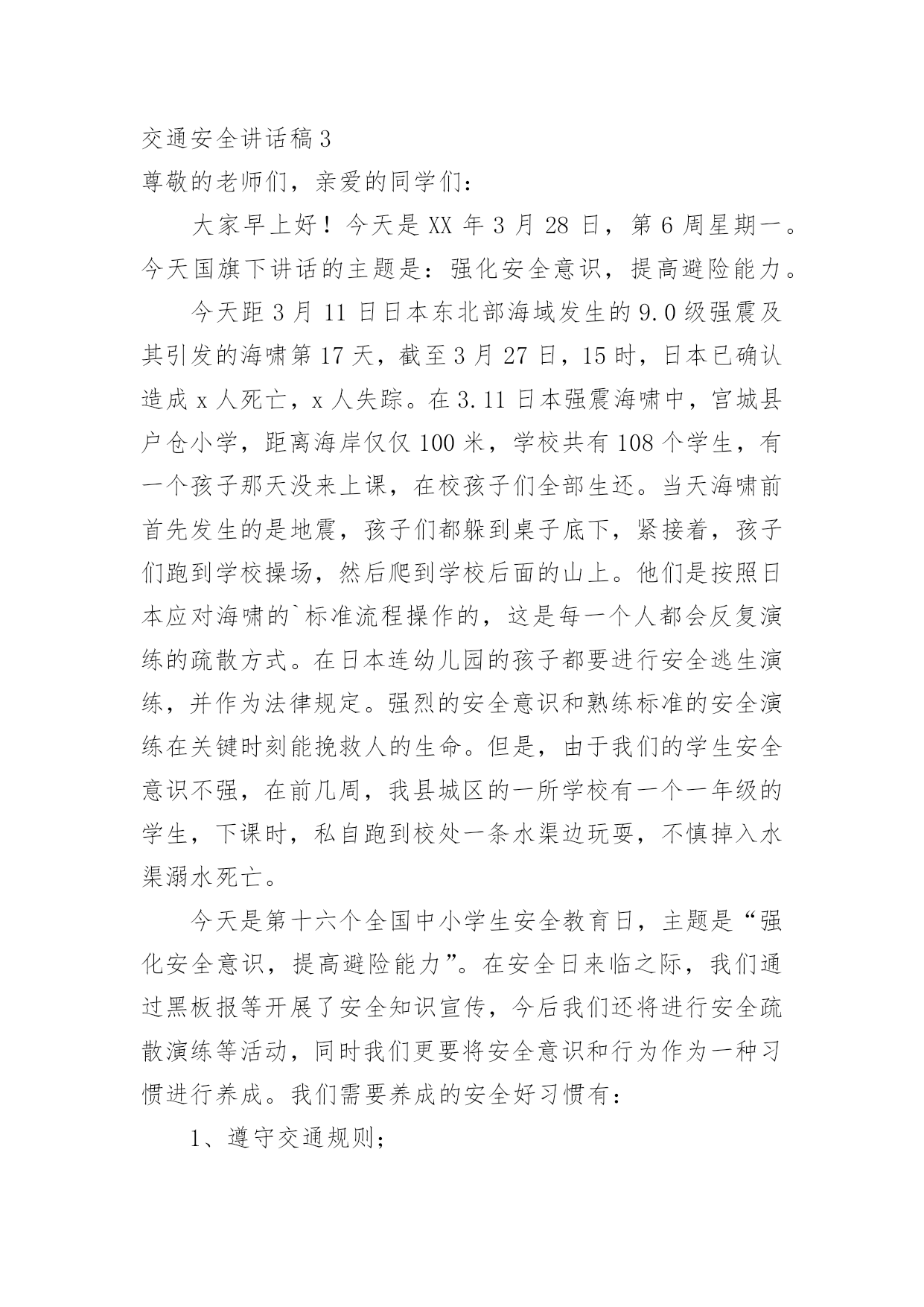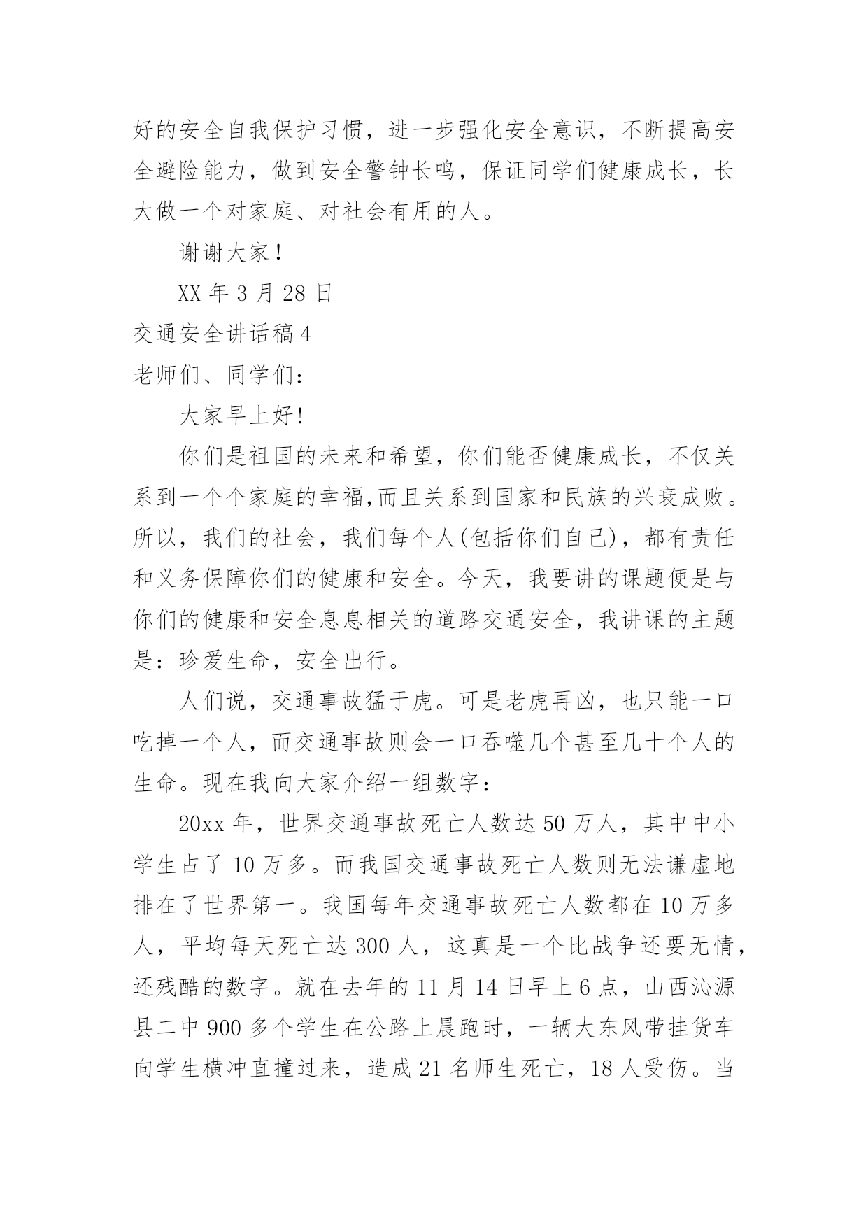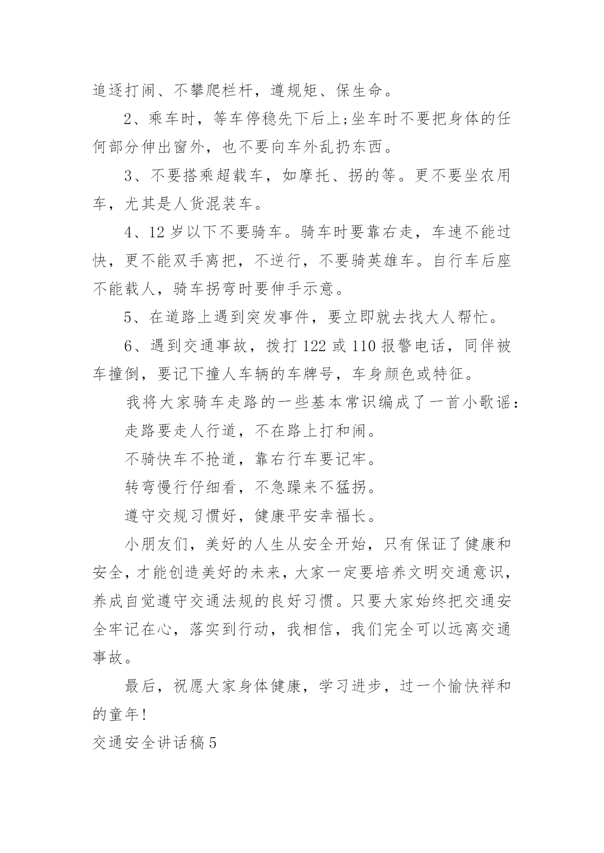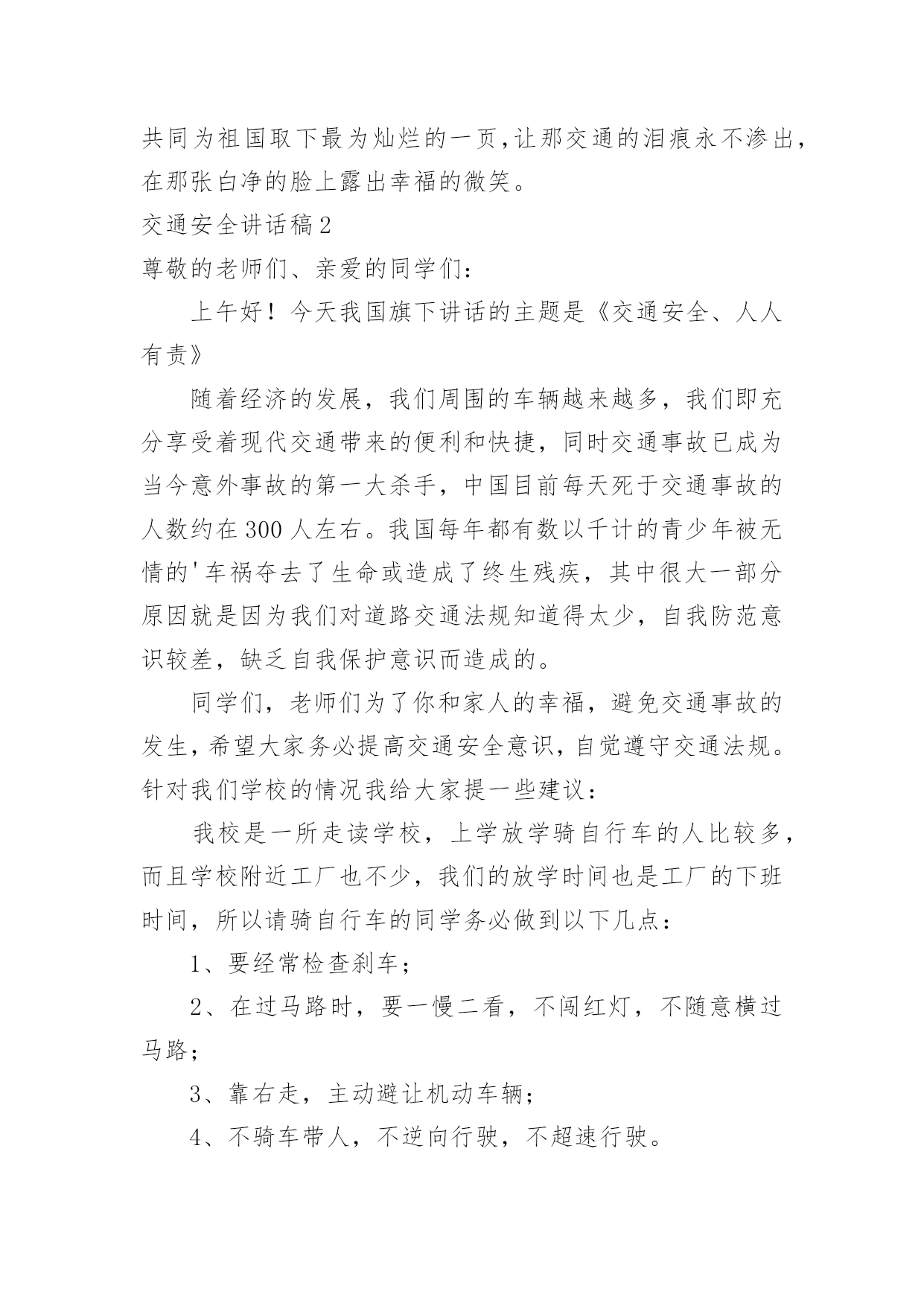交通安全讲话稿交通安全讲话稿在充满活力,日益开放的今天,接触并使用讲话稿的人越来越多,讲话稿可以帮助发言者更好地表达。相信很多朋友都对写讲话稿感到非常苦恼吧,下面是小编为大家整理的交通安全讲话稿,希望对大家有所帮助。交通安全讲话稿1亲爱的老师、同学们:大家好。人的生活中,处处离不开交通,时时刻刻在交通之间徘徊,也许,一刹那的疏忽,会给你带来终身的遗憾。因此,为了朋友,为了家人,为了自己,我们应该遵守交通,做一个知法、守法的好公民。在日常生活中,许多人不注意交通安全,而鲁莽行事,司机驾驶着汽车一跃而过,在那飞奔的过程中,留下了什么,只留下了飘扬的尘埃吗?你是否看到身后隐藏着莫大的恐惧与伤感;喝醉的司机在“晨曦”的朦胧中颠着,昏昏沉沉中,没有任何思想的你,怎能冒如此险。当我看见“司机一滴酒,亲人一行泪”的标语,我为你们的无知而深感惭愧,难道在你们心中,它就是一张白纸吗?只代表着空虚吗?这使我陷入了沉思。曾经,在一个炎夏里,一个小男孩为了捡一个心爱的小球,不顾一切的直奔马路中央,也许,他还小,单纯的思想并没想到那可悲的后果,真是不幸,一辆卡车飞奔而来,把他压得粉身碎骨,把他永远压在土地深层,父母的泪犹如倾盆大雨,从天而降,又有谁能够听到他们的呼唤,上天是仁慈的,同情之心油然而生,可又能怎样,只有无可奈何的哀叹,忍受着痛苦,真是可悲啊。一辆载重汽车由于超载以至被滚下那万丈深渊,那轰隆声回响山谷,可那位年轻的司机却抛弃一切毫无声息的走了,走得那样伤感,那样的悲痛。那一件件血淋淋的'事实在我们的眼前一闪而过,可那悲痛的情景却铭刻于心,那是血的挣扎,那是痛苦的泪痕,那是同情的目光。在一次次恶剧不断重演之时,我们是否有所体会,难道不应该为此而珍惜宝贵的生命吗?也许他们死不瞑目,在黑暗中,那哀叹永不停息。也许,他们在告诫我们:应该注意交通安全,珍惜拥有。这是他们唯一的话语,这是他们一生中最为精典的佳话。他们已深深领悟到生命的脆弱与顽强,它取决于你对它的珍惜。遵守交通,注意交通安全,这是全人类的呼唤,大家没有理由,只有责任,有为全人类生活美满幸福的责任,这便是大家唯一的准则。亲爱的同学们,朋友们,珍惜自己的生命吧,做一个合格的公民,遵守交通安全、交通法规,让幸福永远伴随着我们,在那时候,你将会知道交通安全的重要性与对于生命的垄断,为了一切,让我们共同为交通事业而努力、共同欢呼、共同为祖国取下最为灿烂的一页,让那交通的泪痕永不渗出,在那张白净的脸上露出幸福的微笑。交通安全讲话稿2尊敬的老师们、亲爱的同学们:上午好!今天我国旗下讲话的主题是《交通安全、人人有责》随着经济的发展,我们周围的车辆越来越多,我们即充分享受着现代交通带来的便利和快捷,同时交通事故已成为当今意外事故的第一大杀手,中国目前每天死于交通事故的人数约在300人左右。我国每年都有数以千计的青少年被无情的'车祸夺去了生命或造成了终生残疾,其中很大一部分原因就是因为我们对道路交通法规知道得太少,自我防范意识较差,缺乏自我保护意识而造成的。同学们,老师们为了你和家人的幸福,避免交通事故的发生,希望大家务必提高交通安全意识,自觉遵守交通法规。针对我们学校的情况我给大家提一些建议:我校是一所走读学校,上学放学骑自行车的人比较多,而且学校附近工厂也不少,我们的放学时间也是工厂的下班时间,所以请骑自行车的同学务必做到以下几点:1、要经常检查刹车;2、在过马路时,要一慢二看,不闯红灯,不随意横过马路;3、靠右走,主动避让机动车辆;4、不骑车带人,不逆向行驶,不超速行驶。5、进出校门自觉下车推行,不与同学碰撞,不拥挤,守秩序。6、绝对不赶时髦,骑“死飞”单车;7、绝对不能几台单车并排骑行;8、骑车时不能几个同学有说有笑,注意力不集中;也有一部分同学家离学校比较远,需要乘坐公共汽车,也请乘车的同学务必做到以下几点:1、预算好上学时间,多预留一点等车时间,绝对不要因时间太紧而追车;2、在站点乘车时应自觉排队,不拥挤;3、乘车过程中,不能把身体任何部位伸出窗外。4、下车后应等车离开再穿越马路。步行上学的同学也应该注意:放学路上并排走不超过2人,遇行驶的车辆要主动避让,不在马路上疯打嬉戏,不要乘坐无牌无照、非营业性车辆。另外我们学校的老师大部分都是开车上下班的,而我校的停车位比较零散,也大多位于同学们的活动区域,所以请老师进入校园时一定要低速慢行,绝对不要把油门当刹车,我们可“伤不起呀”,也请同学们注意避让。同学们,车祸是可怕的,常言道:“车祸猛于虎”,这句话便是提醒我们行走要当心,不因逞一时之快,酿成终身的遗憾。为了你,为了他,为了大家,我们要牢固树立交通安全意识,自觉遵守交通法规,掌握交通安全知识,提高自我保护能力,愿我们每天高高兴兴来上学,平平安安回家去!交通安全讲话稿3尊敬的老师们,亲爱的同学们:大