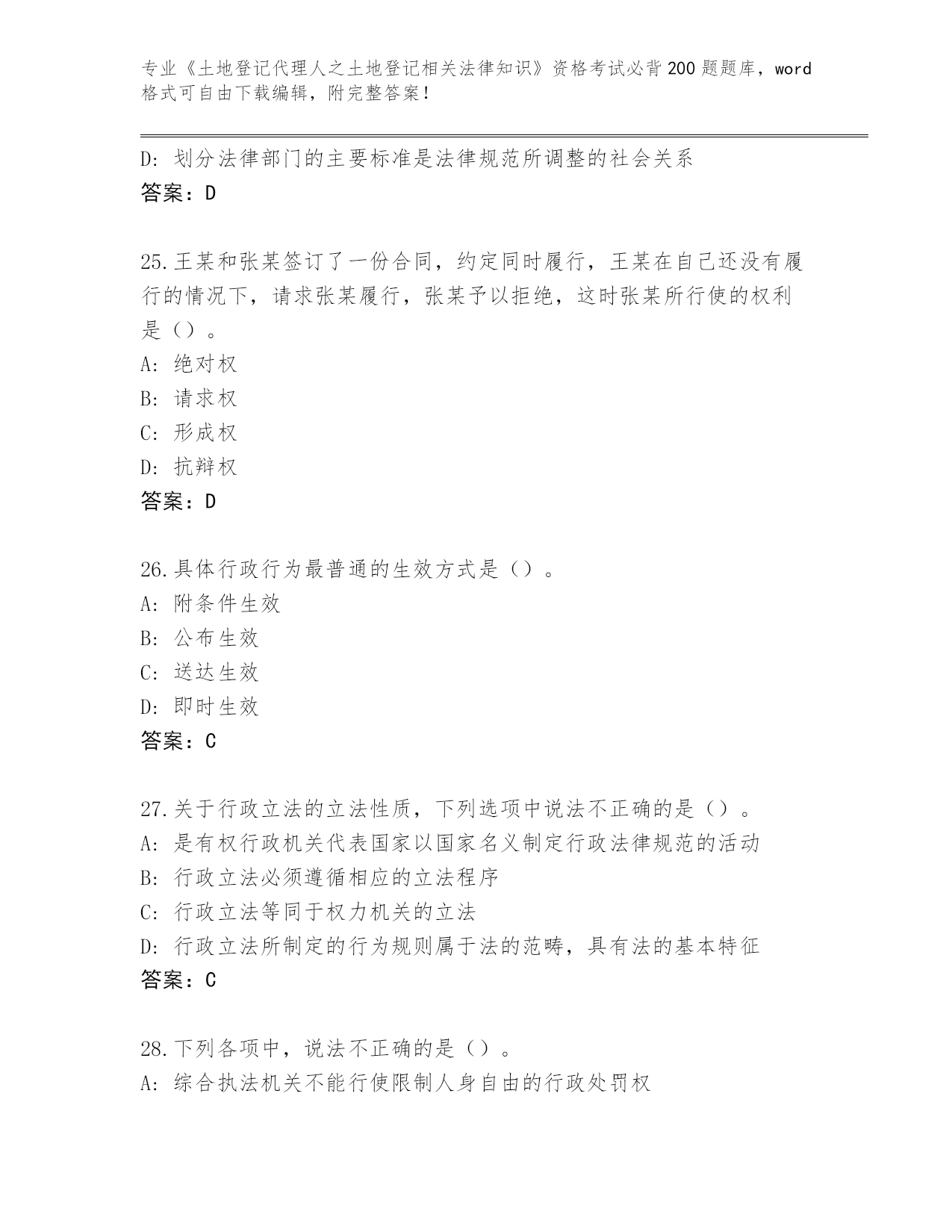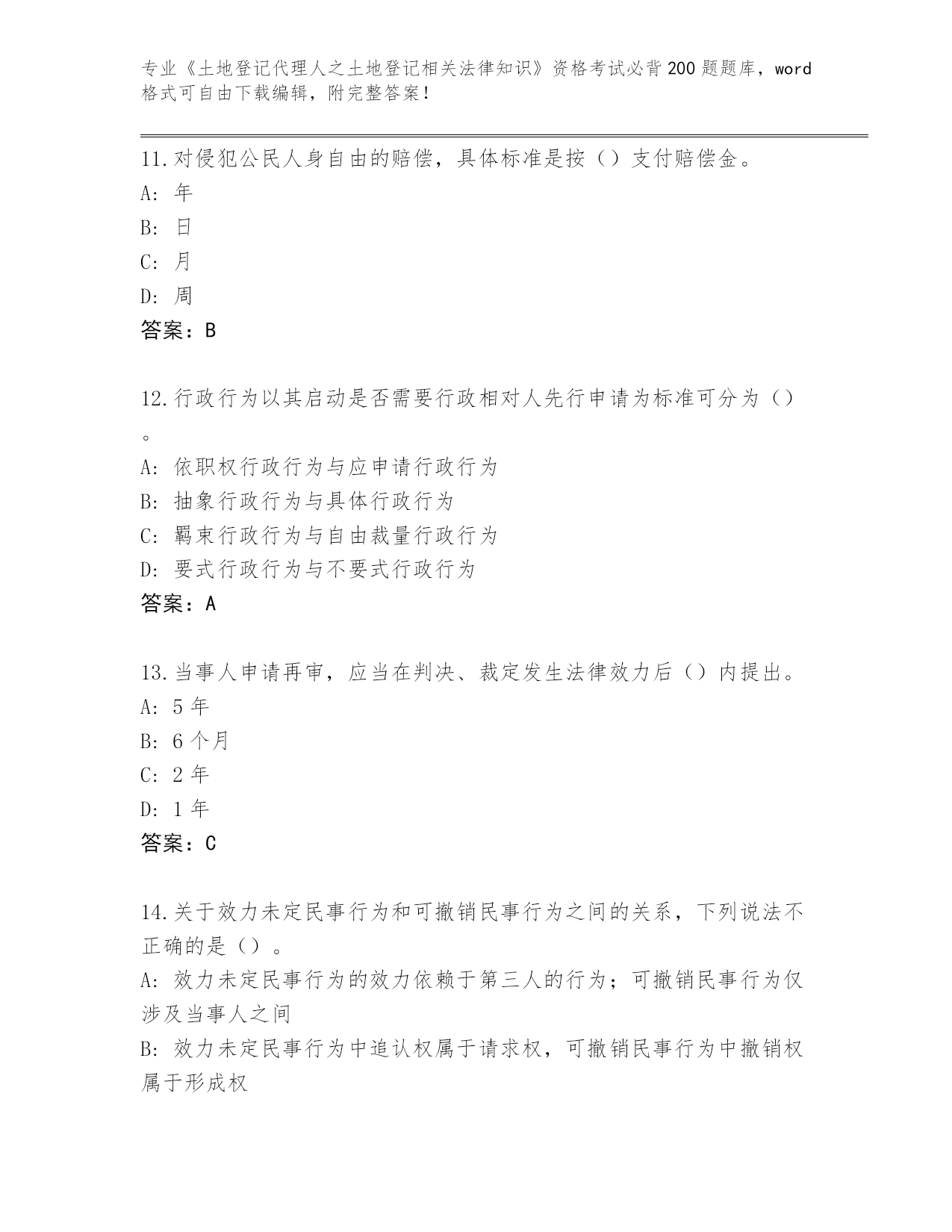 2024黑龙江省泰来县《土地登记代理人之土地登记相关法律知识》资格考试必刷200题真题(网校专用)