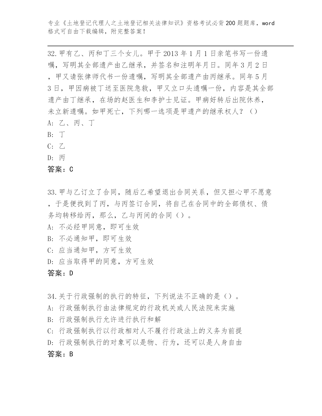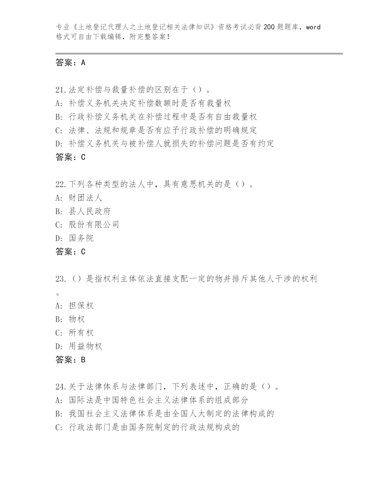 2024年江西省新干县《土地登记代理人之土地登记相关法律知识》资格考试必刷200题题库(突破训练)
