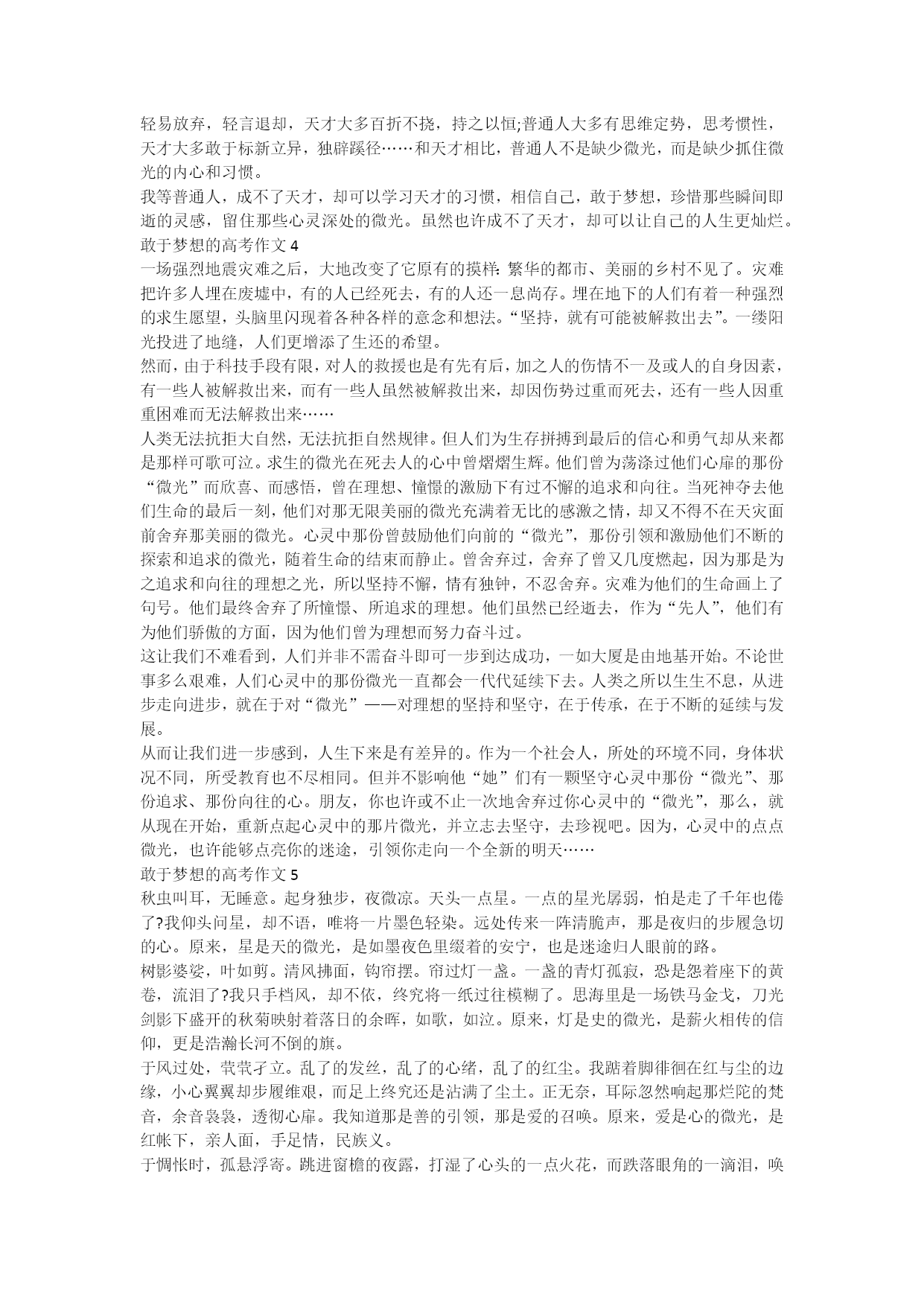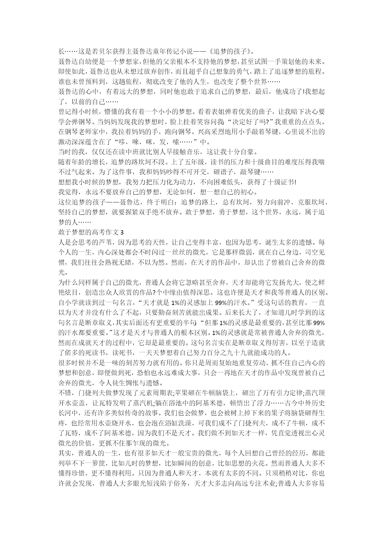 敢于梦想的高考作文有梦想的地方,就有希望。一代又一代的中国人在筑梦,圆梦中走向繁荣富强。每个人都有梦想,有了梦想,就有奋斗目标。成长就是一个个梦想实现的历程。让我们一起来看看关于敢于梦想的高考作文,希望对您有所帮助,欢迎大家查阅学习!敢于梦想的高考作文1以花园城市著称于世的新加坡,是一个规划得极好的城市。市区内大道宽阔笔直,亚热特有的雨树在大道两旁洒下浓荫。各个街区,现代化的高楼大厦错落有致,无论是写字楼、公寓楼,还是商场、宾馆,每幢建筑物的外形、色调各具特色,又与整个城市保持着和谐统一。环绕每幢建筑物的,是绿草如茵的草坪和鲜花盛开的大小花园。即使在市中心区最热闹繁华的地段,高楼群中也有大片的草坪和街心花园。漫步在新加坡城,没有一般大都市那种钢筋水泥森林给人造成的压迫感,也没有拥挤嘈杂的感觉,只觉得宁静清幽,心旷神怡。城市规划和建设上,新加坡向世界一流水准看齐。今天新加坡的风貌,源于1971年联合国专家为新加坡所作的规划蓝图,新加坡的专家们再根据本国国情作了一些修改和补充,实施后不但得到本国人民的认可,还受到各国专家和观光客们的称赞。考察中我们曾经参观新加坡的城市规划局,在那里看到新加坡未来城市发展蓝图的指导原则,开头部分写得极具童话色彩:“想想看,假如一个小孩拿起画笔描画心中的理想世界,他画些什么?或许是一个大的游乐场,上面有大树可以攀爬,有钓鱼池,还有脚踏车道。他还可能画一栋海边的家,从家的窗户可以看到点点船只。”我们还看到未来城市规划的理念是:“未来我们必须给人民享受无比,比现在更好的工作、生活、休闲、美化的环境,必须增添色彩、价值、品质于未来生活中。”其理想是:“进一步塑造海岛形象,提升居住品质、发展海滨住宅、中低密度住宅;以及成为文化艺术的中心,成为一个具有亚洲传统文化的都市。”可以看出,新加坡人对未来怀着美好的憧憬,敢于梦想并努力使梦想成真。他们将人情美和艺术美溶于城市规划之中,以如此的情怀,建设出美丽的城市是一种必然。新加坡的城市规划考虑周到并具有远见,既考虑到城市的美丽,也考虑到方便居民的生活,每个街区,都有统一规划的超级市场、小吃中心,就连垃圾站和防空洞,都造型美观、花木环绕,可成为一道风景线。在每个片区,都留下10%的土地暂不开发,以备今后随着时代的进步需增添新设施时使用。将每个人心中的理想变成现实,是新加坡城市规划的基本精神。因此,政府规划部门作出的规划得到全国人民的拥护。在新加坡,绝对不会发生政府需要用地时占据着一块地盘与政府讨价还价的事情,也绝对不会发生乱搭乱建违章建筑的事情,更不会发生某单位、某团体或某个人为了自身的利益随意更改规划的事情。若因实际情况需要修改规划,必须拿出充分的依据,报经规划部门审批。在八十年代,新加坡就按照规划,完成了地铁、公路网、通讯、供电、供水、垃圾处理等公共基础设施的建设,污水下水道普及率和垃圾焚化率都名列世界前茅。走过基础建设的年代,新加坡追求的是卓越与特色,立志成为世界一流的热带大都市。新加坡的城市规划与城市维修计划是同步的,在已建成的片区内,一砖一瓦、一草一木、一盏路灯、一张户外凳子,都有专人负责维护,若有损坏马上修理。因此,新加坡总给人以新崭崭的感觉。新加坡虽然没有名山大川,缺乏天然美景,但仍然凭藉一座规划一流、建设一流的花园城市,吸引了世界各国的大批观光客。敢于梦想的高考作文2每一片叶子都曾栖息过梦想,每一本好书都散发着光明和力量,阅读滋养想象,自由放飞成长……这是若贝尔获得主聂鲁达童年传记小说——《追梦的孩子》。聂鲁达自幼便是一个梦想家,但他的父亲根本不支持他的梦想,甚至试图一手策划他的未来。即使如此,聂鲁达也从未想过放弃创作,而且超乎自己想象的勇气,踏上了追逐梦想的旅程。谁也未曾预料到,这趟旅程,彻底改变了他的人生,也改变了整个世界……聂鲁达的心中,有着远大的梦想,同时他也敢于追求自己的梦想,最后,他成功了!我想起了,以前的自己……曾记得小时候,懵懂的我有着一个小小的梦想。看着表姐弹着优美的曲子,让我暗下决心要学会弹钢琴。当妈妈发现我的梦想时,脸上挂着笑容问我:“决定好了吗?”我重重的点点头。在钢琴老师家中,我拉着妈妈的手,跑向钢琴。兴高采烈地用小手敲着琴键,心里说不出的激动深深蕴含在了“哆,唻,咪,发,嗦……”中。当时的我,仅仅还在读中班就比别人早接触音乐,这让我十分自豪。随着年龄的增长,追梦的路坎坷不段。上了五年级,读书的压力和十级曲目的难度压得我喘不过气起来。为了这件事,我和妈妈吵得不可开交,砸谱子,敲琴键……想想我小时候的梦想,我努力把压力化为动力,不向困难低头,获得了十级证书!我觉得,永远不要放弃自己的梦想,无论如何,想一想自己的初心。这位追梦的孩子——聂鲁达,终于明白:追梦的路上,总有坎坷,努力向前冲,克