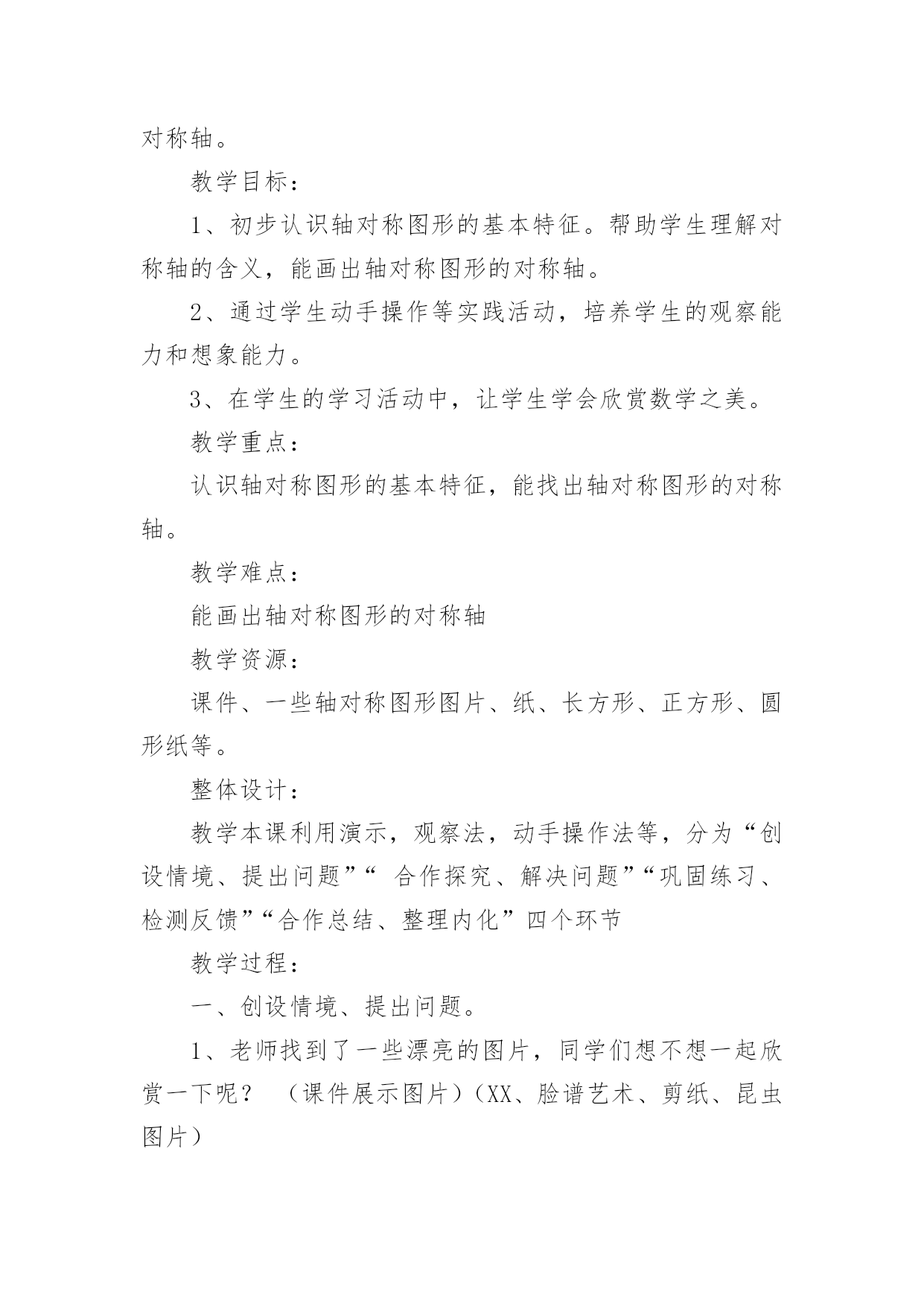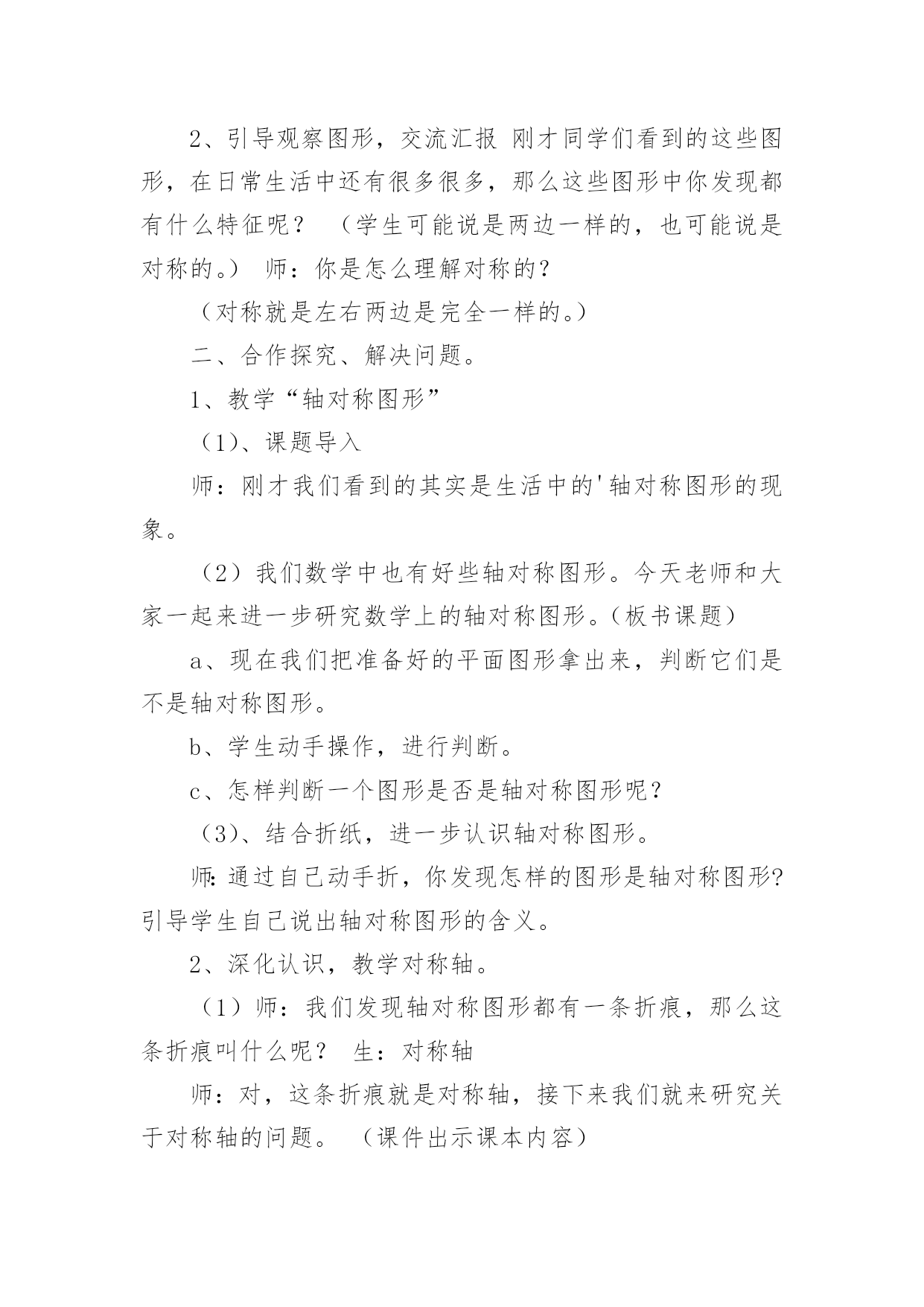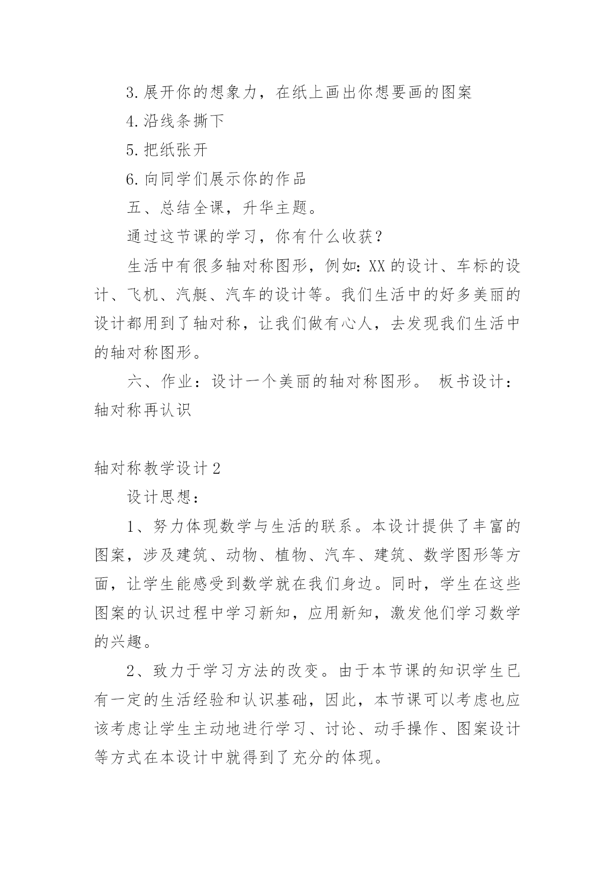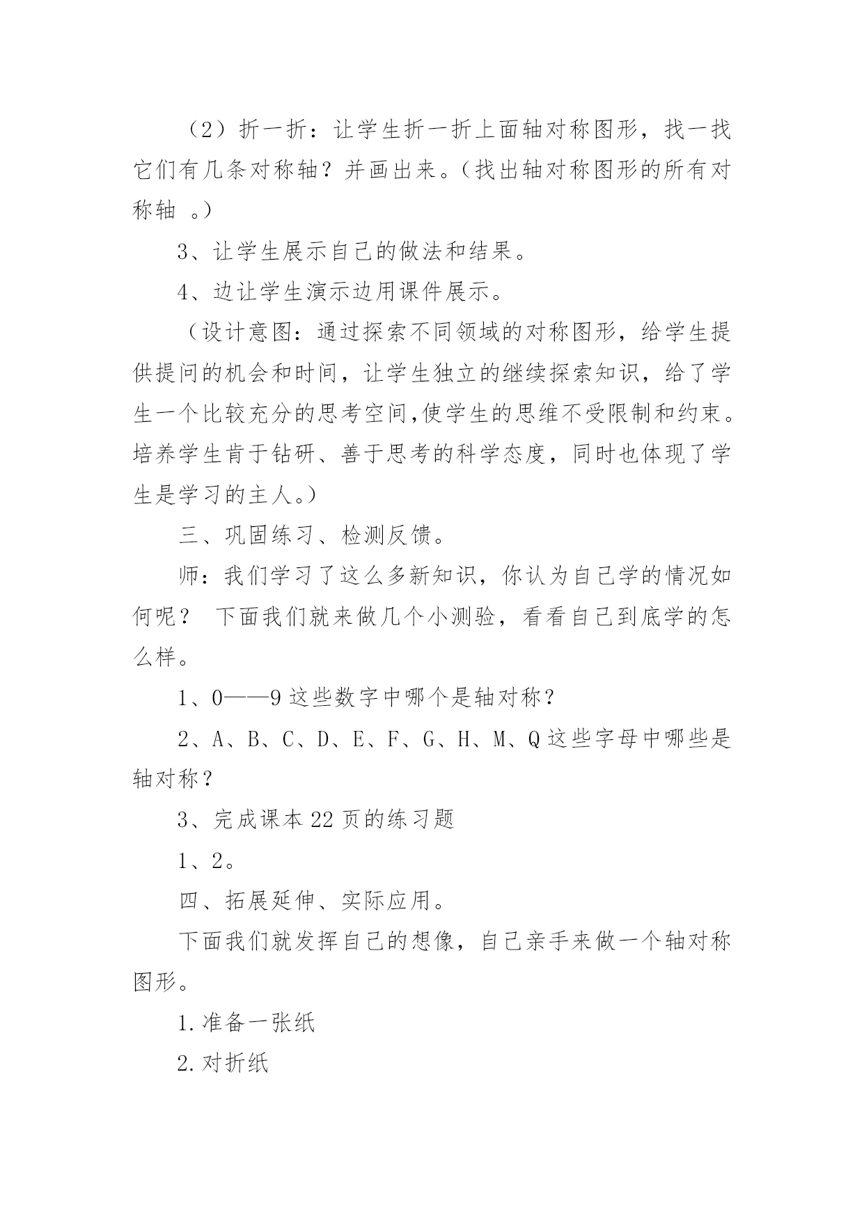 轴对称教学设计作为一无名无私奉献的教育工作者,往往需要进行教学设计编写工作,借助教学设计可以提高教学效率和教学质量。写教学设计需要注意哪些格式呢?以下是小编精心整理的轴对称教学设计,欢迎大家借鉴与参考,希望对大家有所帮助。轴对称教学设计1教材分析:轴对称图形是日常生活中的常见图形,人们装饰、布置生活环境时也经常利用这些图形。通过轴对称图形的学习,学生既可以了解轴对称现象在生活水中的普遍性,又能提高数学欣赏能力与空间想象能力。之前学生已初步了解轴对称,本节课继续认识轴对称图形的特点,判断是否是轴对称图形并能在实际生活中找出轴对称图形的对称轴。教学时,多给学生展示有轴对称图形的图片,使学生从中充分感受对称的意义和图形中的美。课下可以请学生收集轴对称图形的图片,并组织全班进行展示交流活动。多组织“折一折,填一填、画一画”等活动,以增强学生对轴对称图形特点的体验。学情分析:学生在三年级对轴对称图形已经有了初步的认识,但学生对于找对称轴还是有些困难。本节让学生通过折一折、填一填、画一画的形式进一步了解轴对称图形的特点,学会找对称轴。教学目标:1、初步认识轴对称图形的基本特征。帮助学生理解对称轴的含义,能画出轴对称图形的对称轴。2、通过学生动手操作等实践活动,培养学生的观察能力和想象能力。3、在学生的学习活动中,让学生学会欣赏数学之美。教学重点:认识轴对称图形的基本特征,能找出轴对称图形的对称轴。教学难点:能画出轴对称图形的对称轴教学资源:课件、一些轴对称图形图片、纸、长方形、正方形、圆形纸等。整体设计:教学本课利用演示,观察法,动手操作法等,分为“创设情境、提出问题”“合作探究、解决问题”“巩固练习、检测反馈”“合作总结、整理内化”四个环节教学过程:一、创设情境、提出问题。1、老师找到了一些漂亮的图片,同学们想不想一起欣赏一下呢?(课件展示图片)(XX、脸谱艺术、剪纸、昆虫图片)2、引导观察图形,交流汇报刚才同学们看到的这些图形,在日常生活中还有很多很多,那么这些图形中你发现都有什么特征呢?(学生可能说是两边一样的,也可能说是对称的。)师:你是怎么理解对称的?(对称就是左右两边是完全一样的。)二、合作探究、解决问题。1、教学“轴对称图形”(1)、课题导入师:刚才我们看到的其实是生活中的'轴对称图形的现象。(2)我们数学中也有好些轴对称图形。今天老师和大家一起来进一步研究数学上的轴对称图形。(板书课题)a、现在我们把准备好的平面图形拿出来,判断它们是不是轴对称图形。b、学生动手操作,进行判断。c、怎样判断一个图形是否是轴对称图形呢?(3)、结合折纸,进一步认识轴对称图形。师:通过自己动手折,你发现怎样的图形是轴对称图形?引导学生自己说出轴对称图形的含义。2、深化认识,教学对称轴。(1)师:我们发现轴对称图形都有一条折痕,那么这条折痕叫什么呢?生:对称轴师:对,这条折痕就是对称轴,接下来我们就来研究关于对称轴的问题。(课件出示课本内容)(2)折一折:让学生折一折上面轴对称图形,找一找它们有几条对称轴?并画出来。(找出轴对称图形的所有对称轴。)3、让学生展示自己的做法和结果。4、边让学生演示边用课件展示。(设计意图:通过探索不同领域的对称图形,给学生提供提问的机会和时间,让学生独立的继续探索知识,给了学生一个比较充分的思考空间,使学生的思维不受限制和约束。培养学生肯于钻研、善于思考的科学态度,同时也体现了学生是学习的主人。)三、巩固练习、检测反馈。师:我们学习了这么多新知识,你认为自己学的情况如何呢?下面我们就来做几个小测验,看看自己到底学的怎么样。1、0——9这些数字中哪个是轴对称?2、A、B、C、D、E、F、G、H、M、Q这些字母中哪些是轴对称?3、完成课本22页的练习题1、2。四、拓展延伸、实际应用。下面我们就发挥自己的想像,自己亲手来做一个轴对称图形。1.准备一张纸2.对折纸3.展开你的想象力,在纸上画出你想要画的图案4.沿线条撕下5.把纸张开6.向同学们展示你的作品五、总结全课,升华主题。通过这节课的学习,你有什么收获?生活中有很多轴对称图形,例如:XX的设计、车标的设计、飞机、汽艇、汽车的设计等。我们生活中的好多美丽的设计都用到了轴对称,让我们做有心人,去发现我们生活中的轴对称图形。六、作业:设计一个美丽的轴对称图形。板书设计:轴对称再认识轴对称教学设计2设计思想:1、努力体现数学与生活的联系。本设计提供了丰富的图案,涉及建筑、动物、植物、汽车、建筑、数学图形等方面,让学生能感受到数学就在我们身边。同时,学生在这些图案的认识过程中学习新知,应用新知,激发他们学习数学的兴趣。2、致力于学习方法的改变。由于本节课的知识学生已有一定的生活经验和认识基础,因此,本节课可以考虑也应该考虑让学生主动地进行学习、讨论、动手操作、图案设计等方