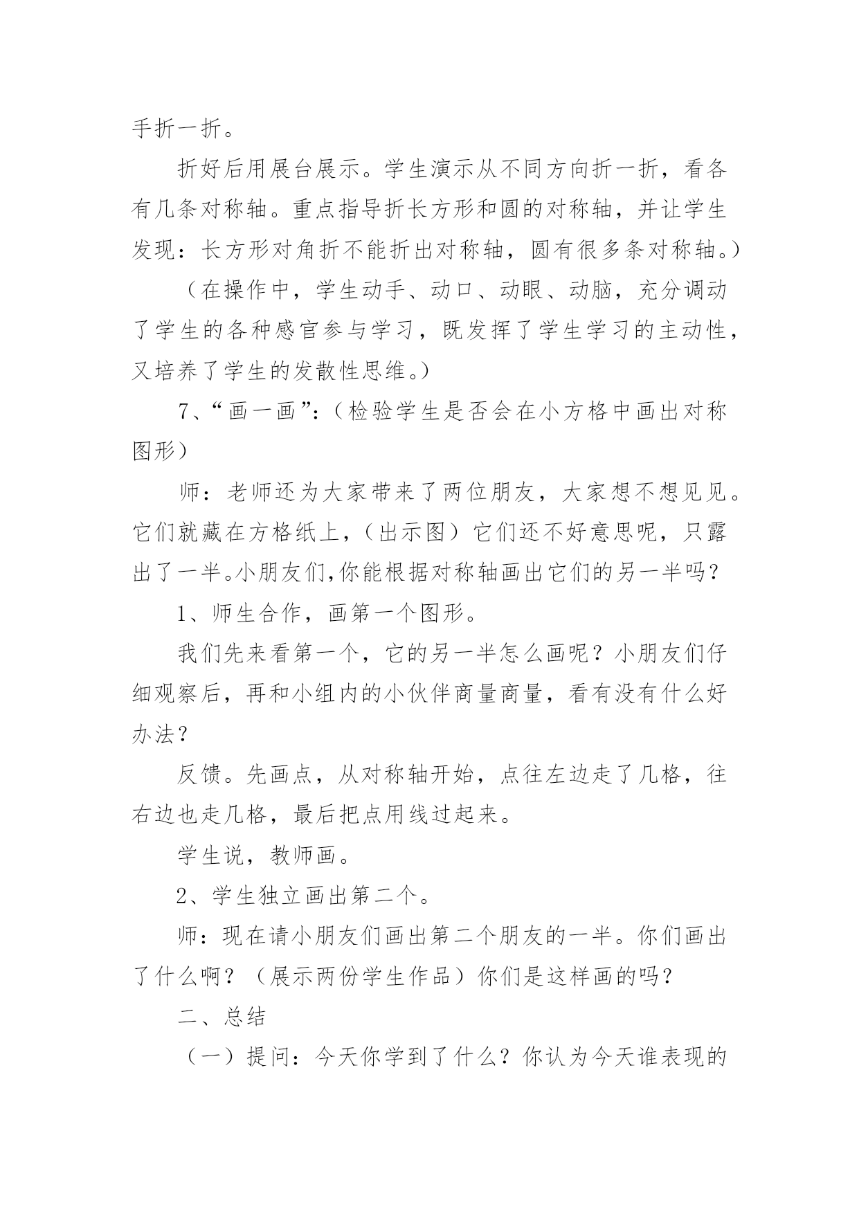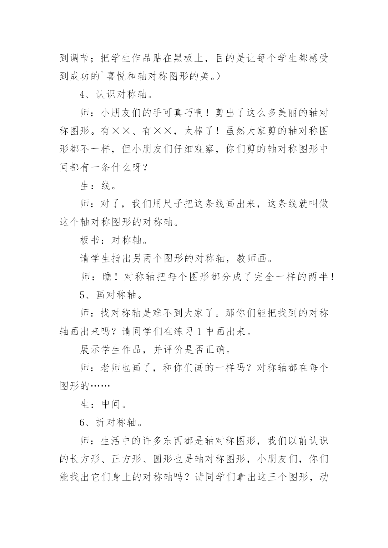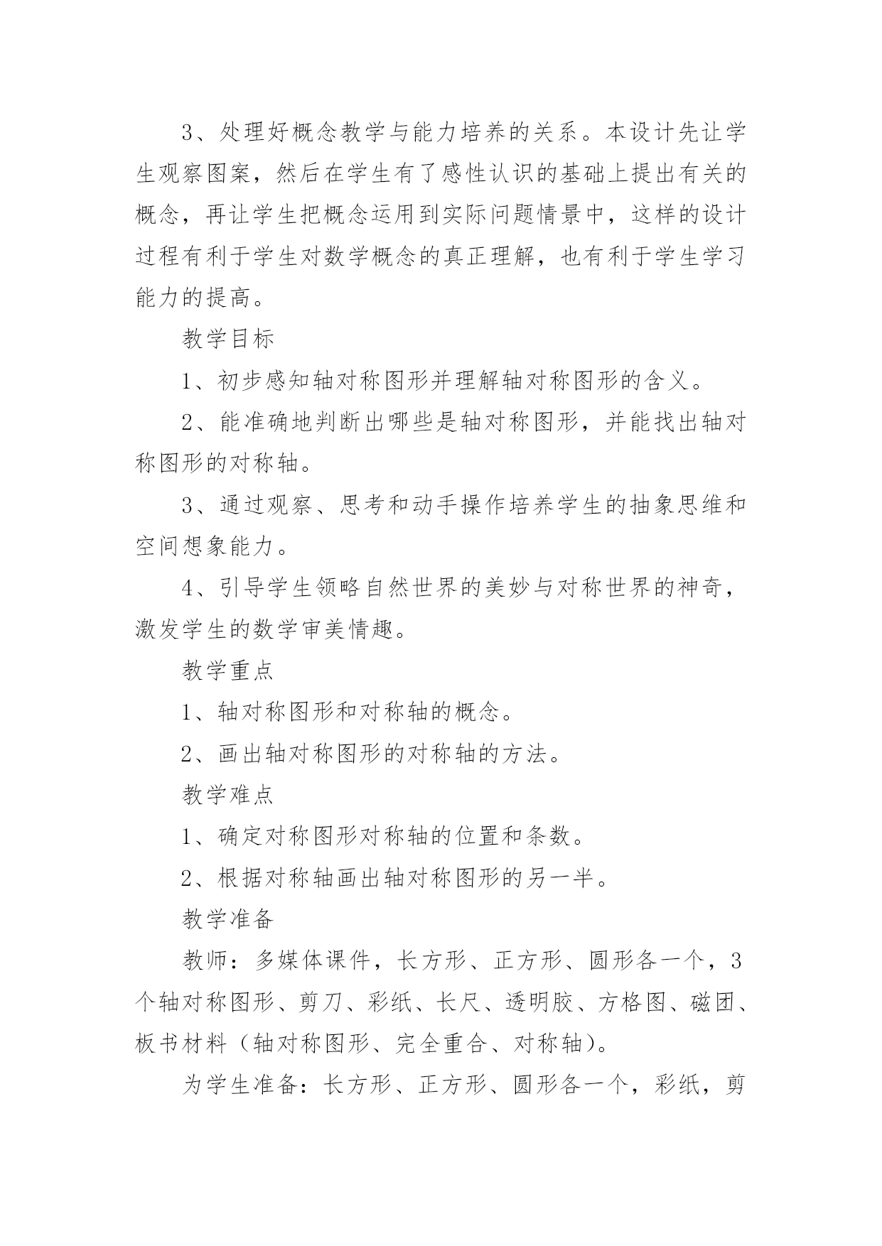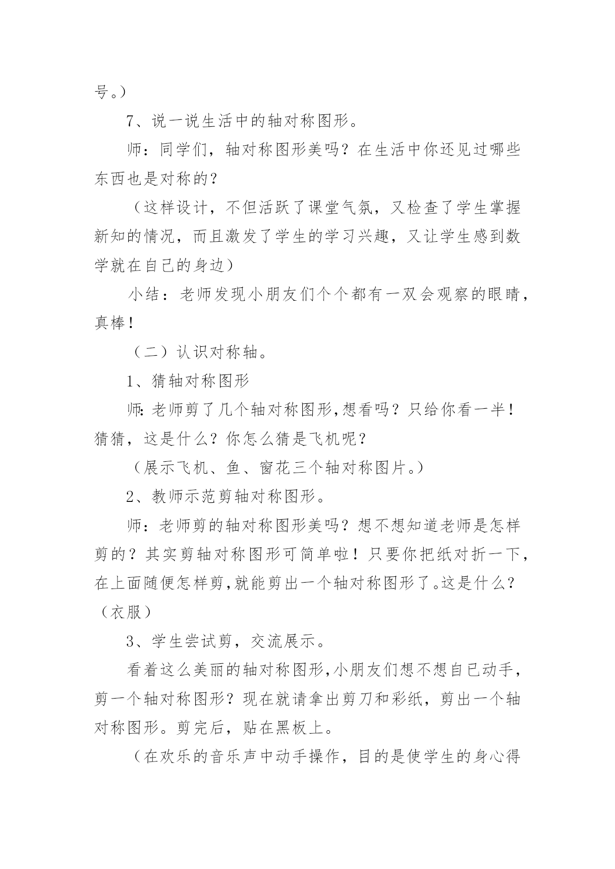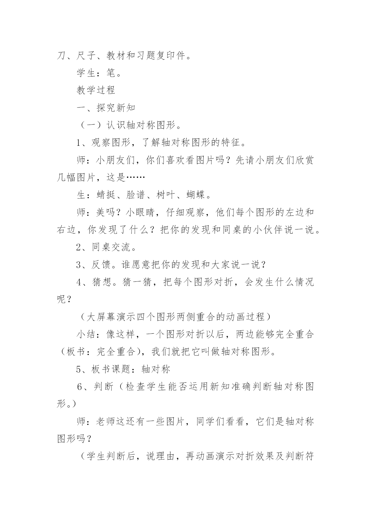 轴对称教学设计作为一无名无私奉献的教育工作者,往往需要进行教学设计编写工作,借助教学设计可以提高教学效率和教学质量。写教学设计需要注意哪些格式呢?以下是小编精心整理的轴对称教学设计,欢迎大家借鉴与参考,希望对大家有所帮助。轴对称教学设计1教材分析:轴对称图形是日常生活中的常见图形,人们装饰、布置生活环境时也经常利用这些图形。通过轴对称图形的学习,学生既可以了解轴对称现象在生活水中的普遍性,又能提高数学欣赏能力与空间想象能力。之前学生已初步了解轴对称,本节课继续认识轴对称图形的特点,判断是否是轴对称图形并能在实际生活中找出轴对称图形的对称轴。教学时,多给学生展示有轴对称图形的图片,使学生从中充分感受对称的意义和图形中的美。课下可以请学生收集轴对称图形的图片,并组织全班进行展示交流活动。多组织“折一折,填一填、画一画”等活动,以增强学生对轴对称图形特点的体验。学情分析:学生在三年级对轴对称图形已经有了初步的认识,但学生对于找对称轴还是有些困难。本节让学生通过折一折、填一填、画一画的形式进一步了解轴对称图形的特点,学会找对称轴。教学目标:1、初步认识轴对称图形的基本特征。帮助学生理解对称轴的含义,能画出轴对称图形的对称轴。2、通过学生动手操作等实践活动,培养学生的观察能力和想象能力。3、在学生的学习活动中,让学生学会欣赏数学之美。教学重点:认识轴对称图形的基本特征,能找出轴对称图形的对称轴。教学难点:能画出轴对称图形的对称轴教学资源:课件、一些轴对称图形图片、纸、长方形、正方形、圆形纸等。整体设计:教学本课利用演示,观察法,动手操作法等,分为“创设情境、提出问题”“合作探究、解决问题”“巩固练习、检测反馈”“合作总结、整理内化”四个环节教学过程:一、创设情境、提出问题。1、老师找到了一些漂亮的图片,同学们想不想一起欣赏一下呢?(课件展示图片)(XX、脸谱艺术、剪纸、昆虫图片)2、引导观察图形,交流汇报刚才同学们看到的这些图形,在日常生活中还有很多很多,那么这些图形中你发现都有什么特征呢?(学生可能说是两边一样的,也可能说是对称的。)师:你是怎么理解对称的?(对称就是左右两边是完全一样的。)二、合作探究、解决问题。1、教学“轴对称图形”(1)、课题导入师:刚才我们看到的其实是生活中的'轴对称图形的现象。(2)我们数学中也有好些轴对称图形。今天老师和大家一起来进一步研究数学上的轴对称图形。(板书课题)a、现在我们把准备好的平面图形拿出来,判断它们是不是轴对称图形。b、学生动手操作,进行判断。c、怎样判断一个图形是否是轴对称图形呢?(3)、结合折纸,进一步认识轴对称图形。师:通过自己动手折,你发现怎样的图形是轴对称图形?引导学生自己说出轴对称图形的含义。2、深化认识,教学对称轴。(1)师:我们发现轴对称图形都有一条折痕,那么这条折痕叫什么呢?生:对称轴师:对,这条折痕就是对称轴,接下来我们就来研究关于对称轴的问题。(课件出示课本内容)(2)折一折:让学生折一折上面轴对称图形,找一找它们有几条对称轴?并画出来。(找出轴对称图形的所有对称轴。)3、让学生展示自己的做法和结果。4、边让学生演示边用课件展示。(设计意图:通过探索不同领域的对称图形,给学生提供提问的机会和时间,让学生独立的继续探索知识,给了学生一个比较充分的思考空间,使学生的思维不受限制和约束。培养学生肯于钻研、善于思考的科学态度,同时也体现了学生是学习的主人。)三、巩固练习、检测反馈。师:我们学习了这么多新知识,你认为自己学的情况如何呢?下面我们就来做几个小测验,看看自己到底学的怎么样。1、0——9这些数字中哪个是轴对称?2、A、B、C、D、E、F、G、H、M、Q这些字母中哪些是轴对称?3、完成课本22页的练习题1、2。四、拓展延伸、实际应用。下面我们就发挥自己的想像,自己亲手来做一个轴对称图形。1.准备一张纸2.对折纸3.展开你的想象力,在纸上画出你想要画的图案4.沿线条撕下5.把纸张开6.向同学们展示你的作品五、总结全课,升华主题。通过这节课的学习,你有什么收获?生活中有很多轴对称图形,例如:XX的设计、车标的设计、飞机、汽艇、汽车的设计等。我们生活中的好多美丽的设计都用到了轴对称,让我们做有心人,去发现我们生活中的轴对称图形。六、作业:设计一个美丽的轴对称图形。板书设计:轴对称再认识轴对称教学设计2设计思想:1、努力体现数学与生活的联系。本设计提供了丰富的图案,涉及建筑、动物、植物、汽车、建筑、数学图形等方面,让学生能感受到数学就在我们身边。同时,学生在这些图案的认识过程中学习新知,应用新知,激发他们学习数学的兴趣。2、致力于学习方法的改变。由于本节课的知识学生已有一定的生活经验和认识基础,因此,本节课可以考虑也应该考虑让学生主动地进行学习、讨论、动手操作、图案设计等方
