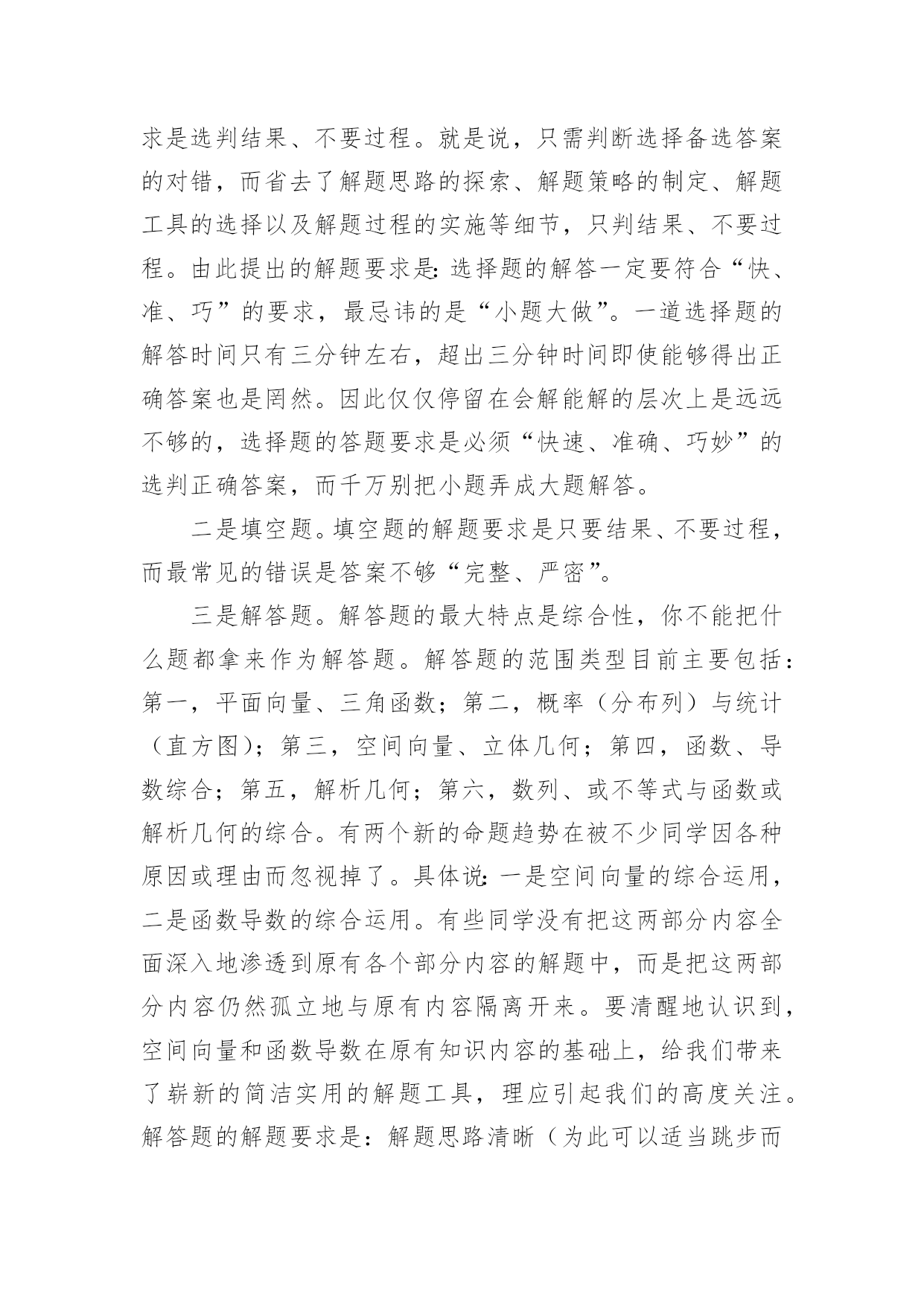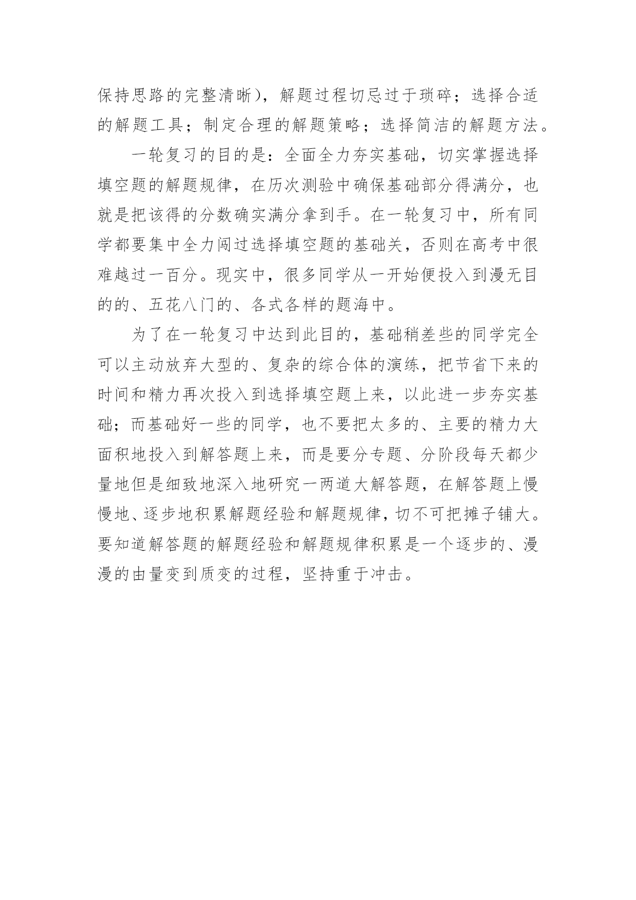 优秀高考数学复习策略优秀高考数学复习策略在高考班上课的时候有很多同学问我高考到底应该怎么复习?怎么样的复习才是科学高效的复习方法?我想这是一个很多考生都普遍关心的问题,那么请问:高考复习的目的是什么?毫无疑问,当然是高考取得高分。这里再次提醒大家注意的是两种常见的糊涂:之一,已经进入复习了,甚至直到高考结束了,仍不清楚高考数学都考什么?那些是重点?其表现就是,一天到晚整天就是做题,考试还是做题,漫无边际地沉醉于题海中,直到考完才意识到自己做了太多太多的无用功。其二不重视课本教材,表现就是在整个高考复习期间从来没有去翻过课本,直到在高考后才发现有很多高考题就源自于课本,于是追悔莫及。那么到底应该怎么做才能达到最好的效果呢?那么在我们进行高考复习之前就必须要对数学高考试题的试卷结构、考点分布、题型分布、命题思路、解题要求、答题策略等等进行全面深入地了解,有针对性地制定有效的复习策略,再分阶段、分层次、分专题逐步实施。首先,无论从历史还是从现实上看,高考命题都具备较高稳定性的特点。因此,我们可以从历届高考试题中分析得出高考命题的许多信息。数学高考的题型有三种:一是选择题。选择题的解题要求是选判结果、不要过程。就是说,只需判断选择备选答案的对错,而省去了解题思路的探索、解题策略的制定、解题工具的选择以及解题过程的实施等细节,只判结果、不要过程。由此提出的解题要求是:选择题的解答一定要符合“快、准、巧”的要求,最忌讳的是“小题大做”。一道选择题的解答时间只有三分钟左右,超出三分钟时间即使能够得出正确答案也是罔然。因此仅仅停留在会解能解的层次上是远远不够的,选择题的答题要求是必须“快速、准确、巧妙”的选判正确答案,而千万别把小题弄成大题解答。二是填空题。填空题的解题要求是只要结果、不要过程,而最常见的错误是答案不够“完整、严密”。三是解答题。解答题的最大特点是综合性,你不能把什么题都拿来作为解答题。解答题的范围类型目前主要包括:第一,平面向量、三角函数;第二,概率(分布列)与统计(直方图);第三,空间向量、立体几何;第四,函数、导数综合;第五,解析几何;第六,数列、或不等式与函数或解析几何的综合。有两个新的命题趋势在被不少同学因各种原因或理由而忽视掉了。具体说:一是空间向量的综合运用,二是函数导数的综合运用。有些同学没有把这两部分内容全面深入地渗透到原有各个部分内容的解题中,而是把这两部分内容仍然孤立地与原有内容隔离开来。要清醒地认识到,空间向量和函数导数在原有知识内容的基础上,给我们带来了崭新的简洁实用的解题工具,理应引起我们的高度关注。解答题的解题要求是:解题思路清晰(为此可以适当跳步而保持思路的完整清晰),解题过程切忌过于琐碎;选择合适的解题工具;制定合理的解题策略;选择简洁的解题方法。一轮复习的目的是:全面全力夯实基础,切实掌握选择填空题的解题规律,在历次测验中确保基础部分得满分,也就是把该得的分数确实满分拿到手。在一轮复习中,所有同学都要集中全力闯过选择填空题的基础关,否则在高考中很难越过一百分。现实中,很多同学从一开始便投入到漫无目的的、五花八门的、各式各样的题海中。为了在一轮复习中达到此目的,基础稍差些的同学完全可以主动放弃大型的、复杂的综合体的演练,把节省下来的时间和精力再次投入到选择填空题上来,以此进一步夯实基础;而基础好一些的同学,也不要把太多的、主要的精力大面积地投入到解答题上来,而是要分专题、分阶段每天都少量地但是细致地深入地研究一两道大解答题,在解答题上慢慢地、逐步地积累解题经验和解题规律,切不可把摊子铺大。要知道解答题的解题经验和解题规律积累是一个逐步的、漫漫的由量变到质变的过程,坚持重于冲击。