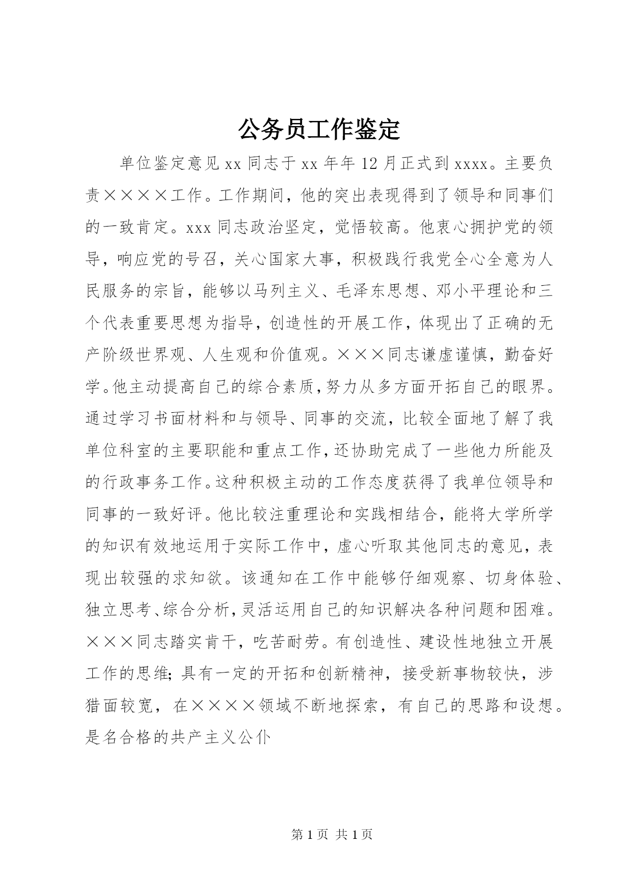 第PAGE\*Arabic\*MERGEFORMAT1页共NUMPAGES\*MERGEFORMAT1页公务员工作鉴定单位鉴定意见xx同志于xx年年12月正式到xxxx。主要负责××××工作。工作期间,他的突出表现得到了领导和同事们的一致肯定。xxx同志政治坚定,觉悟较高。他衷心拥护党的领导,响应党的号召,关心国家大事,积极践行我党全心全意为人民服务的宗旨,能够以马列主义、毛泽东思想、邓小平理论和三个代表重要思想为指导,创造性的开展工作,体现出了正确的无产阶级世界观、人生观和价值观。×××同志谦虚谨慎,勤奋好学。他主动提高自己的综合素质,努力从多方面开拓自己的眼界。通过学习书面材料和与领导、同事的交流,比较全面地了解了我单位科室的主要职能和重点工作,还协助完成了一些他力所能及的行政事务工作。这种积极主动的工作态度获得了我单位领导和同事的一致好评。他比较注重理论和实践相结合,能将大学所学的知识有效地运用于实际工作中,虚心听取其他同志的意见,表现出较强的求知欲。该通知在工作中能够仔细观察、切身体验、独立思考、综合分析,灵活运用自己的知识解决各种问题和困难。×××同志踏实肯干,吃苦耐劳。有创造性、建设性地独立开展工作的思维;具有一定的开拓和创新精神,接受新事物较快,涉猎面较宽,在××××领域不断地探索,有自己的思路和设想。是名合格的共产主义公仆