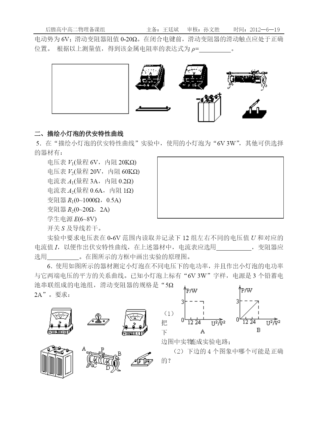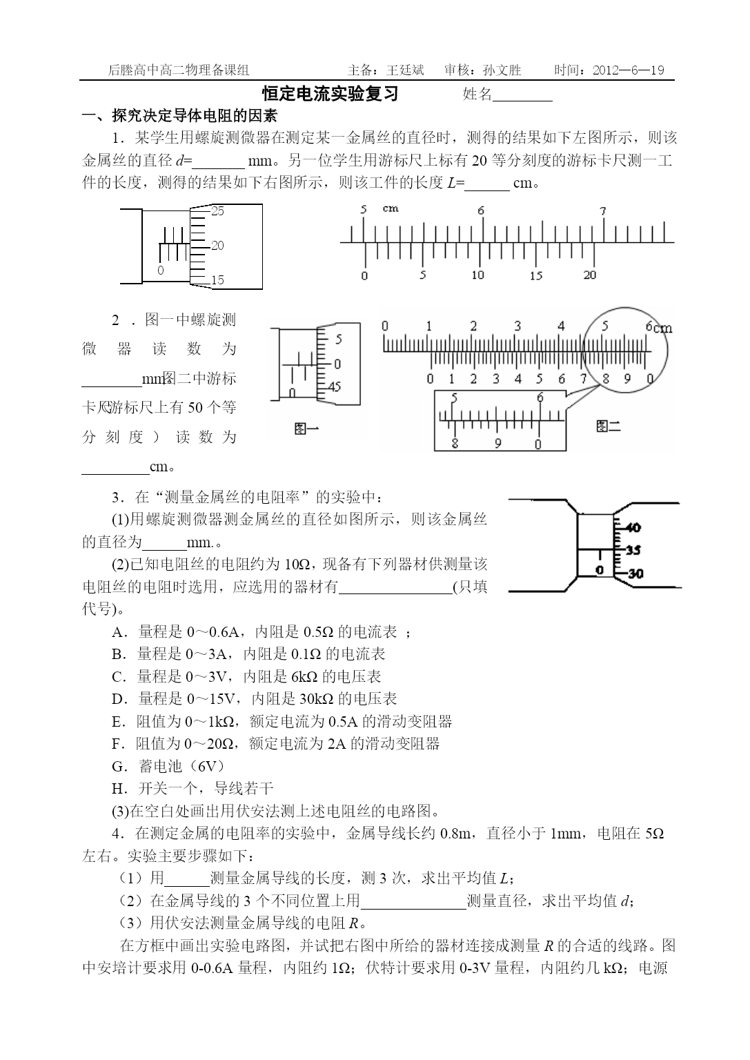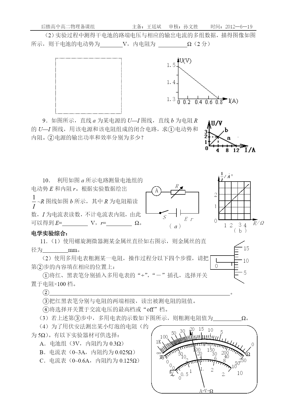 后塍高中高二物理备课组主备:王廷斌审核:孙文胜时间:2012—6—19恒定电流实验复习姓名探究决定导体电阻的因素02520151.某学生用螺旋测微器在测定某一金属丝的直径时,测得的结果如下左图所示,则该金属丝的直径d=_______mm。另一位学生用游标尺上标有20等分刻度的游标卡尺测一工件的长度,测得的结果如下右图所示,则该工件的长度L=______cm。2.图一中螺旋测微器读数为________mm。图二中游标卡尺(游标尺上有50个等分刻度)读数为_________cm。3.在“测量金属丝的电阻率”的实验中:(1)用螺旋测微器测金属丝的直径如图所示,则该金属丝的直径为______mm.。(2)已知电阻丝的电阻约为10Ω,现备有下列器材供测量该电阻丝的电阻时选用,应选用的器材有(只填代号)。A.量程是0~0.6A,内阻是0.5Ω的电流表;B.量程是0~3A,内阻是0.1Ω的电流表C.量程是0~3V,内阻是6kΩ的电压表D.量程是0~15V,内阻是30kΩ的电压表E.阻值为0~1kΩ,额定电流为0.5A的滑动变阻器F.阻值为0~20Ω,额定电流为2A的滑动变阻器G.蓄电池(6V)H.开关一个,导线若干(3)在空白处画出用伏安法测上述电阻丝的电路图。4.在测定金属的电阻率的实验中,金属导线长约0.8m,直径小于1mm,电阻在5Ω左右。实验主要步骤如下:(1)用______测量金属导线的长度,测3次,求出平均值L;(2)在金属导线的3个不同位置上用______________测量直径,求出平均值d;(3)用伏安法测量金属导线的电阻R。在方框中画出实验电路图,并试把右图中所给的器材连接成测量R的合适的线路。图中安培计要求用0-0.6A量程,内阻约1Ω;伏特计要求用0-3V量程,内阻约几kΩ;电源电动势为6V;滑动变阻器阻值0-20Ω。在闭合电键前,滑动变阻器的滑动触点应处于正确位置。根据以上测量值,得到该金属电阻率的表达式为ρ=__________。描绘小灯泡的伏安特性曲线5.在“描绘小灯泡的伏安特性曲线”实验中,使用的小灯泡为“6V3W”,其他可供选择的器材有:电压表V1(量程6V,内阻20KΩ)电压表V2(量程20V,内阻60KΩ)电流表A1(量程3A,内阻0.2Ω)电流表A2(量程0.6A,内阻1Ω)变阻器R1(0~1000Ω,0.5A)变阻器R2(0~20Ω,2A)学生电源E(6~8V)开关S及导线若干。实验中要求电压表在0-6V范围内读取并记录下12组左右不同的电压值U和对应的电流值I,以便作出伏安特性曲线,在上述器材中,电流表应选用,变阻器应选用。在图所示的方框中画出实验的原理图。6.使用如图所示的器材测定小灯泡在不同电压下的电功率,并且作出小灯泡的电功率与它两端电压的平方的关系曲线。已知小灯泡上标有“6V3W”字样,电源是3个铅蓄电池串联组成的电池组,滑动变阻器的规格是“5Ω2A”。要求:(1)把下边图中实物连成实验电路;(2)下边的4个图象中哪个可能是正确的?7.小灯泡灯丝的电阻会随温度的升高而变大.某同学为研究这一现象,用实验得到如下数据(I和U分别表示小灯泡上的电流和电压):I(A)0.120.210.290.340.380.420.450.470.490.50U(V)0.200.400.600.801.001.201.401.601.802.00(1)画出实验电路图。可用的器材有:电压表、电流表、滑线变阻器(变化范围0—10Ω)、电源、小灯泡、电键、导线若干。(2)在右上图中画出小灯泡的U—I曲线。(3)如果某一电池的电动势是1.5V,内阻是2.0Ω。问:将本题中的灯泡接在该电池两端,小灯泡的实际功率是多少?(简要写出求解过程;若需作图,可直接画在第(2)小题的方格图中)测量电源的电动势和内阻8.在《测定干电池的电动势和电阻》的实验中,实验器材有被测干电池、电流表(0~0.6A,0.1Ω)、电压表(0~3V,3KΩ)、电键、滑动变阻器(0~20Ω)、导线等。(1)在左面方框中画出优选的实验电线图。(2)实验过程中测得干电池的路端电压与相应的输出电流的多组数据,描得图像如图所示,则干电池的电动势为________V,内电阻为__________Ω(2分)1.51.41.31.21.19.如图所示,直线a为某电源的U—I图线,直线b为电阻R的U—I图线,用该电源和该电阻组成的闭合电路,求①电动势和内阻。②电源的输出功率和效率分别为多少?AErSR(a)0124R/Ω(b)31210.利用如图a