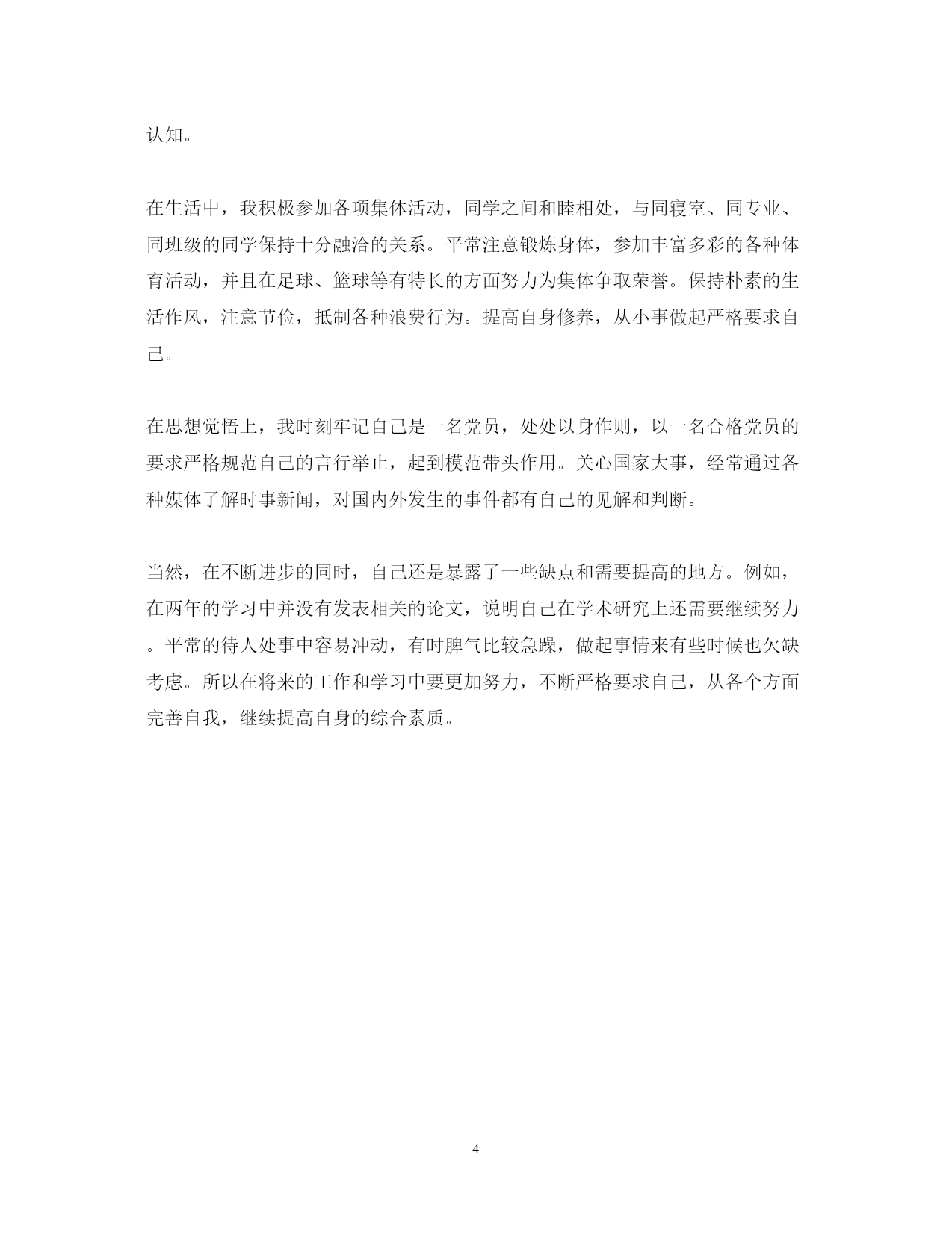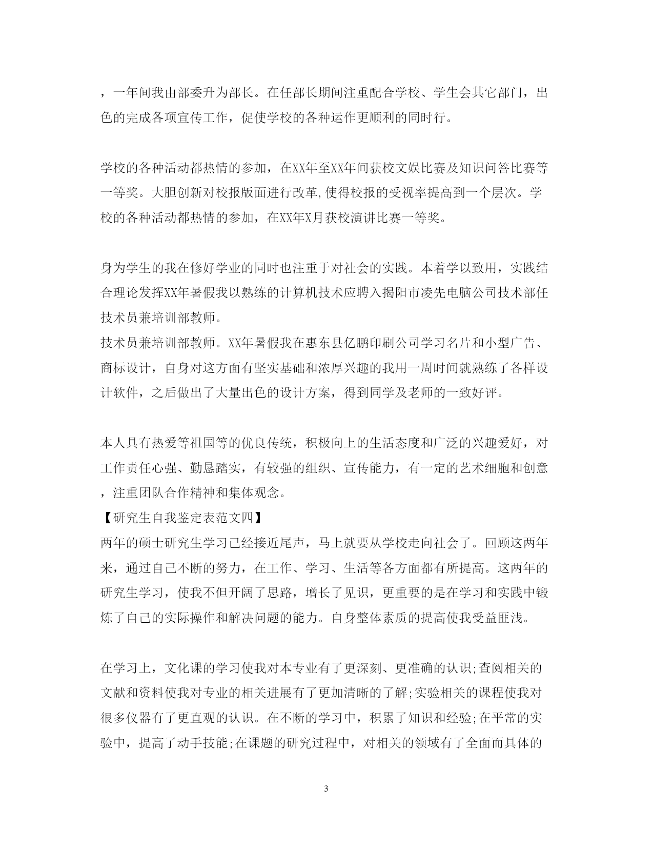 此资料由网络收集而来,如有侵权请告知上传者立即删除。资料共分享,我们负责传递知识。PAGEPAGE4最新研究生自我鉴定表范文自我鉴定时自己在学习、工作中的过程、成效进行评定。下面由小编为大家收集的4篇研究生自我鉴定表范文,仅供大家参考!【研究生自我鉴定表范文一】从本科毕业到走入研究生的教室,再由研究生的教育中走进社会,虽然短短几年,却是我人生中最大的财富,它将伴随着我的一生,渲染着我的思想,引导给我方向,传递给我力量。在进入研究生学习之前,我就暗自下定决心,要把握住任何机会锻炼自己,多积累实践经验和教训。思想上,我在本科期间已经成为了正式党员,于是在研究生学习期间不断帮助其他同学入党,无论是学习“三个代表”活动,还是党支部组织的趣味运动会,我都积极参与,争取为班争光,起表率带头作用。学习上,在LCF导师的教导下,深入研究了石家庄市科技局的基金项目——石家庄市企业自主创新能力建设研究,通过各位老师的帮助和自己的努力,项目进行有条不紊,指标设计有效,提出的对策建议切实可行。在此期间,我的学术研究水平得到了提高,经济学和管理学知识十分融洽地结合,达到了提高自我素质、深入社会实践的目的。在今后的社会生活中,会面临更大的挑战和机遇,我已经做好了准备,迎头而上。我会继续学习,不断进取,勇于开拓,直视困难,校正缺点,实现更高的社会价值。【研究生自我鉴定表范文二】本人在硕士研究生学习阶段,注重政治理论学习,关心国家大事,认真学习”三个代表”重要思想和党的创新理论,拥护党的路线方针政策,自觉以科学发展观来认识世界和社会,时刻牢记担负的社会责任,时时以共产党员的先进性标准来要求自己、事事力争做到模范带头。在专业课程学习上,根据研究方向的要求,认真学习了通信领域的核心课程,所选课程全部达到国家要求。在科研实践中,广泛阅读有关博士、硕士论文和大量的外文文献,开阔视野的同时,对本人研究方向的应用背景以及整个学科的结构有了宏观的认识。勤恳踏实,注重团队合作精神和集体观念,实践动手能力比较强,参与了导师多项课题的研究,使自己的理论知识与实践水平得到了进一步的增强和提高,同时顺利完成了硕士毕业论文。在平时生活中,为人处世和善热情,和同学关系融洽;积极参与班级各项集体活动,热情为同学们服务。在研究生阶段,从学业、科研工作,到个人素质,都得到了充分的培养和锻炼,是充实且有意义的两年。相信这些经历和积累都将成为本人人生道路上的宝贵财富。在以后的工作和学习中,本人将继续保持并发扬严谨治学的作风,兢兢业业,争取取得更大的成绩。【研究生自我鉴定表范文三】三年的大学校园生活是我人生的一大转折点。我于XX年9月以优异的成绩考入XX大学。四年的校园生涯和社会实践生活我不断的挑战自我、充实自己,为实现人生的价值打下坚实的基础。一直都认为人应该是活到老学到老的我对知识、对本专业一丝不苟,因而在成绩上一直都得到肯定,每学年都获得三等奖学金。在不满足于学好理论课的同时也注重于对各种应用软件和硬件的研究。因此在第四学期开始就被老师信任为计算机房的负责人。有广泛爱好的我特别擅长于排版及网页美工和多媒体的制作,就任本班组织委员的同时也加入了校学生会宣传部。对工作热情、任劳任怨,和部内成员团结一致,一年间我由部委升为部长。在任部长期间注重配合学校、学生会其它部门,出色的完成各项宣传工作,促使学校的各种运作更顺利的同时行。学校的各种活动都热情的参加,在XX年至XX年间获校文娱比赛及知识问答比赛等一等奖。大胆创新对校报版面进行改革,使得校报的受视率提高到一个层次。学校的各种活动都热情的参加,在XX年X月获校演讲比赛一等奖。身为学生的我在修好学业的同时也注重于对社会的实践。本着学以致用,实践结合理论发挥XX年暑假我以熟练的计算机技术应聘入揭阳市凌先电脑公司技术部任技术员兼培训部教师。技术员兼培训部教师。XX年暑假我在惠东县亿鹏印刷公司学习名片和小型广告、商标设计,自身对这方面有坚实基础和浓厚兴趣的我用一周时间就熟练了各样设计软件,之后做出了大量出色的设计方案,得到同学及老师的一致好评。本人具有热爱等祖国等的优良传统,积极向上的生活态度和广泛的兴趣爱好,对工作责任心强、勤恳踏实,有较强的组织、宣传能力,有一定的艺术细胞和创意,注重团队合作精神和集体观念。【研究生自我鉴定表范文四】两年的硕士研究生学习已经接近尾声,马上就要从学校走向社会了。回顾这两年来,通过自己不断的努力,在工作、学习、生活等各方面都有所提高。这两年的研究生学习,使我不但开阔了思路,增长了见识,更重要的是在学习和实践中锻炼了自己的实际操作和解决问题的能力。自身整体素质的提高使我受益匪浅。在学习上,文化课的学习使我对本专业有了更深刻、更准确的认识;查阅相关的文献和资料使我对专业的相关