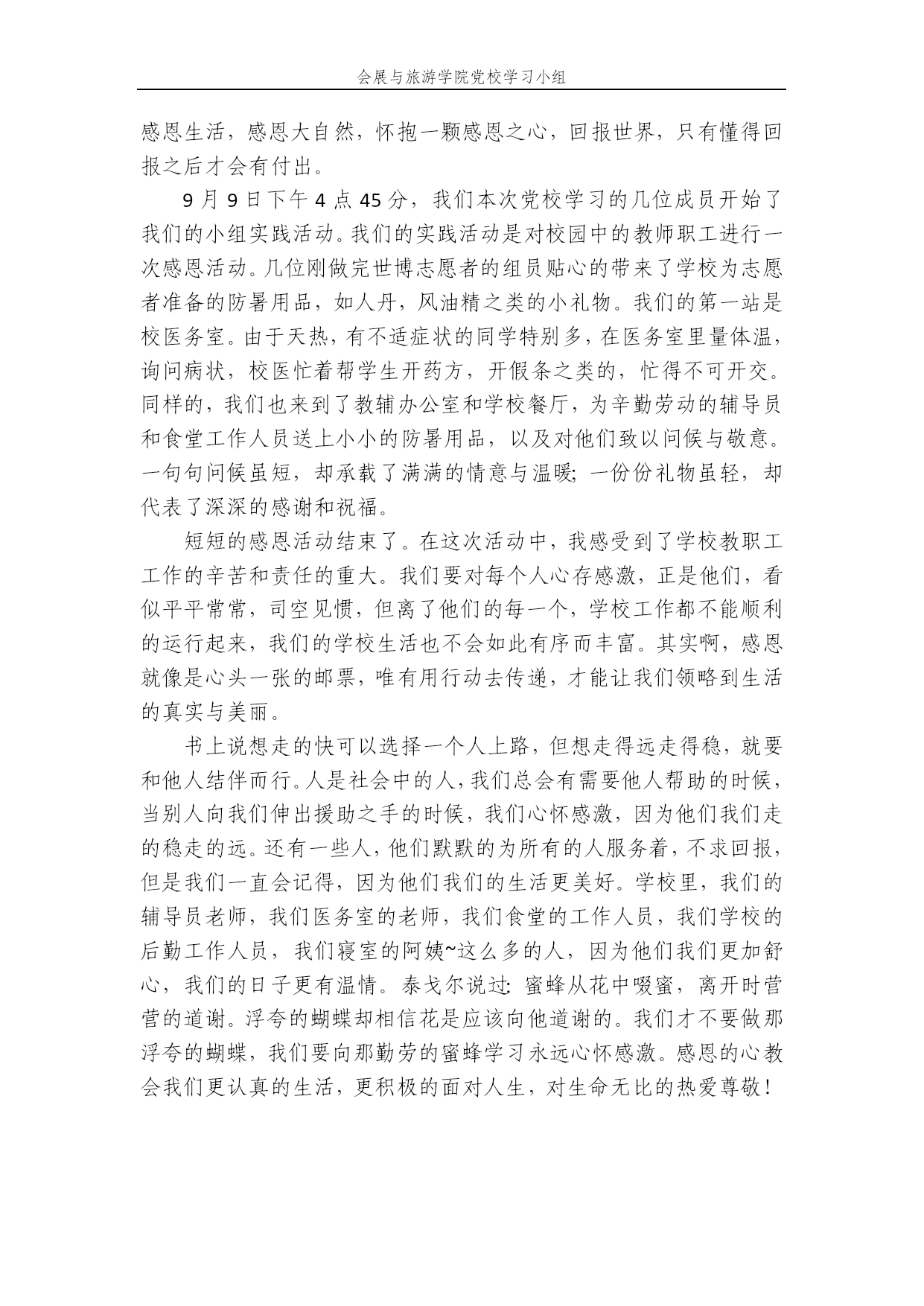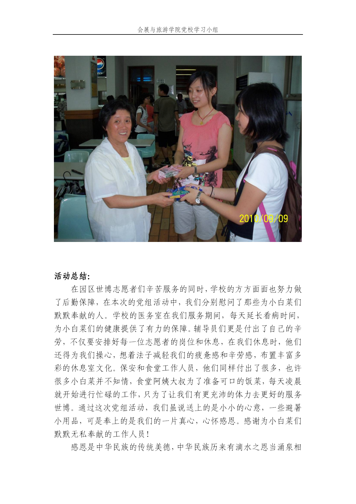 会展与旅游学院党校学习小组会展与旅游学院党课学习小组特色实践活动报告活动主题:世博会志愿者——感恩行动活动时间:2010年9月9日活动地点:学校医务室,学校保安室,学校食堂,辅导员办公室活动参与者:会展与旅游学院党课学习小组全体成员活动目的:在过完精彩丰富的两周世博志愿者生活后,我们回到熟悉的校园,回顾两周内学校各个机构给予我们志愿者的帮助和支持,每天清晨吃着食堂阿姨从凌晨开始准备的早餐、看到整整两个星期不能回家都只能睡在大巴上的司机叔叔、看到大巴开出校园时保安哥哥简洁有力的敬礼、有时我们的身体承受不住太阳的炙烤,有些白菜生病了后,看到的是医务室的医生阿姨每天加班、辅导员老师也提前结束了假期,8月10号就回到了学校,每天都是培训和繁杂的准备工作……而我们在做完志愿者后,我们需要的是感恩,感谢各个后勤部门和老师、同学为我们白菜所搭建的稳固后盾,我们只想对他们说一声“谢谢!”活动计划:1.所有组员交流结束世博会志愿者的感想和认识,分别介绍自己在做志愿者之中所遇到的事情和从做志愿者中的所得。由小组长对此次特色实践活动作简要介绍,让大家说说自己最想感谢的人,创造感恩的气氛,并由此引出对感恩活动的思考,引领大家投入其中。2.学校的医务室,送上感恩的礼品,与医务室老师交流志愿者经历。3.会展与旅游学院辅导员办公室,送上教师节的祝福和感恩的礼物,并与老师交流志愿者经历。4.给正在执勤的保安叔叔送上水和含片,感谢他们在我们志愿者服务期间给我们的支持和帮助。5.前往学校第一食堂,感谢食堂的阿姨和叔叔,并将慰问品赠送给食堂负责阿姨,感激他们在世博志愿者期间辛苦为我们准备早饭。6.最后,在身边的世博会志愿者中,随即选取一些同学做问卷,并统计问卷每个问题的百分比,并分析其中的原因。力争做到取长补短,为下次活动更好的开展积累宝贵的经验。活动预期效果:1.通过此次活动使学员们更加开始关注感恩活动,并以此为契机,引导每一位我小组同学进一步了解感恩的重要性,努力打造一支优秀的学习性队伍。2.通过对于感恩的理解、思考与践行,希望表现得不仅是大家对类似志愿者活动这样的政治活动的关心,更希望体现的是作为当代党员对身边细小问题的思考能力及思维深度。3.通过感恩的活动,抒发内心中的声音,增强小组凝聚力,有助于更进一步促进小组内的感想交流与探讨。活动总结:1.活动指导思想以邓小平理论和“三个代表”重要思想为指导,深入学习实践科学发展观,坚持社会主义核心价值观,继承党的优秀传统文化,弘扬现代先进思想理念,树立马克思主义的世界观、人生观、价值观,增强党性意识、国家意识、集体意识、宗旨意识、责任意识和奉献意识,深入开展党课学员感恩教育系列活动,在全组形成“知恩、感恩、报恩”的浓厚氛围。知恩图报是中华民族的传统文化,是衡量高尚人格的重要标尺,是构建和谐社会的内在动力。通过开展党课小组感恩教育行动,教育引导入党积极分子牢固树立“知恩、感恩、报恩”的意识,即感念培养之恩,增强爱党意识;感念人民之恩,增强服务意识;感念助富之恩,增强回报意识。促进未来的党员树立马克思主义的世界观、人生观、价值观和正确的权力观、利益观、地位观。实现党员绝对听党指挥,始终对党忠诚,随时响应党的号召,坚决拥护、执行党的决定,进一步改进作风,强化责任意识,弘扬务实精神,提高执行能力,抓好工作落实,通过发挥党员先锋模范作用实现为党分忧。2.活动过程大学生党员是一个特殊的群体。在全国党员队伍中,也是一个重要的组成部分。在广大党员中,我们略显年轻,我们不仅仅是党员后加上学生,或学生后加上党员那么简单。那么作为大学生党员该是什么样子的呢?大学生党员该起什么样的先锋模范作用呢?我们明白大学生党员先进性不只是一种思想境界,更是在实践中的奉献行为,保持党员的先进性,更需要的是一种精神的延续。在做完志愿者后,我们学习小组能感受到基层党组织和学校各级机构对于我们的关心和帮助的,更重要的是也让我们学会了感恩,所以我们要通过这次在学校内的走访做到感恩,不忘感恩。那么下面我就将我们小组的特色实践活动分为两个部分来总结:第一部分:小组成员分别以问卷的形式,采访身边的世博会志愿者,记录下他们的感想,并让他们说出在结束志愿者的日子后,自己的所得和自己最想感谢的人。最后小组进行汇总,并绘制成图表,加以分析。我们从中收录了以下几段感想:1.在结束短短两周的世博志愿者工作后,让我感受到作为志愿者的价值和快乐远远超过了身体的疲惫和劳累。我为有机会作为一名小白菜迎接来自五湖四海的游客服务于世博而感到自豪。志愿者的生活会一生难忘。相信在踏入社会,走上工作岗位之后,这段世博小白菜的经历会一直留存在记忆中。2.没有体会到小白菜的快乐与辛苦,但是同样作为志愿者,在我服务的时间里,也有