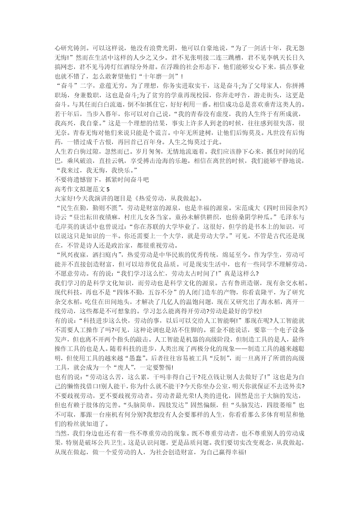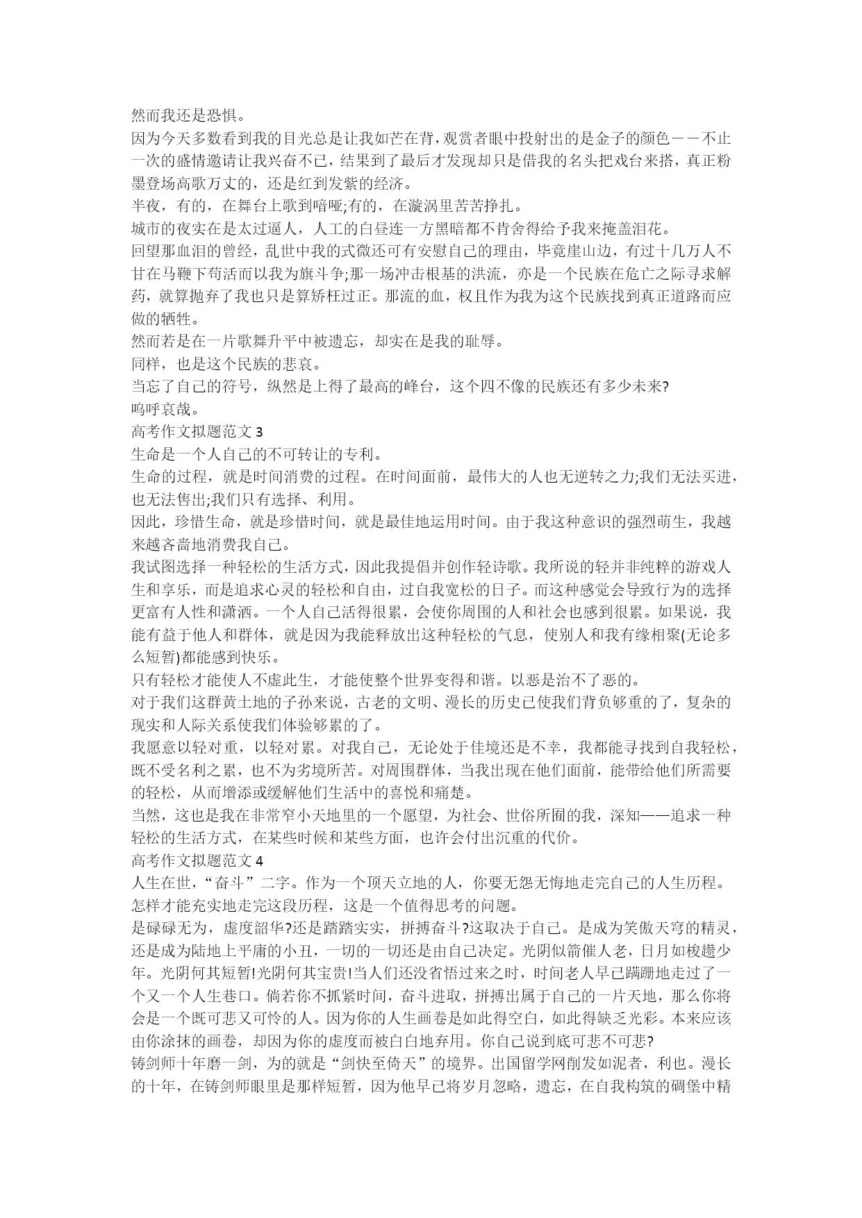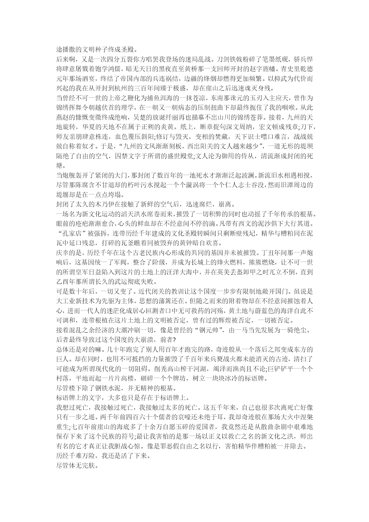 高考作文拟题范文提升语文素养课堂教学做主语文学习是一种终身学习,语文素养的提升也贯穿着每个人的一生,那么对于中学生来说,提升语文素养的途径是什么?下面是xx给大家带来的高考作文拟题范文,欢迎大家阅读参考,我们一起来看看吧!高考作文拟题范文1亲爱的同学们:大家好!今天,我要演讲的主题是“用劳动创造幸福”,在我们现实生活中,有些同学不理解劳动,不愿意劳动,有人说学习太忙了,劳动占时间。有人说科技进步,劳动可以交给人工智能。或者说劳动很苦很累,让别人去做好了。我觉得这样的想法是不尊重劳动的表现,在此,我倡议大家“热爱劳动,从我做起”,用自己的劳动创造幸福。同学们,热爱劳动是我们是我们中华民族的优秀传统。小时候我们从唐朝诗人李绅的《悯农》“锄禾日当午,汗滴禾下土”了解到劳动的不易。王维在《宿郑州》中云:“田父草际归,村童雨中牧。”细雨蒙蒙中,老农归来,村童放牧。老农播下种子,种下希望。姚鼐的《山行》:“布谷飞飞劝早耕,春锄扑扑趁初晴。”布谷和白鹭都在来回奔忙,一幅繁忙热闹的春耕图,从古诗词中,我们也看到,劳动的画面是充满生机的,是美的。确实,就像有同学说的,劳动很累,为什么不花钱让别人做呢?在地里耕种的农民,每天都是日出而作日落而息,几乎没有休息的时间;工地的工人,浇灌钢筋混淋土,打桩砌墙,无论风吹还是雨淋,也是日日无休;马路上的环卫工人,在三伏天热浪袭来时,在寒冬皑皑白雪一路三滑的马路上都有他们的身影........劳动很累,但是有一些岗位总是需要人坚守,总是需要有人付出,每个人都选择安逸,如何推动社会的发展,如何推动国家的进步?同学们,让我们用我们的劳动,去创造属于我们的幸福。幸福就只是生活安逸吗?幸福就只是在觥筹交错之间,只是满足口腹之欲吗?不是的,辛苦劳动过后,为别人创造幸福,会为自己带来更长久的幸福感,抗震救灾的志愿军战士,昼夜不停,用自己的双手,用自己的血肉之躯,为灾区人民筑起安全的屏障。他们的劳动是有意义的,用自己的劳动换得了他人的幸福,自己也会有更深刻的幸福感。同学们,也许你们会说,我只是一个在校的学生,我们还不能感受到陶渊明的“晨兴理荒秽,带月荷锄归”的境界,还没办法用自己的劳动为他人创造幸福。同学们,可以的,我建议大家从身边做起。在学校我们用自己的劳动搞好教室、学校的卫生,给大家一个温馨干净的学习环境,在家里,帮父母做一些力所能及的家务。热爱劳动,体现在我们生活的点点滴滴,做好生活的小事,也能给身边的人,给自己带来幸福感!同学们,我再次倡议大家“热爱劳动,从我做起”。就如我们的校名“复兴中学”,要实现民族复兴的愿景,也需要用劳动来创造。就像诗歌《劳动者》里所说“天下最容易接近的是泥土,以劳动的方式,同这个世界真情对话。”让我们用劳动同这个世界真情对话!劳动是他人,也是自己幸福的源泉,希望大家用劳动创造幸福!谢谢大家高考作文拟题范文2我从远古走来,着褐黄作我衣冠。远去的牧歌声里,满载着诗和酒的旅程。一次出生,应感谢那个孕育了文字的仓颉。从此鸿蒙初辟以来口耳相传的故事有了现实存在的可能。渐渐地刻刀变成了笔与墨,竹简让位于蔡侯的千古发明。名为贞观开元的时代,汉代以降的文人诗酒相伴,魏晋的风雅融合了胡风风采千般,文坛的剑锋沾染了文人的豪气,入喉的酒让人醉酣,自此一道白虹贯日,中有李杜白刘诗词的万丈光焰;四方的夷民纷至沓来,遣唐的使者络绎不绝,经卷文书伴随着丝绸刀剑向外发散,沿途播撒的文明种子终成圣殿。后来啊,又是一次四分五裂你方唱罢我登场的迷局乱战。刀剑铁戟粉碎了笔墨纸砚,骄兵悍将肆意屠戮着饱学鸿儒,暗无天日的黑夜直至黄桥那一支回师开封的赵字旌幡。青史里乾德元年那场酒宴,终结了帝国内部的兵连祸结,边疆的烽烟却燃得更加频繁。以抑武为代价而兴起的我在从开封到杭州的三百年间臻于极盛,却在崖山之后迅速魂灭身残。当曾经不可一世的上帝之鞭化为捕鱼洱海的一抹苍凉,东南那诛元的玉刃入主应天,曾作为锦绣挥舞令朝越伏首的理学,在一朝又一朝病态的压制扭曲下却最终扼住了我的咽喉。从此燕赵的慷慨变徵终成绝响,吴楚的放诞纤丽再也描摹不出山川的锦绣苍莽。接着,九州的天地旋转,华夏的天地不在属于正朔的炎黄。纸上,断章捉句深文周纳,宏文顿成残章;刀下,师友亲朋肆意株连,血色覆压斜阳;修订与毁灭,变相的焚藏,天下识士噤口难言,战战兢兢自称着奴才。于是,“九州的文风渐渐刻板,西出阳关的文人越来越少”,一道无形的堤坝隔绝了自由的空气,囚禁文字于所谓的盛世殿堂;文人沦为御用的侍从,清流渐成封闭的死塘。当炮舰轰开了紧闭的大门,那封闭了数百年的一池死水才渐渐泛起波澜。新流旧水相遇相搅,尽管那陈腐含不甘退却的朽叶污水搅起一个个漩涡将一个个仁人志士吞没,然而旧潭周边的堤堰却是在一点点垮塌。封闭了太久的木乃伊在接触了新鲜的空气后,迅速腐