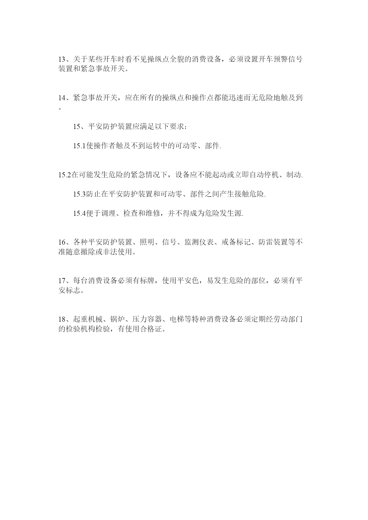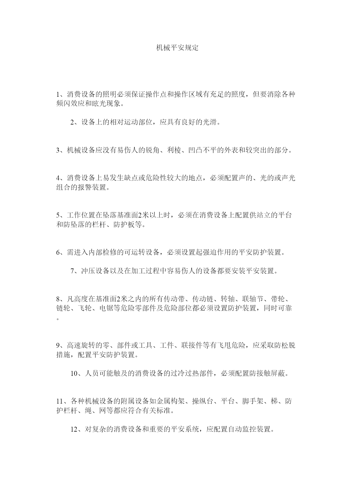 机械平安规定1、消费设备的照明必须保证操作点和操作区域有充足的照度,但要消除各种频闪效应和眩光现象。2、设备上的相对运动部位,应具有良好的光滑。3、机械设备应没有易伤人的锐角、利棱、凹凸不平的外表和较突出的部分。4、消费设备上易发生缺点或危险性较大的地点,必须配置声的、光的或声光组合的报警装置。5、工作位置在坠落基准面2米以上时,必须在消费设备上配置供站立的平台和防坠落的栏杆、防护板等。6、需进入内部检修的可运转设备,必须设置起强迫作用的平安防护装置。7、冲压设备以及在加工过程中容易伤人的设备都要安装平安装置。8、凡高度在基准面2米之内的所有传动带、传动链、转轴、联轴节、带轮、链轮、飞轮、电锯等危险零部件及危险部位都必须设置防护装置,同时可靠。9、高速旋转的零、部件或工具、工件、联接件等有飞甩危险,应采取防松脱措施,配置平安防护装置。10、人员可能触及的消费设备的过冷过热部件,必须配置防接触屏蔽。11、各种机械设备的附属设备如金属构架、操纵台、平台、脚手架、梯、防护栏杆、绳、网等都应符合有关标准。12、对复杂的消费设备和重要的平安系统,应配置自动监控装置。13、关于某些开车时看不见操纵点全貌的消费设备,必须设置开车预警信号装置和紧急事故开关。14、紧急事故开关,应在所有的操纵点和操作点都能迅速而无危险地触及到。15、平安防护装置应满足以下要求:15.1使操作者触及不到运转中的可动零、部件.15.2在可能发生危险的紧急情况下,设备应不能起动或立即自动停机、制动.15.3防止在平安防护装置和可动零、部件之间产生接触危险.15.4便于调理、检查和维修,并不得成为危险发生源.16、各种平安防护装置、照明、信号、监测仪表、戒备标记、防雷装置等不准随意撤除或非法使用。17、每台消费设备必须有标牌,使用平安色,易发生危险的部位,必须有平安标志。18、起重机械、锅炉、压力容器、电梯等特种消费设备必须定期经劳动部门的检验机构检验,有使用合格证。