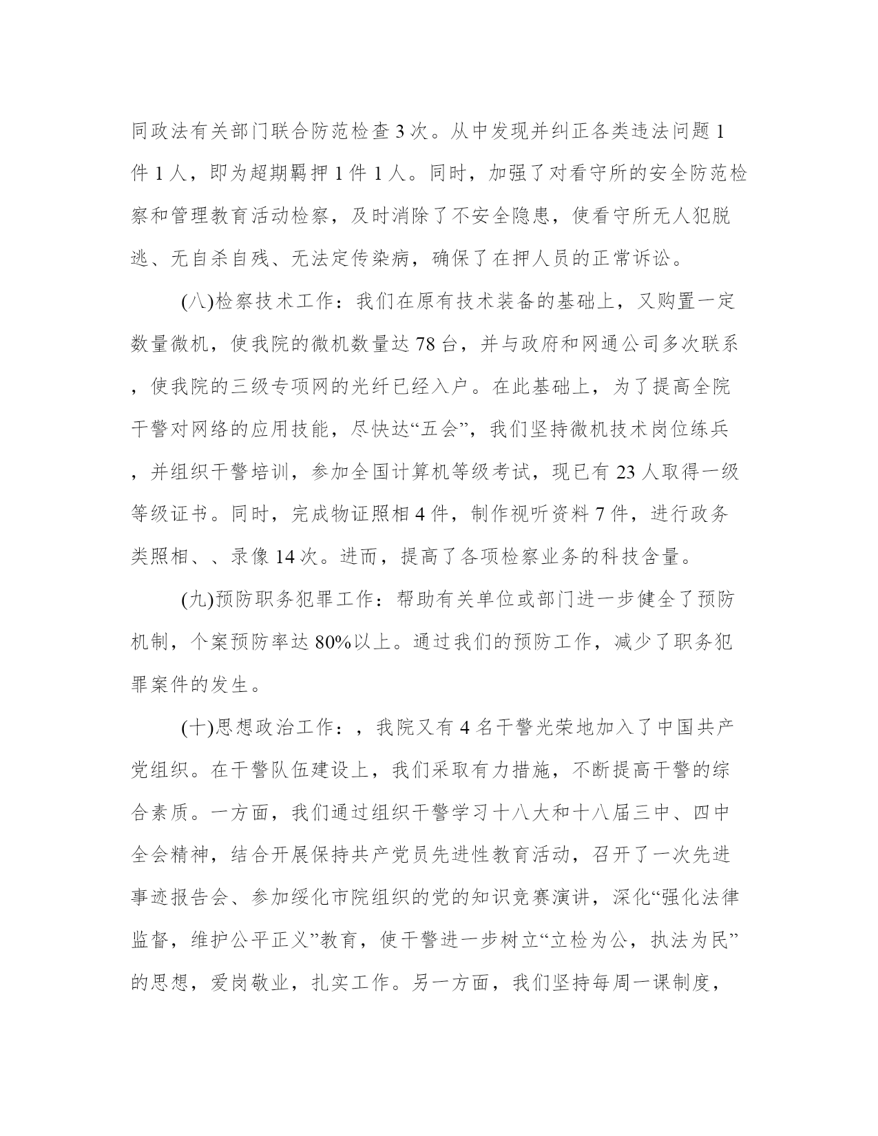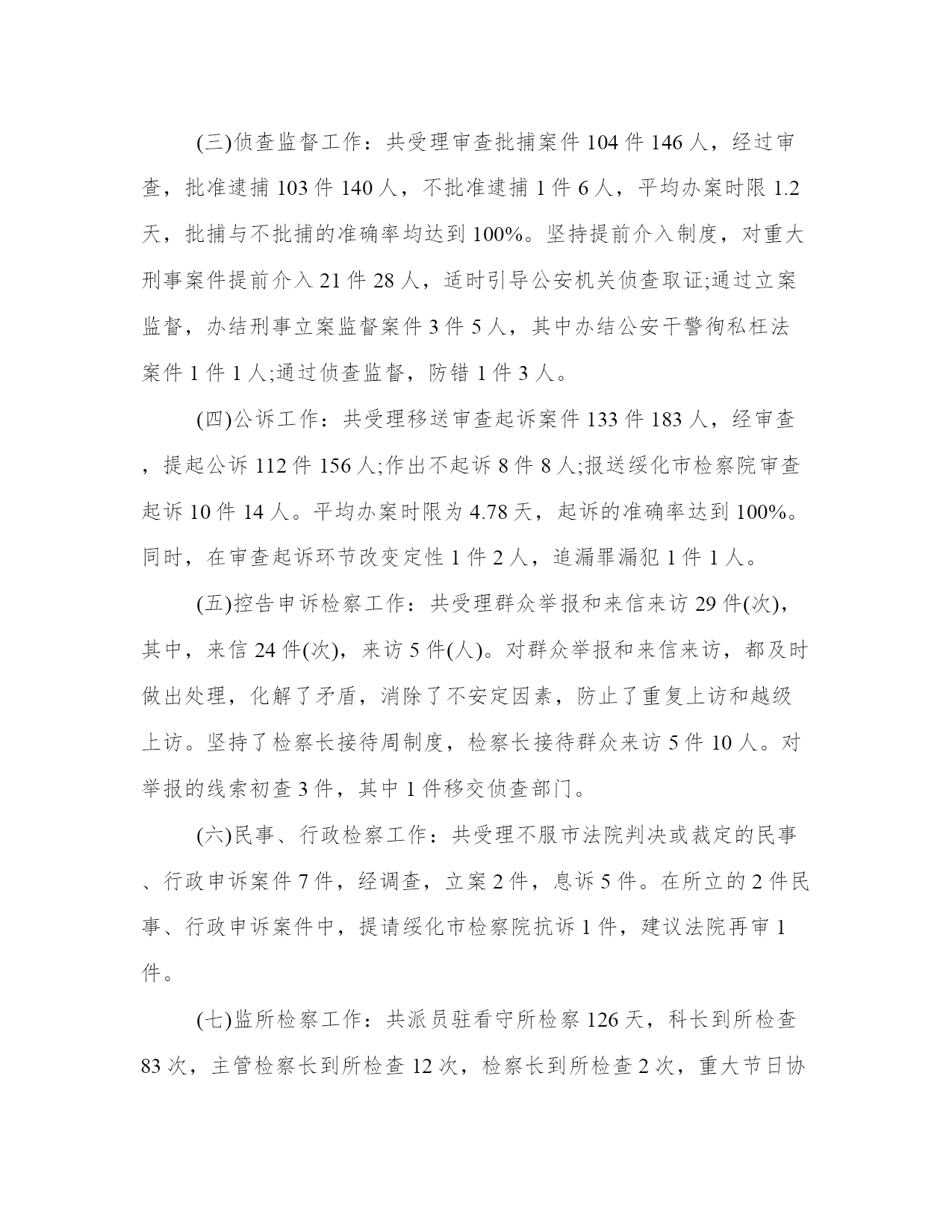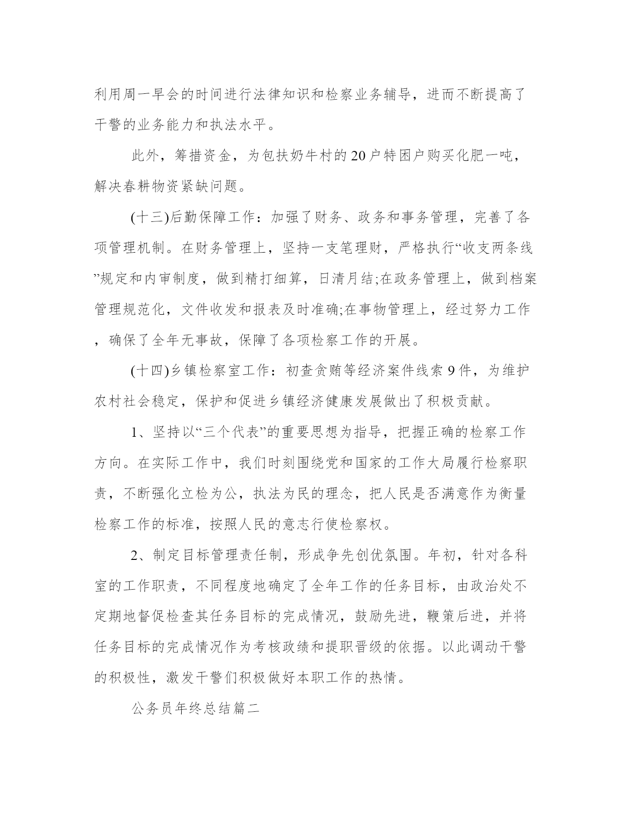 2024年公务员年终总结(优质8篇)总结是指对某一阶段的工作、学习或思想中的经验或情况加以总结和概括的书面材料,它可以明确下一步的工作方向,少走弯路,少犯错误,提高工作效益,因此,让我们写一份总结吧。那么我们该如何写一篇较为完美的总结呢?下面是小编为大家带来的总结书优秀范文,希望大家可以喜欢。公务员年终总结篇一在市委和上级院的正确领导下,在市人大及其常委会的监督下,认真学习贯彻党的十八大和十八届三中、四中全会精神,按照“三个代表”的要求,坚持立检为公,执法为民的思想,突出“强化法律监督,维护公平正义”的主题,紧紧围绕发展、稳定的工作大局,认真履行检察职责,经过全院干警的共同努力,较圆满地完成了市委和上级院交给的各项工作任务。(一)反贪污贿赂检察工作:上半年共受理各类贪污贿赂等经济案件线索8件12人,经过初查立案8件12人,其中大案2件6人。在所立案件中,贪贿案4件4人,占立案数的50%。已结案6件10人。通过办案,为国家挽回直接经济损失1000余万元。(二)渎职侵权检察工作:共初查渎职侵权案件1件,立案1件1人,依法查处公安干警徇私枉法案件。(三)侦查监督工作:共受理审查批捕案件104件146人,经过审查,批准逮捕103件140人,不批准逮捕1件6人,平均办案时限1.2天,批捕与不批捕的准确率均达到100%。坚持提前介入制度,对重大刑事案件提前介入21件28人,适时引导公安机关侦查取证;通过立案监督,办结刑事立案监督案件3件5人,其中办结公安干警徇私枉法案件1件1人;通过侦查监督,防错1件3人。(四)公诉工作:共受理移送审查起诉案件133件183人,经审查,提起公诉112件156人;作出不起诉8件8人;报送绥化市检察院审查起诉10件14人。平均办案时限为4.78天,起诉的准确率达到100%。同时,在审查起诉环节改变定性1件2人,追漏罪漏犯1件1人。(五)控告申诉检察工作:共受理群众举报和来信来访29件(次),其中,来信24件(次),来访5件(人)。对群众举报和来信来访,都及时做出处理,化解了矛盾,消除了不安定因素,防止了重复上访和越级上访。坚持了检察长接待周制度,检察长接待群众来访5件10人。对举报的线索初查3件,其中1件移交侦查部门。(六)民事、行政检察工作:共受理不服市法院判决或裁定的民事、行政申诉案件7件,经调查,立案2件,息诉5件。在所立的2件民事、行政申诉案件中,提请绥化市检察院抗诉1件,建议法院再审1件。(七)监所检察工作:共派员驻看守所检察126天,科长到所检查83次,主管检察长到所检查12次,检察长到所检查2次,重大节日协同政法有关部门联合防范检查3次。从中发现并纠正各类违法问题1件1人,即为超期羁押1件1人。同时,加强了对看守所的安全防范检察和管理教育活动检察,及时消除了不安全隐患,使看守所无人犯脱逃、无自杀自残、无法定传染病,确保了在押人员的正常诉讼。(八)检察技术工作:我们在原有技术装备的基础上,又购置一定数量微机,使我院的微机数量达78台,并与政府和网通公司多次联系,使我院的三级专项网的光纤已经入户。在此基础上,为了提高全院干警对网络的应用技能,尽快达“五会”,我们坚持微机技术岗位练兵,并组织干警培训,参加全国计算机等级考试,现已有23人取得一级等级证书。同时,完成物证照相4件,制作视听资料7件,进行政务类照相、、录像14次。进而,提高了各项检察业务的科技含量。(九)预防职务犯罪工作:帮助有关单位或部门进一步健全了预防机制,个案预防率达80%以上。通过我们的预防工作,减少了职务犯罪案件的发生。(十)思想政治工作:,我院又有4名干警光荣地加入了中国共产党组织。在干警队伍建设上,我们采取有力措施,不断提高干警的综合素质。一方面,我们通过组织干警学习十八大和十八届三中、四中全会精神,结合开展保持共产党员先进性教育活动,召开了一次先进事迹报告会、参加绥化市院组织的党的知识竞赛演讲,深化“强化法律监督,维护公平正义”教育,使干警进一步树立“立检为公,执法为民”的思想,爱岗敬业,扎实工作。另一方面,我们坚持每周一课制度,利用周一早会的时间进行法律知识和检察业务辅导,进而不断提高了干警的业务能力和执法水平。此外,筹措资金,为包扶奶牛村的20户特困户购买化肥一吨,解决春耕物资紧缺问题。(十三)后勤保障工作:加强了财务、政务和事务管理,完善了各项管理机制。在财务管理上,坚持一支笔理财,严格执行“收支两条线”规定和内审制度,做到精打细算,日清月结;在政务管理上,做到档案管理规范化,文件收发和报表及时准确;在事物管理上,经过努力工作,确保了全年无事故,保障了各项检察工作的开展。(十四)乡镇检察室工作:初查贪贿等经济案件线索9件,为维护农村社会稳定,保护和促进乡镇经济健康发展做出了积极贡献。