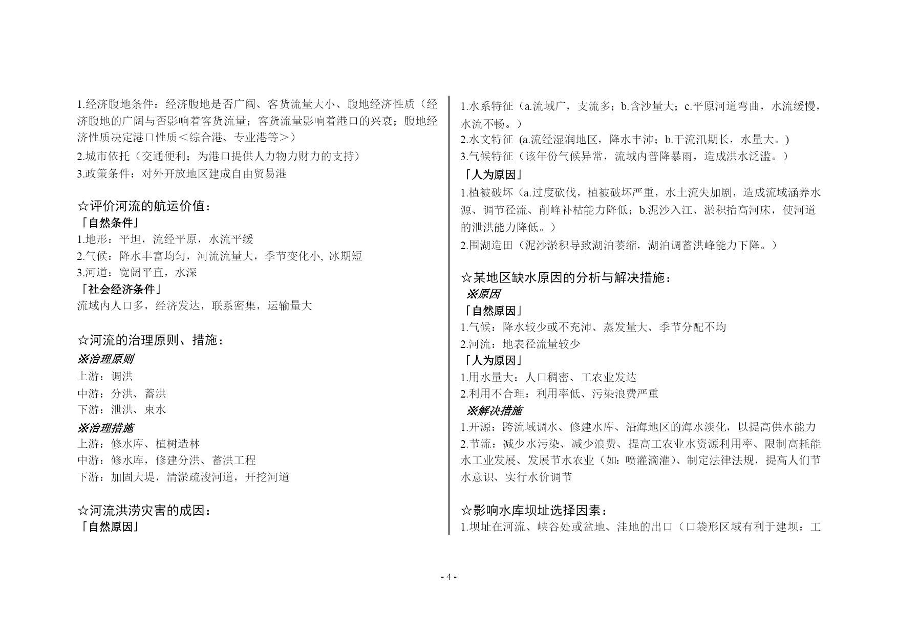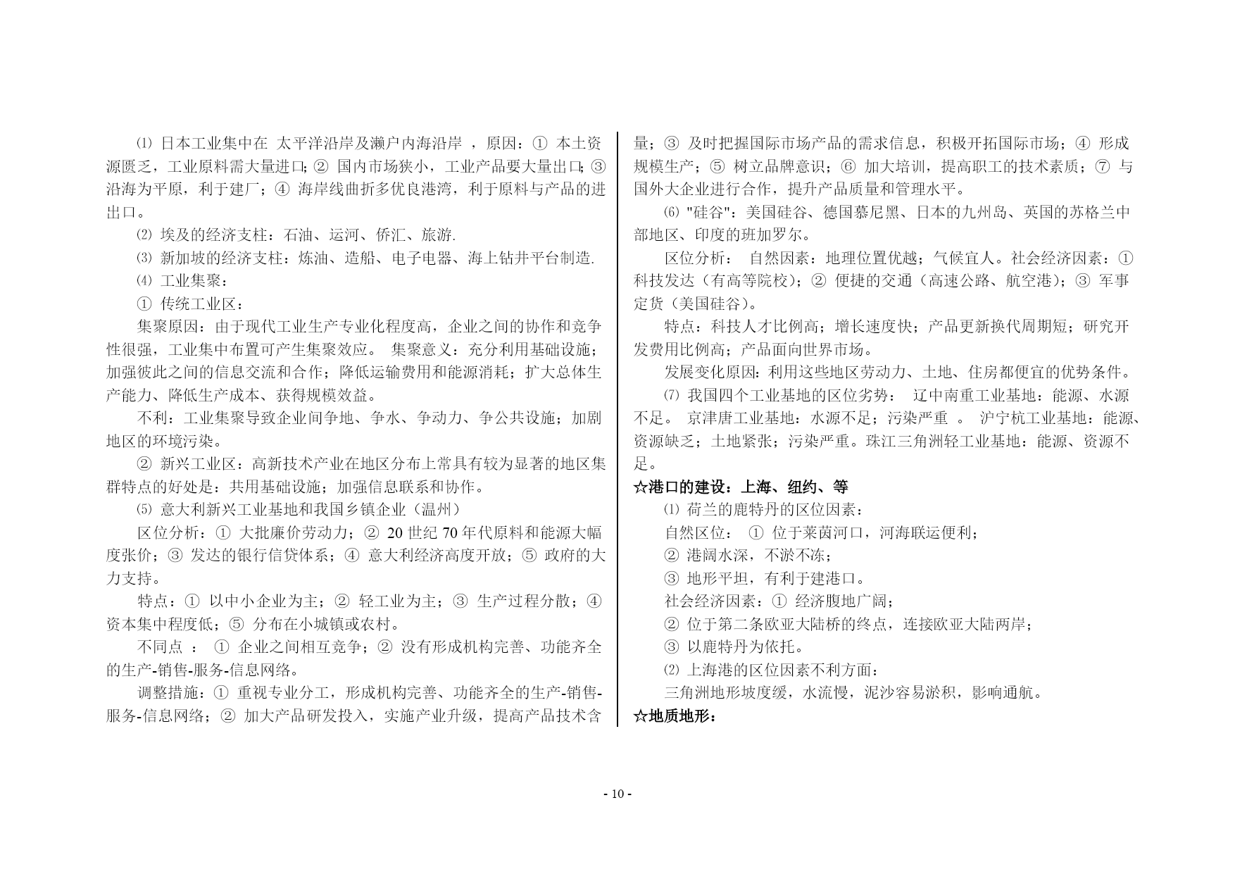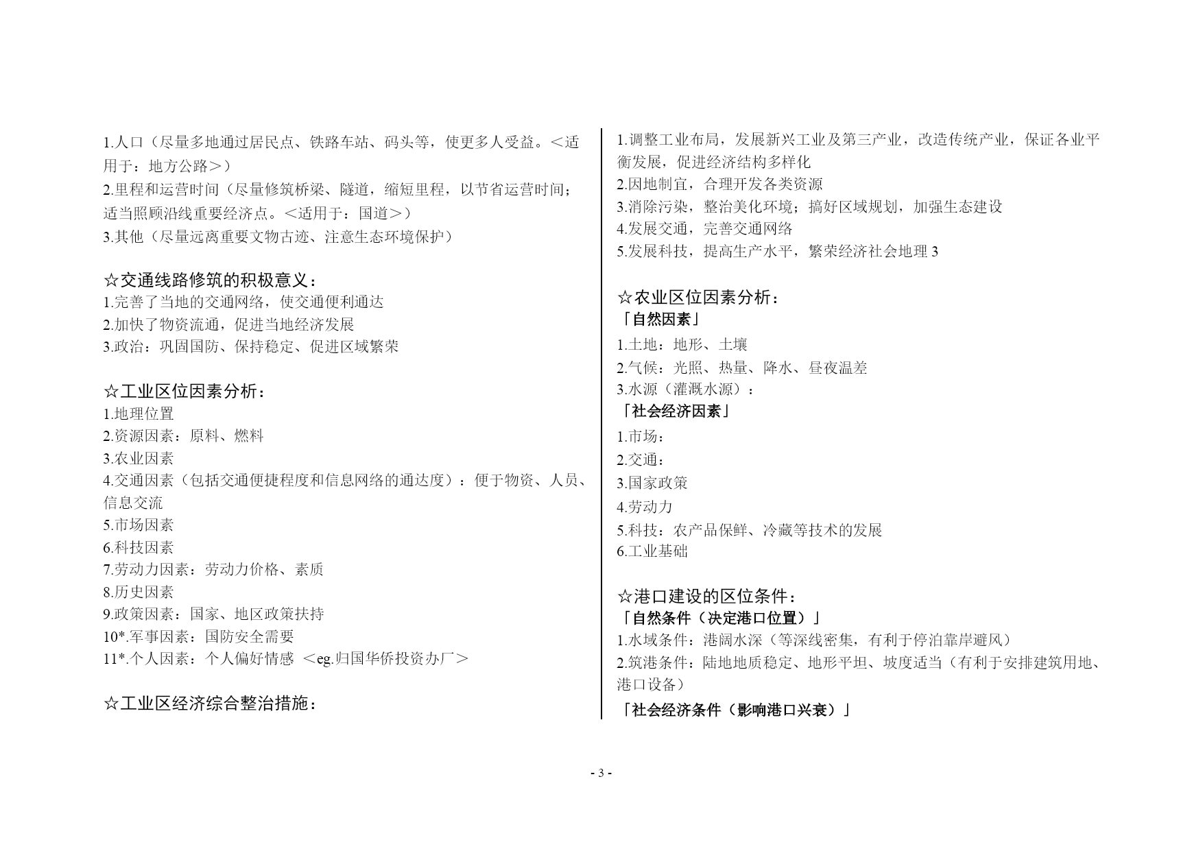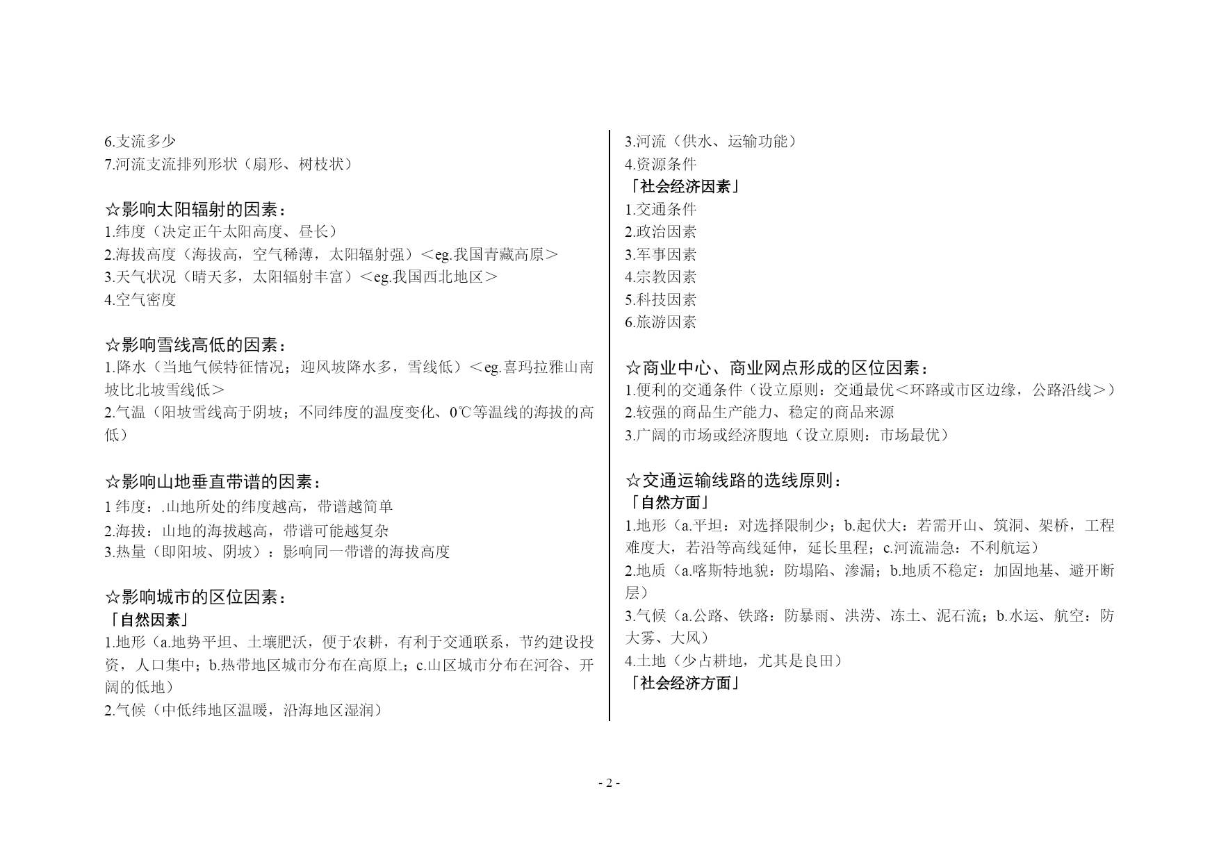 PAGE-11-地理综合题答题思路归纳☆如何描述地形特征:1.地形类型(平原、山地、丘陵、高原、盆地等)2.地势起伏状况3.(多种地形条件下)主要地形分布4.(剖面图中)重要地形剖面特征☆影响气温的因素:1.纬度(决定因素):影响太阳高度、昼长、太阳辐射量、气温日较差,年较差(低纬度地区气温日、年较差小于高纬度地区)2.地形(高度、地势):阴坡、阳坡,不同海拔高度的山地、平原、谷地、盆地(如:谷地盆地地形热量不易散失,高大地形对冬季风阻挡,同纬度山地比平原日较差、年较差小等)3.海陆位置:海洋性强弱引起气温年较差变化4.洋流(暖流:增温增湿;寒流:降温减湿)5.天气状况(云雨多的地方气温日、年较差小于云雨少的地方)6.下垫面:地面反射率(冰雪反射率大,气温低);绿地气温日、年较差小于裸地7.人类活动:热岛效应、温室效应等☆影响降水的因素:1.气候:大气环流(气压带、风带、季风)2.地形:迎风坡、背风坡3.地势(海拔高度):降水在一定高度达最大值4.海陆位置(距海远近)5.洋流(暖流:增温增湿;寒流:降温减湿)6.下垫面:湖泊、河流、植被覆盖状况7.人类活动;改变下垫面影响降水☆描述河流的水文特征:1.流量:大小、季节变化、有无断流(取决于降水特征、雨水补给、河流面积大小)2.含沙量:取决于流域的植被状况3.结冰期:有无、长短4.水位:高低、变化特征(取决于河流补给类型、水利工程、湖泊调蓄作用)5.水能:与地形(河流落差大小,流速快慢)、气候(降水量的多少,径流量的大小,蒸发量的大小)有关☆描述河流的水系特征:1.长度2.流向3.流域面积大小4.落差大小(水能)5.河道曲直情况6.支流多少7.河流支流排列形状(扇形、树枝状)☆影响太阳辐射的因素:1.纬度(决定正午太阳高度、昼长)2.海拔高度(海拔高,空气稀薄,太阳辐射强)<eg.我国青藏高原>3.天气状况(晴天多,太阳辐射丰富)<eg.我国西北地区>4.空气密度☆影响雪线高低的因素:1.降水(当地气候特征情况;迎风坡降水多,雪线低)<eg.喜玛拉雅山南坡比北坡雪线低>2.气温(阳坡雪线高于阴坡;不同纬度的温度变化、0℃等温线的海拔的高低)☆影响山地垂直带谱的因素:1纬度:.山地所处的纬度越高,带谱越简单2.海拔:山地的海拔越高,带谱可能越复杂3.热量(即阳坡、阴坡):影响同一带谱的海拔高度☆影响城市的区位因素:「自然因素」1.地形(a.地势平坦、土壤肥沃,便于农耕,有利于交通联系,节约建设投资,人口集中;b.热带地区城市分布在高原上;c.山区城市分布在河谷、开阔的低地)2.气候(中低纬地区温暖,沿海地区湿润)3.河流(供水、运输功能)4.资源条件「社会经济因素」1.交通条件2.政治因素3.军事因素4.宗教因素5.科技因素6.旅游因素☆商业中心、商业网点形成的区位因素:1.便利的交通条件(设立原则:交通最优<环路或市区边缘,公路沿线>)2.较强的商品生产能力、稳定的商品来源3.广阔的市场或经济腹地(设立原则:市场最优)☆交通运输线路的选线原则:「自然方面」1.地形(a.平坦:对选择限制少;b.起伏大:若需开山、筑洞、架桥,工程难度大,若沿等高线延伸,延长里程;c.河流湍急:不利航运)2.地质(a.喀斯特地貌:防塌陷、渗漏;b.地质不稳定:加固地基、避开断层)3.气候(a.公路、铁路:防暴雨、洪涝、冻土、泥石流;b.水运、航空:防大雾、大风)4.土地(少占耕地,尤其是良田)「社会经济方面」1.人口(尽量多地通过居民点、铁路车站、码头等,使更多人受益。<适用于:地方公路>)2.里程和运营时间(尽量修筑桥梁、隧道,缩短里程,以节省运营时间;适当照顾沿线重要经济点。<适用于:国道>)3.其他(尽量远离重要文物古迹、注意生态环境保护)☆交通线路修筑的积极意义:1.完善了当地的交通网络,使交通便利通达2.加快了物资流通,促进当地经济发展3.政治:巩固国防、保持稳定、促进区域繁荣☆工业区位因素分析:1.地理位置2.资源因素:原料、燃料3.农业因素4.交通因素(包括交通便捷程度和信息网络的通达度):便于物资、人员、信息交流5.市场因素6.科技因素7.劳动力因素:劳动力价格、素质8.历史因素9.政策因素:国家、地区政策扶持10*.军事因素:国防安全需要11*.个人因素:个人偏好情感<eg.归国华侨投资办厂>☆工业区经济综合整治措施:1.调整工业布局,发展新兴工业及第三产业,改造传统产业,保证各业平衡发展,促进经济结构多样化2.因地制宜,合理开发各类资源3.消除污染,整治美