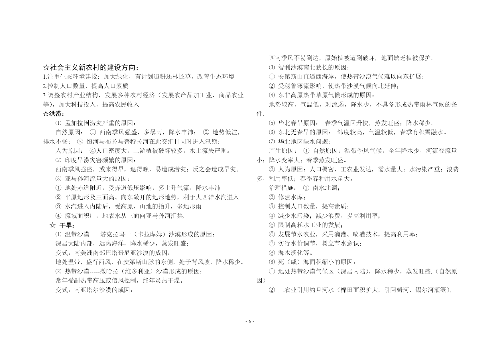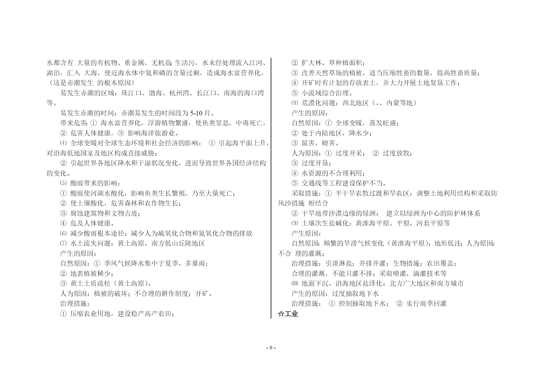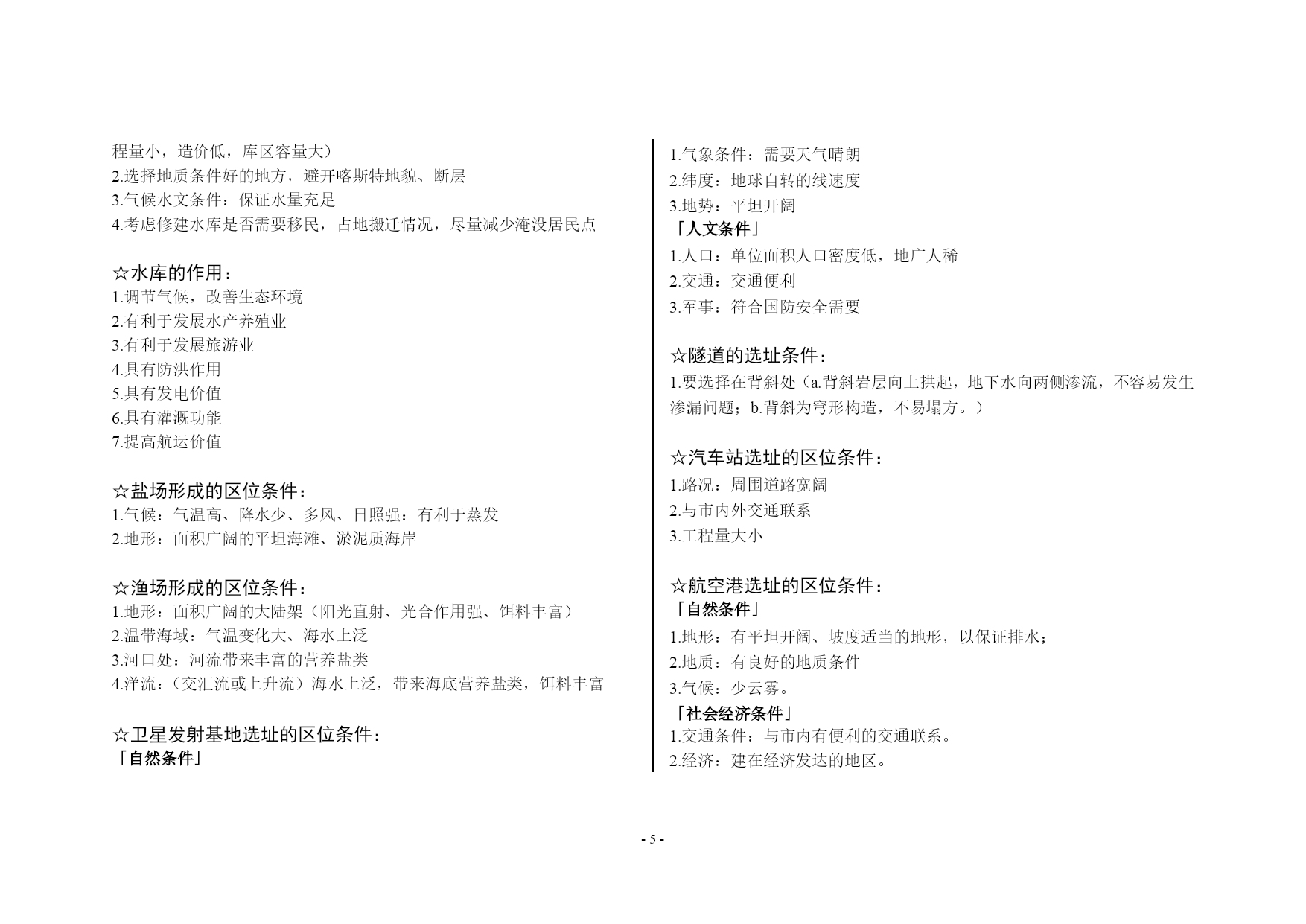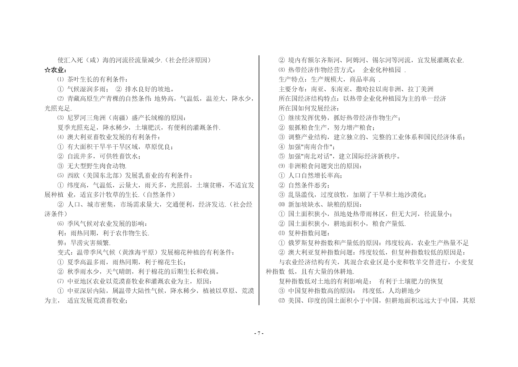 PAGE-11-地理综合题答题思路归纳☆如何描述地形特征:1.地形类型(平原、山地、丘陵、高原、盆地等)2.地势起伏状况3.(多种地形条件下)主要地形分布4.(剖面图中)重要地形剖面特征☆影响气温的因素:1.纬度(决定因素):影响太阳高度、昼长、太阳辐射量、气温日较差,年较差(低纬度地区气温日、年较差小于高纬度地区)2.地形(高度、地势):阴坡、阳坡,不同海拔高度的山地、平原、谷地、盆地(如:谷地盆地地形热量不易散失,高大地形对冬季风阻挡,同纬度山地比平原日较差、年较差小等)3.海陆位置:海洋性强弱引起气温年较差变化4.洋流(暖流:增温增湿;寒流:降温减湿)5.天气状况(云雨多的地方气温日、年较差小于云雨少的地方)6.下垫面:地面反射率(冰雪反射率大,气温低);绿地气温日、年较差小于裸地7.人类活动:热岛效应、温室效应等☆影响降水的因素:1.气候:大气环流(气压带、风带、季风)2.地形:迎风坡、背风坡3.地势(海拔高度):降水在一定高度达最大值4.海陆位置(距海远近)5.洋流(暖流:增温增湿;寒流:降温减湿)6.下垫面:湖泊、河流、植被覆盖状况7.人类活动;改变下垫面影响降水☆描述河流的水文特征:1.流量:大小、季节变化、有无断流(取决于降水特征、雨水补给、河流面积大小)2.含沙量:取决于流域的植被状况3.结冰期:有无、长短4.水位:高低、变化特征(取决于河流补给类型、水利工程、湖泊调蓄作用)5.水能:与地形(河流落差大小,流速快慢)、气候(降水量的多少,径流量的大小,蒸发量的大小)有关☆描述河流的水系特征:1.长度2.流向3.流域面积大小4.落差大小(水能)5.河道曲直情况6.支流多少7.河流支流排列形状(扇形、树枝状)☆影响太阳辐射的因素:1.纬度(决定正午太阳高度、昼长)2.海拔高度(海拔高,空气稀薄,太阳辐射强)<eg.我国青藏高原>3.天气状况(晴天多,太阳辐射丰富)<eg.我国西北地区>4.空气密度☆影响雪线高低的因素:1.降水(当地气候特征情况;迎风坡降水多,雪线低)<eg.喜玛拉雅山南坡比北坡雪线低>2.气温(阳坡雪线高于阴坡;不同纬度的温度变化、0℃等温线的海拔的高低)☆影响山地垂直带谱的因素:1纬度:.山地所处的纬度越高,带谱越简单2.海拔:山地的海拔越高,带谱可能越复杂3.热量(即阳坡、阴坡):影响同一带谱的海拔高度☆影响城市的区位因素:「自然因素」1.地形(a.地势平坦、土壤肥沃,便于农耕,有利于交通联系,节约建设投资,人口集中;b.热带地区城市分布在高原上;c.山区城市分布在河谷、开阔的低地)2.气候(中低纬地区温暖,沿海地区湿润)3.河流(供水、运输功能)4.资源条件「社会经济因素」1.交通条件2.政治因素3.军事因素4.宗教因素5.科技因素6.旅游因素☆商业中心、商业网点形成的区位因素:1.便利的交通条件(设立原则:交通最优<环路或市区边缘,公路沿线>)2.较强的商品生产能力、稳定的商品来源3.广阔的市场或经济腹地(设立原则:市场最优)☆交通运输线路的选线原则:「自然方面」1.地形(a.平坦:对选择限制少;b.起伏大:若需开山、筑洞、架桥,工程难度大,若沿等高线延伸,延长里程;c.河流湍急:不利航运)2.地质(a.喀斯特地貌:防塌陷、渗漏;b.地质不稳定:加固地基、避开断层)3.气候(a.公路、铁路:防暴雨、洪涝、冻土、泥石流;b.水运、航空:防大雾、大风)4.土地(少占耕地,尤其是良田)「社会经济方面」1.人口(尽量多地通过居民点、铁路车站、码头等,使更多人受益。<适用于:地方公路>)2.里程和运营时间(尽量修筑桥梁、隧道,缩短里程,以节省运营时间;适当照顾沿线重要经济点。<适用于:国道>)3.其他(尽量远离重要文物古迹、注意生态环境保护)☆交通线路修筑的积极意义:1.完善了当地的交通网络,使交通便利通达2.加快了物资流通,促进当地经济发展3.政治:巩固国防、保持稳定、促进区域繁荣☆工业区位因素分析:1.地理位置2.资源因素:原料、燃料3.农业因素4.交通因素(包括交通便捷程度和信息网络的通达度):便于物资、人员、信息交流5.市场因素6.科技因素7.劳动力因素:劳动力价格、素质8.历史因素9.政策因素:国家、地区政策扶持10*.军事因素:国防安全需要11*.个人因素:个人偏好情感<eg.归国华侨投资办厂>☆工业区经济综合整治措施:1.调整工业布局,发展新兴工业及第三产业,改造传统产业,保证各业平衡发展,促进经济结构多样化2.因地制宜,合理开发各类资源3.消除污染,整治美