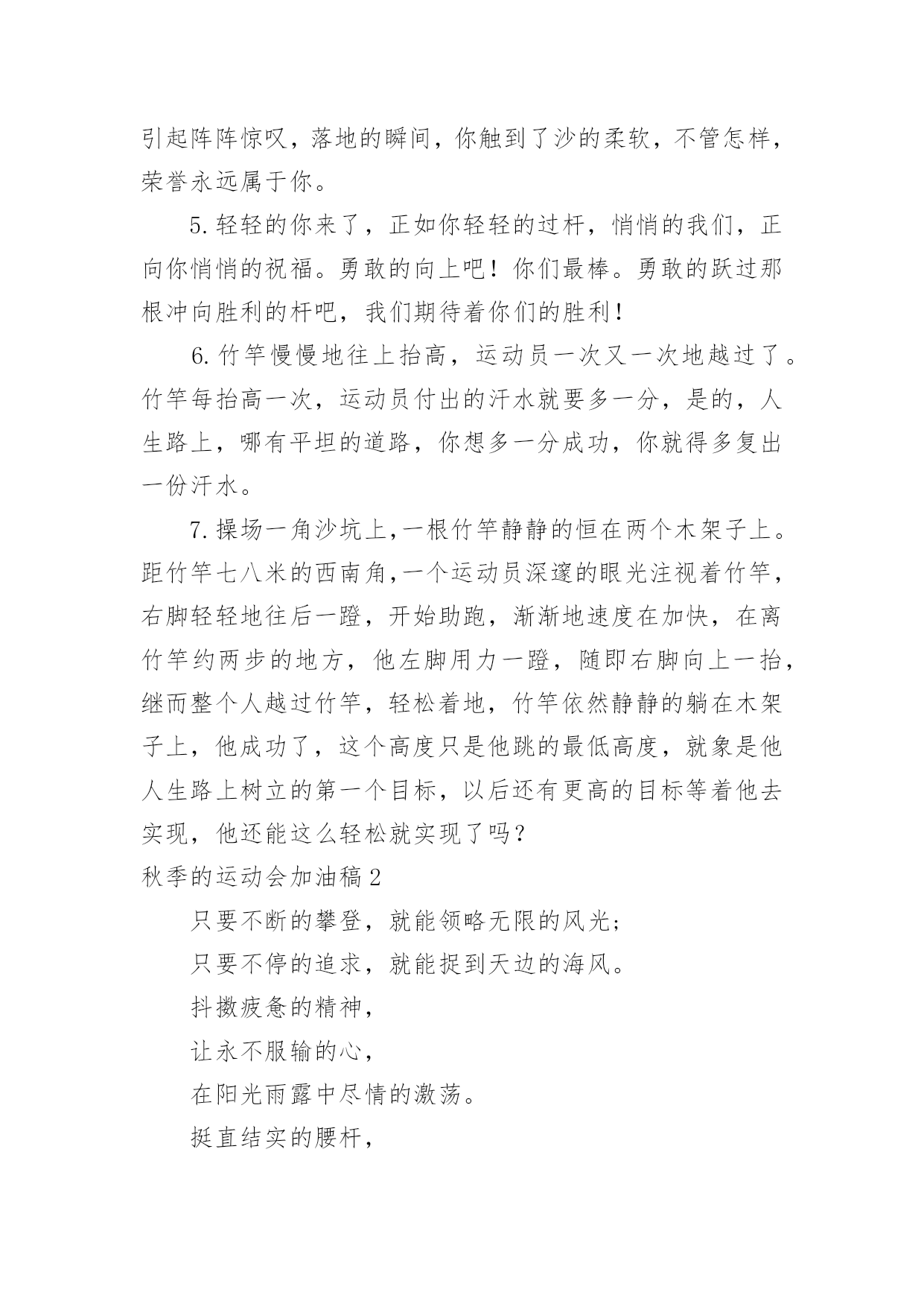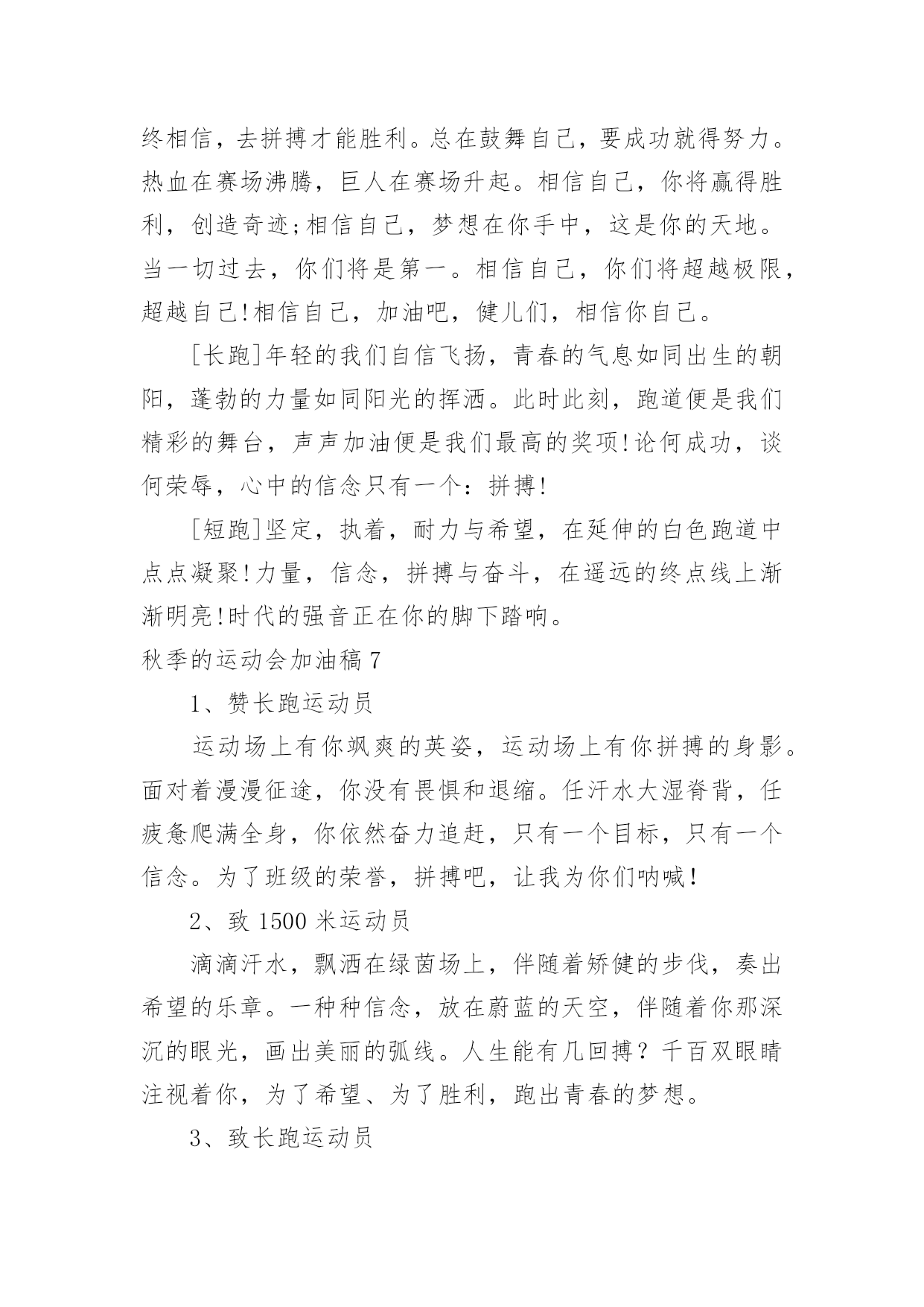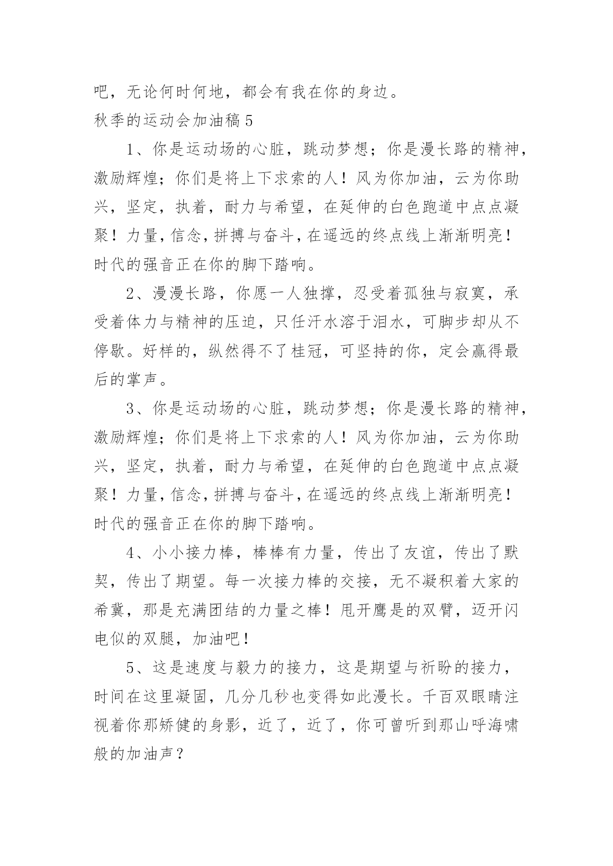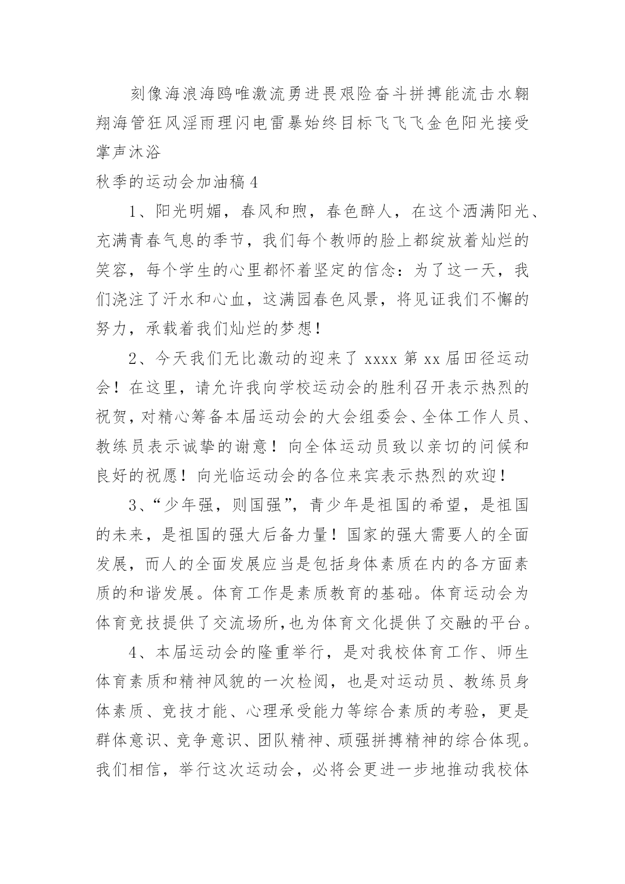 秋季的运动会加油稿秋季的运动会加油稿在不断进步的时代,能够利用到加油稿的场合越来越多,借助加油稿往往可以提升对方的气势。那么,怎么去写加油稿呢?以下是小编整理的秋季的运动会加油稿,欢迎大家分享。秋季的运动会加油稿11.拼搏者,你是赛场上最亮的点。在你的眼中,不在乎胜利的欢乐和失败的眼泪,完全只是为了展示生命跳跃的节拍。拼搏者,你是生命乐章中最响的音符。在你的心中,只有不停拼搏的信念,用自己坚实的步伐去迈开人生新的旅程。场上的拼搏者,你是我们永远的骄傲!2.你像一只矫健的飞燕轻捷地掠过了横竿,顿时,全场晴天霹雳般哄起一片欢呼声。在喝彩声中横竿升上了新的高度,伴随着这喝彩声,你又开始向新的、更高的目标攀登!3.在阳光的照耀下,跳高的比赛场地格外辉煌,运动健儿们,用那矫键的身躯,冲刺着一个又一个的高度.没有尝试,怎会知道自己是否为强者,超越自己,也许会创造一番新天地!运动健儿们加油吧,去创造一份份奇奇迹,去创造一份份惊喜!4.离弦箭似的.助跑,蚂蚱似的起跳,空中的走步表演,引起阵阵惊叹,落地的瞬间,你触到了沙的柔软,不管怎样,荣誉永远属于你。5.轻轻的你来了,正如你轻轻的过杆,悄悄的我们,正向你悄悄的祝福。勇敢的向上吧!你们最棒。勇敢的跃过那根冲向胜利的杆吧,我们期待着你们的胜利!6.竹竿慢慢地往上抬高,运动员一次又一次地越过了。竹竿每抬高一次,运动员付出的汗水就要多一分,是的,人生路上,哪有平坦的道路,你想多一分成功,你就得多复出一份汗水。7.操场一角沙坑上,一根竹竿静静的恒在两个木架子上。距竹竿七八米的西南角,一个运动员深邃的眼光注视着竹竿,右脚轻轻地往后一蹬,开始助跑,渐渐地速度在加快,在离竹竿约两步的地方,他左脚用力一蹬,随即右脚向上一抬,继而整个人越过竹竿,轻松着地,竹竿依然静静的躺在木架子上,他成功了,这个高度只是他跳的最低高度,就象是他人生路上树立的第一个目标,以后还有更高的目标等着他去实现,他还能这么轻松就实现了吗?秋季的运动会加油稿2只要不断的攀登,就能领略无限的风光;只要不停的追求,就能捉到天边的海风。抖擞疲惫的精神,让永不服输的心,在阳光雨露中尽情的激荡。挺直结实的腰杆,高昂不屈的头颅,拭去吧,额头的汗水;挥去吧,天边的.阴云。微笑着跑步,生活中的强者,你终将迎来胜利和春光!秋季的运动会加油稿3拼搏者拼搏者,你是赛场上最亮的点。在你的眼中,不在乎胜利的欢乐和失败的眼泪,完全只是为了展示生命跳跃的节拍。拼搏者,你是生命乐章中最响的音符。在你的心中,只有不停拼搏的信念,用自己坚实的步伐去迈开人生新的旅程。场上的拼搏者,你是我们永远的骄傲!无人喝彩---致大会裁判员同样的骄阳,同样的暴晒,没有热烈的欢呼,没有激动的'喝彩。你用精密的仪表,和细致的耐心,记录着运动员的辉煌。我为你们自豪,辛苦了,亲爱的同学!运动会能很好地提高同学们对于自己身体健康的重视度而不只是一场具有观赏性的竞技比赛数夜夜辛劳今兑现洒艰辛汗水继续抬起疲倦脚步爆发吼气贯虹继续向前3000米征胜利前论功与否已曾经拥曾记否终点欢呼震惊四周刻像海浪海鸥唯激流勇进畏艰险奋斗拼搏能流击水翱翔海管狂风淫雨理闪电雷暴始终目标飞飞飞金色阳光接受掌声沐浴秋季的运动会加油稿41、阳光明媚,春风和煦,春色醉人,在这个洒满阳光、充满青春气息的季节,我们每个教师的脸上都绽放着灿烂的笑容,每个学生的心里都怀着坚定的信念:为了这一天,我们浇注了汗水和心血,这满园春色风景,将见证我们不懈的努力,承载着我们灿烂的梦想!2、今天我们无比激动的迎来了xxxx第xx届田径运动会!在这里,请允许我向学校运动会的胜利召开表示热烈的祝贺,对精心筹备本届运动会的大会组委会、全体工作人员、教练员表示诚挚的谢意!向全体运动员致以亲切的问候和良好的祝愿!向光临运动会的各位来宾表示热烈的欢迎!3、“少年强,则国强”,青少年是祖国的希望,是祖国的未来,是祖国的强大后备力量!国家的强大需要人的全面发展,而人的全面发展应当是包括身体素质在内的各方面素质的和谐发展。体育工作是素质教育的基础。体育运动会为体育竞技提供了交流场所,也为体育文化提供了交融的平台。4、本届运动会的隆重举行,是对我校体育工作、师生体育素质和精神风貌的一次检阅,也是对运动员、教练员身体素质、竞技才能、心理承受能力等综合素质的考验,更是群体意识、竞争意识、团队精神、顽强拼搏精神的综合体现。我们相信,举行这次运动会,必将会更进一步地推动我校体育工作乃至学校教育教学和管理等各项事业的蓬勃发展。5、为了保证运动会的顺利进行,希望全体裁判员坚持“公平、公正、公开”的原则,认真执行各项事务;各班级、全体运动员,要顽强拼搏、团结互助、尊重对手、服从裁判,本着“友谊第一,比赛第二”的原则,赛出竞技水平,赛出道德风尚,赛出个性风采,赛出团结友谊,创纪录,上层
