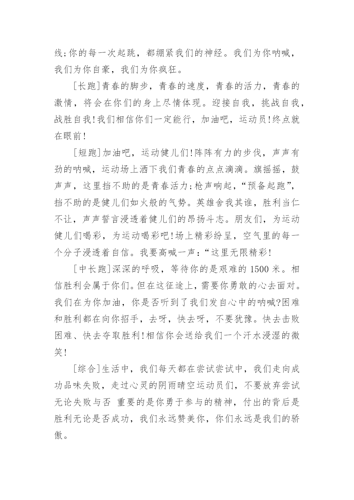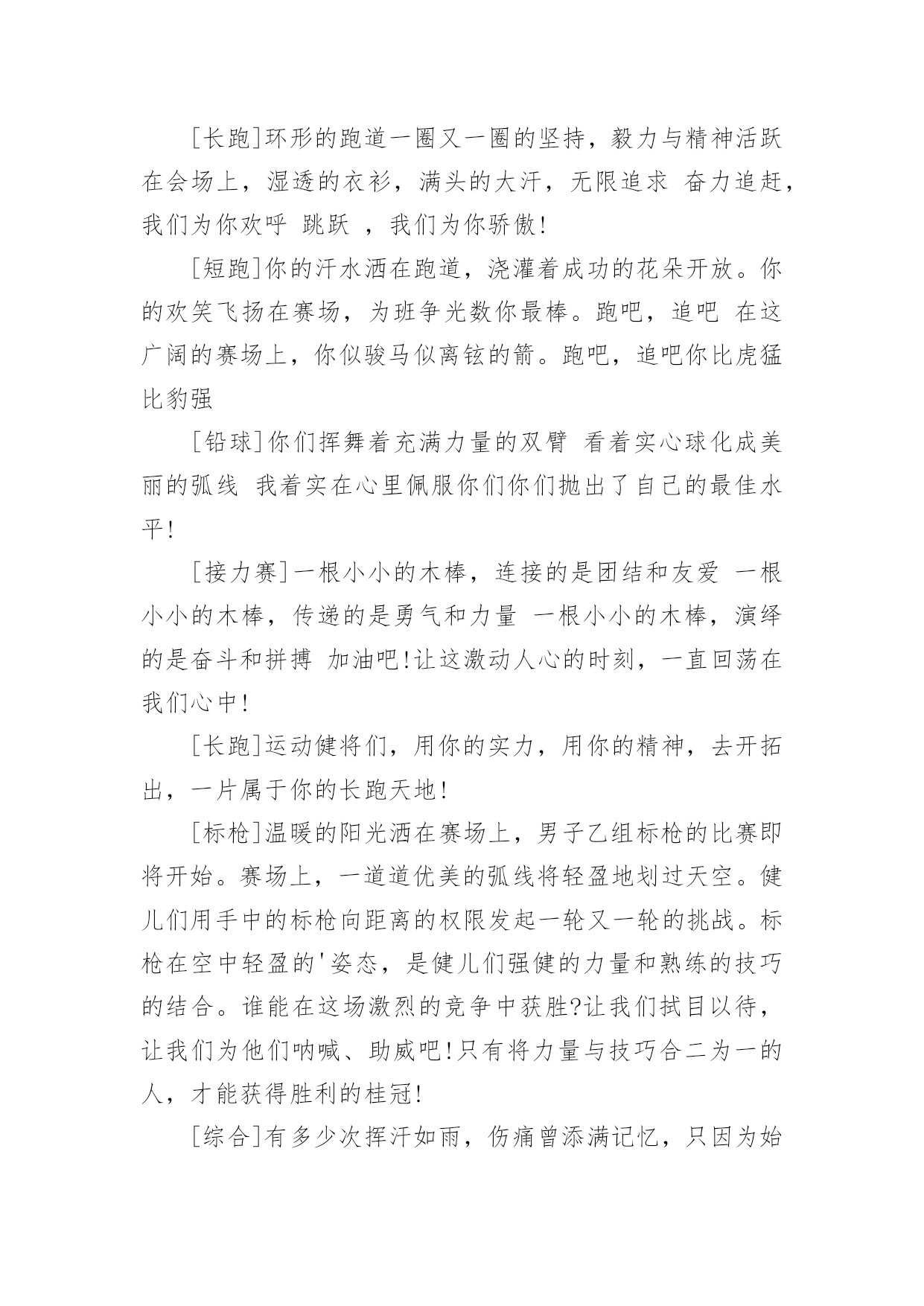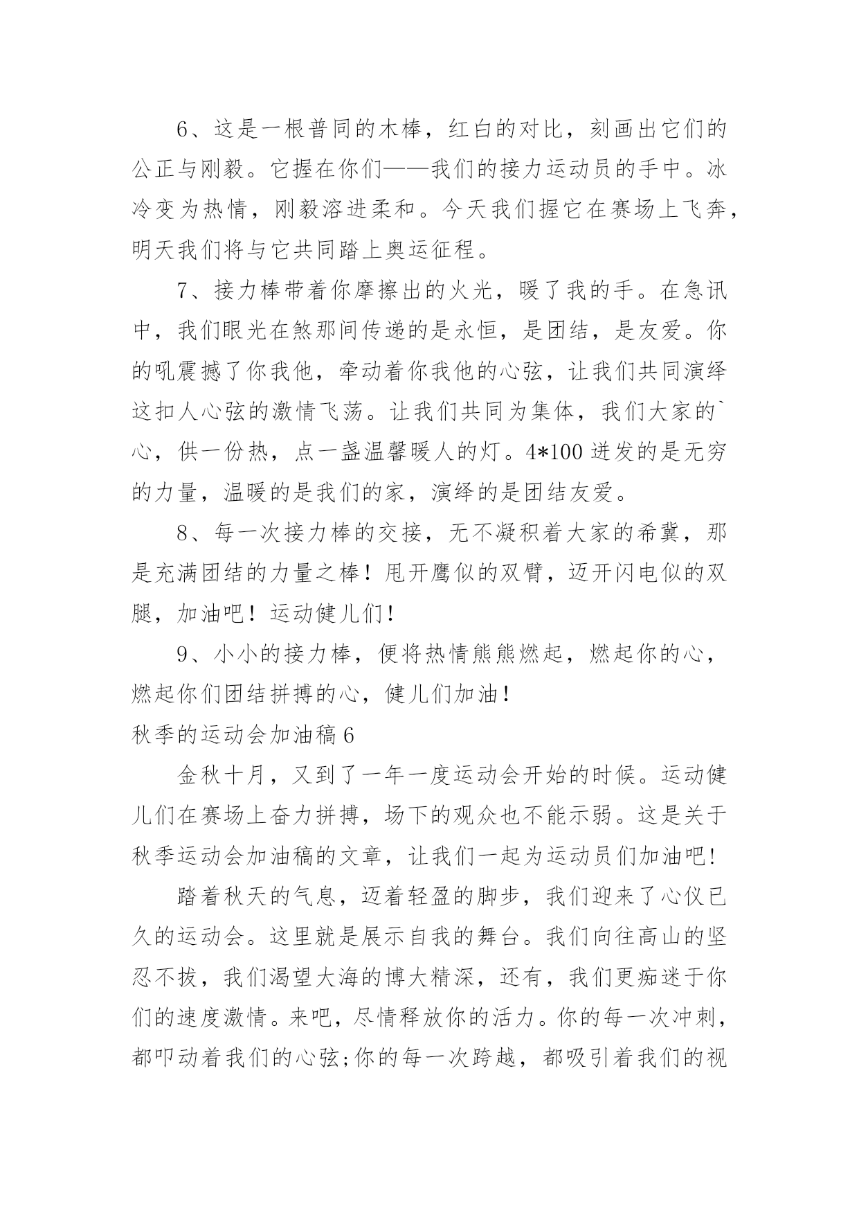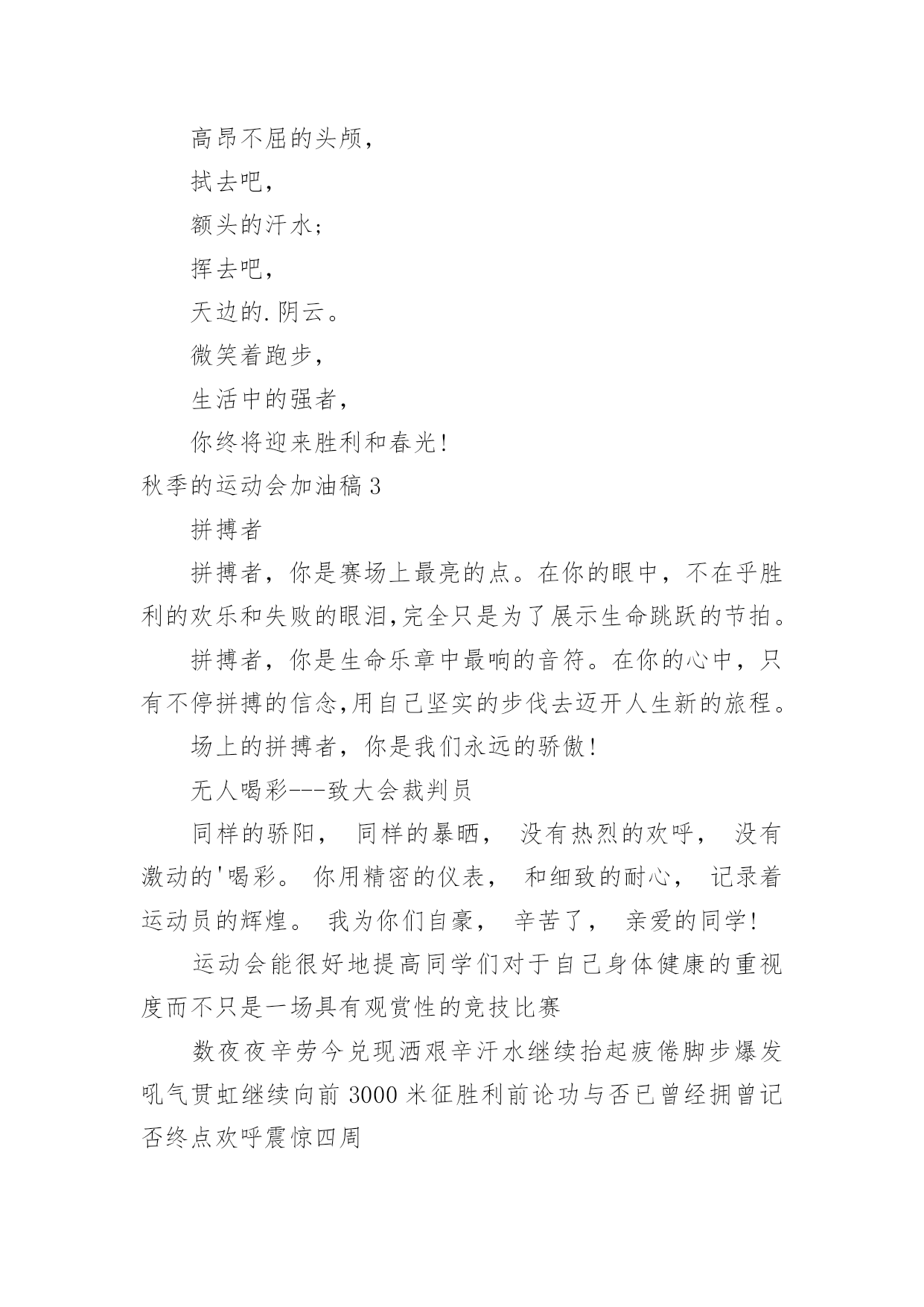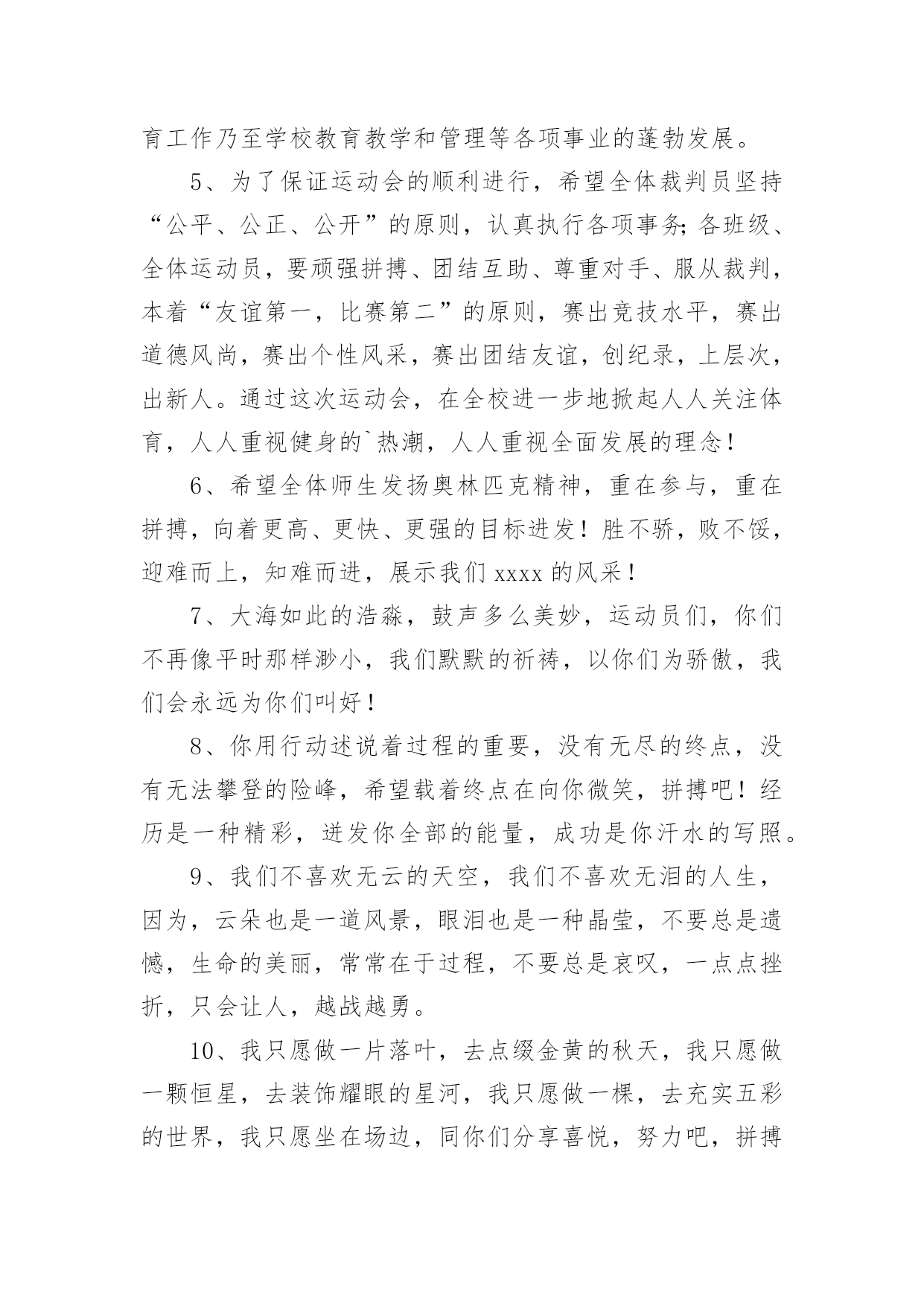 秋季的运动会加油稿秋季的运动会加油稿在不断进步的时代,能够利用到加油稿的场合越来越多,借助加油稿往往可以提升对方的气势。那么,怎么去写加油稿呢?以下是小编整理的秋季的运动会加油稿,欢迎大家分享。秋季的运动会加油稿11.拼搏者,你是赛场上最亮的点。在你的眼中,不在乎胜利的欢乐和失败的眼泪,完全只是为了展示生命跳跃的节拍。拼搏者,你是生命乐章中最响的音符。在你的心中,只有不停拼搏的信念,用自己坚实的步伐去迈开人生新的旅程。场上的拼搏者,你是我们永远的骄傲!2.你像一只矫健的飞燕轻捷地掠过了横竿,顿时,全场晴天霹雳般哄起一片欢呼声。在喝彩声中横竿升上了新的高度,伴随着这喝彩声,你又开始向新的、更高的目标攀登!3.在阳光的照耀下,跳高的比赛场地格外辉煌,运动健儿们,用那矫键的身躯,冲刺着一个又一个的高度.没有尝试,怎会知道自己是否为强者,超越自己,也许会创造一番新天地!运动健儿们加油吧,去创造一份份奇奇迹,去创造一份份惊喜!4.离弦箭似的.助跑,蚂蚱似的起跳,空中的走步表演,引起阵阵惊叹,落地的瞬间,你触到了沙的柔软,不管怎样,荣誉永远属于你。5.轻轻的你来了,正如你轻轻的过杆,悄悄的我们,正向你悄悄的祝福。勇敢的向上吧!你们最棒。勇敢的跃过那根冲向胜利的杆吧,我们期待着你们的胜利!6.竹竿慢慢地往上抬高,运动员一次又一次地越过了。竹竿每抬高一次,运动员付出的汗水就要多一分,是的,人生路上,哪有平坦的道路,你想多一分成功,你就得多复出一份汗水。7.操场一角沙坑上,一根竹竿静静的恒在两个木架子上。距竹竿七八米的西南角,一个运动员深邃的眼光注视着竹竿,右脚轻轻地往后一蹬,开始助跑,渐渐地速度在加快,在离竹竿约两步的地方,他左脚用力一蹬,随即右脚向上一抬,继而整个人越过竹竿,轻松着地,竹竿依然静静的躺在木架子上,他成功了,这个高度只是他跳的最低高度,就象是他人生路上树立的第一个目标,以后还有更高的目标等着他去实现,他还能这么轻松就实现了吗?秋季的运动会加油稿2只要不断的攀登,就能领略无限的风光;只要不停的追求,就能捉到天边的海风。抖擞疲惫的精神,让永不服输的心,在阳光雨露中尽情的激荡。挺直结实的腰杆,高昂不屈的头颅,拭去吧,额头的汗水;挥去吧,天边的.阴云。微笑着跑步,生活中的强者,你终将迎来胜利和春光!秋季的运动会加油稿3拼搏者拼搏者,你是赛场上最亮的点。在你的眼中,不在乎胜利的欢乐和失败的眼泪,完全只是为了展示生命跳跃的节拍。拼搏者,你是生命乐章中最响的音符。在你的心中,只有不停拼搏的信念,用自己坚实的步伐去迈开人生新的旅程。场上的拼搏者,你是我们永远的骄傲!无人喝彩---致大会裁判员同样的骄阳,同样的暴晒,没有热烈的欢呼,没有激动的'喝彩。你用精密的仪表,和细致的耐心,记录着运动员的辉煌。我为你们自豪,辛苦了,亲爱的同学!运动会能很好地提高同学们对于自己身体健康的重视度而不只是一场具有观赏性的竞技比赛数夜夜辛劳今兑现洒艰辛汗水继续抬起疲倦脚步爆发吼气贯虹继续向前3000米征胜利前论功与否已曾经拥曾记否终点欢呼震惊四周刻像海浪海鸥唯激流勇进畏艰险奋斗拼搏能流击水翱翔海管狂风淫雨理闪电雷暴始终目标飞飞飞金色阳光接受掌声沐浴秋季的运动会加油稿41、阳光明媚,春风和煦,春色醉人,在这个洒满阳光、充满青春气息的季节,我们每个教师的脸上都绽放着灿烂的笑容,每个学生的心里都怀着坚定的信念:为了这一天,我们浇注了汗水和心血,这满园春色风景,将见证我们不懈的努力,承载着我们灿烂的梦想!2、今天我们无比激动的迎来了xxxx第xx届田径运动会!在这里,请允许我向学校运动会的胜利召开表示热烈的祝贺,对精心筹备本届运动会的大会组委会、全体工作人员、教练员表示诚挚的谢意!向全体运动员致以亲切的问候和良好的祝愿!向光临运动会的各位来宾表示热烈的欢迎!3、“少年强,则国强”,青少年是祖国的希望,是祖国的未来,是祖国的强大后备力量!国家的强大需要人的全面发展,而人的全面发展应当是包括身体素质在内的各方面素质的和谐发展。体育工作是素质教育的基础。体育运动会为体育竞技提供了交流场所,也为体育文化提供了交融的平台。4、本届运动会的隆重举行,是对我校体育工作、师生体育素质和精神风貌的一次检阅,也是对运动员、教练员身体素质、竞技才能、心理承受能力等综合素质的考验,更是群体意识、竞争意识、团队精神、顽强拼搏精神的综合体现。我们相信,举行这次运动会,必将会更进一步地推动我校体育工作乃至学校教育教学和管理等各项事业的蓬勃发展。5、为了保证运动会的顺利进行,希望全体裁判员坚持“公平、公正、公开”的原则,认真执行各项事务;各班级、全体运动员,要顽强拼搏、团结互助、尊重对手、服从裁判,本着“友谊第一,比赛第二”的原则,赛出竞技水平,赛出道德风尚,赛出个性风采,赛出团结友谊,创纪录,上层