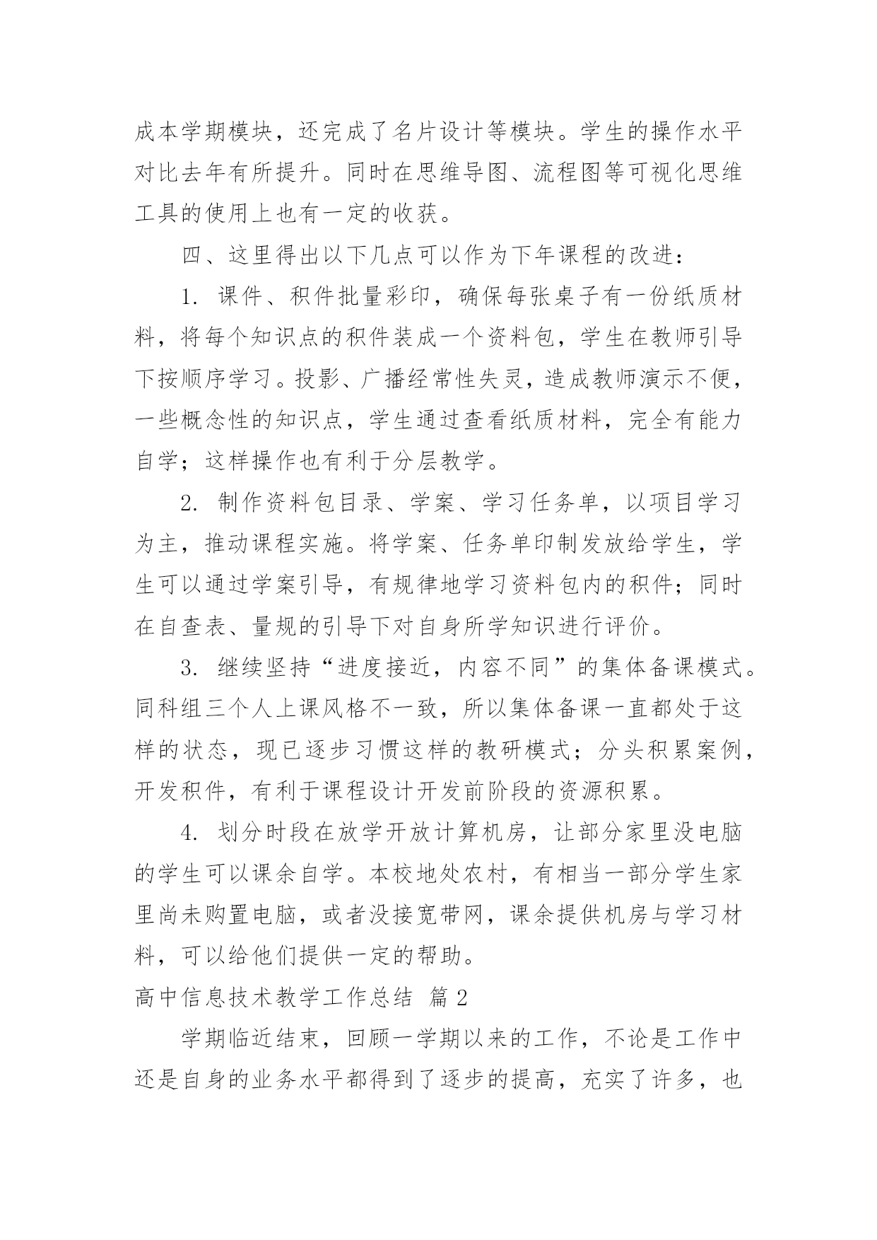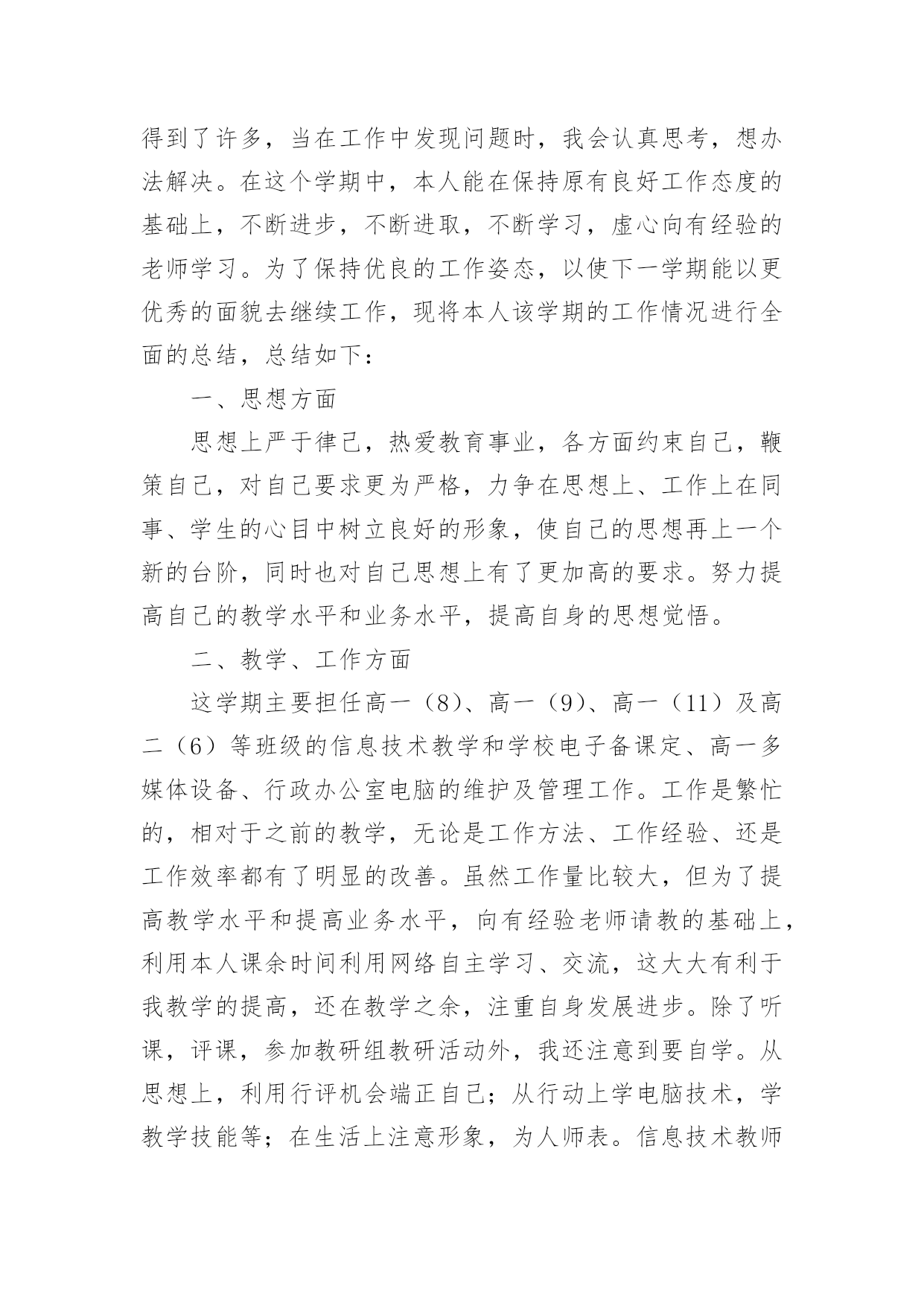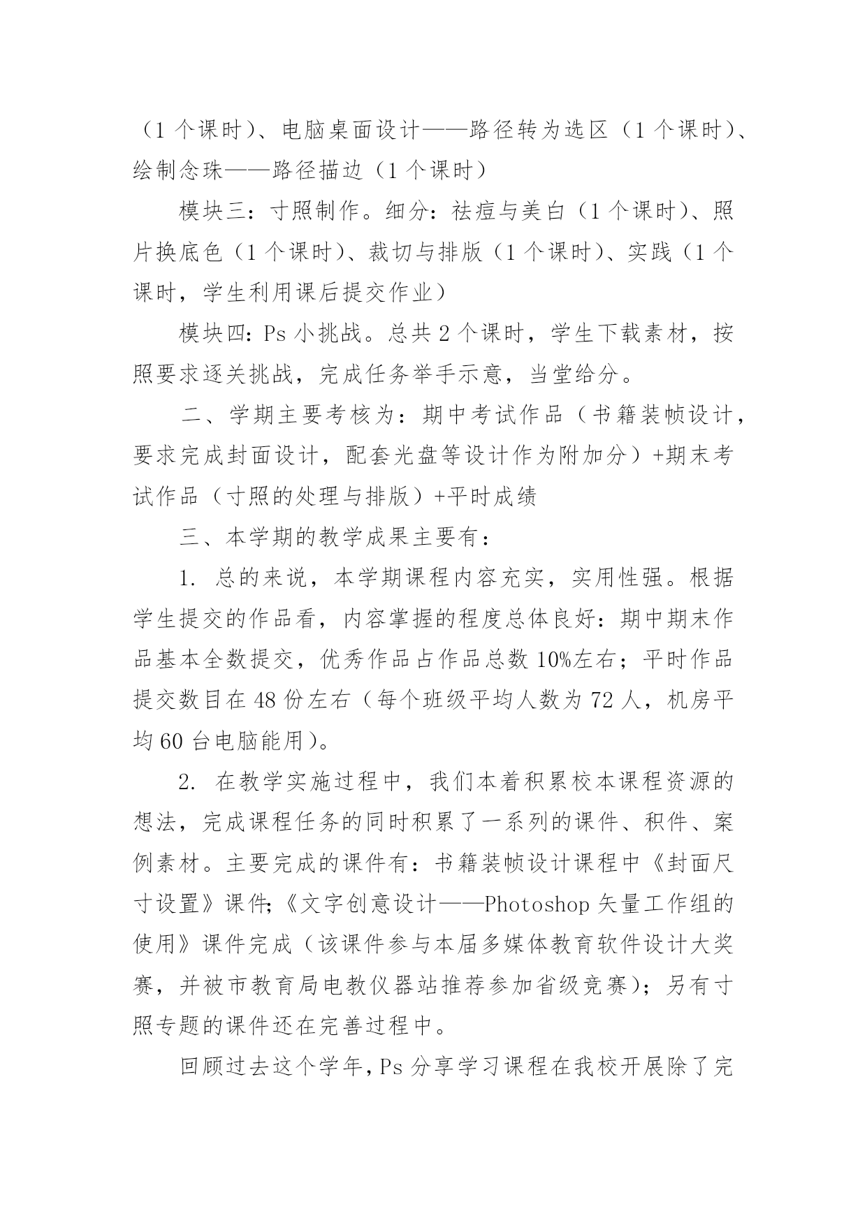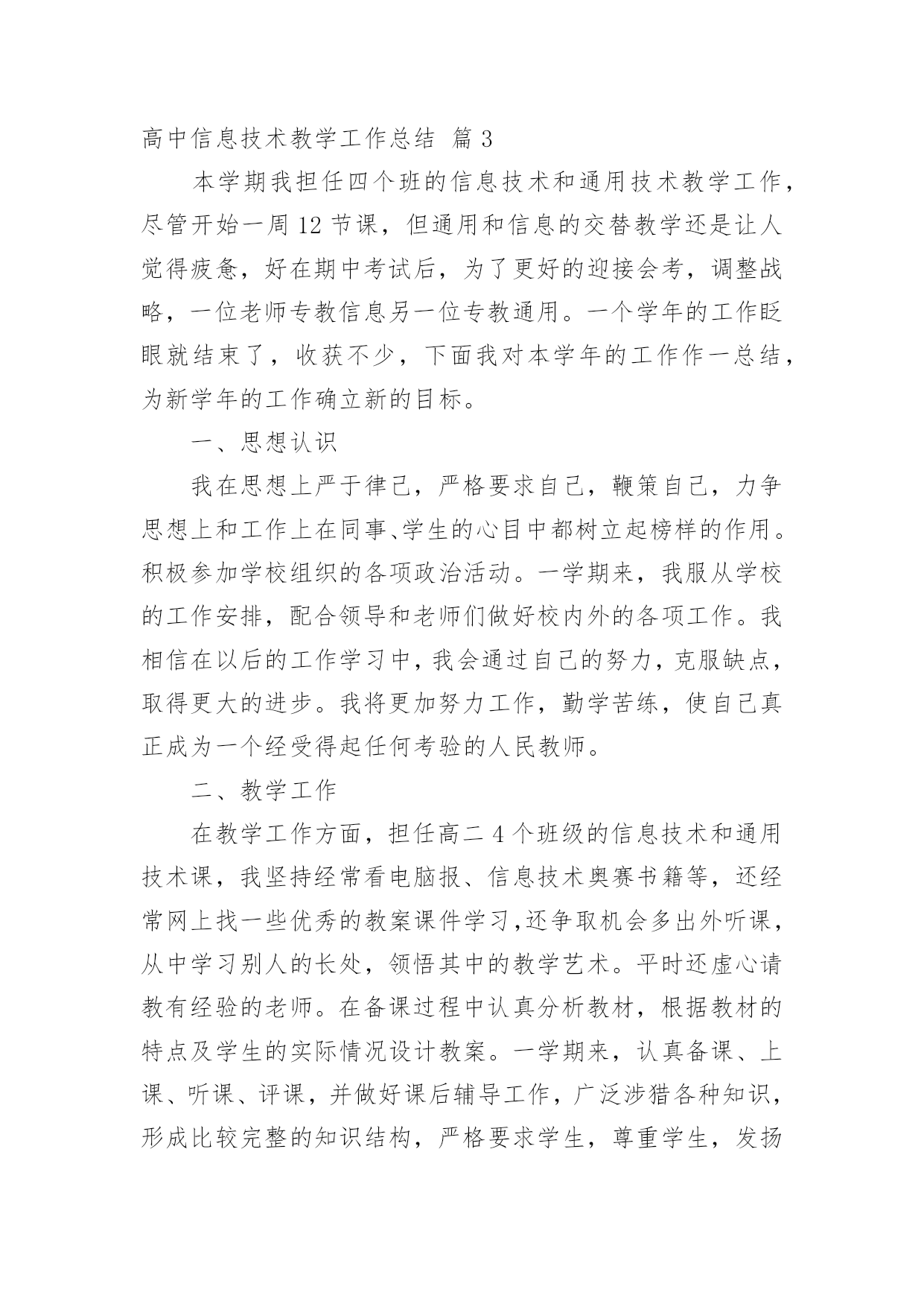 高中信息技术教学工作总结【推荐】高中信息技术教学工作总结4篇总结是事后对某一阶段的学习、工作或其完成情况加以回顾和分析的一种书面材料,它能够使头脑更加清醒,目标更加明确,不如静下心来好好写写总结吧。那么你知道总结如何写吗?下面是小编收集整理的高中信息技术教学工作总结4篇,欢迎阅读与收藏。高中信息技术教学工作总结篇1本学期教学内容为Photoshop电脑艺术设计,承接上学期的学习内容。原计划讲授完Ps工具箱、路径面板、调整命令与滤镜。结合实际,完成抠图专题、调色专题,并完成书籍装帧设计任务。在实际教学实施过程中,由于不断进行调整。最终部分内容进行删改,删节书籍装帧设计中光盘设计、作品展示竞标环节。添加了寸照修复与排版专题、Ps小挑战。一、本学期实际实施的教学内容如下:模块一:书籍装帧设计。细分:书签设计(1个课时)、摄影构图与素材获取(1个课时)、封面封底文件设置(1个课时)、封面设计(3个课时,其中2个课时为操作实践课)模块二:文字创意设计——矢量工作组的使用。细分:形状工具的使用与路径(1个课时)、文字创意设计——文字图层转形状图层并创意修饰(2个课时)、四季花海——剪贴蒙版(1个课时)、念亲恩——钢笔工具与路径控制文字排版(1个课时)、电脑桌面设计——路径转为选区(1个课时)、绘制念珠——路径描边(1个课时)模块三:寸照制作。细分:祛痘与美白(1个课时)、照片换底色(1个课时)、裁切与排版(1个课时)、实践(1个课时,学生利用课后提交作业)模块四:Ps小挑战。总共2个课时,学生下载素材,按照要求逐关挑战,完成任务举手示意,当堂给分。二、学期主要考核为:期中考试作品(书籍装帧设计,要求完成封面设计,配套光盘等设计作为附加分)+期末考试作品(寸照的处理与排版)+平时成绩三、本学期的教学成果主要有:1.总的来说,本学期课程内容充实,实用性强。根据学生提交的作品看,内容掌握的程度总体良好:期中期末作品基本全数提交,优秀作品占作品总数10%左右;平时作品提交数目在48份左右(每个班级平均人数为72人,机房平均60台电脑能用)。2.在教学实施过程中,我们本着积累校本课程资源的想法,完成课程任务的同时积累了一系列的课件、积件、案例素材。主要完成的课件有:书籍装帧设计课程中《封面尺寸设置》课件;《文字创意设计——Photoshop矢量工作组的使用》课件完成(该课件参与本届多媒体教育软件设计大奖赛,并被市教育局电教仪器站推荐参加省级竞赛);另有寸照专题的课件还在完善过程中。回顾过去这个学年,Ps分享学习课程在我校开展除了完成本学期模块,还完成了名片设计等模块。学生的操作水平对比去年有所提升。同时在思维导图、流程图等可视化思维工具的使用上也有一定的收获。四、这里得出以下几点可以作为下年课程的改进:1.课件、积件批量彩印,确保每张桌子有一份纸质材料,将每个知识点的积件装成一个资料包,学生在教师引导下按顺序学习。投影、广播经常性失灵,造成教师演示不便,一些概念性的知识点,学生通过查看纸质材料,完全有能力自学;这样操作也有利于分层教学。2.制作资料包目录、学案、学习任务单,以项目学习为主,推动课程实施。将学案、任务单印制发放给学生,学生可以通过学案引导,有规律地学习资料包内的积件;同时在自查表、量规的引导下对自身所学知识进行评价。3.继续坚持“进度接近,内容不同”的集体备课模式。同科组三个人上课风格不一致,所以集体备课一直都处于这样的状态,现已逐步习惯这样的教研模式;分头积累案例,开发积件,有利于课程设计开发前阶段的资源积累。4.划分时段在放学开放计算机房,让部分家里没电脑的学生可以课余自学。本校地处农村,有相当一部分学生家里尚未购置电脑,或者没接宽带网,课余提供机房与学习材料,可以给他们提供一定的帮助。高中信息技术教学工作总结篇2学期临近结束,回顾一学期以来的工作,不论是工作中还是自身的业务水平都得到了逐步的提高,充实了许多,也得到了许多,当在工作中发现问题时,我会认真思考,想办法解决。在这个学期中,本人能在保持原有良好工作态度的基础上,不断进步,不断进取,不断学习,虚心向有经验的老师学习。为了保持优良的工作姿态,以使下一学期能以更优秀的面貌去继续工作,现将本人该学期的工作情况进行全面的总结,总结如下:一、思想方面思想上严于律己,热爱教育事业,各方面约束自己,鞭策自己,对自己要求更为严格,力争在思想上、工作上在同事、学生的心目中树立良好的形象,使自己的思想再上一个新的台阶,同时也对自己思想上有了更加高的要求。努力提高自己的教学水平和业务水平,提高自身的思想觉悟。二、教学、工作方面这学期主要担任高一(8)、高一(9)、高一(11)及高二(6)等班级的信息技术教学和学校电子备课定、高一多媒体设备、行政办公室电脑的维护及管理工作。工作是繁忙的,相对