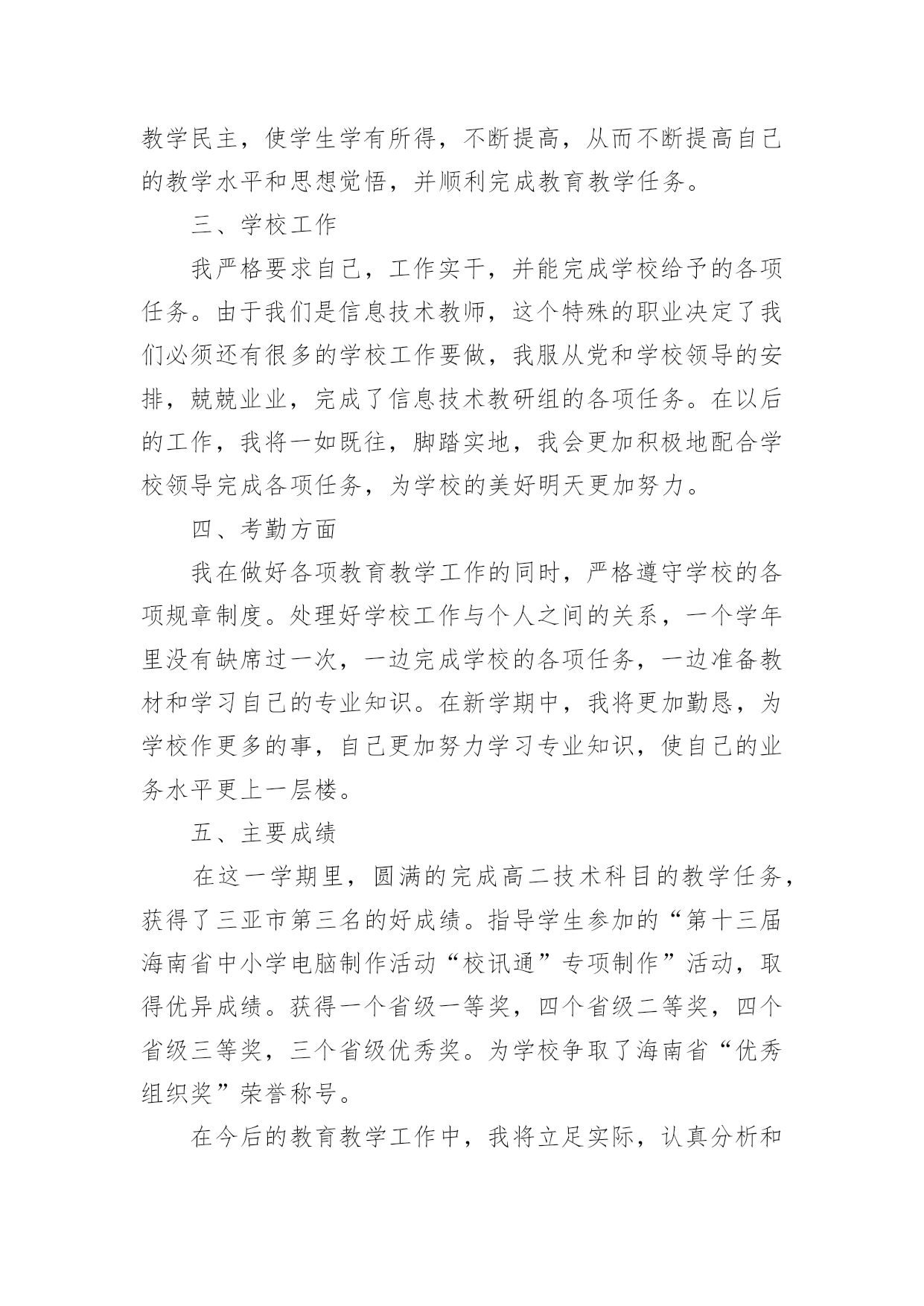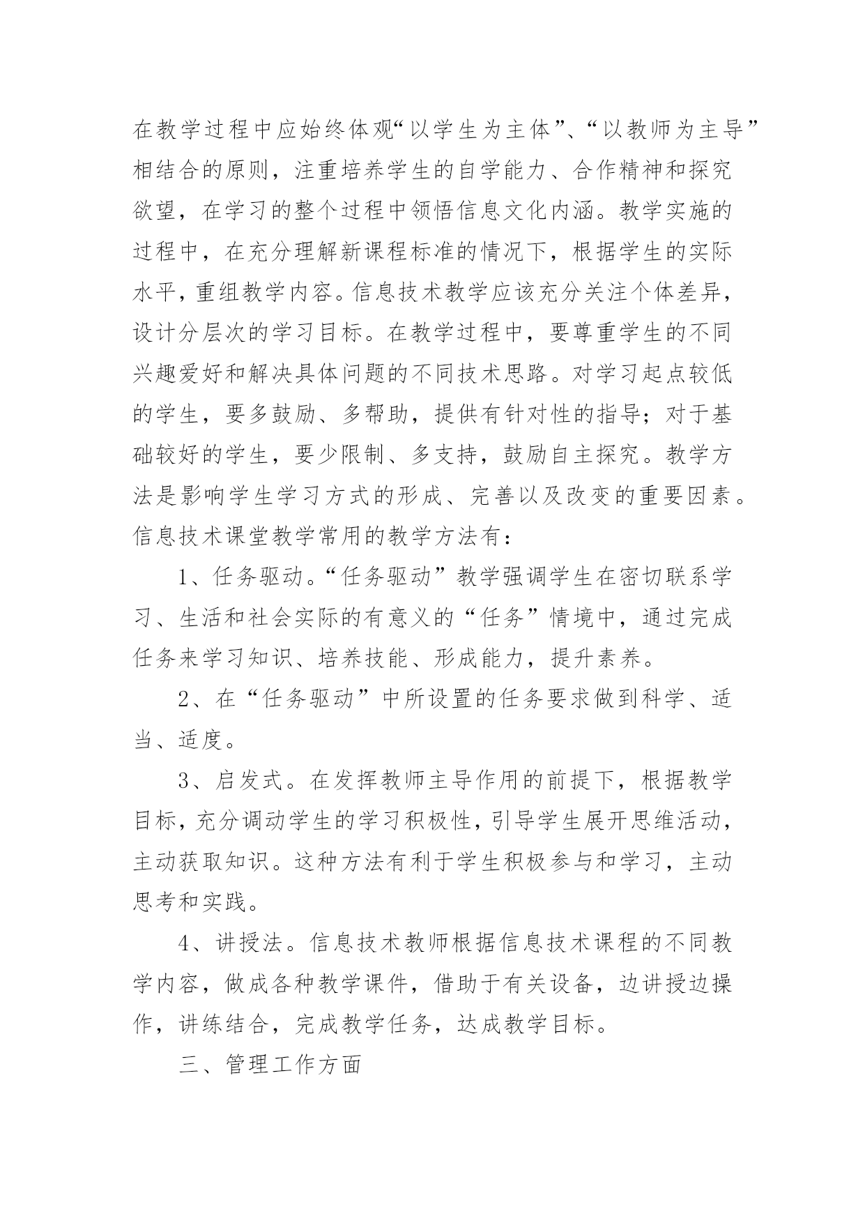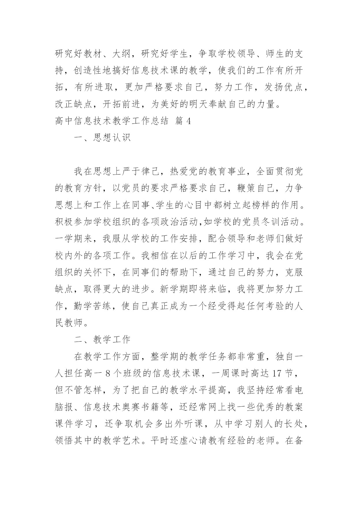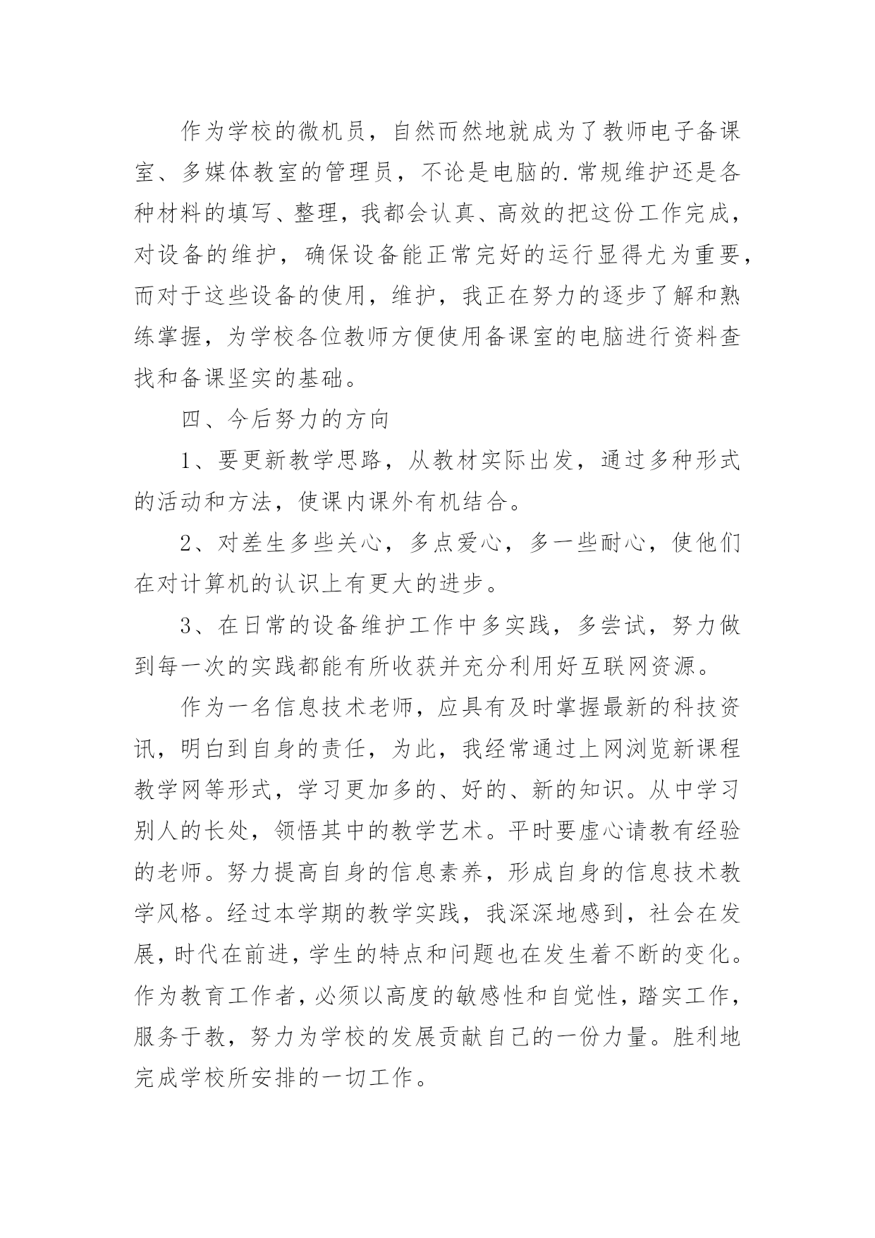 高中信息技术教学工作总结【推荐】高中信息技术教学工作总结4篇总结是事后对某一阶段的学习、工作或其完成情况加以回顾和分析的一种书面材料,它能够使头脑更加清醒,目标更加明确,不如静下心来好好写写总结吧。那么你知道总结如何写吗?下面是小编收集整理的高中信息技术教学工作总结4篇,欢迎阅读与收藏。高中信息技术教学工作总结篇1本学期教学内容为Photoshop电脑艺术设计,承接上学期的学习内容。原计划讲授完Ps工具箱、路径面板、调整命令与滤镜。结合实际,完成抠图专题、调色专题,并完成书籍装帧设计任务。在实际教学实施过程中,由于不断进行调整。最终部分内容进行删改,删节书籍装帧设计中光盘设计、作品展示竞标环节。添加了寸照修复与排版专题、Ps小挑战。一、本学期实际实施的教学内容如下:模块一:书籍装帧设计。细分:书签设计(1个课时)、摄影构图与素材获取(1个课时)、封面封底文件设置(1个课时)、封面设计(3个课时,其中2个课时为操作实践课)模块二:文字创意设计——矢量工作组的使用。细分:形状工具的使用与路径(1个课时)、文字创意设计——文字图层转形状图层并创意修饰(2个课时)、四季花海——剪贴蒙版(1个课时)、念亲恩——钢笔工具与路径控制文字排版(1个课时)、电脑桌面设计——路径转为选区(1个课时)、绘制念珠——路径描边(1个课时)模块三:寸照制作。细分:祛痘与美白(1个课时)、照片换底色(1个课时)、裁切与排版(1个课时)、实践(1个课时,学生利用课后提交作业)模块四:Ps小挑战。总共2个课时,学生下载素材,按照要求逐关挑战,完成任务举手示意,当堂给分。二、学期主要考核为:期中考试作品(书籍装帧设计,要求完成封面设计,配套光盘等设计作为附加分)+期末考试作品(寸照的处理与排版)+平时成绩三、本学期的教学成果主要有:1.总的来说,本学期课程内容充实,实用性强。根据学生提交的作品看,内容掌握的程度总体良好:期中期末作品基本全数提交,优秀作品占作品总数10%左右;平时作品提交数目在48份左右(每个班级平均人数为72人,机房平均60台电脑能用)。2.在教学实施过程中,我们本着积累校本课程资源的想法,完成课程任务的同时积累了一系列的课件、积件、案例素材。主要完成的课件有:书籍装帧设计课程中《封面尺寸设置》课件;《文字创意设计——Photoshop矢量工作组的使用》课件完成(该课件参与本届多媒体教育软件设计大奖赛,并被市教育局电教仪器站推荐参加省级竞赛);另有寸照专题的课件还在完善过程中。回顾过去这个学年,Ps分享学习课程在我校开展除了完成本学期模块,还完成了名片设计等模块。学生的操作水平对比去年有所提升。同时在思维导图、流程图等可视化思维工具的使用上也有一定的收获。四、这里得出以下几点可以作为下年课程的改进:1.课件、积件批量彩印,确保每张桌子有一份纸质材料,将每个知识点的积件装成一个资料包,学生在教师引导下按顺序学习。投影、广播经常性失灵,造成教师演示不便,一些概念性的知识点,学生通过查看纸质材料,完全有能力自学;这样操作也有利于分层教学。2.制作资料包目录、学案、学习任务单,以项目学习为主,推动课程实施。将学案、任务单印制发放给学生,学生可以通过学案引导,有规律地学习资料包内的积件;同时在自查表、量规的引导下对自身所学知识进行评价。3.继续坚持“进度接近,内容不同”的集体备课模式。同科组三个人上课风格不一致,所以集体备课一直都处于这样的状态,现已逐步习惯这样的教研模式;分头积累案例,开发积件,有利于课程设计开发前阶段的资源积累。4.划分时段在放学开放计算机房,让部分家里没电脑的学生可以课余自学。本校地处农村,有相当一部分学生家里尚未购置电脑,或者没接宽带网,课余提供机房与学习材料,可以给他们提供一定的帮助。高中信息技术教学工作总结篇2学期临近结束,回顾一学期以来的工作,不论是工作中还是自身的业务水平都得到了逐步的提高,充实了许多,也得到了许多,当在工作中发现问题时,我会认真思考,想办法解决。在这个学期中,本人能在保持原有良好工作态度的基础上,不断进步,不断进取,不断学习,虚心向有经验的老师学习。为了保持优良的工作姿态,以使下一学期能以更优秀的面貌去继续工作,现将本人该学期的工作情况进行全面的总结,总结如下:一、思想方面思想上严于律己,热爱教育事业,各方面约束自己,鞭策自己,对自己要求更为严格,力争在思想上、工作上在同事、学生的心目中树立良好的形象,使自己的思想再上一个新的台阶,同时也对自己思想上有了更加高的要求。努力提高自己的教学水平和业务水平,提高自身的思想觉悟。二、教学、工作方面这学期主要担任高一(8)、高一(9)、高一(11)及高二(6)等班级的信息技术教学和学校电子备课定、高一多媒体设备、行政办公室电脑的维护及管理工作。工作是繁忙的,相对