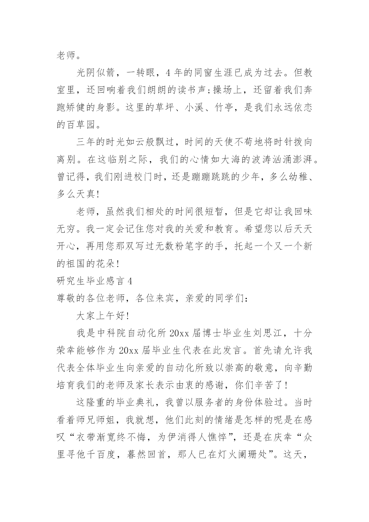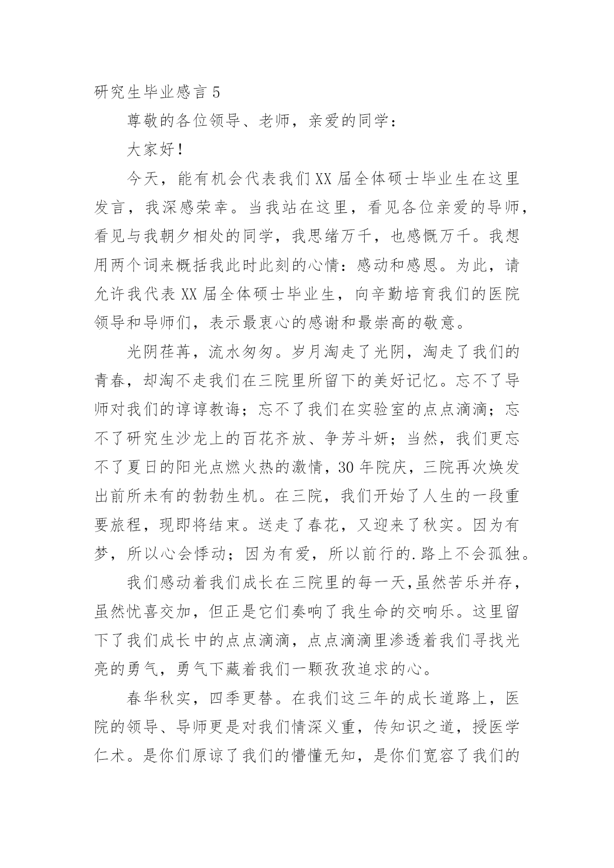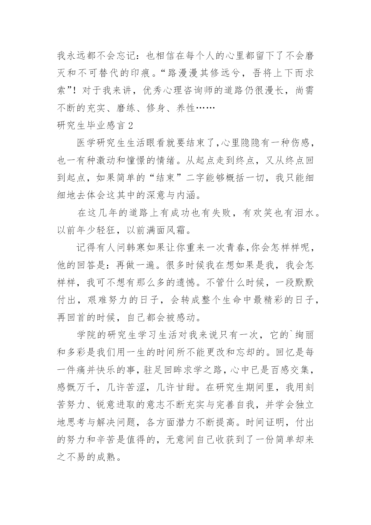 研究生毕业感言研究生毕业感言15篇在平日的学习、工作和生活里,我们时常会遇到不一样的人,经历不同的事,有不同的感触,这时可以将其记录在感言里,好好珍藏起来。但是写感言有什么要求呢?以下是小编帮大家整理的研究生毕业感言,欢迎阅读与收藏。研究生毕业感言1每个人暂时别离或安逸或紧张匆忙的工作,抛开各路纷烦,走近我们的心灵,开始了我们崭新的心路历程:小组活动与团体活动中,大家都抱着一种开放与接纳的心态,坦露胸襟,使我们的`心灵回到自然、温馨、舒适、随意的安放状态,让心灵得以放松、安祥与平静。每个人都有机会认真端详别人与探讨自己,有机会回归自己、回归真我。或许之前我们习惯审视别人,但这之后我们学会并实践着‘站在对方角度考虑问题’;或许之前我们有时怀疑爱的存在,但发现其实人人内心都非常渴望乃至因其珍贵而将其藏于心灵最深的地方。或许我们有时哀叹生活的不公与自己的不幸,但其实人人都会因生活的尖刺或利刃而受伤不浅,但庆幸大家都在磨砺中不同地坚强与成长着。所以我们应该感谢生活,如果不是它,我们不会有如此的聪慧与感悟!2年的日子说长也不长,说短也不短,在这2年的学习我永远都不会忘记:也相信在每个人的心里都留下了不会磨灭和不可替代的印痕。“路漫漫其修远兮,吾将上下而求索”!对于我来讲,优秀心理咨询师的道路仍很漫长,尚需不断的充实、磨练、修身、养性……研究生毕业感言2医学研究生生活眼看就要结束了,心里隐隐有一种伤感,也一有种激动和憧憬的情绪。从起点走到终点,又从终点回到起点,如果简单的“结束”二字能够概括一切,我只能细细地去体会这其中的深意与内涵。在这几年的道路上有成功也有失败,有欢笑也有泪水。以前年少轻狂,以前满面风霜。记得有人问韩寒如果让你重来一次青春,你会怎样样呢,他的回答是:再做一遍。很多时候我在想如果是我,我会怎样样,我可不想有那么多的遗憾。不管什么时候,一段默默付出,艰难努力的日子,会转成整个生命中最精彩的日子,再回首的时候,自己都会被感动。学院的研究生学习生活对我来说只有一次,它的`绚丽和多彩是我们用一生的时间所不能更改和忘却的。回忆是每一件痛并快乐的事,驻足回眸求学之路,心中已是百感交集,感慨万千,几许苦涩,几许甘甜。在研究生期间里,我用刻苦努力、锐意进取的意志不断充实与完善自我,并学会独立地思考与解决问题,各方面潜力不断提高。时间证明,付出的努力和辛苦是值得的,无意间自己收获到了一份简单却来之不易的成熟。一时感慨说了这么多,只是期望还在校园的师弟师妹们能够去认真的思考,自己在毕业之后想要的是怎样的一种生活,如果你说你想要的毕业之后都有,那么你此刻仍然能够去做喜欢的事,不然的话,就就应去好好想一下了,如果这时候你感觉到了迷茫,不明白想要什么,那么你就应找一个方向去努力,在这个努力的过程中,以后的路会慢慢变得清晰,生活是慢慢摸索出来的,而不是凭空去想。另外,推荐同学们在毕业这两年尽可能的去一些一线城市待一待,接触得多了,看的多了,你的思想也会随着改变,可能的话短时候内会学到了更多的经验,这样你以后升职、跳槽、创业或者在生活上,思考问题也会变得不一样。同样的生活,透过辛苦努力而得到,远比凭空而来要收获的多。最后,引用《十月围城》的一句话,我改了改就是:欲求理想之幸福,不得不经理想之痛苦,这痛苦就叫做生活。研究生毕业感言3忘不了您和风细雨般的话语,荡涤了我心灵上的尘泥;忘不了您浩荡东风般的叮咛,鼓起我前进的勇气。老师,我终生感激您!在我的记忆里,除了家人外便是您;在我的人生里,最慈祥的便是您;在我的旅程里,最让我怀念的也是您。以后我会想念您。蜡烛,照亮了人生,带给人们光明,而自己的生命却会燃烧到尽头。老师,您就是照亮我们人生的蜡烛,我们将永远敬爱您,感谢您。您是严冬里的炭火,是酷暑里的浓荫洒湍流中的踏脚石,是雾海中的航标灯――老师啊,您言传身教,育人有方,甘为人梯,令人难忘!因为您的一片爱心的灌浇,一番耕耘的辛劳,才会有桃李的绚丽,稻麦的金黄。愿我的谢意化成一束不凋的鲜花,给您的生活带来芬芳。老师,当了您六年学生,我明白了:老师是一位辛勤的园丁,无微不至地培养着我们这棵小树苗。老师,我们永远忘不了您对我们的恩情。今天,你用春雨灌溉着我们,让我们茁壮成长;而当我们长成参天大树时,你却如绿叶,在树丛中默默地笑着。你的付出,我们终生难忘!有一种爱无与伦比,有一种情无法忘记,那就是老师的爱和情。有人说,老师您已经找到了自己的位置,其实,您的'坐标只在我们学生的心里。假如我能搏击天空,那是您给了我腾飞的翅膀;假如是击浪勇士,那是您给了我弄潮的力量;假如我是不灭的火炬,那是您给了我青春的光亮。你的一句句话就是一首首震撼人心的歌,久久地萦绕于耳际,深深地铭刻于心中。纵然走到天涯海角,也忘不了你那春风化雨般的熟悉的声音。能拥有一位您这样的老师,是我的荣幸