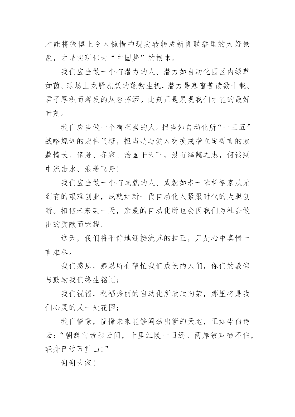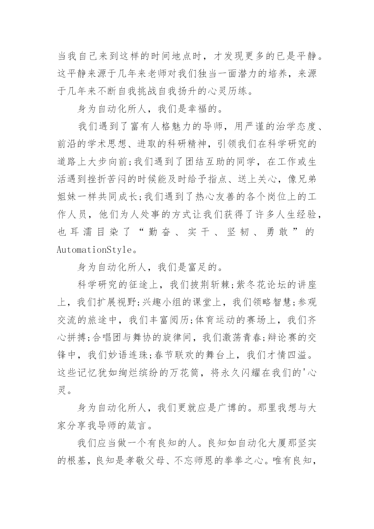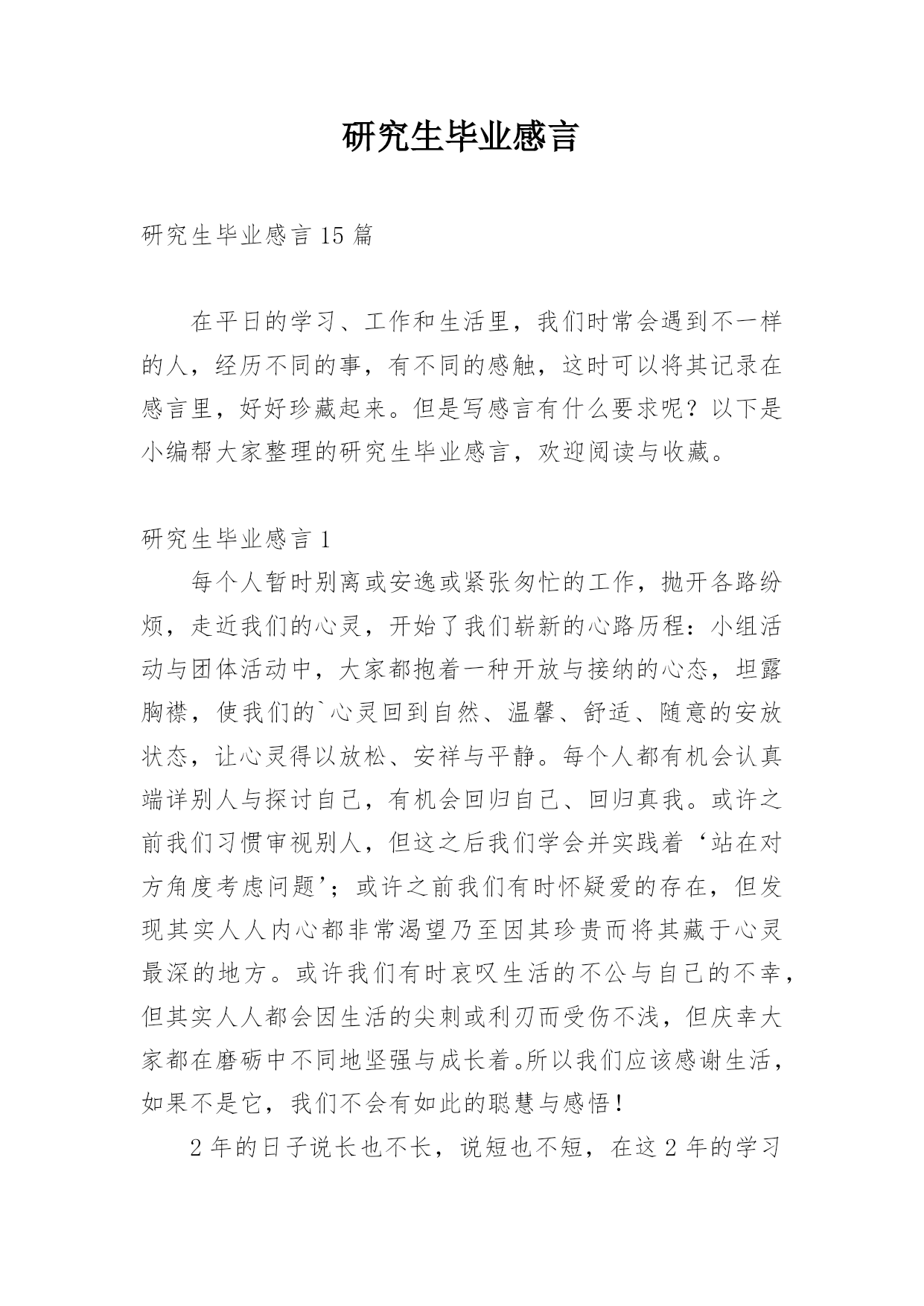 研究生毕业感言研究生毕业感言15篇在平日的学习、工作和生活里,我们时常会遇到不一样的人,经历不同的事,有不同的感触,这时可以将其记录在感言里,好好珍藏起来。但是写感言有什么要求呢?以下是小编帮大家整理的研究生毕业感言,欢迎阅读与收藏。研究生毕业感言1每个人暂时别离或安逸或紧张匆忙的工作,抛开各路纷烦,走近我们的心灵,开始了我们崭新的心路历程:小组活动与团体活动中,大家都抱着一种开放与接纳的心态,坦露胸襟,使我们的`心灵回到自然、温馨、舒适、随意的安放状态,让心灵得以放松、安祥与平静。每个人都有机会认真端详别人与探讨自己,有机会回归自己、回归真我。或许之前我们习惯审视别人,但这之后我们学会并实践着‘站在对方角度考虑问题’;或许之前我们有时怀疑爱的存在,但发现其实人人内心都非常渴望乃至因其珍贵而将其藏于心灵最深的地方。或许我们有时哀叹生活的不公与自己的不幸,但其实人人都会因生活的尖刺或利刃而受伤不浅,但庆幸大家都在磨砺中不同地坚强与成长着。所以我们应该感谢生活,如果不是它,我们不会有如此的聪慧与感悟!2年的日子说长也不长,说短也不短,在这2年的学习我永远都不会忘记:也相信在每个人的心里都留下了不会磨灭和不可替代的印痕。“路漫漫其修远兮,吾将上下而求索”!对于我来讲,优秀心理咨询师的道路仍很漫长,尚需不断的充实、磨练、修身、养性……研究生毕业感言2医学研究生生活眼看就要结束了,心里隐隐有一种伤感,也一有种激动和憧憬的情绪。从起点走到终点,又从终点回到起点,如果简单的“结束”二字能够概括一切,我只能细细地去体会这其中的深意与内涵。在这几年的道路上有成功也有失败,有欢笑也有泪水。以前年少轻狂,以前满面风霜。记得有人问韩寒如果让你重来一次青春,你会怎样样呢,他的回答是:再做一遍。很多时候我在想如果是我,我会怎样样,我可不想有那么多的遗憾。不管什么时候,一段默默付出,艰难努力的日子,会转成整个生命中最精彩的日子,再回首的时候,自己都会被感动。学院的研究生学习生活对我来说只有一次,它的`绚丽和多彩是我们用一生的时间所不能更改和忘却的。回忆是每一件痛并快乐的事,驻足回眸求学之路,心中已是百感交集,感慨万千,几许苦涩,几许甘甜。在研究生期间里,我用刻苦努力、锐意进取的意志不断充实与完善自我,并学会独立地思考与解决问题,各方面潜力不断提高。时间证明,付出的努力和辛苦是值得的,无意间自己收获到了一份简单却来之不易的成熟。一时感慨说了这么多,只是期望还在校园的师弟师妹们能够去认真的思考,自己在毕业之后想要的是怎样的一种生活,如果你说你想要的毕业之后都有,那么你此刻仍然能够去做喜欢的事,不然的话,就就应去好好想一下了,如果这时候你感觉到了迷茫,不明白想要什么,那么你就应找一个方向去努力,在这个努力的过程中,以后的路会慢慢变得清晰,生活是慢慢摸索出来的,而不是凭空去想。另外,推荐同学们在毕业这两年尽可能的去一些一线城市待一待,接触得多了,看的多了,你的思想也会随着改变,可能的话短时候内会学到了更多的经验,这样你以后升职、跳槽、创业或者在生活上,思考问题也会变得不一样。同样的生活,透过辛苦努力而得到,远比凭空而来要收获的多。最后,引用《十月围城》的一句话,我改了改就是:欲求理想之幸福,不得不经理想之痛苦,这痛苦就叫做生活。研究生毕业感言3忘不了您和风细雨般的话语,荡涤了我心灵上的尘泥;忘不了您浩荡东风般的叮咛,鼓起我前进的勇气。老师,我终生感激您!在我的记忆里,除了家人外便是您;在我的人生里,最慈祥的便是您;在我的旅程里,最让我怀念的也是您。以后我会想念您。蜡烛,照亮了人生,带给人们光明,而自己的生命却会燃烧到尽头。老师,您就是照亮我们人生的蜡烛,我们将永远敬爱您,感谢您。您是严冬里的炭火,是酷暑里的浓荫洒湍流中的踏脚石,是雾海中的航标灯――老师啊,您言传身教,育人有方,甘为人梯,令人难忘!因为您的一片爱心的灌浇,一番耕耘的辛劳,才会有桃李的绚丽,稻麦的金黄。愿我的谢意化成一束不凋的鲜花,给您的生活带来芬芳。老师,当了您六年学生,我明白了:老师是一位辛勤的园丁,无微不至地培养着我们这棵小树苗。老师,我们永远忘不了您对我们的恩情。今天,你用春雨灌溉着我们,让我们茁壮成长;而当我们长成参天大树时,你却如绿叶,在树丛中默默地笑着。你的付出,我们终生难忘!有一种爱无与伦比,有一种情无法忘记,那就是老师的爱和情。有人说,老师您已经找到了自己的位置,其实,您的'坐标只在我们学生的心里。假如我能搏击天空,那是您给了我腾飞的翅膀;假如是击浪勇士,那是您给了我弄潮的力量;假如我是不灭的火炬,那是您给了我青春的光亮。你的一句句话就是一首首震撼人心的歌,久久地萦绕于耳际,深深地铭刻于心中。纵然走到天涯海角,也忘不了你那春风化雨般的熟悉的声音。能拥有一位您这样的老师,是我的荣幸