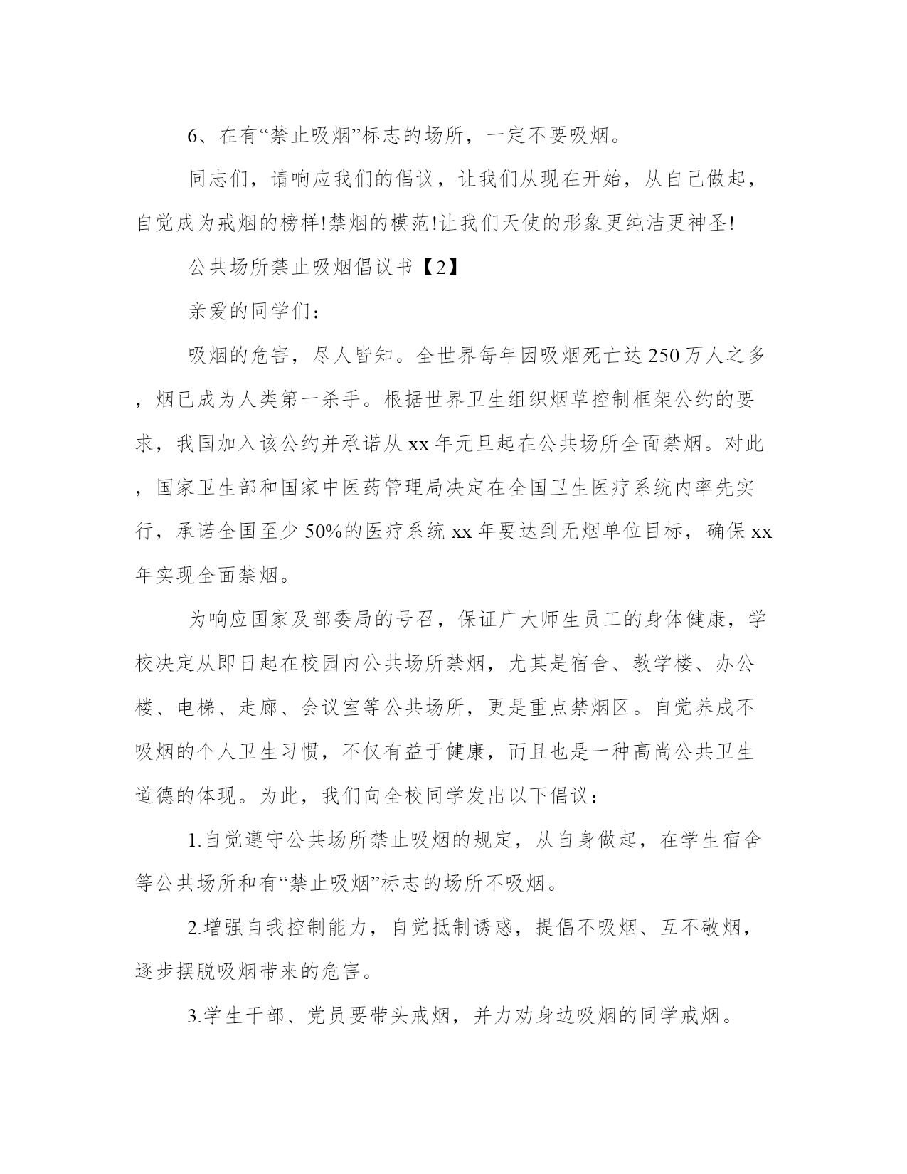 公共场所禁止吸烟倡议书三篇全院职工:吸烟能使人的机体免疫力降低,容易使细菌、病毒等病源体入侵人体,损害健康。吸烟与肺癌、肺气肿、心脏病、中风和其它癌症等25种以上危及生命和健康的疾病有关。在我国,每年因吸烟而染病去世的人超过百万,死于被动吸烟的人超过10万。因吸烟导致的疾病造成医疗费用增加、劳动力丧失、过早死亡和家庭收入的下降,对社会和家庭带来极大危害。吸烟有百害而无一利,地球人都知道,医务人员更清楚。医务人员从事着最崇高的职业,是健康的使者,一定要率先垂范,给我们的大众、给我们自己创造一方洁净的乐土!作为救死扶伤的白衣战士,有什么理由不戒烟、不禁烟。因此,要革除吸烟、禁止在公共场所吸烟,为创建文明社会、塑造和谐就医环境是那么的至关重要,同时又是我院每一位职工义不容辞的责任。为此,我们向全院医务人员发出如下倡议:1、在病区、门急诊、办公室等不吸烟;2、在医院公共场所不吸烟;3、在家中不吸烟,或尽可能少吸烟;4、不在病人、家属面前吸烟。5、吸烟时要避开非吸烟者,以防他人吸食“二手烟”;6、在有“禁止吸烟”标志的场所,一定不要吸烟。同志们,请响应我们的倡议,让我们从现在开始,从自己做起,自觉成为戒烟的榜样!禁烟的模范!让我们天使的形象更纯洁更神圣!公共场所禁止吸烟倡议书【2】亲爱的同学们:吸烟的危害,尽人皆知。全世界每年因吸烟死亡达250万人之多,烟已成为人类第一杀手。根据世界卫生组织烟草控制框架公约的要求,我国加入该公约并承诺从xx年元旦起在公共场所全面禁烟。对此,国家卫生部和国家中医药管理局决定在全国卫生医疗系统内率先实行,承诺全国至少50%的医疗系统xx年要达到无烟单位目标,确保xx年实现全面禁烟。为响应国家及部委局的号召,保证广大师生员工的身体健康,学校决定从即日起在校园内公共场所禁烟,尤其是宿舍、教学楼、办公楼、电梯、走廊、会议室等公共场所,更是重点禁烟区。自觉养成不吸烟的个人卫生习惯,不仅有益于健康,而且也是一种高尚公共卫生道德的体现。为此,我们向全校同学发出以下倡议:1.自觉遵守公共场所禁止吸烟的规定,从自身做起,在学生宿舍等公共场所和有“禁止吸烟”标志的场所不吸烟。2.增强自我控制能力,自觉抵制诱惑,提倡不吸烟、互不敬烟,逐步摆脱吸烟带来的危害。3.学生干部、党员要带头戒烟,并力劝身边吸烟的同学戒烟。4.学生公寓楼委会成立“戒烟俱乐部”,希望吸烟同学主动参加并接受监督。学生工作处及公寓管理中心要对在寝室等公共场所吸烟行为进行查处,对违反规定者进行批评教育、通报批评或纪律处分。希望全校同学能够响应倡议,争做一名讲文明、守纪律、有毅力的当代大学生。公共场所禁止吸烟倡议书【3】尊敬的市民朋友们:吸烟有害健康、导致多种疾病,这是数亿吸烟者和各国专家证实的一个无可争议的事实。吸烟不但给人们带来疾病,而且还会引发火灾,直接危及人民群众的身体健康和生命安全。公共场所吸烟不仅是一种不健康、不文明的生活习惯,更是吸烟者对公共场所环境、周围人群的一种巨大危害。据分析资料表明,吸烟者吸烟时对旁人的危害比对自己还要大,一些与吸烟者共同生活的人,患肺癌的几率比常人多出6倍。因此,公共场所禁烟工作刻不容缓,意义重大。xx年3月22日,卫生部颁布了公共场所卫生管理条例实施细则并于xx年5月1日起施行,明确规定了“室内公共场所禁止吸烟”,这是我国履行烟草控制框架公约的重大进展,体现了政府对人民群众健康权益的保护。今年9月24日,市人民政府第9次常务会议通过了XX市公共场所禁止吸烟管理办法,决定从xx年11月1日起对全市公共场所全面禁烟。该办法的出台旨在保护人民群众的身体健康和生命安全,充分体现了市委、市政府对公共场所禁烟工作的高度重视,必将对我市创建全国文明城市、国家环保模范城市和巩固国家卫生城市工作起到巨大的促进作用。市民朋友们,全民健康是经济发展、社会进步、民族兴旺的基本保证,健康更是人生最大的财富,维护他人健康也是我们每一个公民的责任和义务。在此,我们发出如下倡议:1、广大市民和社会各界要积极参与到禁烟行动中来,从自身做起,不在公共场所吸烟,自觉维护公共场所的无烟环境,争做无烟环境保护的模范。2、广大公务员、企事业单位工作人员、医务人员、人民教师要以身作则,率先垂范,严格遵守禁烟相关规定,带动全社会创建室内无烟环境。3、在全市范围内出租车和公共汽车等各类交通工具实行全面禁烟,司乘人员要主动劝阻吸烟行为。4、全市各医院、车站、学校、工厂、社区等要积极开展“无烟单位”创建活动,营造争创无烟环境的良好氛围。5、各级各类机关、企事业单位要积极制定本单位禁烟措施,创建无烟环境,为我市创造清洁、健康、安全的无烟环境。
