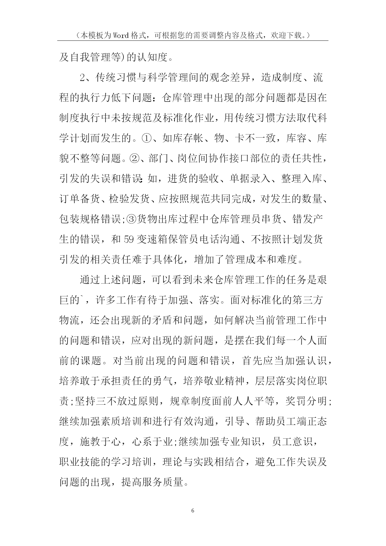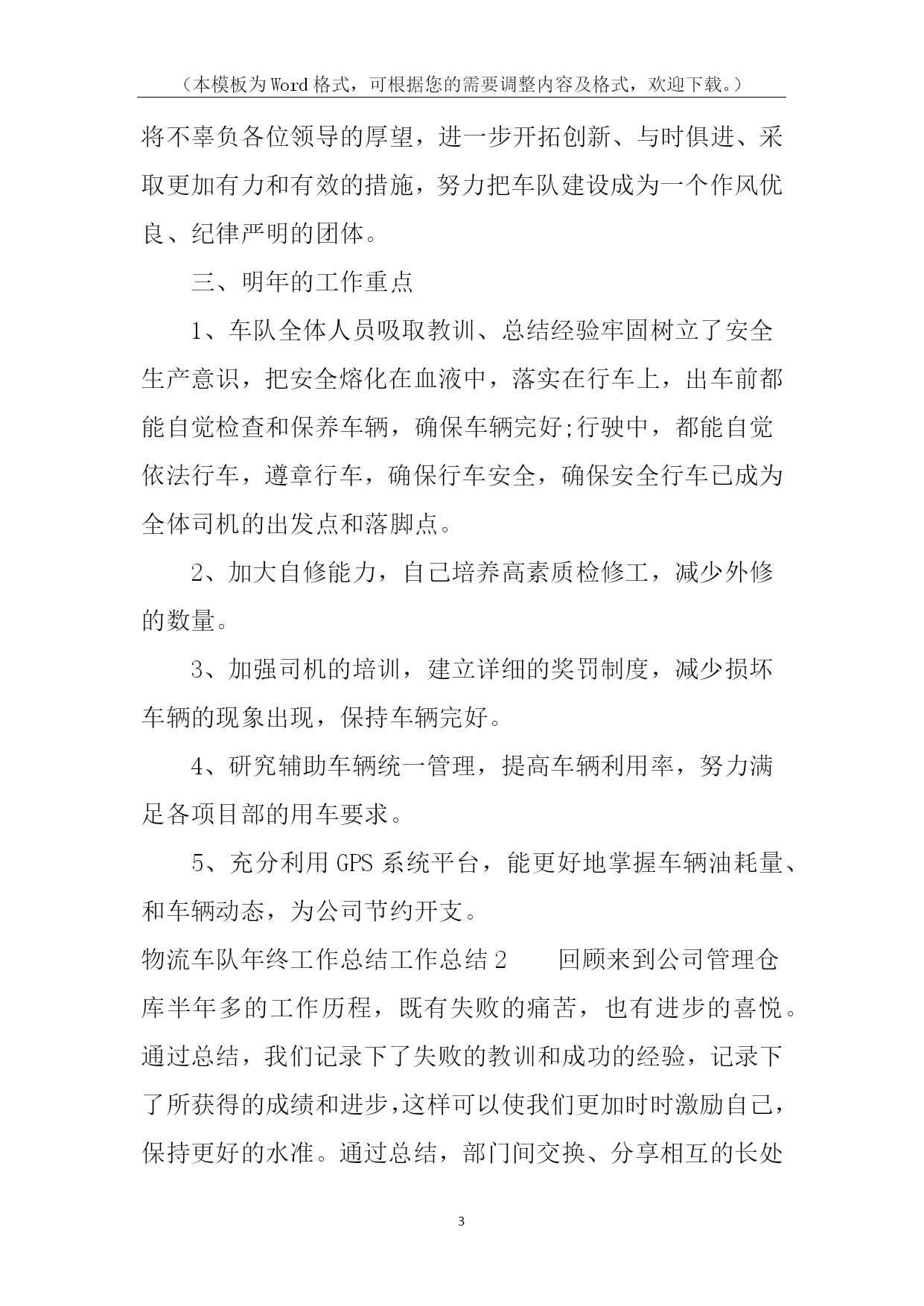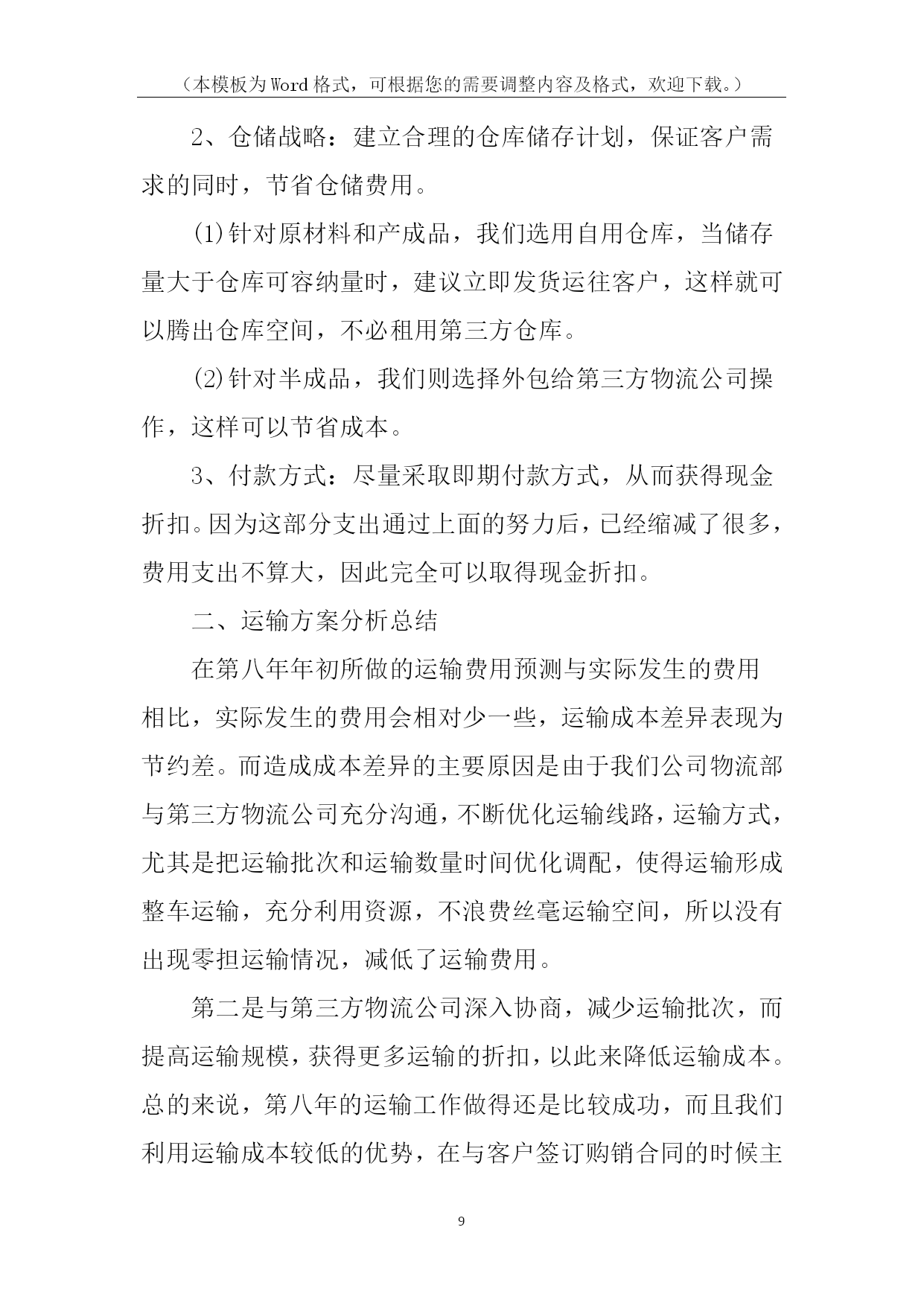 (本模板为Word格式,可根据您的需要调整内容及格式,欢迎下载。)PAGE\*MERGEFORMAT12物流车队年终工作总结物流车队年终工作总结工作总结1不知不觉中,新的一年已经飘然而至,在这新、旧年交替之即,我们不但要总结过去一年的成绩与失误,也要确定下一年的工作目标,制定下一年的工作计划。在公司领导的正确领导和指引下和在车队全体员工的共同努力,车队创造了一定的经济效益,但是也存在一些生产安全问题。在和项目部的紧密配合下,使公司机械在各项工作发挥着重要作用,也取得了一定的成绩。现简要对全年的工作做以下方面的总结:一、狠抓安全,绝不放松安全工作是我队重中之重的工作,可以说:没有安全就没有一切,丧失安全就会丧失一切,一百减一等于零。车队全年自始自终狠抓安全管理,时时事事严加防范,按章操作机械设备,时刻注意效益和安全,坚持安全第一,预防为主的原则。为加强安全教育,针对部分司机对环境不够熟悉的情况,车队每次开前会都对司机进行车辆安全教育及安全操作的培训,增强司机的安全意识和操作技能。在公司领导的指导下车队建立了《车辆运行管理制度》,明确规定了驾驶员在运送人员、运送物料时的安全行为,以及车辆的停放,保养规范。二、加强车队管理,提高工作效率车队按照公司规定对司机进行严格要求,要求司机必须爱护车辆,始终保证车辆状态良好,保证安全运行,对车辆随时检查、定期保养、及时维修车队严格执行调度安排。当车队接到工作任务时,坚持“分清主次、把握缓急、合理调度、严格把关、严格控制”的原则,掌握任务的性质和实际情况及时派出车辆,保障生产正常运行。在车队管理人员和全体员工的共同努力下,车队一年来顺利配合各项目部完成各项工作。存在问题1、一年来由于个别司机对安全生产的意识淡薄,导致两起安全事故的发生,车队负责人及后勤人员愿接受公司领导的批评与处罚。2、由于车队车辆数量的限制,虽然经过认真合理的调配,当生产任务紧张时,仍然发生无法满足各项目部对车辆使用的要求。3、车队维修人员不够用,在遇有紧急机械或车辆故障时不能及时的处理。虽然我们还面临一些问题和困难,但相信在主管领导的正确指导关心下,这些问题和困难都将逐步得到解决。车队将不辜负各位领导的厚望,进一步开拓创新、与时俱进、采取更加有力和有效的措施,努力把车队建设成为一个作风优良、纪律严明的团体。三、明年的工作重点1、车队全体人员吸取教训、总结经验牢固树立了安全生产意识,把安全熔化在血液中,落实在行车上,出车前都能自觉检查和保养车辆,确保车辆完好;行驶中,都能自觉依法行车,遵章行车,确保行车安全,确保安全行车已成为全体司机的出发点和落脚点。2、加大自修能力,自己培养高素质检修工,减少外修的数量。3、加强司机的培训,建立详细的奖罚制度,减少损坏车辆的现象出现,保持车辆完好。4、研究辅助车辆统一管理,提高车辆利用率,努力满足各项目部的用车要求。5、充分利用GPS系统平台,能更好地掌握车辆油耗量、和车辆动态,为公司节约开支。物流车队年终工作总结工作总结2回顾来到公司管理仓库半年多的工作历程,既有失败的痛苦,也有进步的喜悦。通过总结,我们记录下了失败的教训和成功的经验,记录下了所获得的成绩和进步,这样可以使我们更加时时激励自己,保持更好的水准。通过总结,部门间交换、分享相互的长处和短处,经验和教训,感受着团队的温暖,从而收获关切和期望;通过总结,把优势继续用于未来的工作,并有针对性、计划性地去改变总结出来的不足和缺陷,在今后的工作中加以提高和改进。在公司领导的正确指挥、各部门的积极协助配合下,仓库的各项工作始终围绕着库存货物安全、库存数据准确、作业标准规化、运营配送高效率、热情服务高质量的目标开展工作。首先建立建全了各岗位工作职责,规范了各项业务流转程序;结合公司经营实践,完善了库存单据据管理和库存数据的规范管理;与此同时,还对库区建设进行了改造,仓库分区、货物分类、标识建设的完善,标志着仓储管理标准化进程的全面启动。特别是仓库现场管理的严格要求,较好的改变了过去那种不用的杂物,包装材料、使用工具及废损包装物随处可见,杂乱无章的现象。对货物堆码,分拣备货标准细致化,也随着整顿、整理、清洁、清扫,素质的学习开展。货物的收、整、发、存管理工作,伴随着岗位责任制的贯彻落实,得到了全面提升。对仓库历史遗留的呆滞货物,不良品,、返厂货物进行了彻底清理,并建立了相应区域,为今后此项工作的顺利开展奠定了基础。如今日常管理中的所收、发货物(含退货入库)数据准确率为95%以上。仓库货物码放整齐、横竖成行,并按分类、规格型号摆放,编号与货位基本保持一致。各项作业完毕,能及时清理工具、包装物。在严格遵循公司的相关制度及作业流程的同时,积极配合完成货物进库验收工作,保证了库存货物原始数据的准确性、真实性;在规定时间内,保质保量完