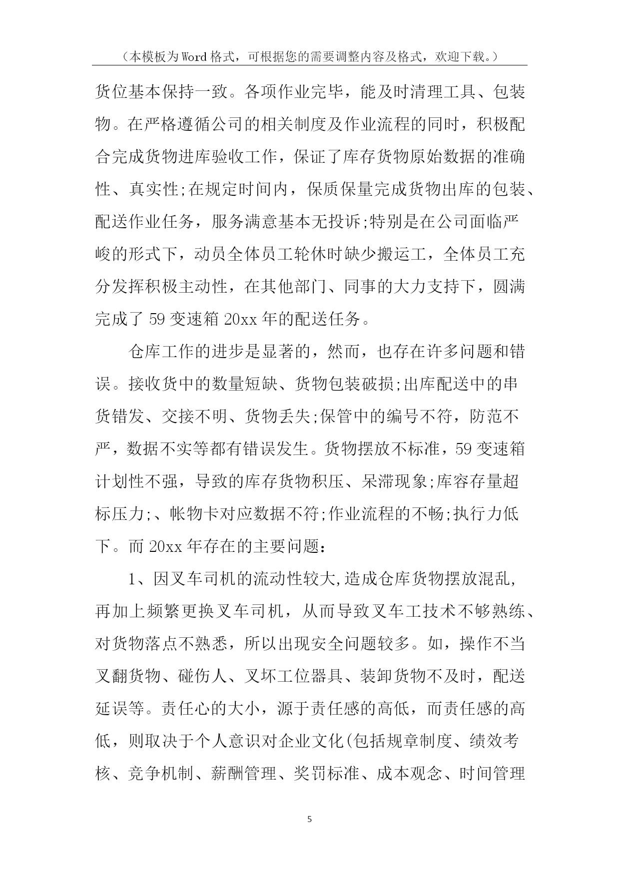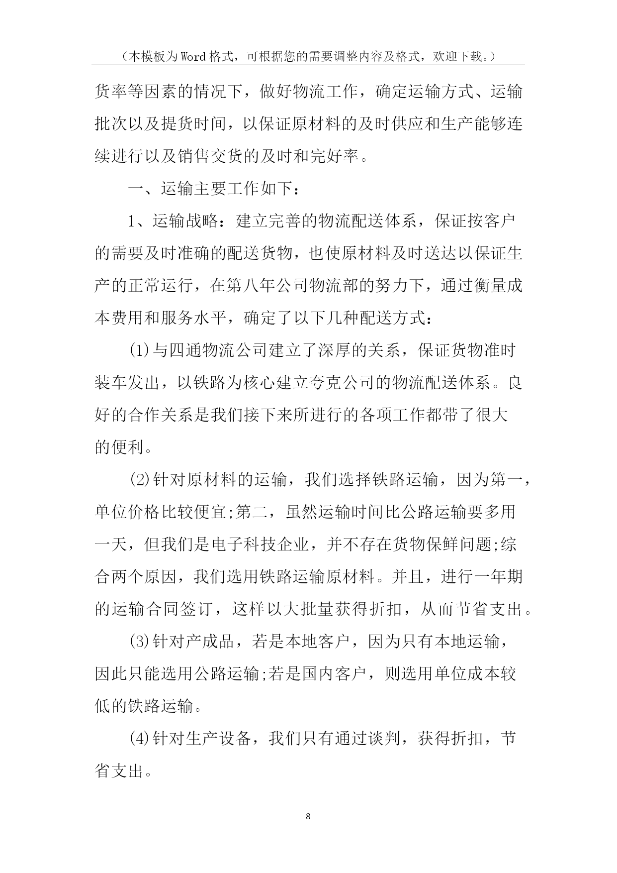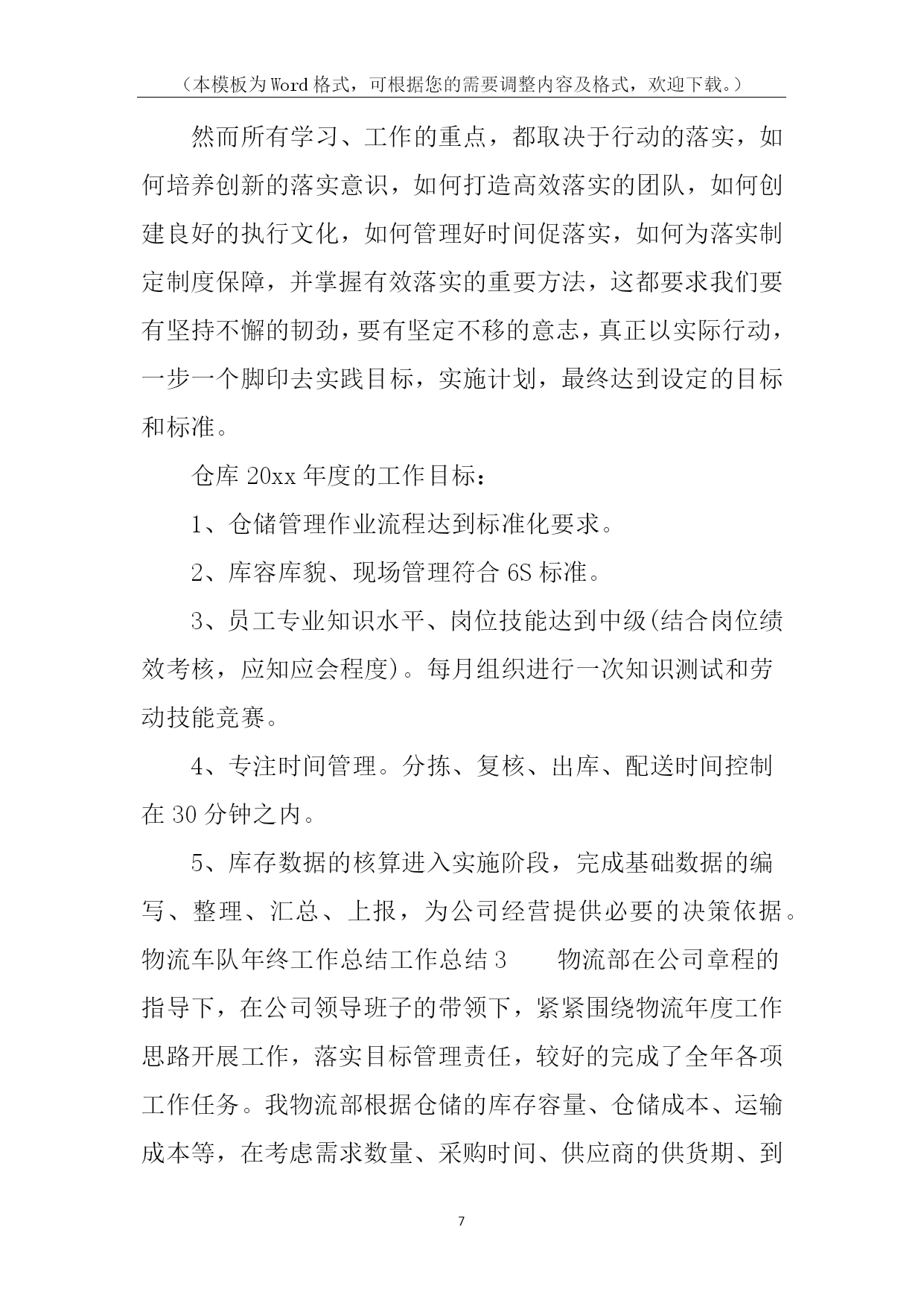 (本模板为Word格式,可根据您的需要调整内容及格式,欢迎下载。)PAGE\*MERGEFORMAT12物流车队年终工作总结物流车队年终工作总结工作总结1不知不觉中,新的一年已经飘然而至,在这新、旧年交替之即,我们不但要总结过去一年的成绩与失误,也要确定下一年的工作目标,制定下一年的工作计划。在公司领导的正确领导和指引下和在车队全体员工的共同努力,车队创造了一定的经济效益,但是也存在一些生产安全问题。在和项目部的紧密配合下,使公司机械在各项工作发挥着重要作用,也取得了一定的成绩。现简要对全年的工作做以下方面的总结:一、狠抓安全,绝不放松安全工作是我队重中之重的工作,可以说:没有安全就没有一切,丧失安全就会丧失一切,一百减一等于零。车队全年自始自终狠抓安全管理,时时事事严加防范,按章操作机械设备,时刻注意效益和安全,坚持安全第一,预防为主的原则。为加强安全教育,针对部分司机对环境不够熟悉的情况,车队每次开前会都对司机进行车辆安全教育及安全操作的培训,增强司机的安全意识和操作技能。在公司领导的指导下车队建立了《车辆运行管理制度》,明确规定了驾驶员在运送人员、运送物料时的安全行为,以及车辆的停放,保养规范。二、加强车队管理,提高工作效率车队按照公司规定对司机进行严格要求,要求司机必须爱护车辆,始终保证车辆状态良好,保证安全运行,对车辆随时检查、定期保养、及时维修车队严格执行调度安排。当车队接到工作任务时,坚持“分清主次、把握缓急、合理调度、严格把关、严格控制”的原则,掌握任务的性质和实际情况及时派出车辆,保障生产正常运行。在车队管理人员和全体员工的共同努力下,车队一年来顺利配合各项目部完成各项工作。存在问题1、一年来由于个别司机对安全生产的意识淡薄,导致两起安全事故的发生,车队负责人及后勤人员愿接受公司领导的批评与处罚。2、由于车队车辆数量的限制,虽然经过认真合理的调配,当生产任务紧张时,仍然发生无法满足各项目部对车辆使用的要求。3、车队维修人员不够用,在遇有紧急机械或车辆故障时不能及时的处理。虽然我们还面临一些问题和困难,但相信在主管领导的正确指导关心下,这些问题和困难都将逐步得到解决。车队将不辜负各位领导的厚望,进一步开拓创新、与时俱进、采取更加有力和有效的措施,努力把车队建设成为一个作风优良、纪律严明的团体。三、明年的工作重点1、车队全体人员吸取教训、总结经验牢固树立了安全生产意识,把安全熔化在血液中,落实在行车上,出车前都能自觉检查和保养车辆,确保车辆完好;行驶中,都能自觉依法行车,遵章行车,确保行车安全,确保安全行车已成为全体司机的出发点和落脚点。2、加大自修能力,自己培养高素质检修工,减少外修的数量。3、加强司机的培训,建立详细的奖罚制度,减少损坏车辆的现象出现,保持车辆完好。4、研究辅助车辆统一管理,提高车辆利用率,努力满足各项目部的用车要求。5、充分利用GPS系统平台,能更好地掌握车辆油耗量、和车辆动态,为公司节约开支。物流车队年终工作总结工作总结2回顾来到公司管理仓库半年多的工作历程,既有失败的痛苦,也有进步的喜悦。通过总结,我们记录下了失败的教训和成功的经验,记录下了所获得的成绩和进步,这样可以使我们更加时时激励自己,保持更好的水准。通过总结,部门间交换、分享相互的长处和短处,经验和教训,感受着团队的温暖,从而收获关切和期望;通过总结,把优势继续用于未来的工作,并有针对性、计划性地去改变总结出来的不足和缺陷,在今后的工作中加以提高和改进。在公司领导的正确指挥、各部门的积极协助配合下,仓库的各项工作始终围绕着库存货物安全、库存数据准确、作业标准规化、运营配送高效率、热情服务高质量的目标开展工作。首先建立建全了各岗位工作职责,规范了各项业务流转程序;结合公司经营实践,完善了库存单据据管理和库存数据的规范管理;与此同时,还对库区建设进行了改造,仓库分区、货物分类、标识建设的完善,标志着仓储管理标准化进程的全面启动。特别是仓库现场管理的严格要求,较好的改变了过去那种不用的杂物,包装材料、使用工具及废损包装物随处可见,杂乱无章的现象。对货物堆码,分拣备货标准细致化,也随着整顿、整理、清洁、清扫,素质的学习开展。货物的收、整、发、存管理工作,伴随着岗位责任制的贯彻落实,得到了全面提升。对仓库历史遗留的呆滞货物,不良品,、返厂货物进行了彻底清理,并建立了相应区域,为今后此项工作的顺利开展奠定了基础。如今日常管理中的所收、发货物(含退货入库)数据准确率为95%以上。仓库货物码放整齐、横竖成行,并按分类、规格型号摆放,编号与货位基本保持一致。各项作业完毕,能及时清理工具、包装物。在严格遵循公司的相关制度及作业流程的同时,积极配合完成货物进库验收工作,保证了库存货物原始数据的准确性、真实性;在规定时间内,保质保量完