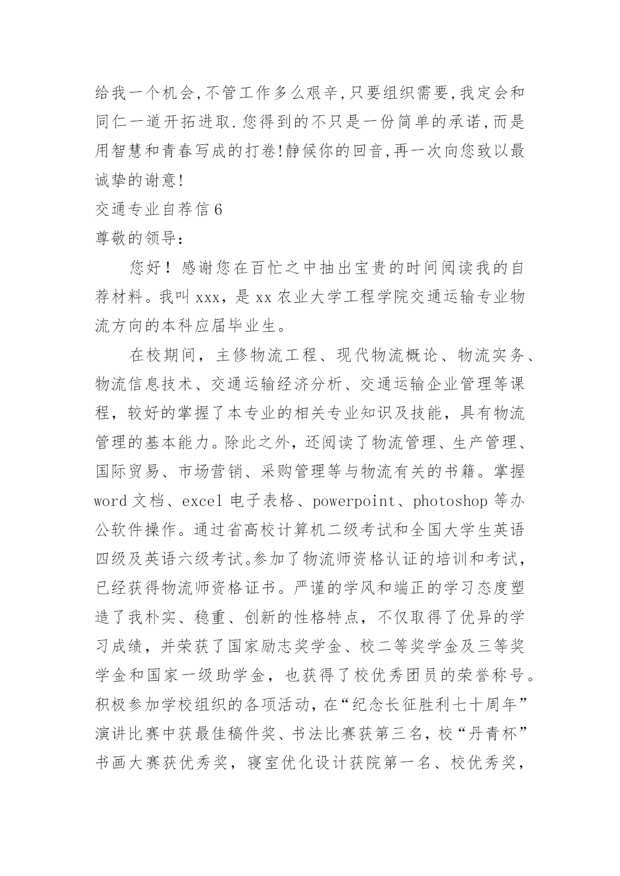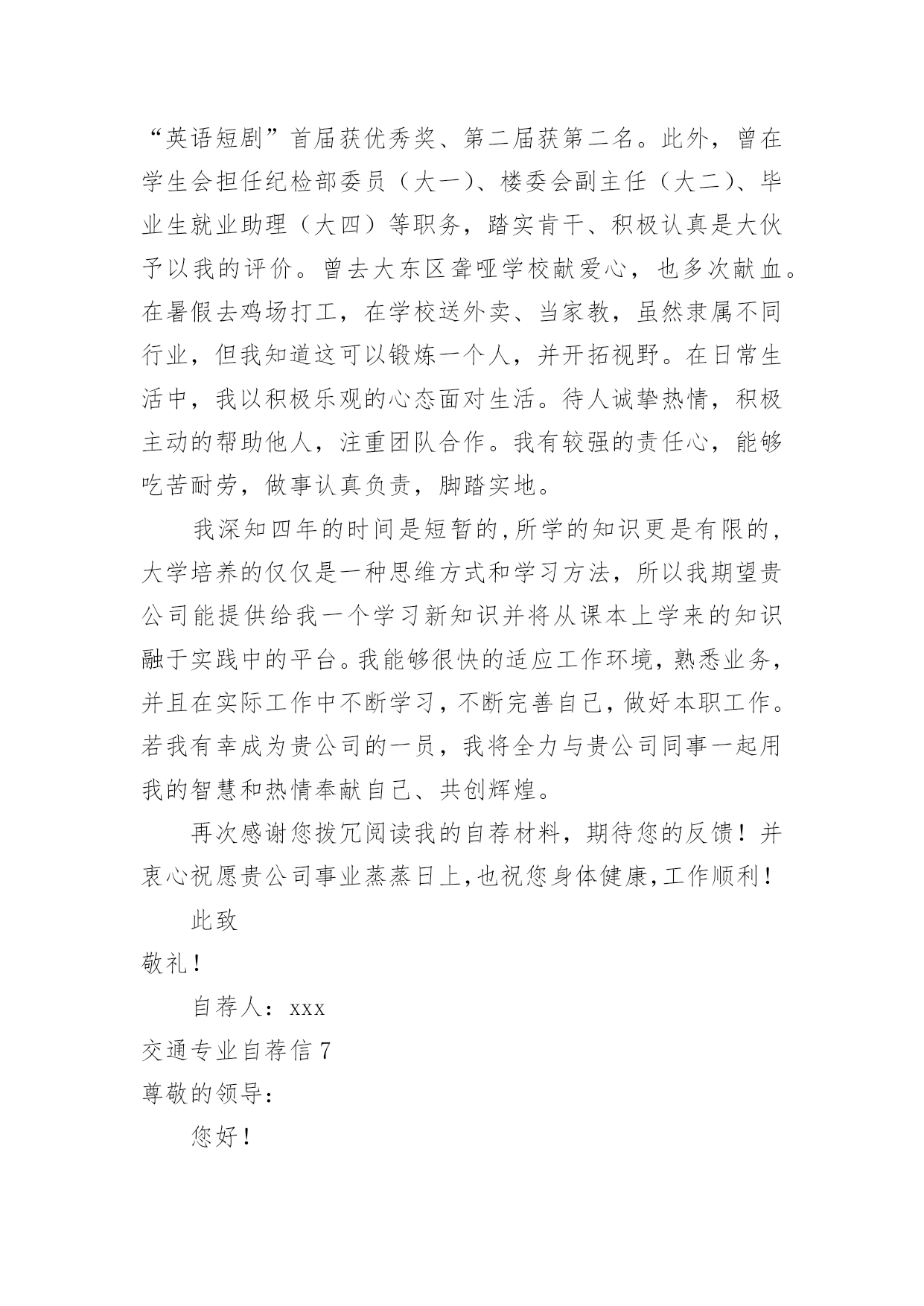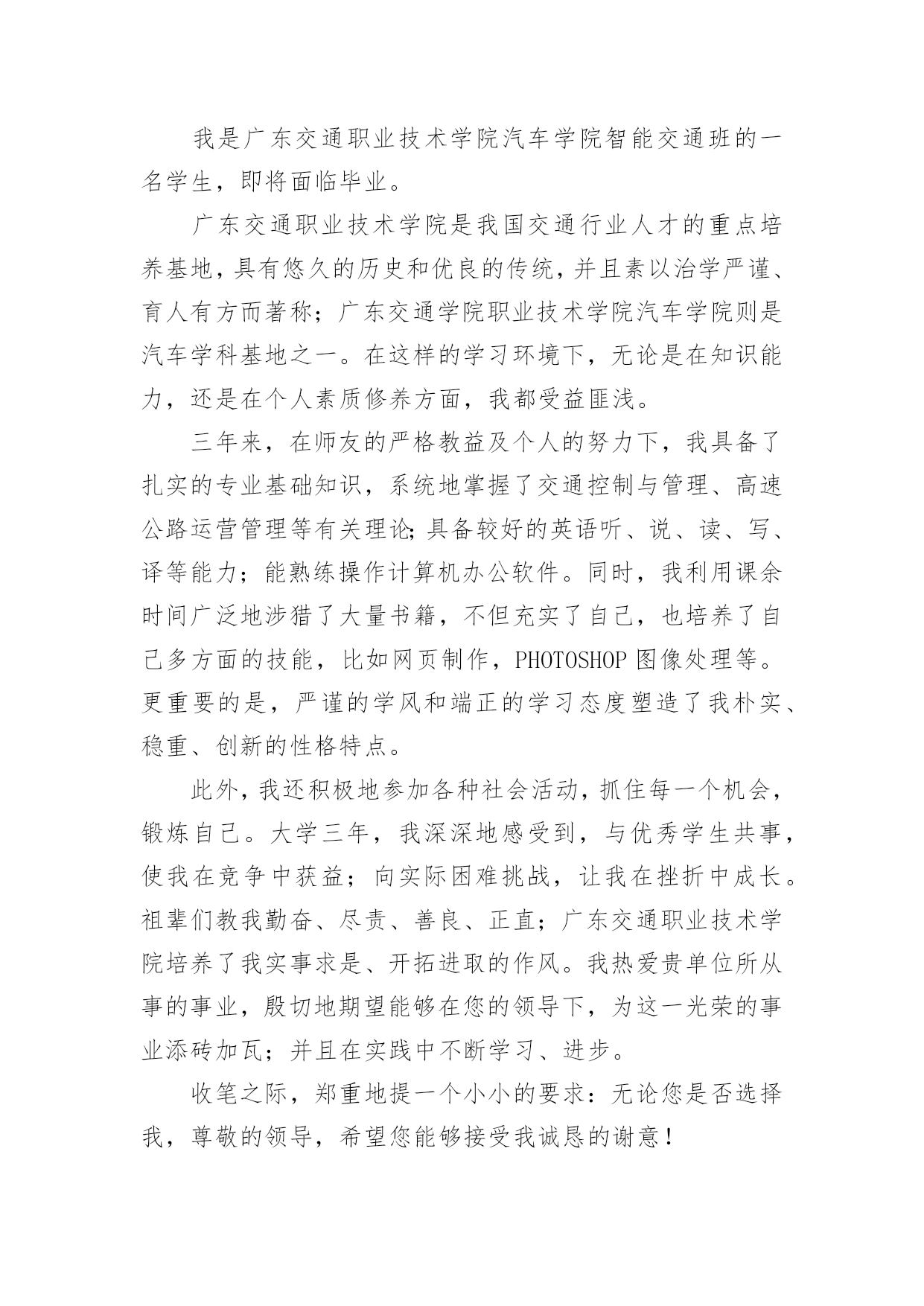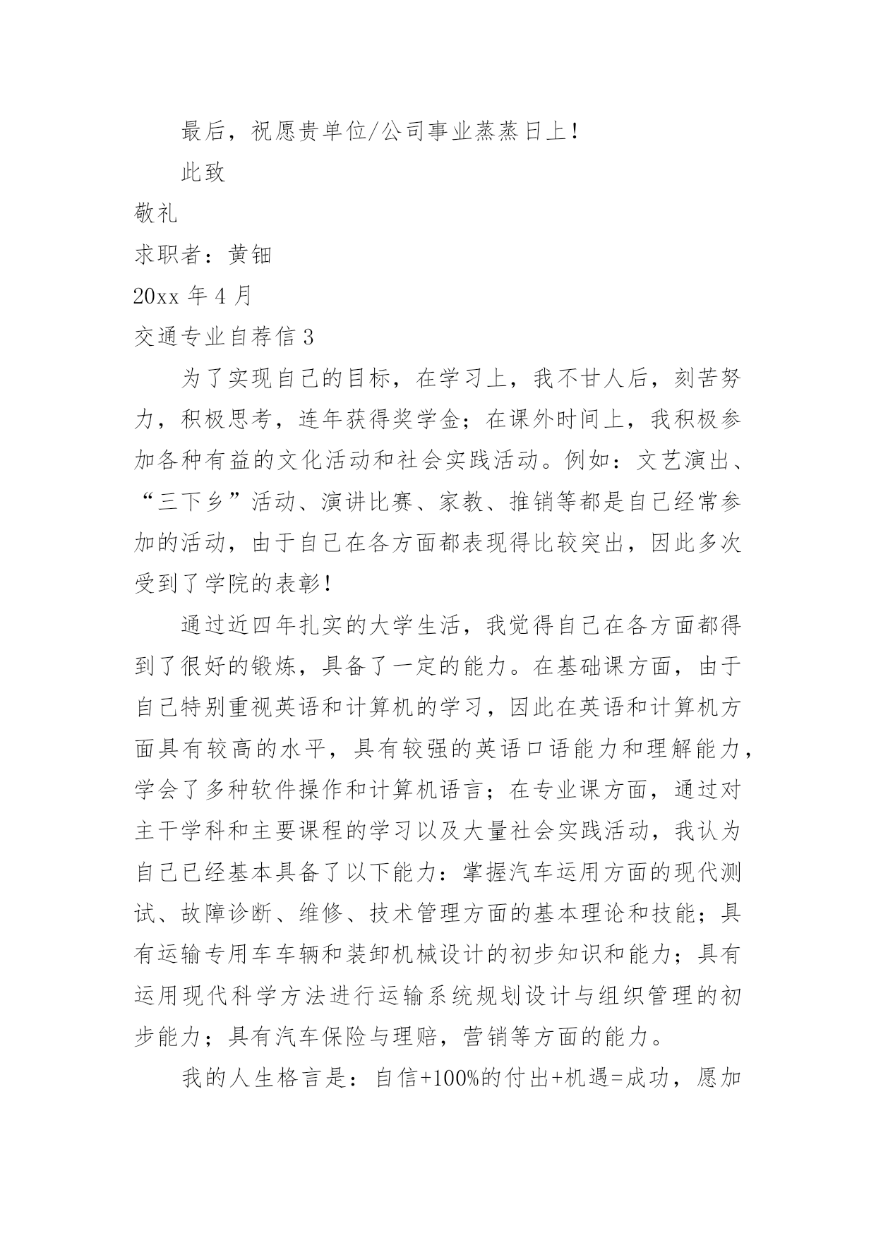 交通专业自荐信交通专业自荐信在当今中国社会,我们越来越经常使用自荐信,自荐信根据用途的不同也有着不同的类型。你所见过的自荐信是什么样的呢?以下是小编为大家整理的交通专业自荐信,希望能够帮助到大家。交通专业自荐信1尊敬的领导:您好!我是XX大学XX校区XX学院汽车运用工程系交通专业的一名学生,现在即将面临毕业,走向工作岗位!现知贵单位招聘,特拟此求职信。自从踏进大学校门的那天,我就暗下决心,一定要好好珍惜这四年大学生活,利用各种机会完善和充实自己,决不虚度每寸光阴,使自己得到全面发展!为了实现自己的目标,在学习上,我不甘人后,刻苦努力,积极思考,连年获得奖学金;在课外时间上,我积极参加各种有益的文化活动和社会实践活动。例如:文艺演出、“三下乡”活动、演讲比赛、家教、推销等都是自己经常参加的活动,由于自己在各方面都表现得比较突出,因此多次受到了学院的表彰!通过近四年扎实的大学生活,我觉得自己在各方面都得到了很好的锻炼,具备了一定的能力。在基础课方面,由于自己特别重视英语和计算机的学习,因此在英语和计算机方面具有较高的水平,具有较强的英语口语能力和理解能力,学会了多种软件操作和计算机语言。在专业课方面,通过对主干学科和主要课程的学习以及大量社会实践活动,我认为自己已经基本具备了以下能力:掌握汽车运用方面的现代测试、故障诊断、维修、技术管理方面的基本理论和技能;具有运输专用车车辆和装卸机械设计的初步知识和能力;具有运用现代科学方法进行运输系统规划设计与组织管理的初步能力;具有汽车保险与理赔,营销等方面的能力。我的人生格言是:自信+100%的付出+机遇=成功,愿加入一个富于积极向上、团结协作、拼搏进取精神的集体。恳请贵公司(单位)给我一个实现自我人生价值的机会,我将用自己的智慧和汗水为集体创造出最大的效益!大学生活很快便过去了,我自信以自己坚实的专业知识、丰富的心理学知识、较高的组织管理能力和教学能力,一定能胜任且很好地完成您交给我的工作,请贵公司给我一个机会。此致敬礼!求职人:XXXX年XX月XX日交通专业自荐信2尊敬的领导:您好!我是广东交通职业技术学院汽车学院智能交通班的一名学生,即将面临毕业。广东交通职业技术学院是我国交通行业人才的重点培养基地,具有悠久的历史和优良的传统,并且素以治学严谨、育人有方而著称;广东交通学院职业技术学院汽车学院则是汽车学科基地之一。在这样的学习环境下,无论是在知识能力,还是在个人素质修养方面,我都受益匪浅。三年来,在师友的严格教益及个人的努力下,我具备了扎实的专业基础知识,系统地掌握了交通控制与管理、高速公路运营管理等有关理论;具备较好的英语听、说、读、写、译等能力;能熟练操作计算机办公软件。同时,我利用课余时间广泛地涉猎了大量书籍,不但充实了自己,也培养了自己多方面的技能,比如网页制作,PHOTOSHOP图像处理等。更重要的是,严谨的学风和端正的学习态度塑造了我朴实、稳重、创新的性格特点。此外,我还积极地参加各种社会活动,抓住每一个机会,锻炼自己。大学三年,我深深地感受到,与优秀学生共事,使我在竞争中获益;向实际困难挑战,让我在挫折中成长。祖辈们教我勤奋、尽责、善良、正直;广东交通职业技术学院培养了我实事求是、开拓进取的作风。我热爱贵单位所从事的事业,殷切地期望能够在您的领导下,为这一光荣的事业添砖加瓦;并且在实践中不断学习、进步。收笔之际,郑重地提一个小小的要求:无论您是否选择我,尊敬的领导,希望您能够接受我诚恳的谢意!最后,祝愿贵单位/公司事业蒸蒸日上!此致敬礼求职者:黄钿20xx年4月交通专业自荐信3为了实现自己的目标,在学习上,我不甘人后,刻苦努力,积极思考,连年获得奖学金;在课外时间上,我积极参加各种有益的文化活动和社会实践活动。例如:文艺演出、“三下乡”活动、演讲比赛、家教、推销等都是自己经常参加的活动,由于自己在各方面都表现得比较突出,因此多次受到了学院的表彰!通过近四年扎实的大学生活,我觉得自己在各方面都得到了很好的锻炼,具备了一定的能力。在基础课方面,由于自己特别重视英语和计算机的学习,因此在英语和计算机方面具有较高的水平,具有较强的英语口语能力和理解能力,学会了多种软件操作和计算机语言;在专业课方面,通过对主干学科和主要课程的学习以及大量社会实践活动,我认为自己已经基本具备了以下能力:掌握汽车运用方面的现代测试、故障诊断、维修、技术管理方面的基本理论和技能;具有运输专用车车辆和装卸机械设计的初步知识和能力;具有运用现代科学方法进行运输系统规划设计与组织管理的初步能力;具有汽车保险与理赔,营销等方面的能力。我的人生格言是:自信+100%的付出+机遇=成功,愿加入一个富于积极向上、团结协作、拼搏进取精神的集体。恳请贵公司给我一个实现自我人生价值的机会,我将用自己的智慧和汗水为集体