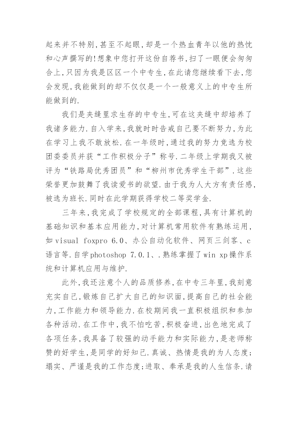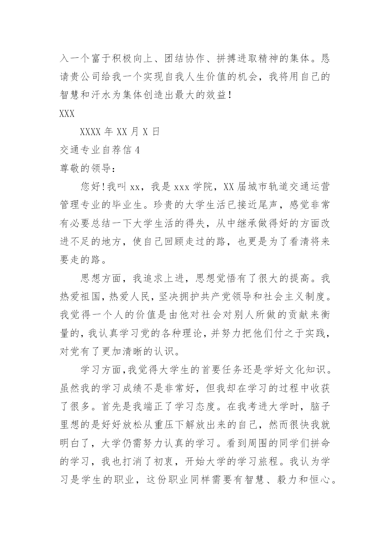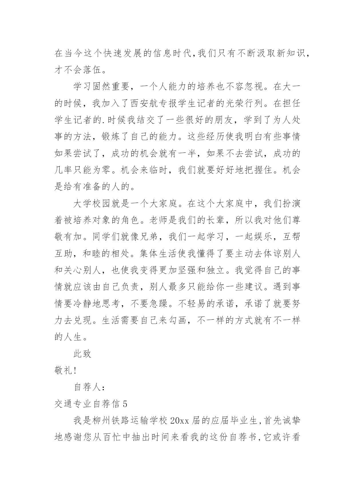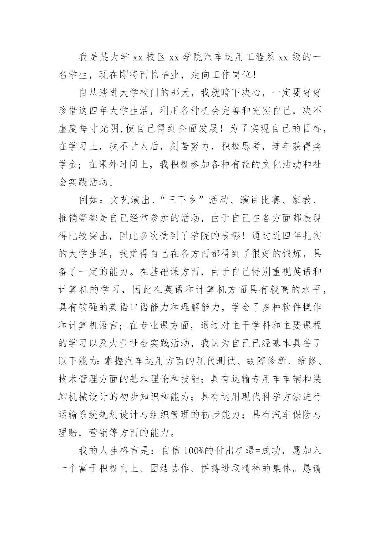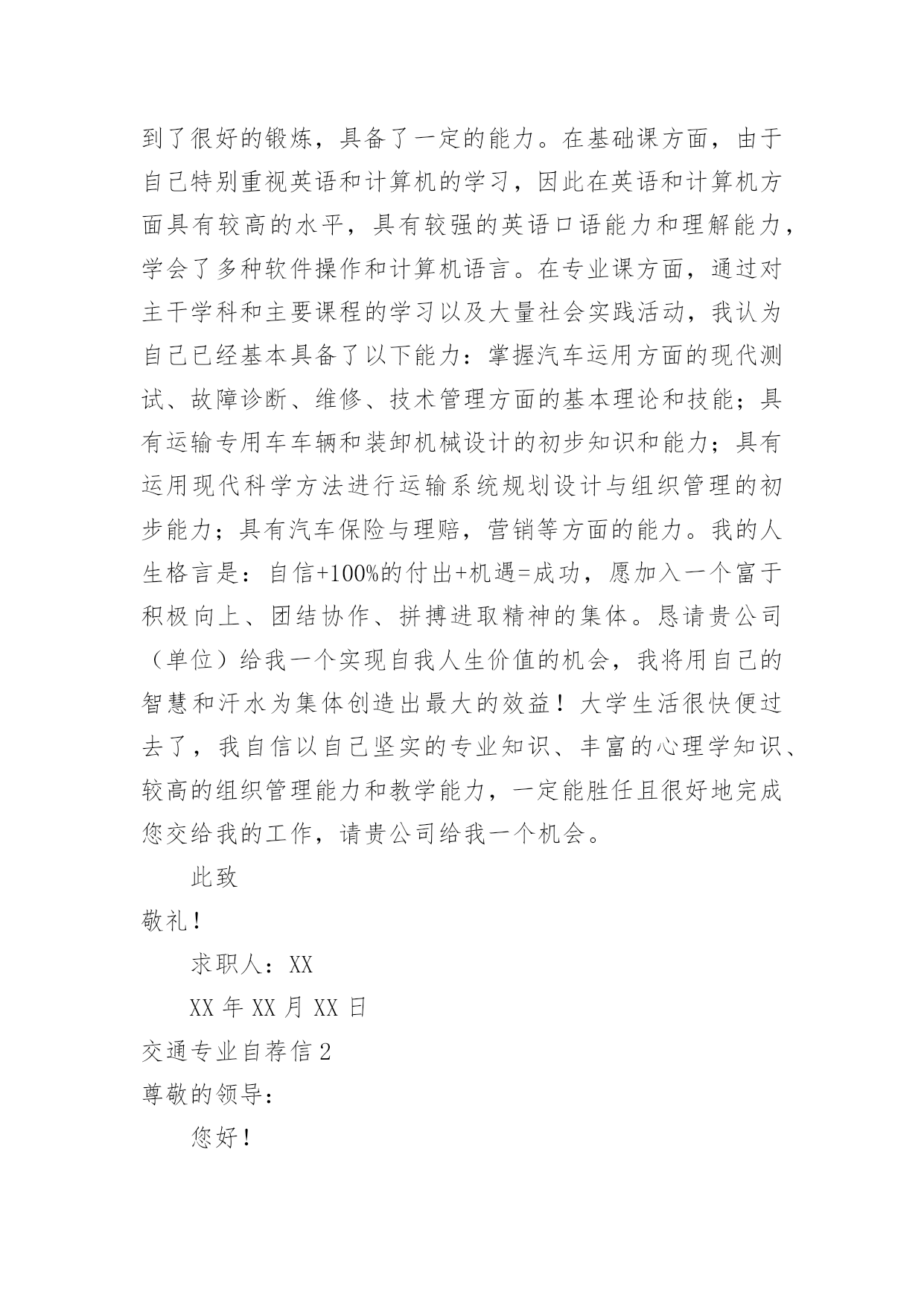 交通专业自荐信交通专业自荐信在当今中国社会,我们越来越经常使用自荐信,自荐信根据用途的不同也有着不同的类型。你所见过的自荐信是什么样的呢?以下是小编为大家整理的交通专业自荐信,希望能够帮助到大家。交通专业自荐信1尊敬的领导:您好!我是XX大学XX校区XX学院汽车运用工程系交通专业的一名学生,现在即将面临毕业,走向工作岗位!现知贵单位招聘,特拟此求职信。自从踏进大学校门的那天,我就暗下决心,一定要好好珍惜这四年大学生活,利用各种机会完善和充实自己,决不虚度每寸光阴,使自己得到全面发展!为了实现自己的目标,在学习上,我不甘人后,刻苦努力,积极思考,连年获得奖学金;在课外时间上,我积极参加各种有益的文化活动和社会实践活动。例如:文艺演出、“三下乡”活动、演讲比赛、家教、推销等都是自己经常参加的活动,由于自己在各方面都表现得比较突出,因此多次受到了学院的表彰!通过近四年扎实的大学生活,我觉得自己在各方面都得到了很好的锻炼,具备了一定的能力。在基础课方面,由于自己特别重视英语和计算机的学习,因此在英语和计算机方面具有较高的水平,具有较强的英语口语能力和理解能力,学会了多种软件操作和计算机语言。在专业课方面,通过对主干学科和主要课程的学习以及大量社会实践活动,我认为自己已经基本具备了以下能力:掌握汽车运用方面的现代测试、故障诊断、维修、技术管理方面的基本理论和技能;具有运输专用车车辆和装卸机械设计的初步知识和能力;具有运用现代科学方法进行运输系统规划设计与组织管理的初步能力;具有汽车保险与理赔,营销等方面的能力。我的人生格言是:自信+100%的付出+机遇=成功,愿加入一个富于积极向上、团结协作、拼搏进取精神的集体。恳请贵公司(单位)给我一个实现自我人生价值的机会,我将用自己的智慧和汗水为集体创造出最大的效益!大学生活很快便过去了,我自信以自己坚实的专业知识、丰富的心理学知识、较高的组织管理能力和教学能力,一定能胜任且很好地完成您交给我的工作,请贵公司给我一个机会。此致敬礼!求职人:XXXX年XX月XX日交通专业自荐信2尊敬的领导:您好!我是广东交通职业技术学院汽车学院智能交通班的一名学生,即将面临毕业。广东交通职业技术学院是我国交通行业人才的重点培养基地,具有悠久的历史和优良的传统,并且素以治学严谨、育人有方而著称;广东交通学院职业技术学院汽车学院则是汽车学科基地之一。在这样的学习环境下,无论是在知识能力,还是在个人素质修养方面,我都受益匪浅。三年来,在师友的严格教益及个人的努力下,我具备了扎实的专业基础知识,系统地掌握了交通控制与管理、高速公路运营管理等有关理论;具备较好的英语听、说、读、写、译等能力;能熟练操作计算机办公软件。同时,我利用课余时间广泛地涉猎了大量书籍,不但充实了自己,也培养了自己多方面的技能,比如网页制作,PHOTOSHOP图像处理等。更重要的是,严谨的学风和端正的学习态度塑造了我朴实、稳重、创新的性格特点。此外,我还积极地参加各种社会活动,抓住每一个机会,锻炼自己。大学三年,我深深地感受到,与优秀学生共事,使我在竞争中获益;向实际困难挑战,让我在挫折中成长。祖辈们教我勤奋、尽责、善良、正直;广东交通职业技术学院培养了我实事求是、开拓进取的作风。我热爱贵单位所从事的事业,殷切地期望能够在您的领导下,为这一光荣的事业添砖加瓦;并且在实践中不断学习、进步。收笔之际,郑重地提一个小小的要求:无论您是否选择我,尊敬的领导,希望您能够接受我诚恳的谢意!最后,祝愿贵单位/公司事业蒸蒸日上!此致敬礼求职者:黄钿20xx年4月交通专业自荐信3为了实现自己的目标,在学习上,我不甘人后,刻苦努力,积极思考,连年获得奖学金;在课外时间上,我积极参加各种有益的文化活动和社会实践活动。例如:文艺演出、“三下乡”活动、演讲比赛、家教、推销等都是自己经常参加的活动,由于自己在各方面都表现得比较突出,因此多次受到了学院的表彰!通过近四年扎实的大学生活,我觉得自己在各方面都得到了很好的锻炼,具备了一定的能力。在基础课方面,由于自己特别重视英语和计算机的学习,因此在英语和计算机方面具有较高的水平,具有较强的英语口语能力和理解能力,学会了多种软件操作和计算机语言;在专业课方面,通过对主干学科和主要课程的学习以及大量社会实践活动,我认为自己已经基本具备了以下能力:掌握汽车运用方面的现代测试、故障诊断、维修、技术管理方面的基本理论和技能;具有运输专用车车辆和装卸机械设计的初步知识和能力;具有运用现代科学方法进行运输系统规划设计与组织管理的初步能力;具有汽车保险与理赔,营销等方面的能力。我的人生格言是:自信+100%的付出+机遇=成功,愿加入一个富于积极向上、团结协作、拼搏进取精神的集体。恳请贵公司给我一个实现自我人生价值的机会,我将用自己的智慧和汗水为集体