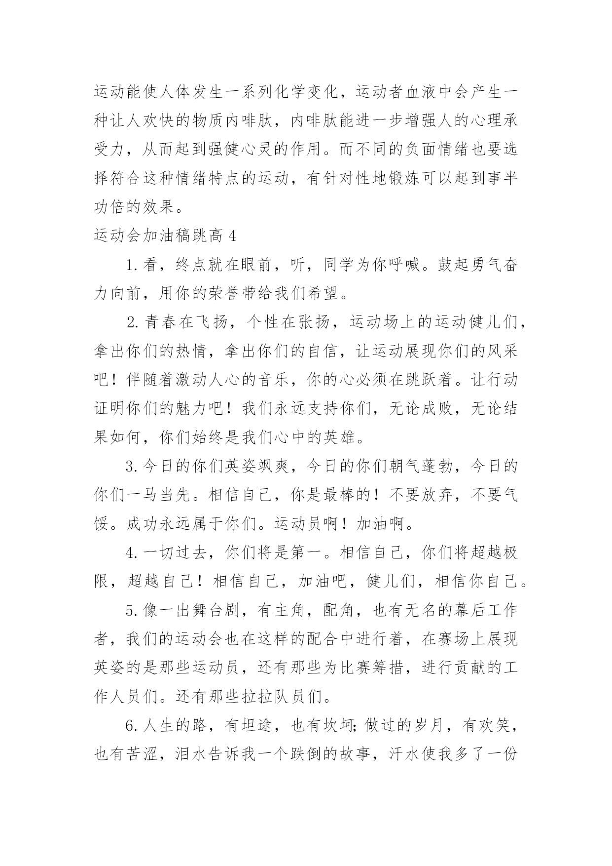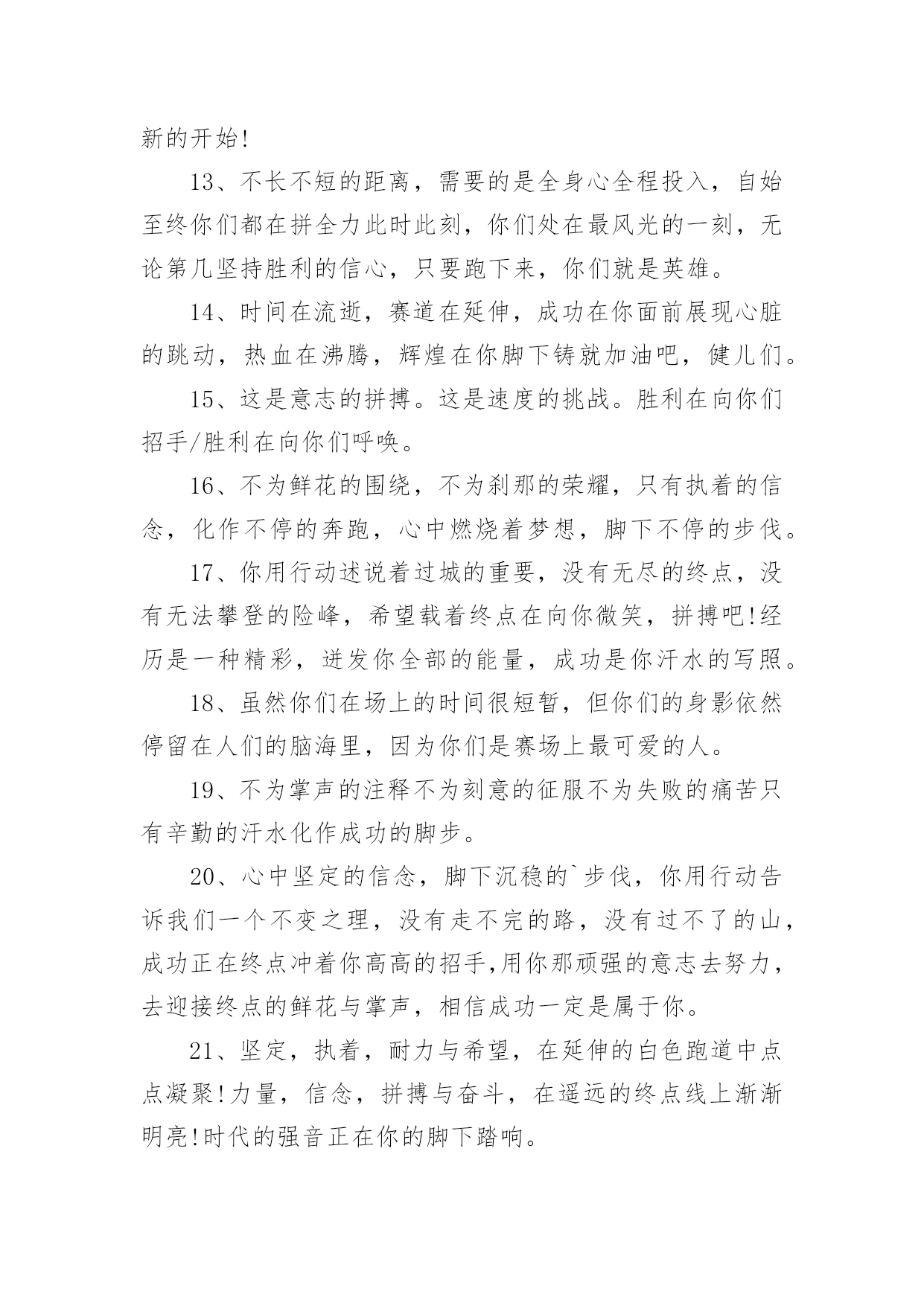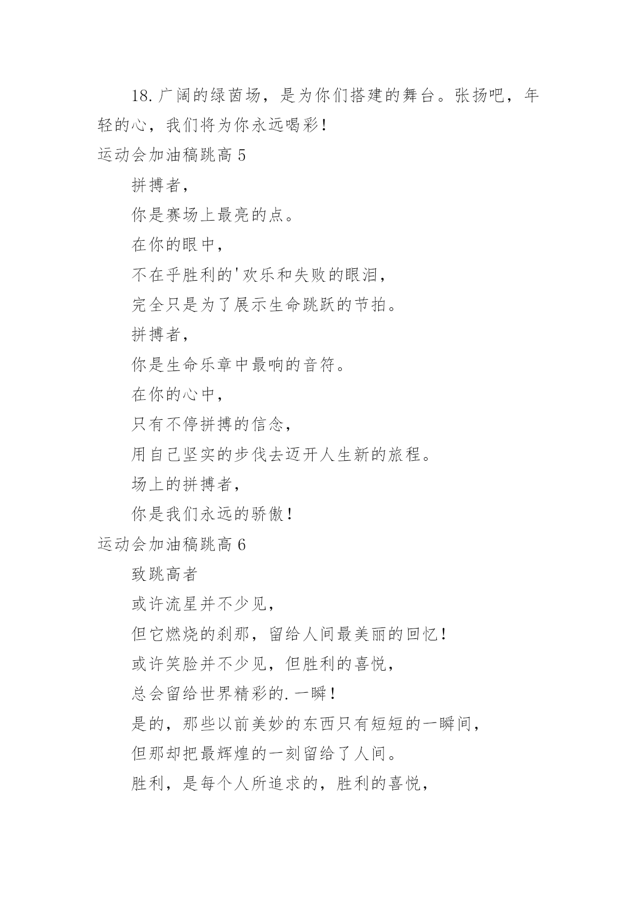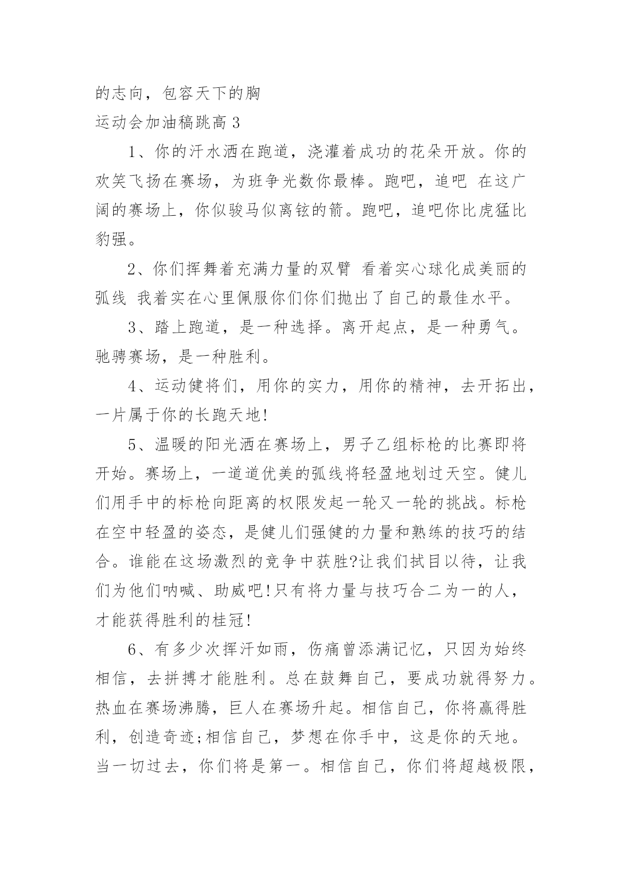 运动会加油稿跳高运动会加油稿跳高在发展不断提速的社会中,我们使用上加油稿的情况与日俱增,借助加油稿可以表达对对方的鼓励和支持。那么你有了解过加油稿吗?以下是小编为大家收集的运动会加油稿跳高,欢迎阅读,希望大家能够喜欢。运动会加油稿跳高1流星可能并不罕见。但是燃烧的瞬间,留下了世界上最美丽的回忆!笑脸也许不多见,但胜利的喜悦请永远留下世界上美好的瞬间!是的,以前美好的东西只有短暂的.瞬间。但是它给世界留下了最耀眼的瞬间。胜利是每个人追求的,是胜利的快乐。是胜利和重新开始的转折点,胜利是新的开始!运动会加油稿跳高2这是一首诗有诗的节奏,诗的情怀这是一首歌有旋律、有起伏、有速度是青看的诗,青年的歌有火热的情感,无羁的奔放,恢宏的气度是时代的诗,时代的`歌,无外汇是新鲜的气息、奋发的志向,包容天下的胸运动会加油稿跳高31、你的汗水洒在跑道,浇灌着成功的花朵开放。你的欢笑飞扬在赛场,为班争光数你最棒。跑吧,追吧在这广阔的赛场上,你似骏马似离铉的箭。跑吧,追吧你比虎猛比豹强。2、你们挥舞着充满力量的双臂看着实心球化成美丽的弧线我着实在心里佩服你们你们抛出了自己的最佳水平。3、踏上跑道,是一种选择。离开起点,是一种勇气。驰骋赛场,是一种胜利。4、运动健将们,用你的实力,用你的精神,去开拓出,一片属于你的长跑天地!5、温暖的阳光洒在赛场上,男子乙组标枪的比赛即将开始。赛场上,一道道优美的弧线将轻盈地划过天空。健儿们用手中的标枪向距离的权限发起一轮又一轮的挑战。标枪在空中轻盈的姿态,是健儿们强健的力量和熟练的技巧的结合。谁能在这场激烈的竞争中获胜?让我们拭目以待,让我们为他们呐喊、助威吧!只有将力量与技巧合二为一的人,才能获得胜利的桂冠!6、有多少次挥汗如雨,伤痛曾添满记忆,只因为始终相信,去拼搏才能胜利。总在鼓舞自己,要成功就得努力。热血在赛场沸腾,巨人在赛场升起。相信自己,你将赢得胜利,创造奇迹;相信自己,梦想在你手中,这是你的天地。当一切过去,你们将是第一。相信自己,你们将超越极限,超越自己!相信自己,加油吧,健儿们,相信你自己。7、年轻的我们自信飞扬,青春的气息如同出生的朝阳,蓬勃的力量如同阳光的挥洒。此时此刻,跑道便是我们精彩的舞台,声声加油便是我们最高的奖项!论何成功,谈何荣辱,心中的信念只有一个:拼搏!8、萧瑟的秋风,挡不住你们破竹的锐气。9、广阔的绿茵场,是为你们搭建的舞台。张扬吧,年轻的心,我们将为你永远喝彩!10、泰戈尔在诗中说,天空没有翅膀的影子,但我已飞过;艾青对朋友说,也许有人到达不了彼岸,但我们共同拥有大海。也许你们没有显赫的成绩,但运动场上留下了你们的足迹。也许你们没有奖品,但我们心中留下了你们拼搏的身影。所有的努力都是为了迎接这一刹那,所有的拼搏都是为了这一声令下。11、就像花儿准备了春、秋、冬,就是为了红透整个盛夏。就像雪花经历了春、夏、秋就是为了洁白整个严冬。蹲下,昂首,出发……轻轻的一抬脚,便牵动了全场的目光潇洒的迫挥挥手。便满足了那一份无言的等待。迎着朝阳,你们踏歌而去,背着希望,我们等待你们的归来。12、也许流星并不少见,但它燃烧的刹那,留给人间最美丽的回忆!也许笑脸并不少见,但胜利的喜悦,总会留给世界精彩的一瞬!是的,那些曾经美妙的东西只有短短的一瞬间,但那却把最辉煌的一刻留给了人间。胜利,是每个人所追求的,胜利的喜悦,是胜利与重新开始的转折,胜利是新的开始!13、不长不短的距离,需要的是全身心全程投入,自始至终你们都在拼全力此时此刻,你们处在最风光的一刻,无论第几坚持胜利的信心,只要跑下来,你们就是英雄。14、时间在流逝,赛道在延伸,成功在你面前展现心脏的跳动,热血在沸腾,辉煌在你脚下铸就加油吧,健儿们。15、这是意志的拼搏。这是速度的挑战。胜利在向你们招手/胜利在向你们呼唤。16、不为鲜花的围绕,不为刹那的荣耀,只有执着的信念,化作不停的奔跑,心中燃烧着梦想,脚下不停的步伐。17、你用行动述说着过城的重要,没有无尽的终点,没有无法攀登的险峰,希望载着终点在向你微笑,拼搏吧!经历是一种精彩,迸发你全部的能量,成功是你汗水的写照。18、虽然你们在场上的时间很短暂,但你们的身影依然停留在人们的脑海里,因为你们是赛场上最可爱的人。19、不为掌声的注释不为刻意的征服不为失败的痛苦只有辛勤的汗水化作成功的脚步。20、心中坚定的信念,脚下沉稳的`步伐,你用行动告诉我们一个不变之理,没有走不完的路,没有过不了的山,成功正在终点冲着你高高的招手,用你那顽强的意志去努力,去迎接终点的鲜花与掌声,相信成功一定是属于你。21、坚定,执着,耐力与希望,在延伸的白色跑道中点点凝聚!力量,信念,拼搏与奋斗,在遥远的终点线上渐渐明亮!时代的强音正在你的脚下踏响。【拓展阅读】最近,美国医学研究人员通过对1799名男女18年的观