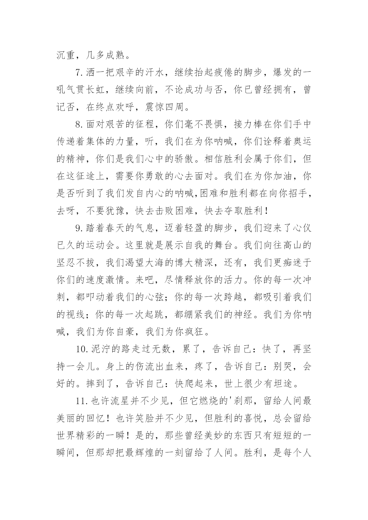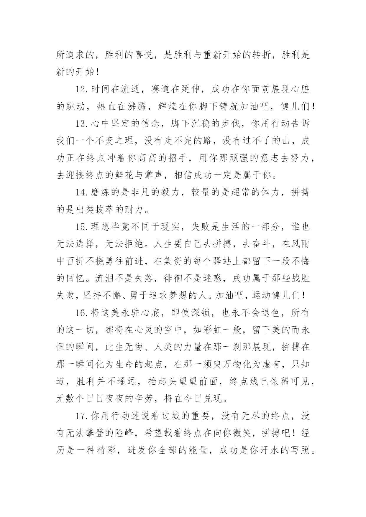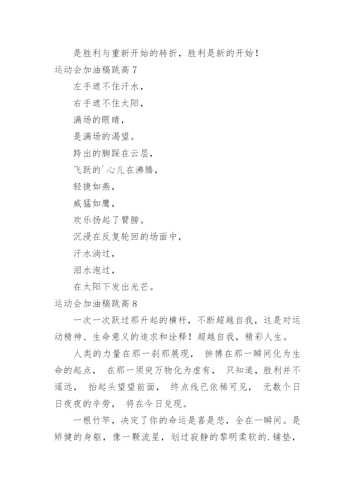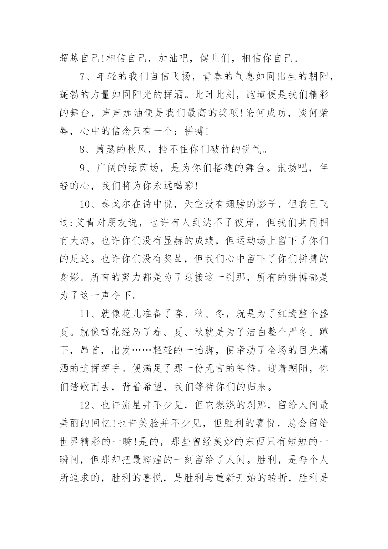 运动会加油稿跳高运动会加油稿跳高在发展不断提速的社会中,我们使用上加油稿的情况与日俱增,借助加油稿可以表达对对方的鼓励和支持。那么你有了解过加油稿吗?以下是小编为大家收集的运动会加油稿跳高,欢迎阅读,希望大家能够喜欢。运动会加油稿跳高1流星可能并不罕见。但是燃烧的瞬间,留下了世界上最美丽的回忆!笑脸也许不多见,但胜利的喜悦请永远留下世界上美好的瞬间!是的,以前美好的东西只有短暂的.瞬间。但是它给世界留下了最耀眼的瞬间。胜利是每个人追求的,是胜利的快乐。是胜利和重新开始的转折点,胜利是新的开始!运动会加油稿跳高2这是一首诗有诗的节奏,诗的情怀这是一首歌有旋律、有起伏、有速度是青看的诗,青年的歌有火热的情感,无羁的奔放,恢宏的气度是时代的诗,时代的`歌,无外汇是新鲜的气息、奋发的志向,包容天下的胸运动会加油稿跳高31、你的汗水洒在跑道,浇灌着成功的花朵开放。你的欢笑飞扬在赛场,为班争光数你最棒。跑吧,追吧在这广阔的赛场上,你似骏马似离铉的箭。跑吧,追吧你比虎猛比豹强。2、你们挥舞着充满力量的双臂看着实心球化成美丽的弧线我着实在心里佩服你们你们抛出了自己的最佳水平。3、踏上跑道,是一种选择。离开起点,是一种勇气。驰骋赛场,是一种胜利。4、运动健将们,用你的实力,用你的精神,去开拓出,一片属于你的长跑天地!5、温暖的阳光洒在赛场上,男子乙组标枪的比赛即将开始。赛场上,一道道优美的弧线将轻盈地划过天空。健儿们用手中的标枪向距离的权限发起一轮又一轮的挑战。标枪在空中轻盈的姿态,是健儿们强健的力量和熟练的技巧的结合。谁能在这场激烈的竞争中获胜?让我们拭目以待,让我们为他们呐喊、助威吧!只有将力量与技巧合二为一的人,才能获得胜利的桂冠!6、有多少次挥汗如雨,伤痛曾添满记忆,只因为始终相信,去拼搏才能胜利。总在鼓舞自己,要成功就得努力。热血在赛场沸腾,巨人在赛场升起。相信自己,你将赢得胜利,创造奇迹;相信自己,梦想在你手中,这是你的天地。当一切过去,你们将是第一。相信自己,你们将超越极限,超越自己!相信自己,加油吧,健儿们,相信你自己。7、年轻的我们自信飞扬,青春的气息如同出生的朝阳,蓬勃的力量如同阳光的挥洒。此时此刻,跑道便是我们精彩的舞台,声声加油便是我们最高的奖项!论何成功,谈何荣辱,心中的信念只有一个:拼搏!8、萧瑟的秋风,挡不住你们破竹的锐气。9、广阔的绿茵场,是为你们搭建的舞台。张扬吧,年轻的心,我们将为你永远喝彩!10、泰戈尔在诗中说,天空没有翅膀的影子,但我已飞过;艾青对朋友说,也许有人到达不了彼岸,但我们共同拥有大海。也许你们没有显赫的成绩,但运动场上留下了你们的足迹。也许你们没有奖品,但我们心中留下了你们拼搏的身影。所有的努力都是为了迎接这一刹那,所有的拼搏都是为了这一声令下。11、就像花儿准备了春、秋、冬,就是为了红透整个盛夏。就像雪花经历了春、夏、秋就是为了洁白整个严冬。蹲下,昂首,出发……轻轻的一抬脚,便牵动了全场的目光潇洒的迫挥挥手。便满足了那一份无言的等待。迎着朝阳,你们踏歌而去,背着希望,我们等待你们的归来。12、也许流星并不少见,但它燃烧的刹那,留给人间最美丽的回忆!也许笑脸并不少见,但胜利的喜悦,总会留给世界精彩的一瞬!是的,那些曾经美妙的东西只有短短的一瞬间,但那却把最辉煌的一刻留给了人间。胜利,是每个人所追求的,胜利的喜悦,是胜利与重新开始的转折,胜利是新的开始!13、不长不短的距离,需要的是全身心全程投入,自始至终你们都在拼全力此时此刻,你们处在最风光的一刻,无论第几坚持胜利的信心,只要跑下来,你们就是英雄。14、时间在流逝,赛道在延伸,成功在你面前展现心脏的跳动,热血在沸腾,辉煌在你脚下铸就加油吧,健儿们。15、这是意志的拼搏。这是速度的挑战。胜利在向你们招手/胜利在向你们呼唤。16、不为鲜花的围绕,不为刹那的荣耀,只有执着的信念,化作不停的奔跑,心中燃烧着梦想,脚下不停的步伐。17、你用行动述说着过城的重要,没有无尽的终点,没有无法攀登的险峰,希望载着终点在向你微笑,拼搏吧!经历是一种精彩,迸发你全部的能量,成功是你汗水的写照。18、虽然你们在场上的时间很短暂,但你们的身影依然停留在人们的脑海里,因为你们是赛场上最可爱的人。19、不为掌声的注释不为刻意的征服不为失败的痛苦只有辛勤的汗水化作成功的脚步。20、心中坚定的信念,脚下沉稳的`步伐,你用行动告诉我们一个不变之理,没有走不完的路,没有过不了的山,成功正在终点冲着你高高的招手,用你那顽强的意志去努力,去迎接终点的鲜花与掌声,相信成功一定是属于你。21、坚定,执着,耐力与希望,在延伸的白色跑道中点点凝聚!力量,信念,拼搏与奋斗,在遥远的终点线上渐渐明亮!时代的强音正在你的脚下踏响。【拓展阅读】最近,美国医学研究人员通过对1799名男女18年的观
