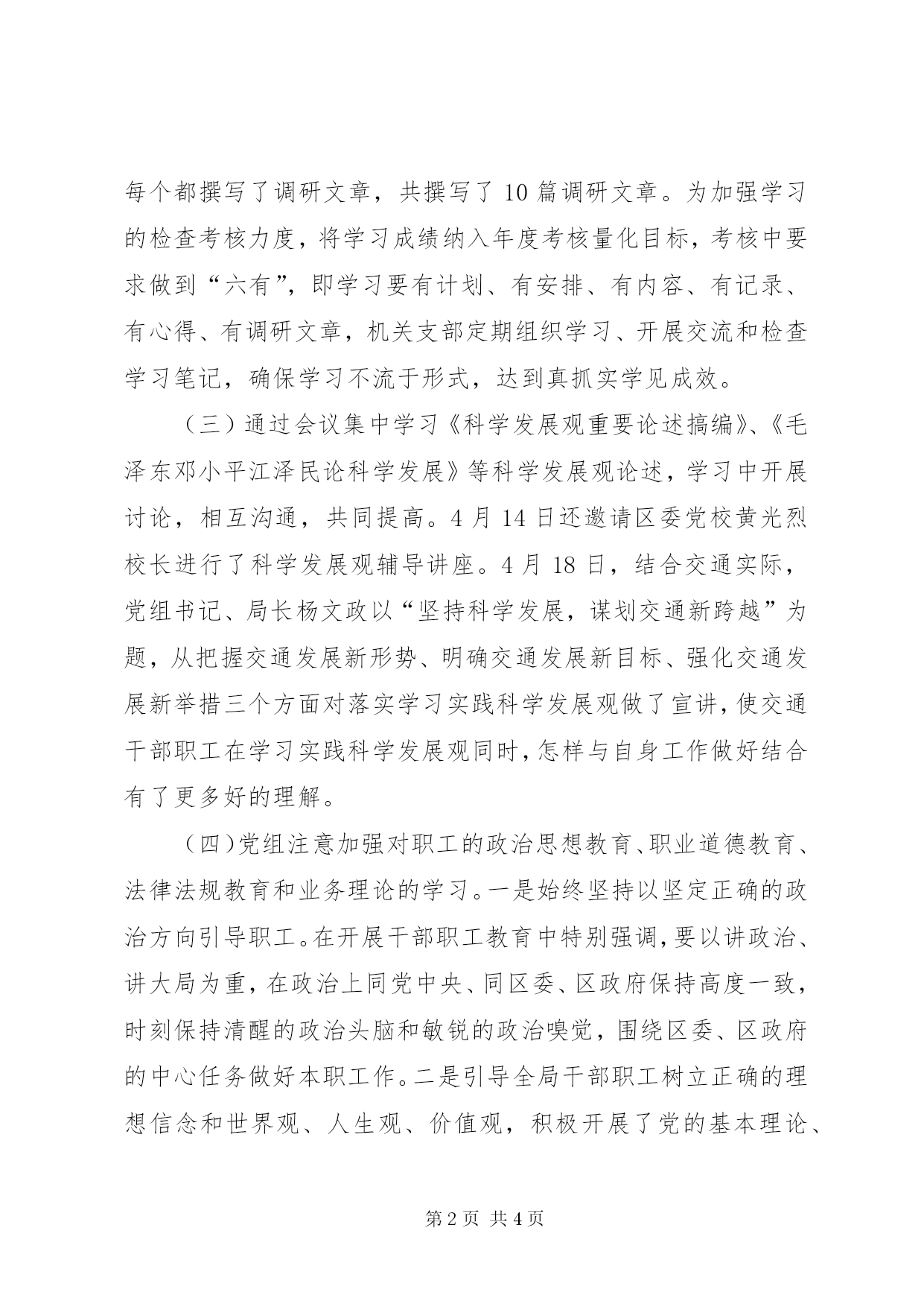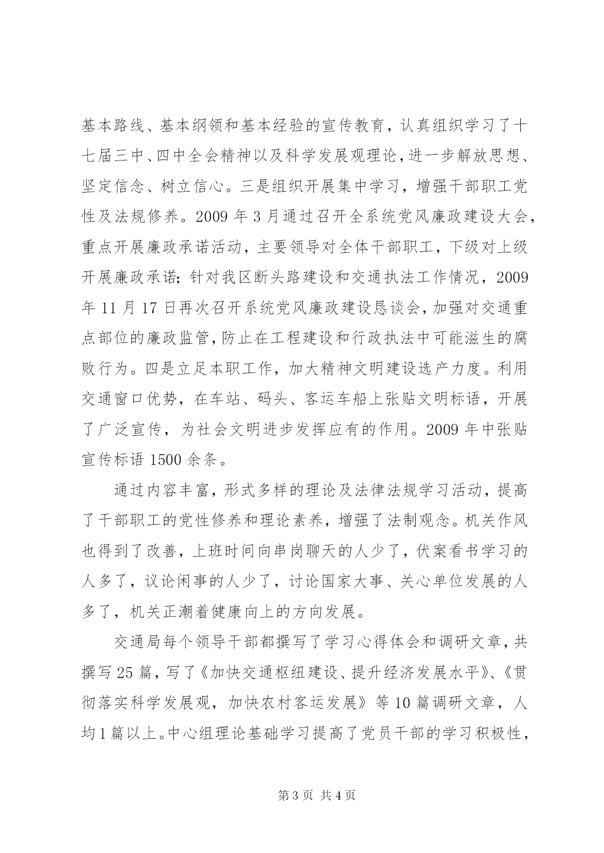 第PAGE\*Arabic\*MERGEFORMAT4页共NUMPAGES\*MERGEFORMAT4页交通局理论学法学习总结一、领导重视,机构健全为了认真抓好局党组中心组理论学习,我局在年初制定了《2009年理论(学法)学习计划》,成立了以党组书记为组长的学习领导小组,明确责任。领导小组主要根据上级的部署和我局实际情况,审定学习计划,明确学习任务,提出学习要求,组织实施学习,检查讲评学习情况,保证学习落实,组织交流学习心得,举办学习报告以及督促、指示下级党组织的学习。由于组织健全,责任到位,一年来确保了中心组学习顺利开展。二、开展内容丰富、形式多样的理论学习活动(一)为干部、职工创造良好的学习硬件。一是建立健全了读书活动室,充实了活动的硬件,购置了30本新书价值1000元,修改完善了图书借阅管理制度;二是广泛收集职工个人藏书,集中到活动室供大家阅读,丰富学习内容,增强学习吸引力;三是统一制作了“交通局荐书读书活动笔记本”。学习条件的改善,调动了广大职工的学习积极性,营造了全民读书的氛围,掀起了读书高潮。(二)为确保理论学习落到实处,我局全年共组织了12次集中学习,每月至少保证了1次以上,每次学习坚持了考勤签到制度,学习中大家认真记笔记,相互交流学习心得,每个职工都记了10000字以上的读书笔记,每人都写了心得体会,领导干部每个都撰写了调研文章,共撰写了10篇调研文章。为加强学习的检查考核力度,将学习成绩纳入年度考核量化目标,考核中要求做到“六有”,即学习要有计划、有安排、有内容、有记录、有心得、有调研文章,机关支部定期组织学习、开展交流和检查学习笔记,确保学习不流于形式,达到真抓实学见成效。(三)通过会议集中学习《科学发展观重要论述搞编》、《毛泽东邓小平江泽民论科学发展》等科学发展观论述,学习中开展讨论,相互沟通,共同提高。4月14日还邀请区委党校黄光烈校长进行了科学发展观辅导讲座。4月18日,结合交通实际,党组书记、局长杨文政以“坚持科学发展,谋划交通新跨越”为题,从把握交通发展新形势、明确交通发展新目标、强化交通发展新举措三个方面对落实学习实践科学发展观做了宣讲,使交通干部职工在学习实践科学发展观同时,怎样与自身工作做好结合有了更多好的理解。(四)党组注意加强对职工的政治思想教育、职业道德教育、法律法规教育和业务理论的学习。一是始终坚持以坚定正确的政治方向引导职工。在开展干部职工教育中特别强调,要以讲政治、讲大局为重,在政治上同党中央、同区委、区政府保持高度一致,时刻保持清醒的政治头脑和敏锐的政治嗅觉,围绕区委、区政府的中心任务做好本职工作。二是引导全局干部职工树立正确的理想信念和世界观、人生观、价值观,积极开展了党的基本理论、基本路线、基本纲领和基本经验的宣传教育,认真组织学习了十七届三中、四中全会精神以及科学发展观理论,进一步解放思想、坚定信念、树立信心。三是组织开展集中学习,增强干部职工党性及法规修养。2009年3月通过召开全系统党风廉政建设大会,重点开展廉政承诺活动,主要领导对全体干部职工,下级对上级开展廉政承诺;针对我区断头路建设和交通执法工作情况,2009年11月17日再次召开系统党风廉政建设恳谈会,加强对交通重点部位的廉政监管,防止在工程建设和行政执法中可能滋生的腐败行为。四是立足本职工作,加大精神文明建设选产力度。利用交通窗口优势,在车站、码头、客运车船上张贴文明标语,开展了广泛宣传,为社会文明进步发挥应有的作用。2009年中张贴宣传标语1500余条。通过内容丰富,形式多样的理论及法律法规学习活动,提高了干部职工的党性修养和理论素养,增强了法制观念。机关作风也得到了改善,上班时间向串岗聊天的人少了,伏案看书学习的人多了,议论闲事的人少了,讨论国家大事、关心单位发展的人多了,机关正潮着健康向上的方向发展。交通局每个领导干部都撰写了学习心得体会和调研文章,共撰写25篇,写了《加快交通枢纽建设、提升经济发展水平》、《贯彻落实科学发展观,加快农村客运发展》等10篇调研文章,人均1篇以上。中心组理论基础学习提高了党员干部的学习积极性,树立正确的世界观、人生观、价值观和职业观,工作的自觉性、主动性加强,推进交通事业再上新台阶。