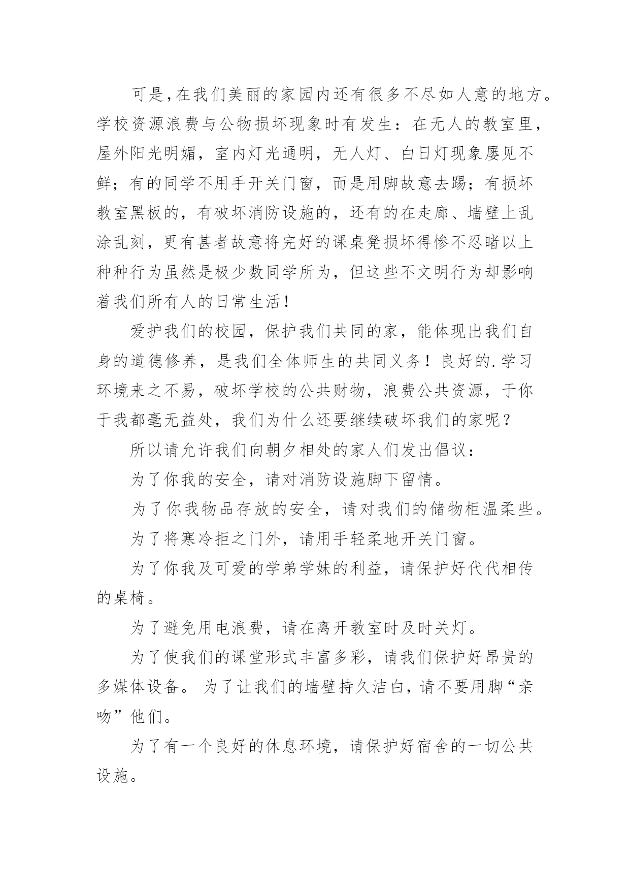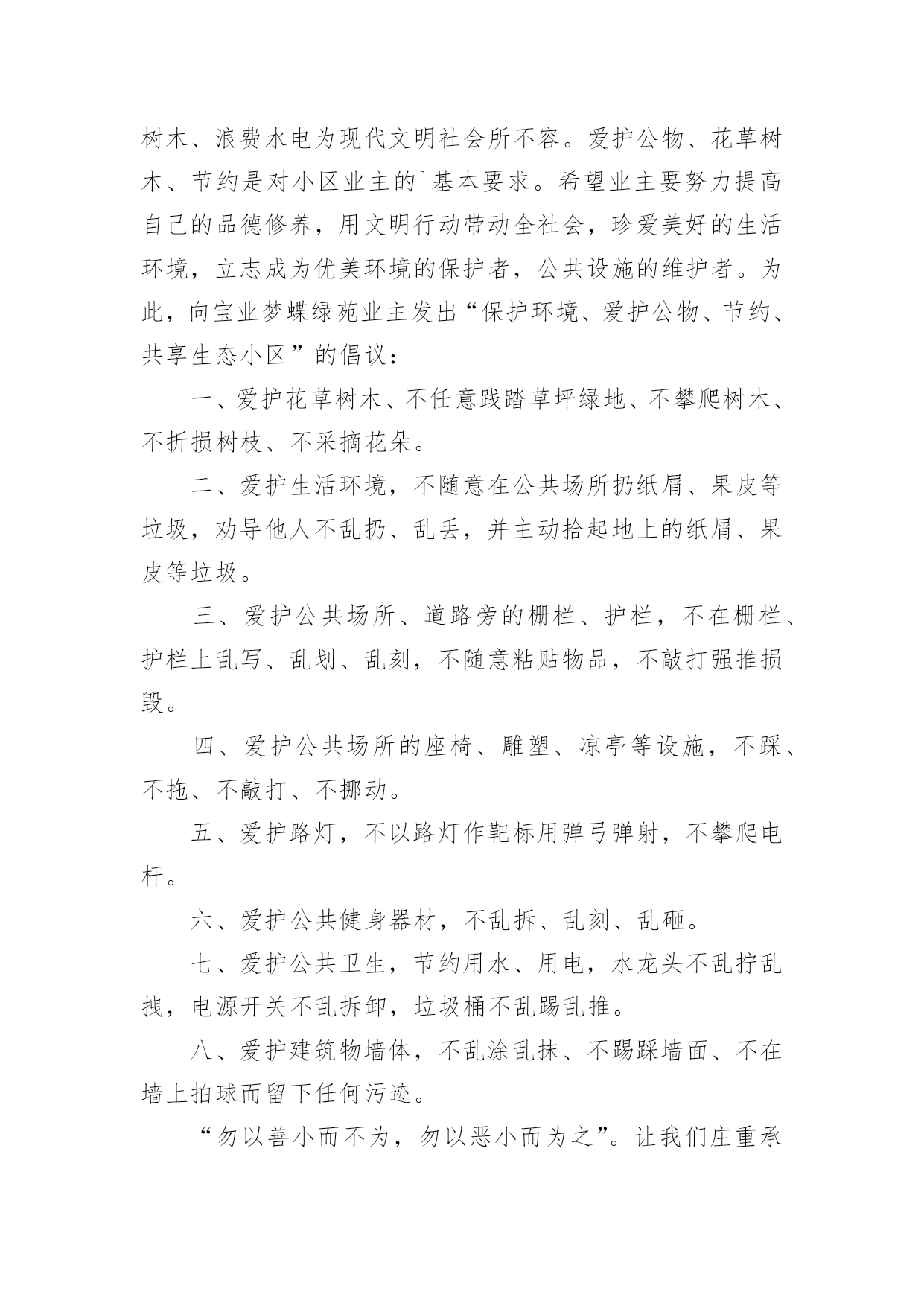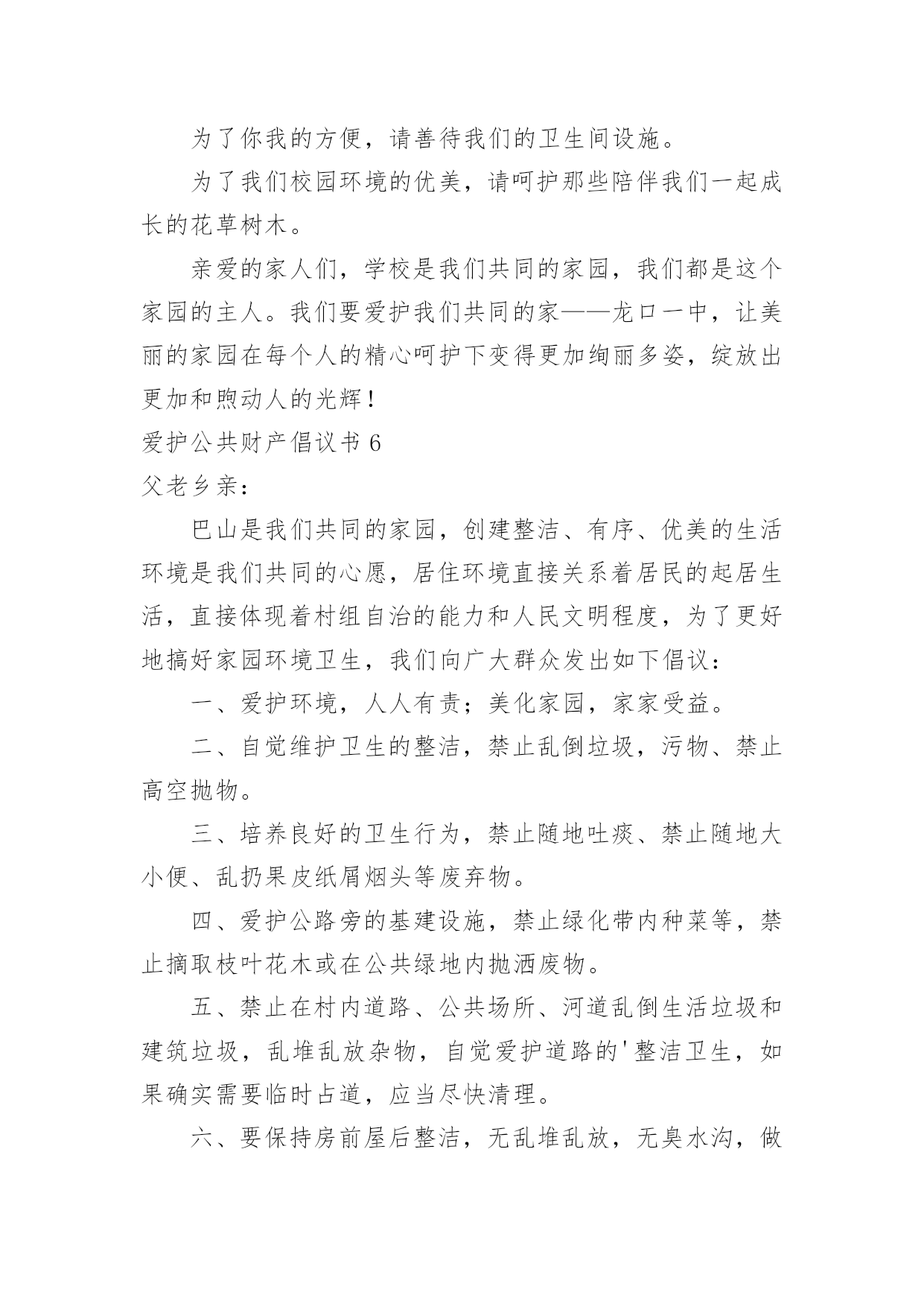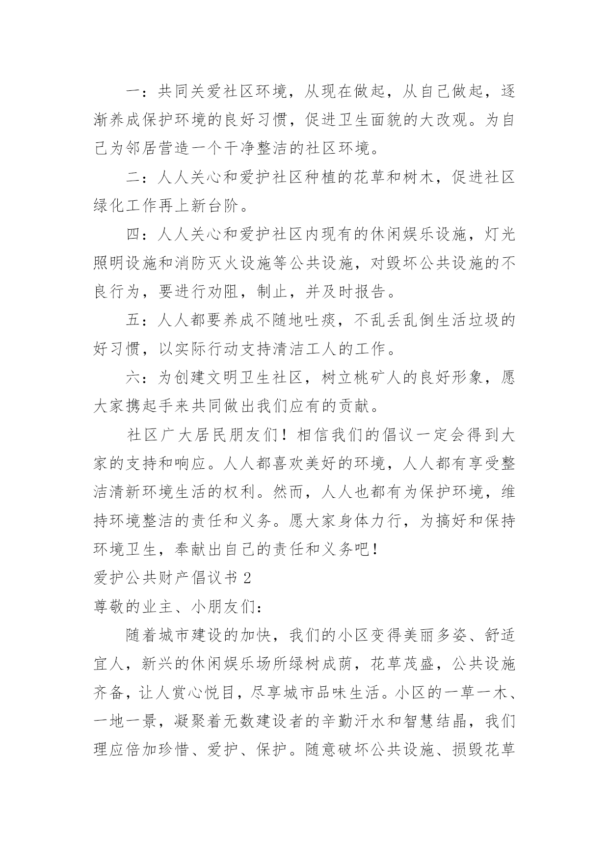 爱护公共财产倡议书爱护公共财产倡议书在生活中,在很多情况下我们需要用到倡议书,在写作上,倡议书有一定的书写规范。还是对倡议书一筹莫展吗?下面是小编为大家收集的爱护公共财产倡议书,欢迎大家借鉴与参考,希望对大家有所帮助。爱护公共财产倡议书1社区广大居民朋友们:社区是我们自己的社区,家园是我们自己的家园,保护好社区环境,保持好各自楼道的卫生,是我们大家共有的责任和义务。环境整洁,楼道干净,空气清新,能促进广大居民朋友的身心健康,能提高社区的良好形象,能融洽邻里之间的关系,同时又能使我们每个居民朋友享受到好环境催生出的温馨喜悦心情。现在我们社区环境卫生的基本状况是,道路上存有纸屑,而且在花坛上存在有塑料袋、烟头等一些垃圾这项薄弱的工作环节需要我们大家共同关注逐步改进,逐步加强和提高。因此充分利用我们现有的资源和条件,为我们的家园营造一个与环境协调和谐的.氛围,为搞好社区环境卫生的清扫保洁工作而努力。为此,特向社区广大居民朋友们提出以下倡议:一:共同关爱社区环境,从现在做起,从自己做起,逐渐养成保护环境的良好习惯,促进卫生面貌的大改观。为自己为邻居营造一个干净整洁的社区环境。二:人人关心和爱护社区种植的花草和树木,促进社区绿化工作再上新台阶。四:人人关心和爱护社区内现有的休闲娱乐设施,灯光照明设施和消防灭火设施等公共设施,对毁坏公共设施的不良行为,要进行劝阻,制止,并及时报告。五:人人都要养成不随地吐痰,不乱丢乱倒生活垃圾的好习惯,以实际行动支持清洁工人的工作。六:为创建文明卫生社区,树立桃矿人的良好形象,愿大家携起手来共同做出我们应有的贡献。社区广大居民朋友们!相信我们的倡议一定会得到大家的支持和响应。人人都喜欢美好的环境,人人都有享受整洁清新环境生活的权利。然而,人人也都有为保护环境,维持环境整洁的责任和义务。愿大家身体力行,为搞好和保持环境卫生,奉献出自己的责任和义务吧!爱护公共财产倡议书2尊敬的业主、小朋友们:随着城市建设的加快,我们的小区变得美丽多姿、舒适宜人,新兴的休闲娱乐场所绿树成荫,花草茂盛,公共设施齐备,让人赏心悦目,尽享城市品味生活。小区的一草一木、一地一景,凝聚着无数建设者的辛勤汗水和智慧结晶,我们理应倍加珍惜、爱护、保护。随意破坏公共设施、损毁花草树木、浪费水电为现代文明社会所不容。爱护公物、花草树木、节约是对小区业主的`基本要求。希望业主要努力提高自己的品德修养,用文明行动带动全社会,珍爱美好的生活环境,立志成为优美环境的保护者,公共设施的维护者。为此,向宝业梦蝶绿苑业主发出“保护环境、爱护公物、节约、共享生态小区”的倡议:一、爱护花草树木、不任意践踏草坪绿地、不攀爬树木、不折损树枝、不采摘花朵。二、爱护生活环境,不随意在公共场所扔纸屑、果皮等垃圾,劝导他人不乱扔、乱丢,并主动拾起地上的纸屑、果皮等垃圾。三、爱护公共场所、道路旁的栅栏、护栏,不在栅栏、护栏上乱写、乱划、乱刻,不随意粘贴物品,不敲打强推损毁。四、爱护公共场所的座椅、雕塑、凉亭等设施,不踩、不拖、不敲打、不挪动。五、爱护路灯,不以路灯作靶标用弹弓弹射,不攀爬电杆。六、爱护公共健身器材,不乱拆、乱刻、乱砸。七、爱护公共卫生,节约用水、用电,水龙头不乱拧乱拽,电源开关不乱拆卸,垃圾桶不乱踢乱推。八、爱护建筑物墙体,不乱涂乱抹、不踢踩墙面、不在墙上拍球而留下任何污迹。“勿以善小而不为,勿以恶小而为之”。让我们庄重承诺,以热爱家乡、热爱小区、热爱生活环境为荣,以损毁公共设施、破坏家园建设为耻。大家要像爱护自己的家一样爱护公共设施,要像爱护自己的眼睛一样爱护公共财物。城市让生活更美好,生活让社会更文明。让我们立即行动起来,从我做起、从现在做起、从身边做起、从小事做起,让文明行为成为一种生活习惯,让文明行动成为一道亮丽风景,促使我们的小区更加和谐美丽。xxx服务中心20xx年6月6日爱护公共财产倡议书3同学们:校园是我们求知的殿堂,是我们生活的家园。学校为了让我们拥有一个既优美又舒适的学习环境,为了让我们能在这种温馨的环境中努力学习健康成长。学校经过三年的克难攻坚,我们终于迎来4精品文档了今天的新校园,但是在我们美丽的校园内,却有极个别的同学对学校公物、校园环境持另类态度----随意破坏。如:破坏厕所挡板、随手丢方便面盒、食品包装袋等,还有在餐厅地面或桌面上倒剩饭剩汤现象。您看到了吗?您制止了吗?这些不文明行为既影响了我们的生活又破坏了校园和谐氛围。校园是我家,美丽和谐靠大家。为养成良好的生活习惯,创建文明和谐校园,我校政教处提出以下倡议:一、爱护学校花草树木,不任意践踏草坪,不随意攀折花木。二、爱护学校环境,不随意丢弃废弃物,随手拾起地上的纸屑、果皮、果壳等杂物,保护环境卫生。三、爱护学校黑板,不乱涂乱画、不拍打敲击黑板。四、爱护学校课桌椅,不乱涂画刻