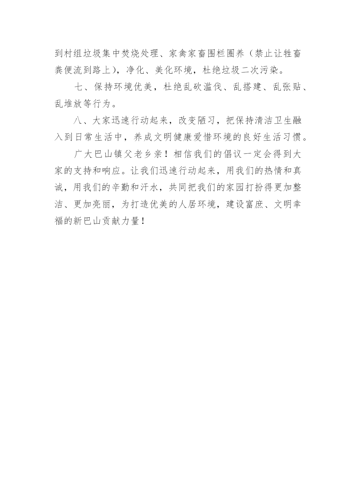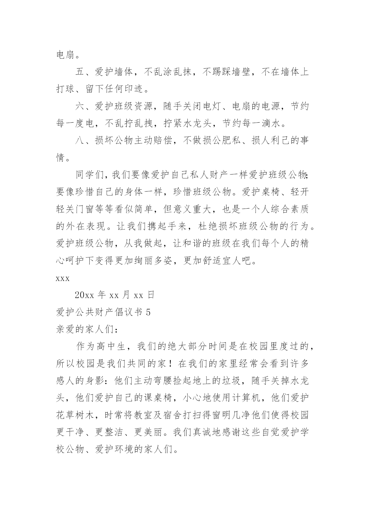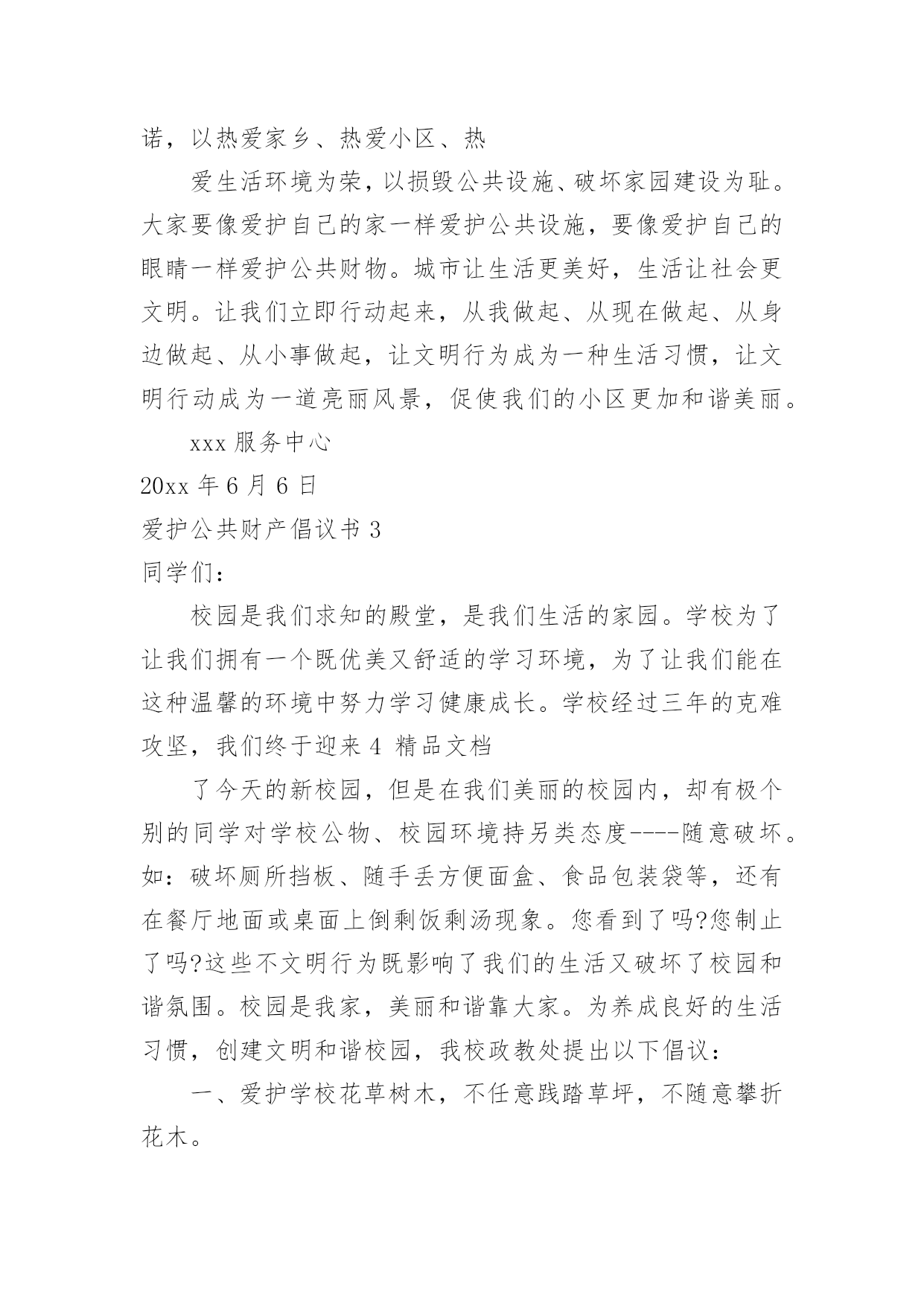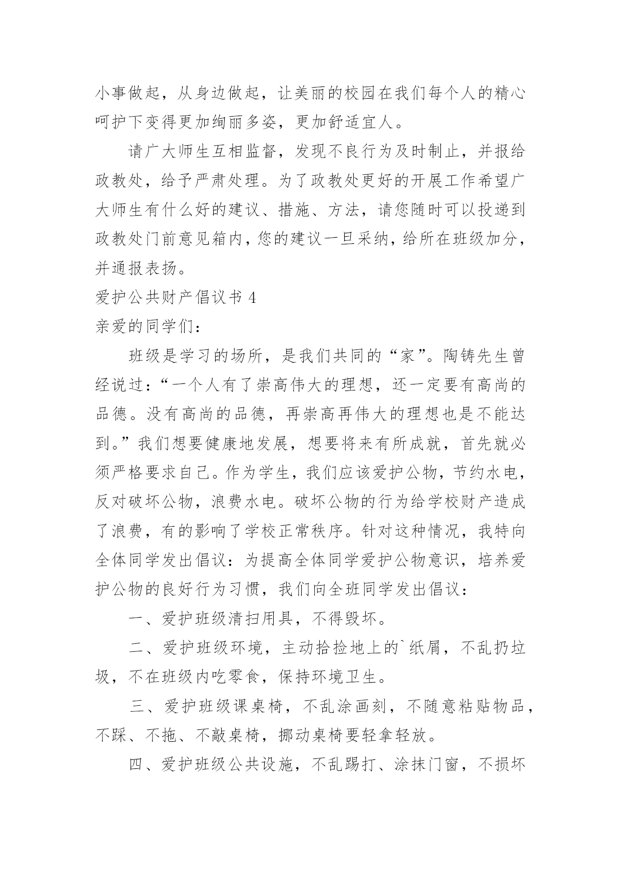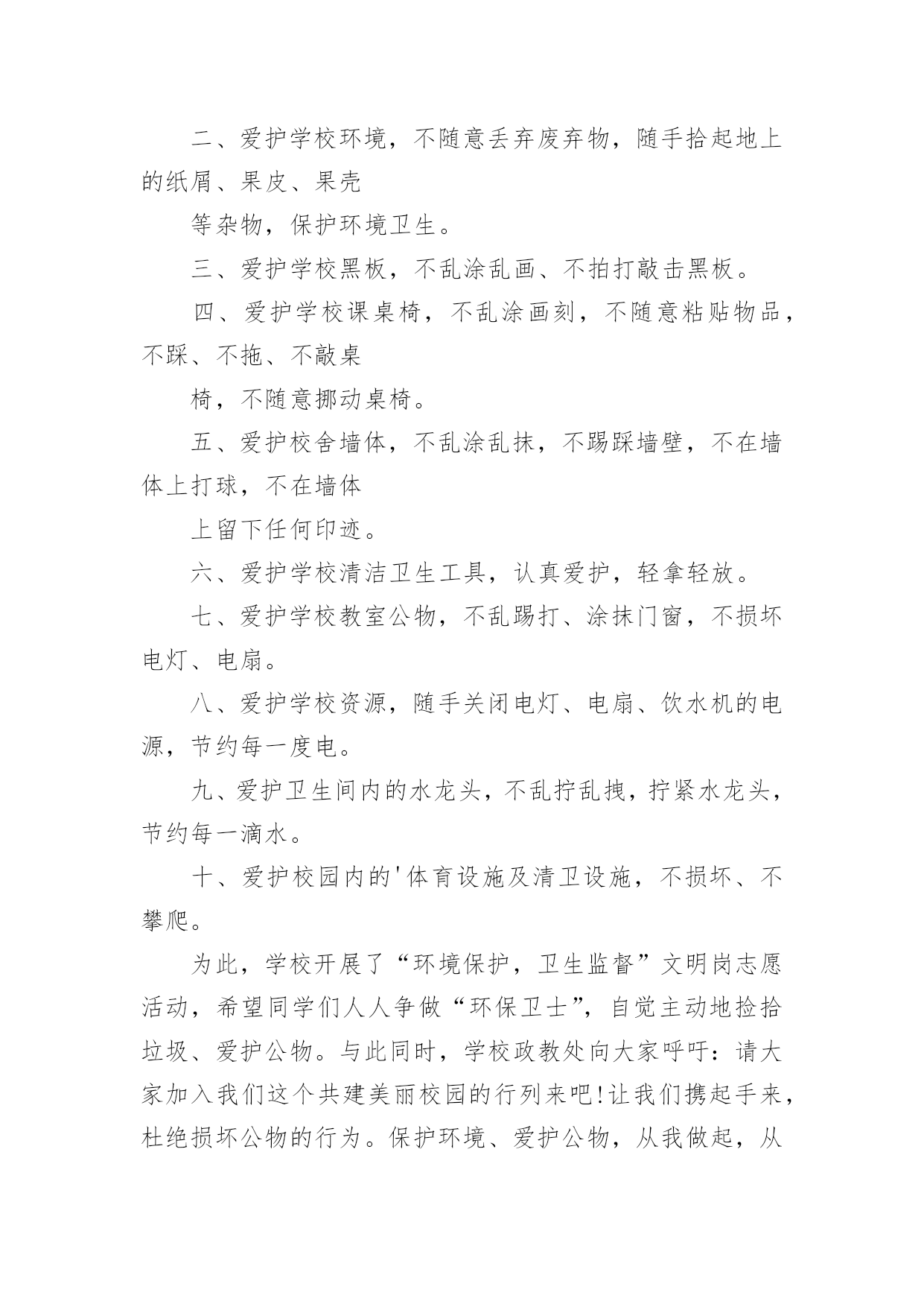 爱护公共财产倡议书爱护公共财产倡议书在生活中,在很多情况下我们需要用到倡议书,在写作上,倡议书有一定的书写规范。还是对倡议书一筹莫展吗?下面是小编为大家收集的爱护公共财产倡议书,欢迎大家借鉴与参考,希望对大家有所帮助。爱护公共财产倡议书1社区广大居民朋友们:社区是我们自己的社区,家园是我们自己的家园,保护好社区环境,保持好各自楼道的卫生,是我们大家共有的责任和义务。环境整洁,楼道干净,空气清新,能促进广大居民朋友的身心健康,能提高社区的良好形象,能融洽邻里之间的关系,同时又能使我们每个居民朋友享受到好环境催生出的温馨喜悦心情。现在我们社区环境卫生的基本状况是,道路上存有纸屑,而且在花坛上存在有塑料袋、烟头等一些垃圾这项薄弱的工作环节需要我们大家共同关注逐步改进,逐步加强和提高。因此充分利用我们现有的资源和条件,为我们的家园营造一个与环境协调和谐的.氛围,为搞好社区环境卫生的清扫保洁工作而努力。为此,特向社区广大居民朋友们提出以下倡议:一:共同关爱社区环境,从现在做起,从自己做起,逐渐养成保护环境的良好习惯,促进卫生面貌的大改观。为自己为邻居营造一个干净整洁的社区环境。二:人人关心和爱护社区种植的花草和树木,促进社区绿化工作再上新台阶。四:人人关心和爱护社区内现有的休闲娱乐设施,灯光照明设施和消防灭火设施等公共设施,对毁坏公共设施的不良行为,要进行劝阻,制止,并及时报告。五:人人都要养成不随地吐痰,不乱丢乱倒生活垃圾的好习惯,以实际行动支持清洁工人的工作。六:为创建文明卫生社区,树立桃矿人的良好形象,愿大家携起手来共同做出我们应有的贡献。社区广大居民朋友们!相信我们的倡议一定会得到大家的支持和响应。人人都喜欢美好的环境,人人都有享受整洁清新环境生活的权利。然而,人人也都有为保护环境,维持环境整洁的责任和义务。愿大家身体力行,为搞好和保持环境卫生,奉献出自己的责任和义务吧!爱护公共财产倡议书2尊敬的业主、小朋友们:随着城市建设的加快,我们的小区变得美丽多姿、舒适宜人,新兴的休闲娱乐场所绿树成荫,花草茂盛,公共设施齐备,让人赏心悦目,尽享城市品味生活。小区的一草一木、一地一景,凝聚着无数建设者的辛勤汗水和智慧结晶,我们理应倍加珍惜、爱护、保护。随意破坏公共设施、损毁花草树木、浪费水电为现代文明社会所不容。爱护公物、花草树木、节约是对小区业主的`基本要求。希望业主要努力提高自己的品德修养,用文明行动带动全社会,珍爱美好的生活环境,立志成为优美环境的保护者,公共设施的维护者。为此,向宝业梦蝶绿苑业主发出“保护环境、爱护公物、节约、共享生态小区”的倡议:一、爱护花草树木、不任意践踏草坪绿地、不攀爬树木、不折损树枝、不采摘花朵。二、爱护生活环境,不随意在公共场所扔纸屑、果皮等垃圾,劝导他人不乱扔、乱丢,并主动拾起地上的纸屑、果皮等垃圾。三、爱护公共场所、道路旁的栅栏、护栏,不在栅栏、护栏上乱写、乱划、乱刻,不随意粘贴物品,不敲打强推损毁。四、爱护公共场所的座椅、雕塑、凉亭等设施,不踩、不拖、不敲打、不挪动。五、爱护路灯,不以路灯作靶标用弹弓弹射,不攀爬电杆。六、爱护公共健身器材,不乱拆、乱刻、乱砸。七、爱护公共卫生,节约用水、用电,水龙头不乱拧乱拽,电源开关不乱拆卸,垃圾桶不乱踢乱推。八、爱护建筑物墙体,不乱涂乱抹、不踢踩墙面、不在墙上拍球而留下任何污迹。“勿以善小而不为,勿以恶小而为之”。让我们庄重承诺,以热爱家乡、热爱小区、热爱生活环境为荣,以损毁公共设施、破坏家园建设为耻。大家要像爱护自己的家一样爱护公共设施,要像爱护自己的眼睛一样爱护公共财物。城市让生活更美好,生活让社会更文明。让我们立即行动起来,从我做起、从现在做起、从身边做起、从小事做起,让文明行为成为一种生活习惯,让文明行动成为一道亮丽风景,促使我们的小区更加和谐美丽。xxx服务中心20xx年6月6日爱护公共财产倡议书3同学们:校园是我们求知的殿堂,是我们生活的家园。学校为了让我们拥有一个既优美又舒适的学习环境,为了让我们能在这种温馨的环境中努力学习健康成长。学校经过三年的克难攻坚,我们终于迎来4精品文档了今天的新校园,但是在我们美丽的校园内,却有极个别的同学对学校公物、校园环境持另类态度----随意破坏。如:破坏厕所挡板、随手丢方便面盒、食品包装袋等,还有在餐厅地面或桌面上倒剩饭剩汤现象。您看到了吗?您制止了吗?这些不文明行为既影响了我们的生活又破坏了校园和谐氛围。校园是我家,美丽和谐靠大家。为养成良好的生活习惯,创建文明和谐校园,我校政教处提出以下倡议:一、爱护学校花草树木,不任意践踏草坪,不随意攀折花木。二、爱护学校环境,不随意丢弃废弃物,随手拾起地上的纸屑、果皮、果壳等杂物,保护环境卫生。三、爱护学校黑板,不乱涂乱画、不拍打敲击黑板。四、爱护学校课桌椅,不乱涂画刻