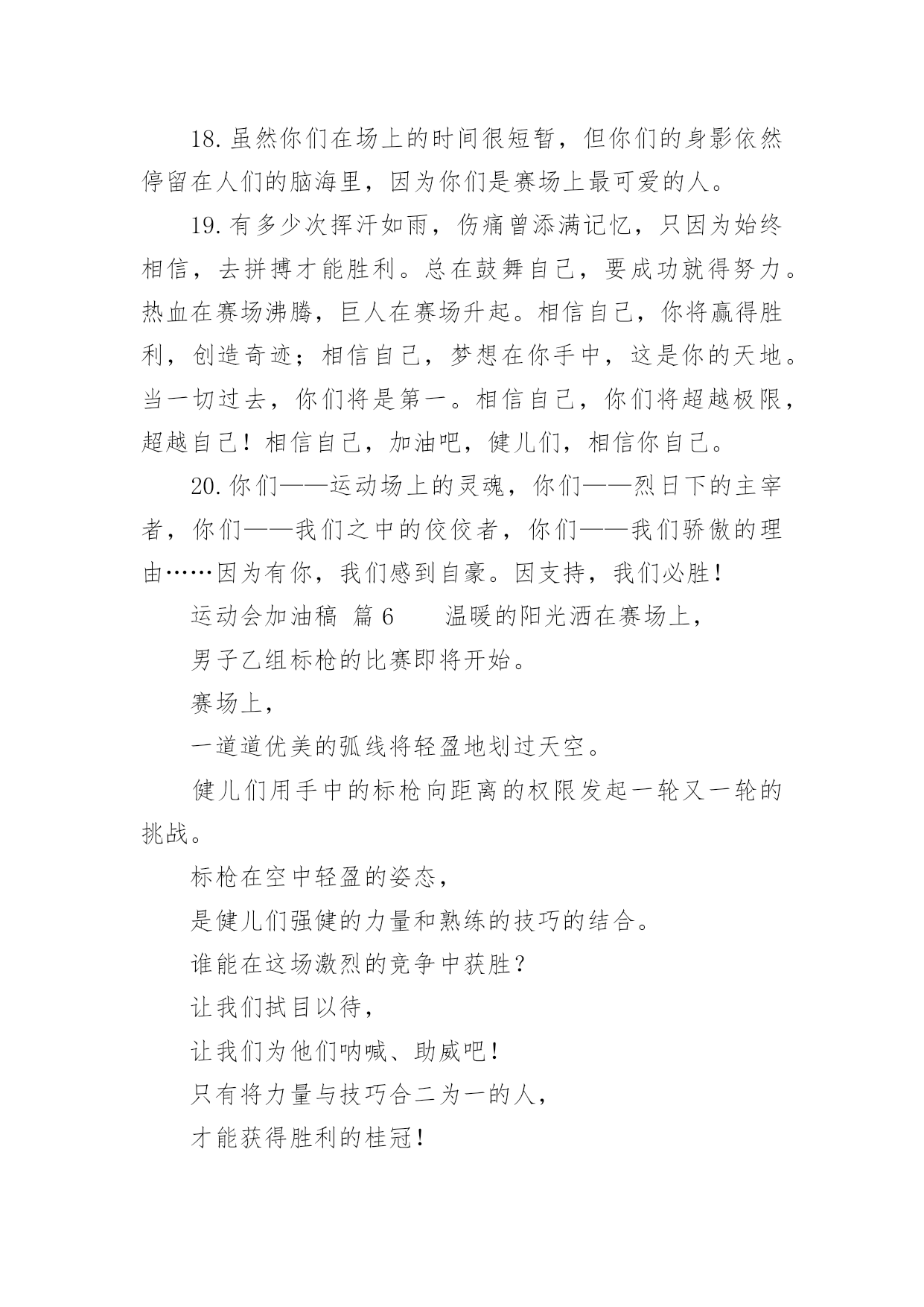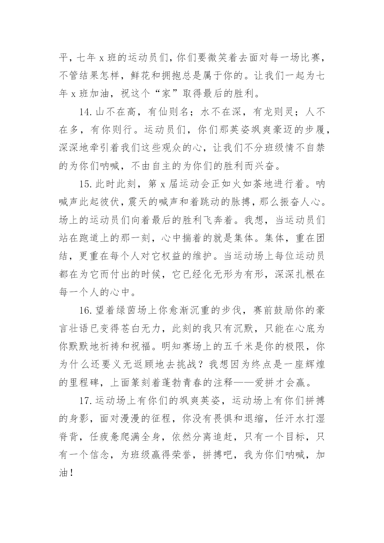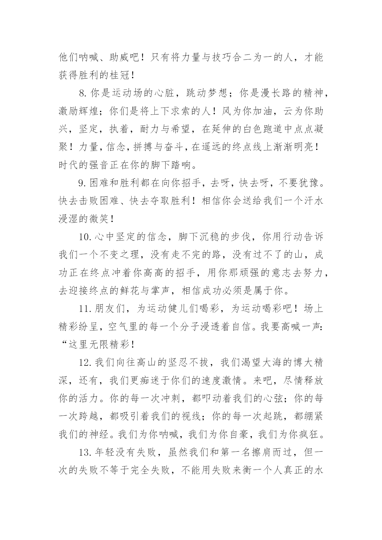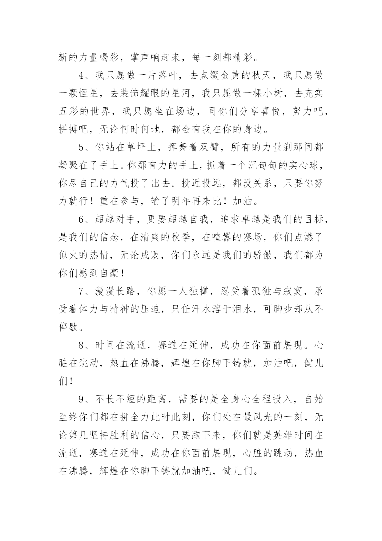 运动会加油稿运动会加油稿(14篇)随着社会一步步向前发展,需要使用加油稿的情境愈发增多,加油稿可以给予对方克服困难的勇气和信心。你所见过的加油稿是什么样的呢?下面是小编收集整理的运动会加油稿,仅供参考,欢迎大家阅读。运动会加油稿篇1有种胜利叫坚持三千米,对于我来说是一个遥远的距离。想到的时候,觉得颤栗。然而对于站在起跑线上的每一位运动员来说这将是她们将要面临的比赛。我认为将会有人无法跑完全程,毕竟三千米对于一个女生来说这足以是一次长征。可结果只能让我意外没有一个运动员在中途退出所有的运动员都坚持到了终点。虽然最后一名与第一名之间有将近一圈的差距然而她们都是胜利者,因为有种胜利叫坚持超越极限或许你努力过,争取过,但还是与成功的掌声和鲜花擦肩而过。或许你尝试过,失败过,但成功的火焰就是无法熊熊燃烧。或许你面对沟壑时,犹豫过,害怕过徘徊过,伤心过,滞步过但朋友,你是否冷静地思考过,或许你再往前一步或许成功便正好与你握手呢?你是否平静地反问过,或许跨越这道沟就是圣洁的梦的故乡呢?鼓起勇气吧,再向前迈出一步吧超越梦的界限,超越自己的极限,打破成功的极限!超越极限,超越自我,向梦的方向起飞吧运动会加油稿篇2踏着春天的气息,迈着轻盈的脚步,我们迎来了心仪已久的运动会。这里就是展示自我的舞台。我们向往高山的坚忍不拔,我们渴望大海的博大精深,还有,我们更痴迷于你们的速度激情。来吧,尽情释放你的活力。你的每一次冲刺,都叩动着我们的心弦;你的每一次跨越,都吸引着我们的视线;你的每一次起跳,都绷紧我们的神经。我们为你呐喊,我们为你自豪,我们为你疯狂。运动会加油稿篇3长长的标枪如银梭,你曾在遥远的古战场走过。带着昔日的豪放与荣耀,穿过漫漫岁月的河。今日赛场换身形,充当和平竞赛的使者。长长的标枪如金梭,承载阳光少年的嘱托。腾空疾飞冲向前,奏响一曲拼搏奋斗歌。运动会加油稿篇41、年轻的我们自信飞扬,青春的气息如同初升的朝阳,蓬勃的力量如同阳光的挥洒。此时此刻,跑道便是我们精彩的舞台,声声加油便是我们的奖项!2、此时此刻,虽然脑海里浮想联翩,但我仍然安静地坐在大本营,写着通讯稿,仍然站在场边扯破嗓子地喊"加油"。3、观众席上掌声雷动,热热烈烈划破长空,他们的灵魂在叫,血在烧,都是渴望,有无限的期望,掌声响起来为新的力量喝彩,掌声响起来,每一刻都精彩。4、我只愿做一片落叶,去点缀金黄的秋天,我只愿做一颗恒星,去装饰耀眼的星河,我只愿做一棵小树,去充实五彩的世界,我只愿坐在场边,同你们分享喜悦,努力吧,拼搏吧,无论何时何地,都会有我在你的身边。5、你站在草坪上,挥舞着双臂,所有的力量刹那间都凝聚在了手上。你那有力的手上,抓着一个沉甸甸的实心球,你尽自己的力气投了出去。投近投远,都没关系,只要你努力就行!重在参与,输了明年再来比!加油。6、超越对手,更要超越自我,追求卓越是我们的目标,是我们的信念,在清爽的秋季,在喧嚣的赛场,你们点燃了似火的热情,无论成败,你们永远是我们的骄傲,我们都为你们感到自豪!7、漫漫长路,你愿一人独撑,忍受着孤独与寂寞,承受着体力与精神的压迫,只任汗水溶于泪水,可脚步却从不停歇。8、时间在流逝,赛道在延伸,成功在你面前展现。心脏在跳动,热血在沸腾,辉煌在你脚下铸就,加油吧,健儿们!9、不长不短的距离,需要的是全身心全程投入,自始至终你们都在拼全力此时此刻,你们处在最风光的一刻,无论第几坚持胜利的信心,只要跑下来,你们就是英雄时间在流逝,赛道在延伸,成功在你面前展现,心脏的跳动,热血在沸腾,辉煌在你脚下铸就加油吧,健儿们。10、也许流星并不少见,但它燃烧的刹那,留给人间最美丽的回忆!也许笑脸并不少见,但胜利的喜悦,总会留给世界精彩的一瞬!是的,那些以前美妙的东西只有短短的一瞬间,但那却把最辉煌的一刻留给了人间。胜利,是每个人所追求的,胜利的喜悦,是胜利与重新开始的转折,胜利是新的开始!11、不为鲜花的围绕,不为刹那的荣耀,只有执着的信念,化作不停的奔跑,心中燃烧着梦想,脚下不停的步伐。12、心中坚定的信念,脚下沉稳的步伐,你用行动告诉我们一个不变之理,没有走不完的路,没有过不了的山,成功正在终点冲着你高高的招手,用你那顽强的意志去努力,去迎接终点的鲜花与掌声,相信成功一定是属于你13、青春的脚步,青春的速度,青春的活力,青春的激情,将会在你们的身上尽情体现!14、努力吧!加油啊!时间短暂并不代表你活力短暂,距离不长却表示你成功不远,相信自己,冲啊!胜利就在眼前,失去不会再现!15、你们快如离弦之箭;疾似撒疆野马;你们的速度让我们惊叹;你们的精神让我们钦佩;流汗千日,只为今日一搏;疾踏百步,只为终点一触;胜利在向你微笑;成功在向你招手;加油啊!健儿们!运动会加油稿篇51.心中坚定的信念,脚下沉稳的步伐,你用行动告诉我们一个不变之理,没有走