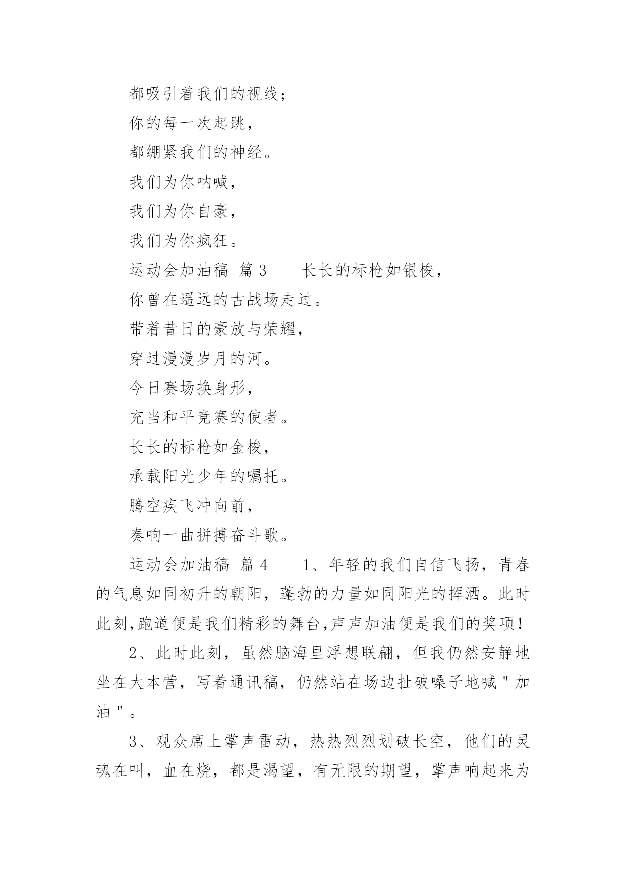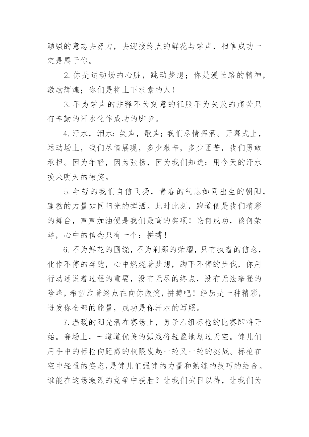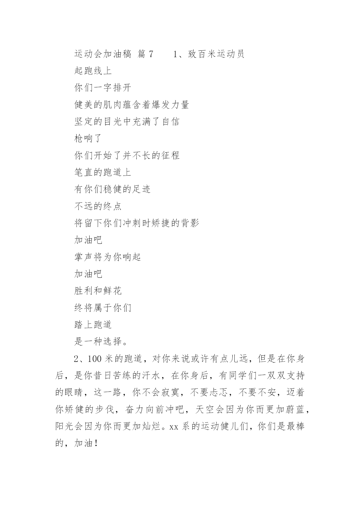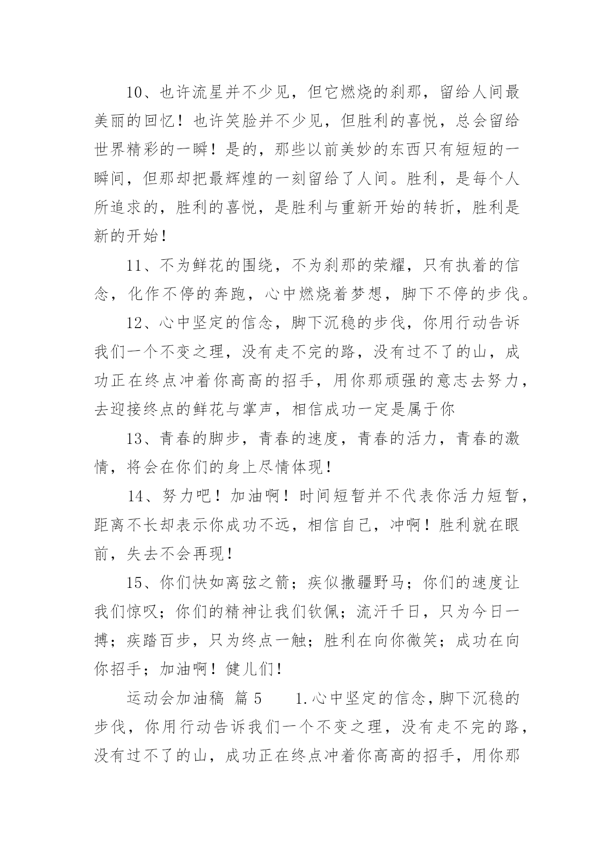 运动会加油稿运动会加油稿(14篇)随着社会一步步向前发展,需要使用加油稿的情境愈发增多,加油稿可以给予对方克服困难的勇气和信心。你所见过的加油稿是什么样的呢?下面是小编收集整理的运动会加油稿,仅供参考,欢迎大家阅读。运动会加油稿篇1有种胜利叫坚持三千米,对于我来说是一个遥远的距离。想到的时候,觉得颤栗。然而对于站在起跑线上的每一位运动员来说这将是她们将要面临的比赛。我认为将会有人无法跑完全程,毕竟三千米对于一个女生来说这足以是一次长征。可结果只能让我意外没有一个运动员在中途退出所有的运动员都坚持到了终点。虽然最后一名与第一名之间有将近一圈的差距然而她们都是胜利者,因为有种胜利叫坚持超越极限或许你努力过,争取过,但还是与成功的掌声和鲜花擦肩而过。或许你尝试过,失败过,但成功的火焰就是无法熊熊燃烧。或许你面对沟壑时,犹豫过,害怕过徘徊过,伤心过,滞步过但朋友,你是否冷静地思考过,或许你再往前一步或许成功便正好与你握手呢?你是否平静地反问过,或许跨越这道沟就是圣洁的梦的故乡呢?鼓起勇气吧,再向前迈出一步吧超越梦的界限,超越自己的极限,打破成功的极限!超越极限,超越自我,向梦的方向起飞吧运动会加油稿篇2踏着春天的气息,迈着轻盈的脚步,我们迎来了心仪已久的运动会。这里就是展示自我的舞台。我们向往高山的坚忍不拔,我们渴望大海的博大精深,还有,我们更痴迷于你们的速度激情。来吧,尽情释放你的活力。你的每一次冲刺,都叩动着我们的心弦;你的每一次跨越,都吸引着我们的视线;你的每一次起跳,都绷紧我们的神经。我们为你呐喊,我们为你自豪,我们为你疯狂。运动会加油稿篇3长长的标枪如银梭,你曾在遥远的古战场走过。带着昔日的豪放与荣耀,穿过漫漫岁月的河。今日赛场换身形,充当和平竞赛的使者。长长的标枪如金梭,承载阳光少年的嘱托。腾空疾飞冲向前,奏响一曲拼搏奋斗歌。运动会加油稿篇41、年轻的我们自信飞扬,青春的气息如同初升的朝阳,蓬勃的力量如同阳光的挥洒。此时此刻,跑道便是我们精彩的舞台,声声加油便是我们的奖项!2、此时此刻,虽然脑海里浮想联翩,但我仍然安静地坐在大本营,写着通讯稿,仍然站在场边扯破嗓子地喊"加油"。3、观众席上掌声雷动,热热烈烈划破长空,他们的灵魂在叫,血在烧,都是渴望,有无限的期望,掌声响起来为新的力量喝彩,掌声响起来,每一刻都精彩。4、我只愿做一片落叶,去点缀金黄的秋天,我只愿做一颗恒星,去装饰耀眼的星河,我只愿做一棵小树,去充实五彩的世界,我只愿坐在场边,同你们分享喜悦,努力吧,拼搏吧,无论何时何地,都会有我在你的身边。5、你站在草坪上,挥舞着双臂,所有的力量刹那间都凝聚在了手上。你那有力的手上,抓着一个沉甸甸的实心球,你尽自己的力气投了出去。投近投远,都没关系,只要你努力就行!重在参与,输了明年再来比!加油。6、超越对手,更要超越自我,追求卓越是我们的目标,是我们的信念,在清爽的秋季,在喧嚣的赛场,你们点燃了似火的热情,无论成败,你们永远是我们的骄傲,我们都为你们感到自豪!7、漫漫长路,你愿一人独撑,忍受着孤独与寂寞,承受着体力与精神的压迫,只任汗水溶于泪水,可脚步却从不停歇。8、时间在流逝,赛道在延伸,成功在你面前展现。心脏在跳动,热血在沸腾,辉煌在你脚下铸就,加油吧,健儿们!9、不长不短的距离,需要的是全身心全程投入,自始至终你们都在拼全力此时此刻,你们处在最风光的一刻,无论第几坚持胜利的信心,只要跑下来,你们就是英雄时间在流逝,赛道在延伸,成功在你面前展现,心脏的跳动,热血在沸腾,辉煌在你脚下铸就加油吧,健儿们。10、也许流星并不少见,但它燃烧的刹那,留给人间最美丽的回忆!也许笑脸并不少见,但胜利的喜悦,总会留给世界精彩的一瞬!是的,那些以前美妙的东西只有短短的一瞬间,但那却把最辉煌的一刻留给了人间。胜利,是每个人所追求的,胜利的喜悦,是胜利与重新开始的转折,胜利是新的开始!11、不为鲜花的围绕,不为刹那的荣耀,只有执着的信念,化作不停的奔跑,心中燃烧着梦想,脚下不停的步伐。12、心中坚定的信念,脚下沉稳的步伐,你用行动告诉我们一个不变之理,没有走不完的路,没有过不了的山,成功正在终点冲着你高高的招手,用你那顽强的意志去努力,去迎接终点的鲜花与掌声,相信成功一定是属于你13、青春的脚步,青春的速度,青春的活力,青春的激情,将会在你们的身上尽情体现!14、努力吧!加油啊!时间短暂并不代表你活力短暂,距离不长却表示你成功不远,相信自己,冲啊!胜利就在眼前,失去不会再现!15、你们快如离弦之箭;疾似撒疆野马;你们的速度让我们惊叹;你们的精神让我们钦佩;流汗千日,只为今日一搏;疾踏百步,只为终点一触;胜利在向你微笑;成功在向你招手;加油啊!健儿们!运动会加油稿篇51.心中坚定的信念,脚下沉稳的步伐,你用行动告诉我们一个不变之理,没有走